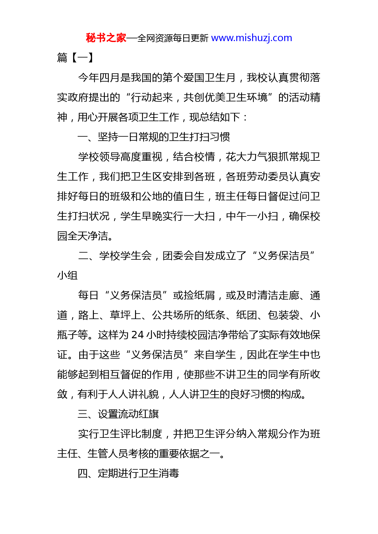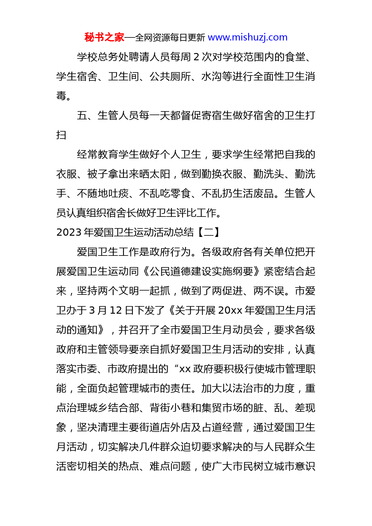 秘书之家—全网资源每日更新www.mishuzj.com篇【一】今年四月是我国的第个爱国卫生月,我校认真贯彻落实政府提出的“行动起来,共创优美卫生环境”的活动精神,用心开展各项卫生工作,现总结如下:一、坚持一日常规的卫生打扫习惯学校领导高度重视,结合校情,花大力气狠抓常规卫生工作,我们把卫生区安排到各班,各班劳动委员认真安排好每日的班级和公地的值日生,班主任每日督促过问卫生打扫状况,学生早晚实行一大扫,中午一小扫,确保校园全天净洁。二、学校学生会,团委会自发成立了“义务保洁员”小组每日“义务保洁员”或捡纸屑,或及时清洁走廊、通道,路上、草坪上、公共场所的纸条、纸团、包装袋、小瓶子等。这样为24小时持续校园洁净带给了实际有效地保证。由于这些“义务保洁员”来自学生,因此在学生中也能够起到相互督促的作用,使那些不讲卫生的同学有所收敛,有利于人人讲礼貌,人人讲卫生的良好习惯的构成。三、设置流动红旗实行卫生评比制度,并把卫生评分纳入常规分作为班主任、生管人员考核的重要依据之一。四、定期进行卫生消毒秘书之家—全网资源每日更新www.mishuzj.com学校总务处聘请人员每周2次对学校范围内的食堂、学生宿舍、卫生间、公共厕所、水沟等进行全面性卫生消毒。五、生管人员每一天都督促寄宿生做好宿舍的卫生打扫经常教育学生做好个人卫生,要求学生经常把自我的衣服、被子拿出来晒太阳,做到勤换衣服、勤洗头、勤洗手、不随地吐痰、不乱吃零食、不乱扔生活废品。生管人员认真组织宿舍长做好卫生评比工作。2023年爱国卫生运动活动总结【二】爱国卫生工作是政府行为。各级政府各有关单位把开展爱国卫生运动同《公民道德建设实施纲要》紧密结合起来,坚持两个文明一起抓,做到了两促进、两不误。市爱卫办于3月12日下发了《关于开展20xx年爱国卫生月活动的通知》,并召开了全市爱国卫生月动员会,要求各级政府和主管领导要亲自抓好爱国卫生月活动的安排,认真落实市委、市政府提出的“xx政府要积极行使城市管理职能,全面负起管理城市的责任。加大以法治市的力度,重点治理城乡结合部、背街小巷和集贸市场的脏、乱、差现象,坚决清理主要街道店外店及占道经营,通过爱国卫生月活动,切实解决几件群众迫切要求解决的与人民群众生活密切相关的热点、难点问题,使广大市民树立城市意识秘书之家—全网资源每日更新www.mishuzj.com文明意识、卫生意识。全市爱国卫生月动员会议召开后,各县区及委员单位领导对此项工作都比较重视,积极主动地召开专题会议,研究、部署、印发了活动意见。1、成立了以区委、区政府主要领导挂帅,各乡镇街道办事处、区直有关部门的领导参加的爱国卫生月活动领导小组,并抽调人员组成宣传、督导两个小组。2、成立了以区主要领导为组长的环境卫生综合治理领导小组,对全区环境卫生,特别是大白线鹤山段实行分段管理,督导协调沿线单位切实履行各自职责。2023年爱国卫生运动活动总结【三】今年春季我乡爱国卫生活动工作在乡党委、政府的领导下,在市县爱卫会的指导下,在有关部门的配合下,积极开展“开展爱国卫生活动”和省、市、县卫生工作会议精神,解放思想、更新观念、开拓进取、立足实际,认真制定实施方案,精心组织,周密部署,采取全面发动与集中整治相结合、重点突击与长效管理相结合的方式,充分发动群众积极参与多种形式的爱国卫生活动,努力提升环境卫生质量,共同营造整洁优美、健康和谐的城乡环境。一、大力宣传,在全乡营造除陋习、美环境、保健康的良好氛围精心组织,通过上街宣传、发放宣传资料、办健康教秘书之家—全网资源每日更新www.mishuzj.com育知识宣传栏等方式广泛宣传发动群众,多次展开村两委有关乡村环境卫生会议,在村中悬挂爱国卫生标语,组织各村宣传栏板报。二、开展爱国卫生活动集中整治行动一是我们做到了早安排,乡党委、政府结合春夏季预防肠道传染病防治工作召开了两次专门会议,进行了研究布置。二是结合城乡环境综合整治工作,按照“属地管理单位负责”的原则,充分发挥村和各单位的作用,在全乡掀起以“讲文明、讲卫生、讲科学、树新风”为主的爱国卫生活动集中整治活动。三是开展了食品卫生大检查,对全乡食品卫生进行了拉网式的大检查,把住了病从口入关。三、深入开展城乡环境综合整治以爱国卫生活动为契机,充分动员广大群众,以城乡环境综合治理为重点,采取分地段、分部门包干,开展了两次消除白色垃圾、治理污染和街面卫生大整治活动,在活动期间共出动近30人次,出动垃圾车2台次,清除垃圾1吨。加大了整治管理力度,对交通、卫生、市场秩序进行进一步整治,通过整治,我乡环境质量、卫生质量进一步明显提高。在农村重点治理垃圾乱倒、粪土乱堆、污水乱泼、柴草乱堆、杂物乱摆的“五乱”现象;大力推行“五改”、“三建”,铲除病源体孳生场所,改变了农民居住环境,有力保护了广大人民群众的身心健康,促进了我乡秘书之家—全网资源每日更新www.mishuzj.com爱卫工作持续健康发展。2023年爱国卫生运动活动总结【四】20xx年4月是爱国卫生月,今年的活动主题是“推进卫生”。我局严格按照区爱卫办的要求,紧密结合食品药品监管工作实际,以保障全市人民