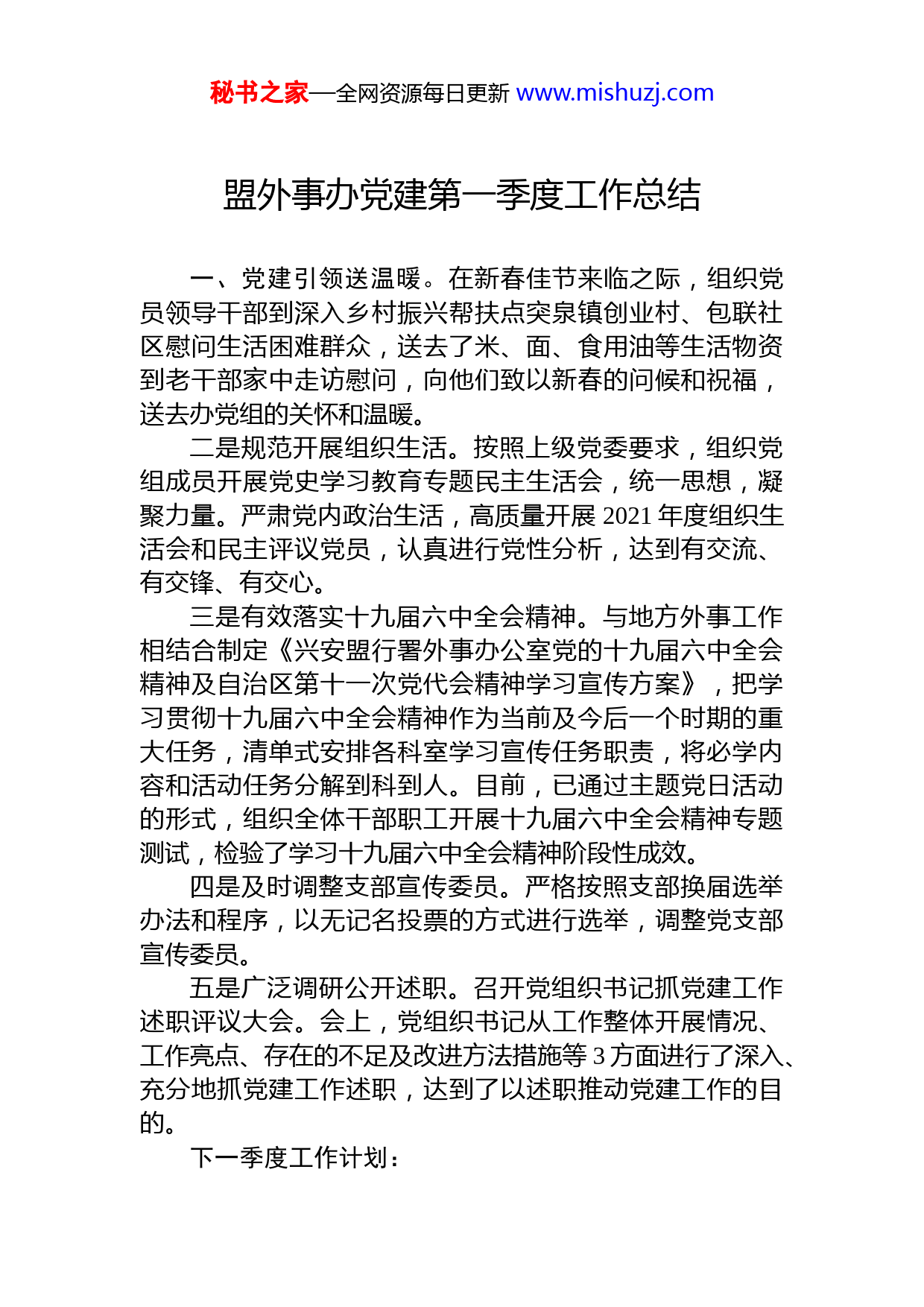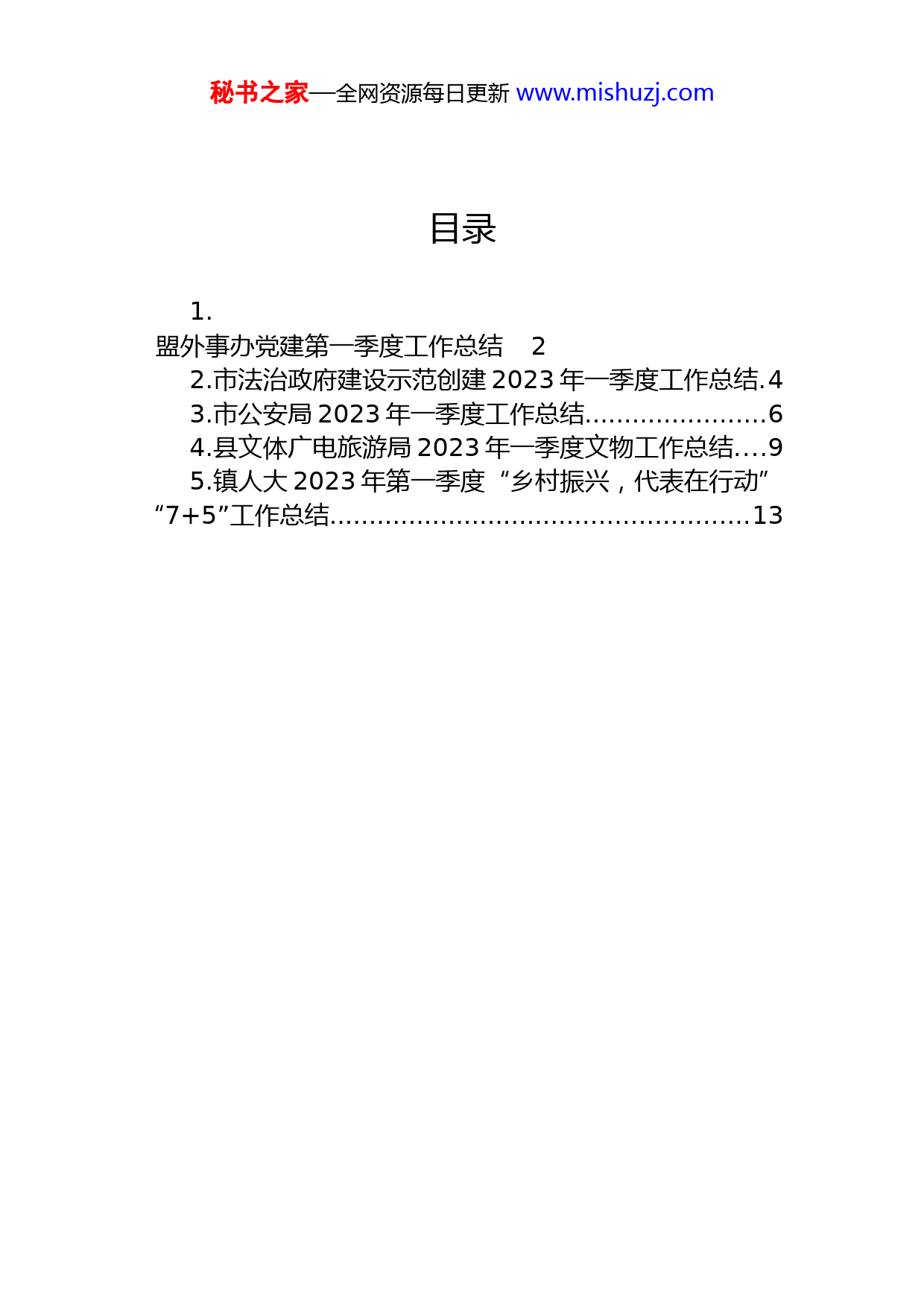 秘书之家—全网资源每日更新www.mishuzj.com目录1.盟外事办党建第一季度工作总结22.市法治政府建设示范创建2023年一季度工作总结.43.市公安局2023年一季度工作总结.......................64.县文体广电旅游局2023年一季度文物工作总结....95.镇人大2023年第一季度“乡村振兴,代表在行动”“7+5”工作总结.....................................................13秘书之家—全网资源每日更新www.mishuzj.com盟外事办党建第一季度工作总结一、党建引领送温暖。在新春佳节来临之际,组织党员领导干部到深入乡村振兴帮扶点突泉镇创业村、包联社区慰问生活困难群众,送去了米、面、食用油等生活物资到老干部家中走访慰问,向他们致以新春的问候和祝福,送去办党组的关怀和温暖。二是规范开展组织生活。按照上级党委要求,组织党组成员开展党史学习教育专题民主生活会,统一思想,凝聚力量。严肃党内政治生活,高质量开展2021年度组织生活会和民主评议党员,认真进行党性分析,达到有交流、有交锋、有交心。三是有效落实十九届六中全会精神。与地方外事工作相结合制定《兴安盟行署外事办公室党的十九届六中全会精神及自治区第十一次党代会精神学习宣传方案》,把学习贯彻十九届六中全会精神作为当前及今后一个时期的重大任务,清单式安排各科室学习宣传任务职责,将必学内容和活动任务分解到科到人。目前,已通过主题党日活动的形式,组织全体干部职工开展十九届六中全会精神专题测试,检验了学习十九届六中全会精神阶段性成效。四是及时调整支部宣传委员。严格按照支部换届选举办法和程序,以无记名投票的方式进行选举,调整党支部宣传委员。五是广泛调研公开述职。召开党组织书记抓党建工作述职评议大会。会上,党组织书记从工作整体开展情况、工作亮点、存在的不足及改进方法措施等3方面进行了深入、充分地抓党建工作述职,达到了以述职推动党建工作的目的。下一季度工作计划:秘书之家—全网资源每日更新www.mishuzj.com一是积极助力乡村振兴工作。制作帮助创业村组织振兴方案,列出全年帮扶工作任务清单。下一季度与创业村党支部联合开展1次党日活动、1次集中学习、1次办实事活动。二是创新开展支部组织生活。组织各科室积极参与学习十九届六中全会和学习“两会”精神上来,调动全体党员群众参与到各项活动的开展中。在开展常态化学习的基础上,结合“三八”妇女节、五一劳动节等节日,开展巾帼共奋进永远跟党走、徒步体验长征、集体过政治生日等主题活动,凝聚干事创业的精气神,形成干事创业的合力。三是常态化开展党建联系点工作。开展党组书记讲党课活动,通过邀请党建联系点党员代表参加我办党课活动的形式,提高党建联系点党员干部理想信念,通过到党建联系点指导规范化建设的方式,帮助规范党建工作档案归档工作。增设党建联系点,将帮扶村创业村增设为我办党建联系点,常态化指导党建各项工作。秘书之家—全网资源每日更新www.mishuzj.com市法治政府建设示范创建2023年一季度工作总结为深入学习贯彻习近平法治思想,不断把法治政府建设向纵深推进,加快实现法治政府建设率先突破,中央依法治国办将于2023年组织开展第三批全国法治政府建设示范创建活动,旨在梯次推进、辐射带动,树立新时代法治政府建设的典型标杆。能够从“全国法治政府建设示范市”这一规格高、要求高、含金量高的示范创建活动中脱颖而出的示范地区,需要在政府职能依法全面履行、依法行政制度体系完善、重大行政决策科学民主合法、行政执法严格规范公正文明、行政权力制约监督科学有效、政府工作人员法治思维和依法行政能力全面提高等方面都有优秀的表现。前两批法治政府建设示范创建活动,营造了法治政府建设创优争先的浓厚氛围,成功示范命名的各地区成为推动社会主义法治建设的有力抓手和重要名片,对全国法治政府建设发挥了重要辐射带动作用。2023年3月,省委依法治省办发布《关于第二批法治政府建设示范地区(部门)和项目命名的决定》,XX市获评全省法治政府建设示范市,标志着我市法治政府建设进入新征程。除此之外,我市“云智办案通”智能执法系统建设入选第二批法治政府建设项目,“用法治力量护航十年禁渔”“创新载体开展专题述法”“统筹推进生态环境高水平保护和产业高质量发展”等典型做法被全国推广。XX市在获得第二批全省法治政府建设示范市荣誉的基础上,将以示范创建为契机和抓手,争创国家级示范市。在创建过程中,坚持问题导向、强化问题意识,着力解决法治政府建设中存在的问题短板,全力提升政府依法行政秘书之家—全网资源每日更新www.mishuzj.com水平、优化法治环境。把示范创建活动同提升本地区法治政府建设能力和水平相结合,同解决制约法治政府建设发展的突出问题相结合,既全面总结本地法治政府建设的好经验、好做法,又瞄准法治政府建设的薄弱环节,补短板强弱项,切实把示范创建工作转化为推动法治政府建设的动力源泉,打响XX市的法治金字招牌。秘书之家—全网资源每日更新www.mishuzj.com市公安局2023年一季度工作总结今年以来,我们按照上级公安工作会议精神,聚焦杭州亚运安保和“枫桥经验”60周年纪念活动,主动融入省委“三个一号工程”战略布局,坚持开年开跑