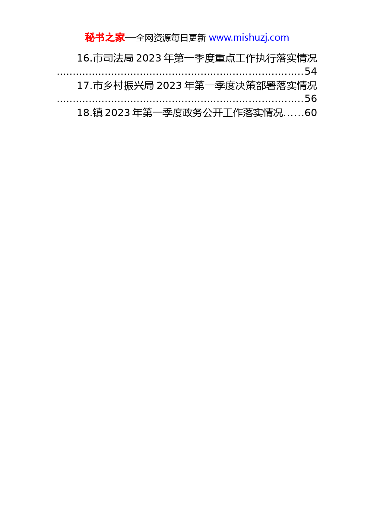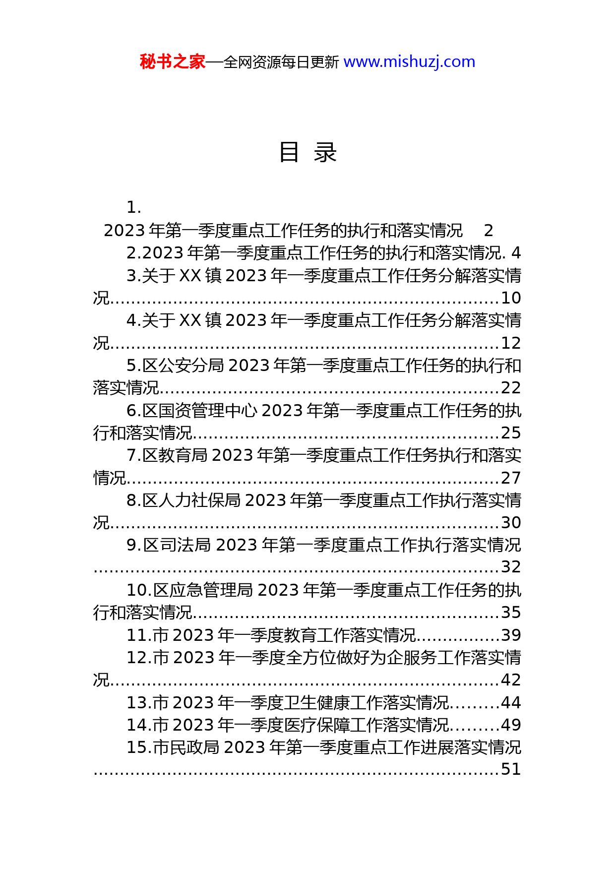 秘书之家—全网资源每日更新www.mishuzj.com目录1.2023年第一季度重点工作任务的执行和落实情况22.2023年第一季度重点工作任务的执行和落实情况.43.关于XX镇2023年一季度重点工作任务分解落实情况..........................................................................104.关于XX镇2023年一季度重点工作任务分解落实情况..........................................................................125.区公安分局2023年第一季度重点工作任务的执行和落实情况................................................................226.区国资管理中心2023年第一季度重点工作任务的执行和落实情况..........................................................257.区教育局2023年第一季度重点工作任务执行和落实情况.......................................................................278.区人力社保局2023年第一季度重点工作执行落实情况..........................................................................309.区司法局2023年第一季度重点工作执行落实情况.............................................................................3210.区应急管理局2023年第一季度重点工作任务的执行和落实情况..........................................................3511.市2023年一季度教育工作落实情况................3912.市2023年一季度全方位做好为企服务工作落实情况..........................................................................4213.市2023年一季度卫生健康工作落实情况.........4414.市2023年一季度医疗保障工作落实情况.........4915.市民政局2023年第一季度重点工作进展落实情况.............................................................................51秘书之家—全网资源每日更新www.mishuzj.com16.市司法局2023年第一季度重点工作执行落实情况.............................................................................5417.市乡村振兴局2023年第一季度决策部署落实情况.............................................................................5618.镇2023年第一季度政务公开工作落实情况......60秘书之家—全网资源每日更新www.mishuzj.com2023年第一季度重点工作任务的执行和落实情况一、一季度投资情况1-2月预计完成固定资产投资6亿、建安投资5亿;一季度力争完成固定资产投资10.6亿,建安投资7亿,包括恒大健康新城项目投资4.2亿、华侨城文旅项目2.6亿、棕榈时光宁波项目1.6亿、通源医院项目0.2亿、文体中心项目0.8亿、其他基础配套项目1.2亿。一季度新开工项目1个,沿海观光线鸿峙段景观提升工程,总投资0.25亿。二、存在的问题1、新开工项目中有4个为涉海项目(天妃大道桥梁工程、公共船艇码头、海上浴场、福桥),原计划于二季度开工。现因已通过评审的海域论证报告、水文条件测量报告需重新编制,并新增天妃湖内马鲛鱼保护专题报告,涉及程序复杂、时间较长,导致项目前期进度难以把握,建议容缺相关手续先行开工建设。2、恒大健康新城5-1、7号地块,因项目整合重组资金缺口巨大,多方寻求合作都因无法平衡未能实现,已售房的保交楼要改变思路予以解决。3、宁波通源医院二期为开发边界弹性空间范围,无法启动土地征收;滨海文化公园(宁波海洋世界规划用地)已批的建设用地未纳入开发边界,会影响后续供地。三、工作举措1、全速推进续建项目建设进度,优化服务强化对接。加强与华侨城公司对接,督促度假酒店与文旅街区项目的建设进度;全力保障医疗项目建设,确保项目投资持续放量;深挖政府投资项目建设潜力,优化文体中心、游客服秘书之家—全网资源每日更新www.mishuzj.com务中心等项目建设进程,科学缩短建设工期,确保今年呈现基本形象。2、全面梳理新开工项目推进的难点,逐项破解影响开工建设的阻力。重点协调对接涉海项目的相关报批工作,确保天妃大道桥梁工程、公共船艇码头等项目尽快实现开工;开展国企兜底恒大5-1、7号地块开发方式的可行性研究,抓紧制定保建保交方案。3、全力推进谋划项目落地,引入新的增长极。重点围绕宁波海洋世界项目落地做好前期工作,力争实现年内开工投建;聚焦度假区形象提升,谋划好度假区社区商业广场、道路、景观、水利、水电配套等项目,实现度假区形象能级提升。秘书之家—全网资源每日更新www.mishuzj.com2023年第一季度重点工作任务的执行和落实情况一、商务运行总体情况1-3月,全市货物贸易进出口总值为1045.3亿元,同比增长5.9%。其中出口799.7亿元,同比增长12.6%;进口245.7亿元,同比下降11.1%。进出口、出口、进口总值分别列全省第4、5、4位;进出口、出口、进口增速分别列全省第8、5、10位,出口增速前进2位。新批外资项目101个,合同利用外资21.62亿美元,同比上升25.3%;实际利用外资14.59亿美元,同比上升5.2%,总量列全省第3。高技术产业利用外资占比48%。引进总投资(含增资)超亿美元产业项目34个,列全省第1。新批境外投(增)资备案项目38个,对外直接投资备案额4.53亿美元,总量列全省第3。对外承包工程和劳务合作营业额2061.1万美元,同比下降67.1%,总量居全省第7。二、主要特点(一)对外贸易1.东盟成为最大出口增量贡献市场。1-3月,东盟(121.9亿元,48.8%)、荷兰(44.6亿元,138.5%)和香港(39.5亿元,119.4%)对我市出口贡献最大,合计拉动我市出口增长12.3个百分点。而印度(35.6亿元,-26.1%)、美国(131.6亿元,-5.4%)拖累全市出口2.8个百分点。1-3月,对一带一路国家出口280.5亿元,同比增长13.9%;对RCEP国家出口207.8亿元,同比增长27.4