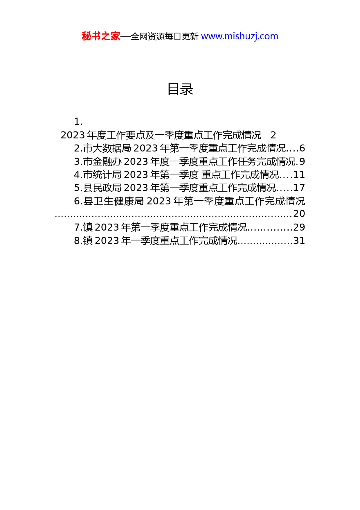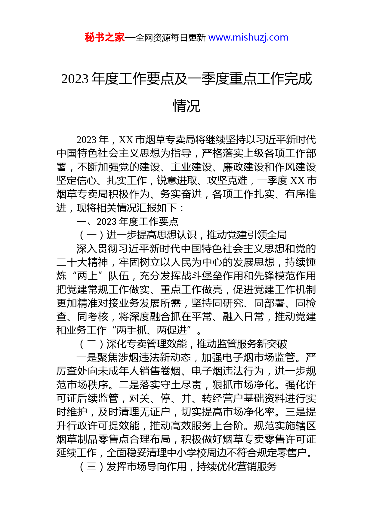 秘书之家—全网资源每日更新www.mishuzj.com目录1.2023年度工作要点及一季度重点工作完成情况22.市大数据局2023年第一季度重点工作完成情况....63.市金融办2023年度一季度重点工作任务完成情况.94.市统计局2023年第一季度重点工作完成情况....115.县民政局2023年第一季度重点工作完成情况.....176.县卫生健康局2023年第一季度重点工作完成情况.............................................................................207.镇2023年第一季度重点工作完成情况..............298.镇2023年一季度重点工作完成情况..................31秘书之家—全网资源每日更新www.mishuzj.com2023年度工作要点及一季度重点工作完成情况2023年,XX市烟草专卖局将继续坚持以习近平新时代中国特色社会主义思想为指导,严格落实上级各项工作部署,不断加强党的建设、主业建设、廉政建设和作风建设坚定信心、扎实工作,锐意进取、攻坚克难,一季度XX市烟草专卖局积极作为、务实奋进,各项工作扎实、有序推进,现将相关情况汇报如下:一、2023年度工作要点(一)进一步提高思想认识,推动党建引领全局深入贯彻习近平新时代中国特色社会主义思想和党的二十大精神,牢固树立以人民为中心的发展思想,持续锤炼“两上”队伍,充分发挥战斗堡垒作用和先锋模范作用把党建常规工作做实、重点工作做亮,促进党建工作机制更加精准对接业务发展所需,坚持同研究、同部署、同检查、同考核,将深度融合抓在平常、融入日常,推动党建和业务工作“两手抓、两促进”。(二)深化专卖管理效能,推动监管服务新突破一是聚焦涉烟违法新动态,加强电子烟市场监管。严厉查处向未成年人销售卷烟、电子烟违法行为,进一步规范市场秩序。二是落实守土尽责,狠抓市场净化。强化许可证后续监管,对关、停、并、转经营户基础资料进行实时维护,及时清理无证户,切实提高市场净化率。三是提升行政许可提效能,推动高效服务上台阶。规范实施辖区烟草制品零售点合理布局,积极做好烟草专卖零售许可证延续工作,全面稳妥清理中小学校周边不符合规定零售户。(三)发挥市场导向作用,持续优化营销服务秘书之家—全网资源每日更新www.mishuzj.com一是加强数据应用,不断优化市场状态。提高云pos数据质量,全面提升终端掌控力,立足市场,持续深化客户经理职能转型,坚持精准施策,积极探索开展经营能力分析、品牌梳选、盈利提升等个性化服务。二是做好经营指导和弱势群体帮扶化。强化农网建设,以终端建设培训、推送陈列技巧、测算销售盈利、品牌培育指导为零售客户送营销技能。三是结合实际调整营销线路,夯实营销基础建设工作,提高管控市场的能力,完成年度星级终端、生态圈终端、江淮分水岭终端建设工作。(四)进一步抓好意识形态领域工作履行好抓意识形态工作的政治责任,完善思想状况汇集反映机制,定期组织开展思想行为动态调查,主动发现和把握工作中的隐患和薄弱环节,有针对性地回答解决党员干部思想困惑或苗头性倾向性问题。(五)严格监督执纪,改变工作作风认真总结局(营销部)2022年全面从严治党、党风廉政建设和反腐败工作,对2023年全面从严治党工作进行部署,深入开展对三重一大事项、资金、干部职工作风的常态化监督,检视自身不足,实现自我净化。(六)强化科学统筹,扎实推进法治工作开展进一步学习贯彻习近平法治思想,进一步落实法治政府建设要求,不断提高依法履职的质量和效率。全面落实“八五”普法规划,抓好普法共建与“三进”工作落实。二、一季度重点工作完成情况(一)完成党建各项重点工作一是印发《XX市局(营销部)学习宣传贯彻党的二十大精神工作安排》,全面贯彻落实党的二十大精神。二是规范开展党支部届中调整,增补宣传委员和纪检委员,打造坚强有力基层党组织。三是召开2022年度民主生活会,严肃认真剖析问题,并明确了下一步整改方向和措施。四是印发《XX市局(营销部)党建工作考评办法(修订)》,秘书之家—全网资源每日更新www.mishuzj.com把政治优势转化为创新发展优势,以高质量党建引领业务高质量发展。(二)持续强化专卖市场监督管理一是市场监管方面,截至3月23日,查获涉烟案件31起,查获各类违法卷烟3752条。涉及电子烟案件2起,查获电子烟713个。二是推进烟草专卖零售许可证延续工作,截至2023年3月27日已完成51份烟草专卖零售许可证的延续。三是严格按照“破晓2023”专项行动要求,对辖区内中小学、幼儿园周边卷烟零售点开展走访摸排,并所有持有烟草专卖零售许可证销售电子烟的商店进行一次全面检查工作。(三)零售终端建设持续推进一是卷烟销售指标,截至3月23日,累计销售卷烟5586.6箱,销售收入2.53亿元,单条均价181.4元。二是继续推进江淮分水岭终端和生态圈建设,重点打造江淮分水岭三界段终端,计划沿线建设12户特色终端,目前三界段已建设1户迷彩终端、1户创业终端、3户文旅终端。三是已选定今年计划安装的58户云POS客户,并已对接银行办理注册工作。四是组织开展了文明吸烟环境设施设备巡检工作,与环卫处、园林局等共建单位加强沟通,共同做好日常维护保养工作。(四)扎实开展思想动态调查组织全局开展干部职工思想动态线下问卷调查,了解把握干部员工廉洁状态,为下一步提升廉政教育的针对性做好基础工作。(五)严格开展党组纪检组自查整改工作按