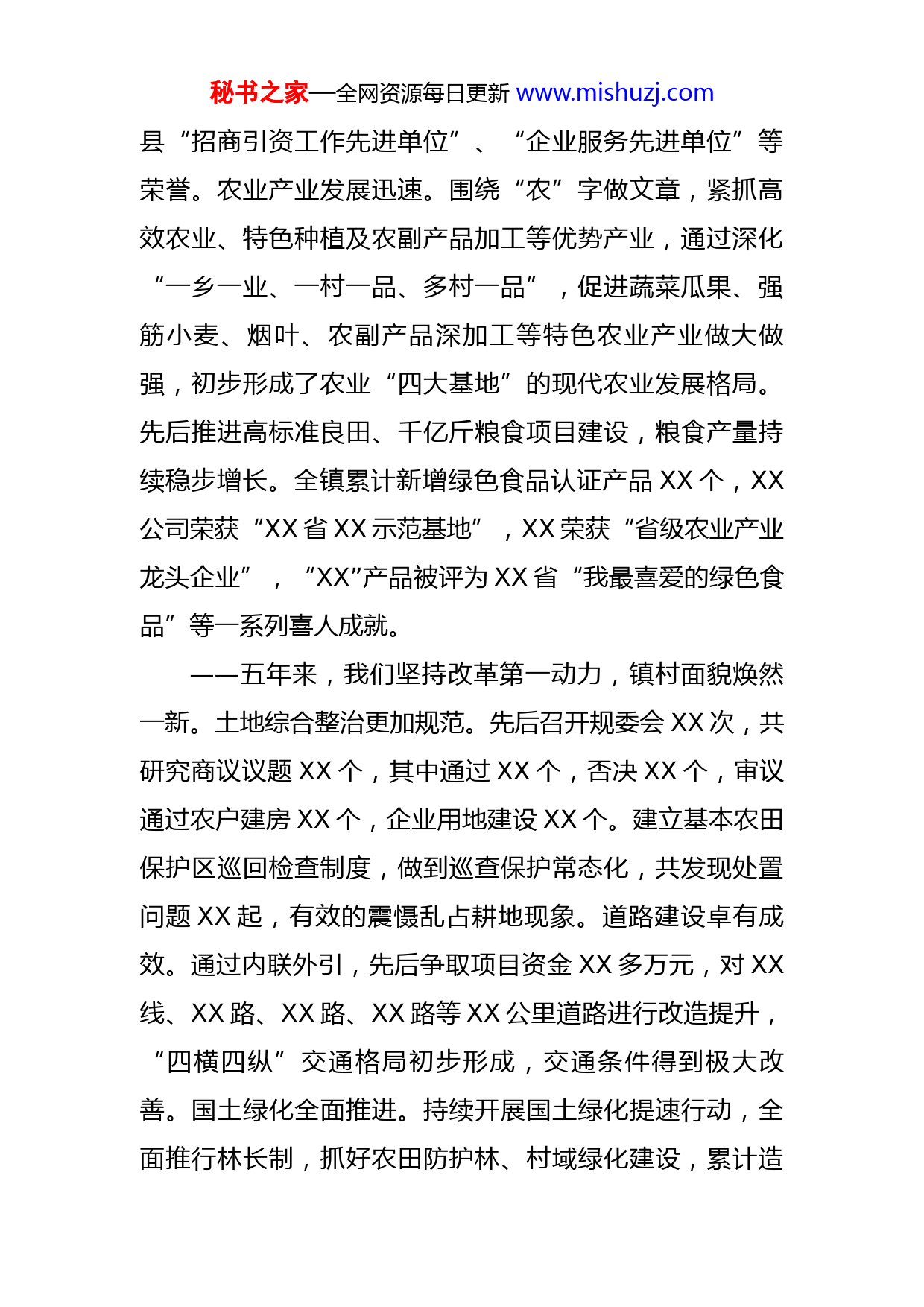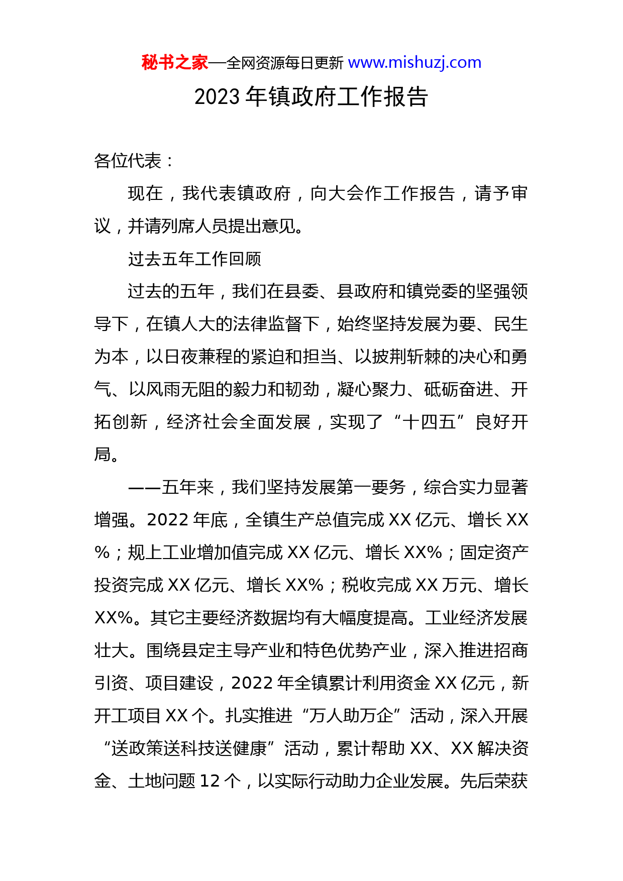 秘书之家—全网资源每日更新www.mishuzj.com2023年镇政府工作报告各位代表:现在,我代表镇政府,向大会作工作报告,请予审议,并请列席人员提出意见。过去五年工作回顾过去的五年,我们在县委、县政府和镇党委的坚强领导下,在镇人大的法律监督下,始终坚持发展为要、民生为本,以日夜兼程的紧迫和担当、以披荆斩棘的决心和勇气、以风雨无阻的毅力和韧劲,凝心聚力、砥砺奋进、开拓创新,经济社会全面发展,实现了“十四五”良好开局。——五年来,我们坚持发展第一要务,综合实力显著增强。2022年底,全镇生产总值完成XX亿元、增长XX%;规上工业增加值完成XX亿元、增长XX%;固定资产投资完成XX亿元、增长XX%;税收完成XX万元、增长XX%。其它主要经济数据均有大幅度提高。工业经济发展壮大。围绕县定主导产业和特色优势产业,深入推进招商引资、项目建设,2022年全镇累计利用资金XX亿元,新开工项目XX个。扎实推进“万人助万企”活动,深入开展“送政策送科技送健康”活动,累计帮助XX、XX解决资金、土地问题12个,以实际行动助力企业发展。先后荣获秘书之家—全网资源每日更新www.mishuzj.com县“招商引资工作先进单位”、“企业服务先进单位”等荣誉。农业产业发展迅速。围绕“农”字做文章,紧抓高效农业、特色种植及农副产品加工等优势产业,通过深化“一乡一业、一村一品、多村一品”,促进蔬菜瓜果、强筋小麦、烟叶、农副产品深加工等特色农业产业做大做强,初步形成了农业“四大基地”的现代农业发展格局。先后推进高标准良田、千亿斤粮食项目建设,粮食产量持续稳步增长。全镇累计新增绿色食品认证产品XX个,XX公司荣获“XX省XX示范基地”,XX荣获“省级农业产业龙头企业”,“XX”产品被评为XX省“我最喜爱的绿色食品”等一系列喜人成就。——五年来,我们坚持改革第一动力,镇村面貌焕然一新。土地综合整治更加规范。先后召开规委会XX次,共研究商议议题XX个,其中通过XX个,否决XX个,审议通过农户建房XX个,企业用地建设XX个。建立基本农田保护区巡回检查制度,做到巡查保护常态化,共发现处置问题XX起,有效的震慑乱占耕地现象。道路建设卓有成效。通过内联外引,先后争取项目资金XX多万元,对XX线、XX路、XX路、XX路等XX公里道路进行改造提升,“四横四纵”交通格局初步形成,交通条件得到极大改善。国土绿化全面推进。持续开展国土绿化提速行动,全面推行林长制,抓好农田防护林、村域绿化建设,累计造秘书之家—全网资源每日更新www.mishuzj.com林XX亩。多次荣获全县林业生产先进单位。人居环境整治效果显著。聚焦治理“六乱”、扎实开展“六清”,认真组织“五美庭院”评选活动,创新实施人居环境整治“户长制”,有效推动全域整治环境提升。共组织拆除残垣断壁、违章建筑XX处,清理垃圾XX余处,镇村面貌焕然一新。XX、XX等村荣获“省级卫生村”、XX荣获“市级卫生乡镇”等荣誉。——五年来,我们坚持民生第一目标,群众获得感不断增强。持续巩固脱贫成果。持续巩固脱贫攻坚成果,高质量完成防返贫监测全面排查工作,累计排查“五必到”农户XX户XX人,共纳入监测对象XX户XX人。民生事业显著增强。全面落实惠民政策,办好民生实事,全镇共办理城乡低保XX户XX人,特困供养共纳入XX人,残疾人两项补贴惠及867人,临时救助XX人。完善新型农村基本养老保险和新型农村合作医疗,推动养老、医疗保障全覆盖,建设农村幸福院XX所,解决了XX余名农村留守老人日间照料问题。荣获全县“城乡居民基本养老保险集中征缴先进单位”、“城乡居民基本医疗保险集中征缴先进单位”等荣誉。文化教育成效突显。先后建成XX座文化大舞台,成功举办“最美XX人、建功新时代”颁奖仪式,完成XX、XX寺两个省级文保单位的修复保护性规划。累计投入XX万元资助优秀学子XX人;先后争取上级补助项秘书之家—全网资源每日更新www.mishuzj.com目资金XX万元,完善镇一中等XX所中小学校的基础设施建设。污染防治更加有力。牢固树立生态优先、绿色发展理念,坚持依法治污、铁腕治污、全民治污,强化“三散”治理,“散乱污”动态清零,结合蓝天卫士,通过“人防+技防”,圆满完成秸秆禁烧及综合利用工作,实现了“双零”目标,全镇优良天数达到XX天,蓝天白云成为XX的“标配”。——五年来,我们坚持稳定第一责任,社会大局安定有序。疫情防控常态推进。始终坚持把人民群众生命安全和身体健康放在第一位,从严从实抓好疫情防控常态化工作,确保社会大局和谐稳定。建立疫情防控工作专班,织密基层防疫和农村防控保护网,用实际行动守护住了人民群众的生命健康。科学合理设置疫苗登记、接种、留观布局、流程,配齐人力、物力,疫苗接种有序进行,全镇已累计完成接种第一针剂XX人,第二针疫苗接种XX剂次,15至17岁接种疫苗XX剂次。安全形式持续稳定。按照“安全第一、预防为主、综合治理”的工作原则,有序推进防范非法集资、金融诈骗、国家安全、反邪教及民法典类专题宣传工作,扎实开展未成年人防溺亡、安全生产专项整治等工作,全镇安全形式持续向好。累计排查化解各类安全隐患XX起,有效遏制了安全事故风险。荣获市级“防灾减灾救灾先进集体”、县级“食品安全先进单位”秘书之家—全网资源每日更新www.mishuzj.com等荣誉。平安建设成效显