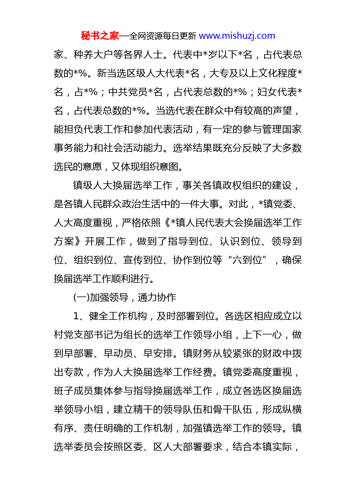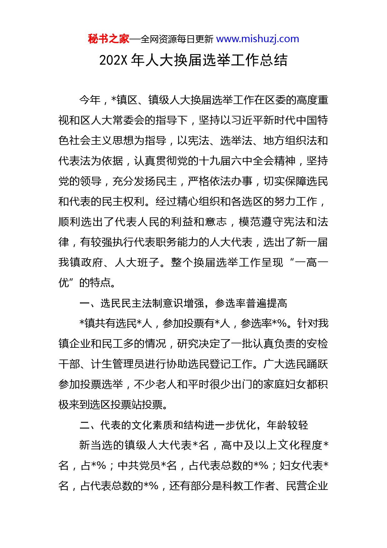 秘书之家—全网资源每日更新www.mishuzj.com202X年人大换届选举工作总结今年,镇区、镇级人大换届选举工作在区委的高度重视和区人大常委会的指导下,坚持以习近平新时代中国特色社会主义思想为指导,以宪法、选举法、地方组织法和代表法为依据,认真贯彻党的十九届六中全会精神,坚持党的领导,充分发扬民主,严格依法办事,切实保障选民和代表的民主权利。经过精心组织和各选区的努力工作,顺利选出了代表人民的利益和意志,模范遵守宪法和法律,有较强执行代表职务能力的人大代表,选出了新一届我镇政府、人大班子。整个换届选举工作呈现“一高一优”的特点。一、选民民主法制意识增强,参选率普遍提高镇共有选民人,参加投票有人,参选率%。针对我镇企业和民工多的情况,研究决定了一批认真负责的安检干部、计生管理员进行协助选民登记工作。广大选民踊跃参加投票选举,不少老人和平时很少出门的家庭妇女都积极来到选区投票站投票。二、代表的文化素质和结构进一步优化,年龄较轻新当选的镇级人大代表名,高中及以上文化程度名,占%;中共党员名,占代表总数的%;妇女代表名,占代表总数的%,还有部分是科教工作者、民营企业秘书之家—全网资源每日更新www.mishuzj.com家、种养大户等各界人士。代表中岁以下名,占代表总数的%。新当选区级人大代表名,大专及以上文化程度名,占%;中共党员名,占代表总数的%;妇女代表名,占代表总数的%。当选代表在群众中有较高的声望,能担负代表工作和参加代表活动,有一定的参与管理国家事务能力和社会活动能力。选举结果既充分反映了大多数选民的意愿,又体现组织意图。镇级人大换届选举工作,事关各镇政权组织的建设,是各镇人民群众政治生活中的一件大事。对此,镇党委、人大高度重视,严格依照《镇人民代表大会换届选举工作方案》开展工作,做到了指导到位、认识到位、领导到位、组织到位、宣传到位、协作到位等“六到位”,确保换届选举工作顺利进行。(一)加强领导,通力协作1、健全工作机构,及时部署到位。各选区相应成立以村党支部书记为组长的选举工作领导小组,上下一心,做到早部署、早动员、早安排。镇财务从较紧张的财政中拨出专款,作为人大换届选举工作经费。镇党委高度重视,班子成员集体参与指导换届选举工作,成立各选区换届选举领导小组,建立精干的领导队伍和骨干队伍,形成纵横有序、责任明确的工作机制,加强镇选举工作的领导。镇选举委员会按照区委、区人大部署要求,结合本镇实际,秘书之家—全网资源每日更新www.mishuzj.com认真制定选举工作方案,明确任务目标和方法步骤,分阶段召开选举工作培训会议,部署安排工作,提出明确要求。各村、选区分别召开领导小组、两委、选民组长会议传达贯彻镇选举方案,分解任务,安排工作。2、领导分工包片,责任落实到人。为使选举工作取得圆满成功,镇换届选举领导小组成员积极做好分工安排,建立领导包片、干部包村责任制,责任到人,负责具体的协调工作,及时掌握情况,反馈信息。实现“人员、精力、时间”三到位。3、加强检查指导,解决实际问题。镇换届选举办公室成员在选举的各个阶段,多次到各选区指导换届选举工作,了解情况,及时研究解决选举工作中遇到的情况和问题。在检查中发现有个别选区公告信息有误的,及时要求他们做出更正,保证公告的严肃性。(二)加强宣传,广泛发动广泛深入开展宣传教育,坚持正确的舆论导向,增强人民群众的民主法制观念及主人翁责任感。制定宣传计划,在各选区开展多形式、多层次,针对性和实效性较强的宣传活动,拉横幅,做展板,营造浓烈的舆论氛围,做到家喻户晓,人人皆知。根据选举工作需要编写《选民须知》,发送到各家各户。在换届工作的整个过程中,镇党委、人大认真组织工作人员分阶段进行业务培训,各选区秘书之家—全网资源每日更新www.mishuzj.com通过村民代表会、村两委会、支委会等形式,广泛组织工作骨干和选民学习有关选举程序,提高了选民参加投票选举的积极性,为各选区顺利完成任务打下良好的基础。(三)发扬民主,依法办事,把好代表质量关我区镇级换届工作从“代表资源调查”至酝酿协商正式代表候选人的每一个环节,都坚持依靠人民群众,充分发扬民主。按照便于选民参加选举活动,便于组织开展原则,采取按居住地和工作单位相结合的方法进行选区划分,全区共划分9个选区。按照要求把好选民登记的“三关”,分类造好“四册”,对人户分离、外出人口或迁移等情况逐户入门澄清,并严格选民登记资格审查确认,做到不错、不漏、不重复。从推荐初步代表候选人开始都能尊重民意,坚持代表的广泛性和先进性原则,严把代表质量关。所有代表初步候选人名单交区个部门联审,依法审议,一票否决,对不符合规定程序和条件的提出调整意见。然后,要求各选区召开有村民小组长、村民代表、党员、村两委和选举领导小组成员参加的会议,进行民主酝酿协商,将联审后的初步候选人名单交由选民小组反复讨论协商,根据较多数选民的意见,提出符合法律、顺应民意、富有先进性和代表性的正式代表候选人名单。(四)组织选举,全力以赴为确保全区月日统一投票日工作顺利进行,月秘书之家—全网资源每日更新www.mishuzj.com日,全镇所有干部驻夜加班,次日凌晨点