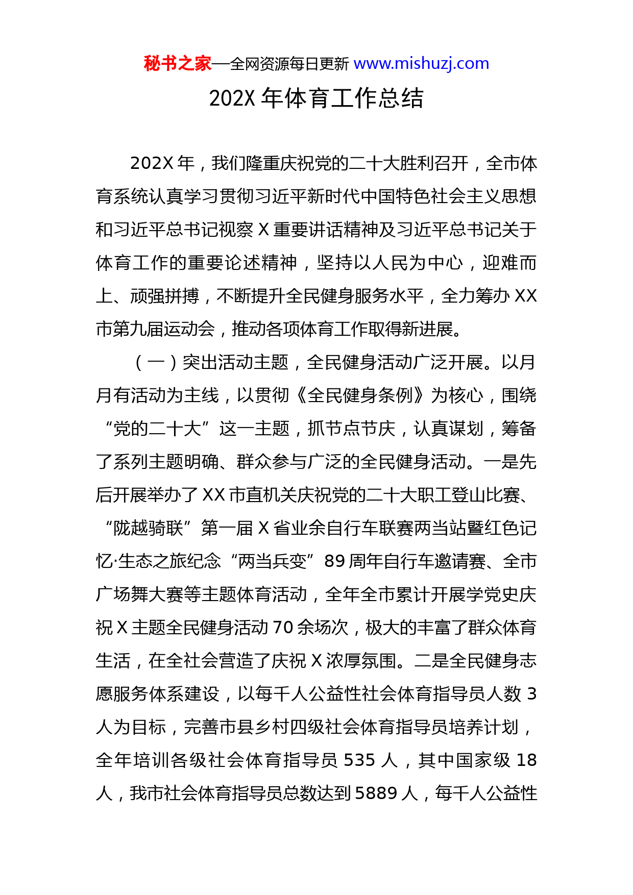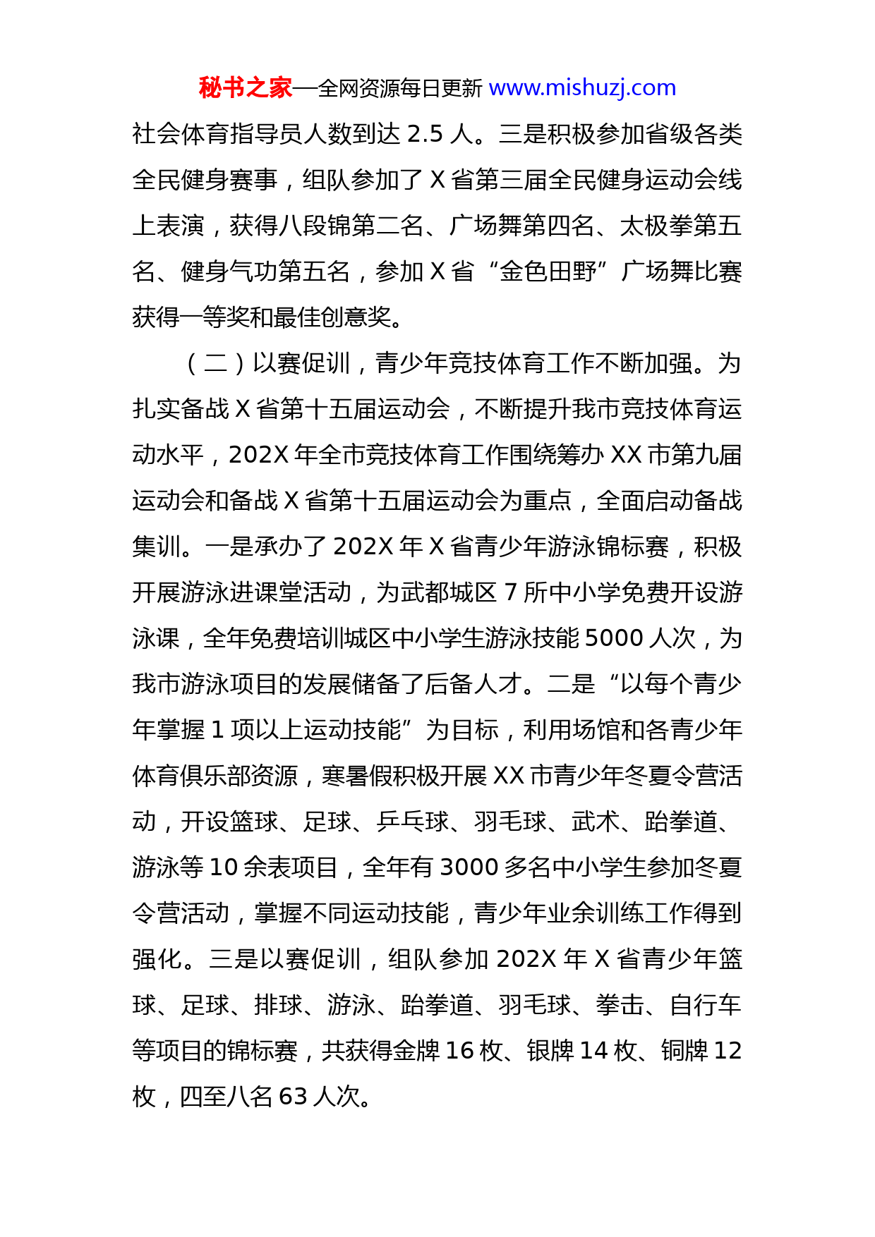 秘书之家—全网资源每日更新www.mishuzj.com202X年体育工作总结202X年,我们隆重庆祝党的二十大胜利召开,全市体育系统认真学习贯彻习近平新时代中国特色社会主义思想和习近平总书记视察X重要讲话精神及习近平总书记关于体育工作的重要论述精神,坚持以人民为中心,迎难而上、顽强拼搏,不断提升全民健身服务水平,全力筹办XX市第九届运动会,推动各项体育工作取得新进展。(一)突出活动主题,全民健身活动广泛开展。以月月有活动为主线,以贯彻《全民健身条例》为核心,围绕“党的二十大”这一主题,抓节点节庆,认真谋划,筹备了系列主题明确、群众参与广泛的全民健身活动。一是先后开展举办了XX市直机关庆祝党的二十大职工登山比赛、“陇越骑联”第一届X省业余自行车联赛两当站暨红色记忆·生态之旅纪念“两当兵变”89周年自行车邀请赛、全市广场舞大赛等主题体育活动,全年全市累计开展学党史庆祝X主题全民健身活动70余场次,极大的丰富了群众体育生活,在全社会营造了庆祝X浓厚氛围。二是全民健身志愿服务体系建设,以每千人公益性社会体育指导员人数3人为目标,完善市县乡村四级社会体育指导员培养计划,全年培训各级社会体育指导员535人,其中国家级18人,我市社会体育指导员总数达到5889人,每千人公益性秘书之家—全网资源每日更新www.mishuzj.com社会体育指导员人数到达2.5人。三是积极参加省级各类全民健身赛事,组队参加了X省第三届全民健身运动会线上表演,获得八段锦第二名、广场舞第四名、太极拳第五名、健身气功第五名,参加X省“金色田野”广场舞比赛获得一等奖和最佳创意奖。(二)以赛促训,青少年竞技体育工作不断加强。为扎实备战X省第十五届运动会,不断提升我市竞技体育运动水平,202X年全市竞技体育工作围绕筹办XX市第九届运动会和备战X省第十五届运动会为重点,全面启动备战集训。一是承办了202X年X省青少年游泳锦标赛,积极开展游泳进课堂活动,为武都城区7所中小学免费开设游泳课,全年免费培训城区中小学生游泳技能5000人次,为我市游泳项目的发展储备了后备人才。二是“以每个青少年掌握1项以上运动技能”为目标,利用场馆和各青少年体育俱乐部资源,寒暑假积极开展XX市青少年冬夏令营活动,开设篮球、足球、乒乓球、羽毛球、武术、跆拳道、游泳等10余表项目,全年有3000多名中小学生参加冬夏令营活动,掌握不同运动技能,青少年业余训练工作得到强化。三是以赛促训,组队参加202X年X省青少年篮球、足球、排球、游泳、跆拳道、羽毛球、拳击、自行车等项目的锦标赛,共获得金牌16枚、银牌14枚、铜牌12枚,四至八名63人次。秘书之家—全网资源每日更新www.mishuzj.com四是市县联动举办了XX市“奔跑吧·少年”主题健身系列活动,在XX体育中心设主会场、各县区设分会场,开展了足球、拳击、游泳、乒乓球等项目的主题健身活动,全市12个俱乐部2000余名青少年参加健身活动,活动的开展为引导青少年参与健身、崇尚健身,培养科学的健身习惯打下了良好的基础。五是全力筹办XX市第九届运动会,参加本届运动会的共有30个代表团和38个代表队,其中运动员2661人、领队210人、教练员320人、裁判员379人,共计3570人,已完成第一阶段跆拳道、武术、足球、排球、乒乓球五个项目的比赛。作为202X年市政府确定的重点工作,因疫情影响,市体育局按照时间节点有序推动筹办工作,其余项目和开幕式将于今年4月中旬举行。(三)加大项目争取力度,公共体育设施不断完善。抢抓8.12暴洪灾害重建机遇,积极上报灾后维修新建项目,争取省体育局项目资金2627万元,其中:XX市体育中心维修项目450万元,西和县奥林匹克体育场维修及设备购置项目200万元,两当县体育基础设施建设项目200万元,成县体育中心改造提升项目200万元,礼县体育场维修项目200万元,文县玉虚山公园健身步道、碧口健身步道、文县铁楼乡全民健身步道建设项目860万元,文县体育场馆灾后维修提升工程417万元,康县全民健身中心秘书之家—全网资源每日更新www.mishuzj.com维修项目100万元,除文县铁楼乡全民健身步道、体育场馆维修提升工程正在实施,其余项目已全部完成建设任务投入使用。按照打造15分钟健身圈目标,促进城乡基础设施建设均衡化,积极与园林、城建、林草、社区等部门的沟通协调工作,新建多功能运动场6个,建设礼县、徽县健身步道两条,累计投入资金600万元。这些项目的建成,进一步完善了公共体育基础设施,健身群众锻炼场地环境得到进一步优化。(四)以赛事拉消费,体育产业发展稳步推进。认真贯彻落实体育产业发展政策,坚持供需两端发力,加快自行车、山地户外、登山徒步、垂钓、冰雪等产业项目的谋划;推动两当山地自行车邀请赛赛事水平、规模提升工作,纳入全省品牌赛事范围,举办了“陇越骑联”第一届X省业余自行车联赛两当站暨红色记忆·生态之旅纪念“两当兵变”89周年自行车邀请赛、成县渔乐农庄全国钓鱼邀请赛等赛事,乡村骑行、乡村马拉松成为全民健身的新潮流,通过举办各类赛事,拉动体育服装、体育健身消费明显,有力的拉动了农家乐、土特产等的销售。受高频“11选5”退市影响,我市积极探索体彩销售新的增长点,全年全市累计销售体育彩票2.19亿元,市场份额69%,总销量全省第六。(五)聚焦服务大局,助力乡村振兴。全面总