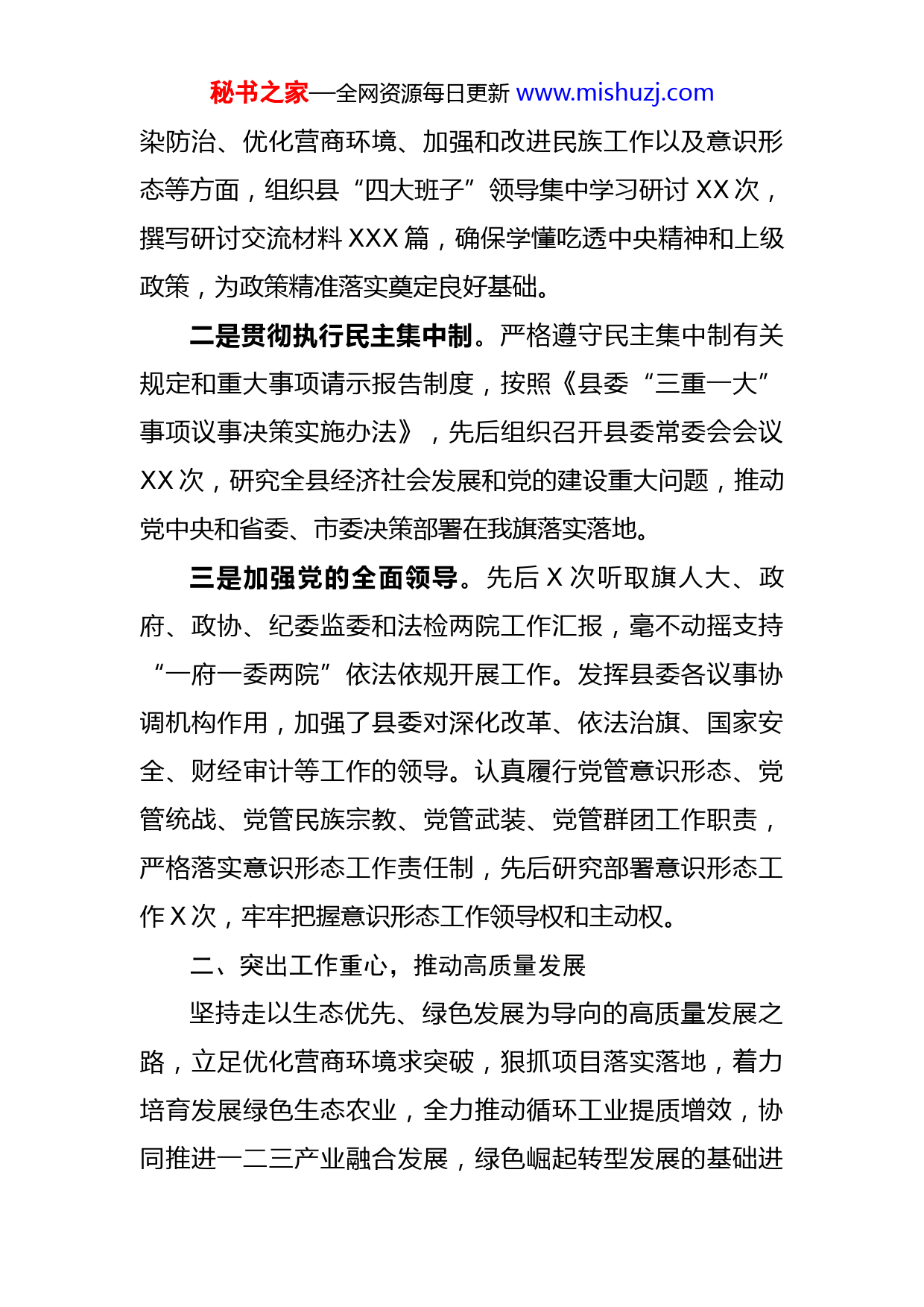 秘书之家—全网资源每日更新www.mishuzj.com202X年县委书记述职述廉述法报告202X年,我坚持以习近平新时代中国特色社会主义思想为指引,认真学习贯彻党的十九大、十九届二中三中四中五中六中全会精神,团结带领全县各族干部群众守初心、担使命,积极作为、砥砺奋进,推动全县经济社会发展和党的建设取得了新的成绩。预计全年完成地区生产总值XXX亿元,同比增长X%;固定资产投资完成XX亿元,同比增长XX%;一般公共预算收入完成X亿元,同比增长X%;社会消费品零售总额完成XX亿元,同比降低X%;城乡居民人均可支配收入分别达到XXXXX元和XXXXX元,同比增长X%和X%。现将一年来履职尽责情况报告如下。一、加强政治引领,全面扛起“第一责任人”责任始终坚持把学习贯彻党中央各项重大决策部署和习近平总书记重要指示批示精神,特别是对XX工作的重要讲话精神作为践行“两个维护”的根本落脚点。一是强化理论武装。严格执行每周一集中学习、每月至少一次理论学习中心组学习制度不动摇,及时跟进学习党中央重大决策部署和习近平总书记重要指示批示精神,全年组织县委常委会、县委理论学习中心组集中学习XX次。特别是今年以来,围绕乡村振兴、党史学习教育、污秘书之家—全网资源每日更新www.mishuzj.com染防治、优化营商环境、加强和改进民族工作以及意识形态等方面,组织县“四大班子”领导集中学习研讨XX次,撰写研讨交流材料XXX篇,确保学懂吃透中央精神和上级政策,为政策精准落实奠定良好基础。二是贯彻执行民主集中制。严格遵守民主集中制有关规定和重大事项请示报告制度,按照《县委“三重一大”事项议事决策实施办法》,先后组织召开县委常委会会议XX次,研究全县经济社会发展和党的建设重大问题,推动党中央和省委、市委决策部署在我旗落实落地。三是加强党的全面领导。先后X次听取旗人大、政府、政协、纪委监委和法检两院工作汇报,毫不动摇支持“一府一委两院”依法依规开展工作。发挥县委各议事协调机构作用,加强了县委对深化改革、依法治旗、国家安全、财经审计等工作的领导。认真履行党管意识形态、党管统战、党管民族宗教、党管武装、党管群团工作职责,严格落实意识形态工作责任制,先后研究部署意识形态工作X次,牢牢把握意识形态工作领导权和主动权。二、突出工作重心,推动高质量发展坚持走以生态优先、绿色发展为导向的高质量发展之路,立足优化营商环境求突破,狠抓项目落实落地,着力培育发展绿色生态农业,全力推动循环工业提质增效,协同推进一二三产业融合发展,绿色崛起转型发展的基础进秘书之家—全网资源每日更新www.mishuzj.com一步夯实。一是着力优化营商环境,狠抓项目落地。全面落实“放管服”改革各项举措,制定实施《XX县打造一流营商环境若干措施的通知》,推动行政审批和政务服务局挂牌成立,XX个部门XXX项行政许可事项实现分批划转、一窗办理。202X年实施工业重点项目XX个,新建的XXXX、XXXX中心四期、XX四期等XX个项目已全面开工建设;续建的XXXXX项目、XXXXX项目、XXX陶瓷、XXXX仪器等项目已投入生产。培育规上工业企业XX家,规模以上工业总产值完成XXX亿元,XXXX公司、XXXX公司连续X年荣获全省民营企业百强榜,工业发展后劲不断增强。二是农业农村全面进步。全力推动优势特色产业发展,XXXXXX、XXXX项目顺利推进,引进XXX肉牛XXXX头,年出栏生猪XX万口、牛XX万头、羊XX万只。以创建国家XXXXX产业园为契机,成立以我为组长的工作领导小组,并由县委班子成员、农业部门和各乡镇主要负责同志牵头,全面推进产业园种植区内XX个行政村整村土地流转,并全程实施机械化操作,进一步实现小农户与现代农业有机衔接,促进全县农业产业再上一个新台阶。全县粮食作物播种面积达到XX万亩,经济作物播种面积达到XX万亩,综合机械化水平达XX%。完成XX万亩秘书之家—全网资源每日更新www.mishuzj.com高标准农田建设任务和XX万亩农业灌溉面积节水改革任务。三、践行为民宗旨,着力改善民生坚持以人民为中心的发展思想,着力解决群众的操心事、烦心事,不断提升人民群众的获得感、幸福感、安全感。一是着力提升城乡建设水平。坚持城乡统筹推进、新旧区一体化发展的思路,城乡居民宜居宜业水平显著提升。全县房地产项目累计开工XXX万平米,新建续建市政道路项目X个,新区道路“微循环”进一步畅通。高铁站前广场基础设施建设进一步完善,游客集散中心及其配套项目前期工作顺利开展。圆满完成XXX户棚户区改造任务以及配套基础设施建设,XX个老旧小区改造基本完工,群众幸福感、满意度显著提升。二是着力提升民生保障水平。年内新增城镇就业XXX人以上,城镇登记失业率控制在X%以内。严格落实惠企利民政策,发放创业担保贷款、稳岗补贴、以工代训补贴共计XXX万元。严格执行《保障农民工工资支付条例》,稳步推进“两网化”工作,保障农民工工资及时足额发放。完成农村户厕改造XXXX户,普及率达到XX%。普惠性幼儿园覆盖率达到XX%。职业教育职合办学办学模式成果显著,招生数创历年新高,升学率、就业率实现双百佳绩。秘书之家—全网资源每日更新www.mishuzj.com实施最严格的疫情防控措施,全年组织召开疫情防控领导小组会X次,统筹抓好疫情防控和经济社会发展,加强小区、高铁、火车站、集贸市场