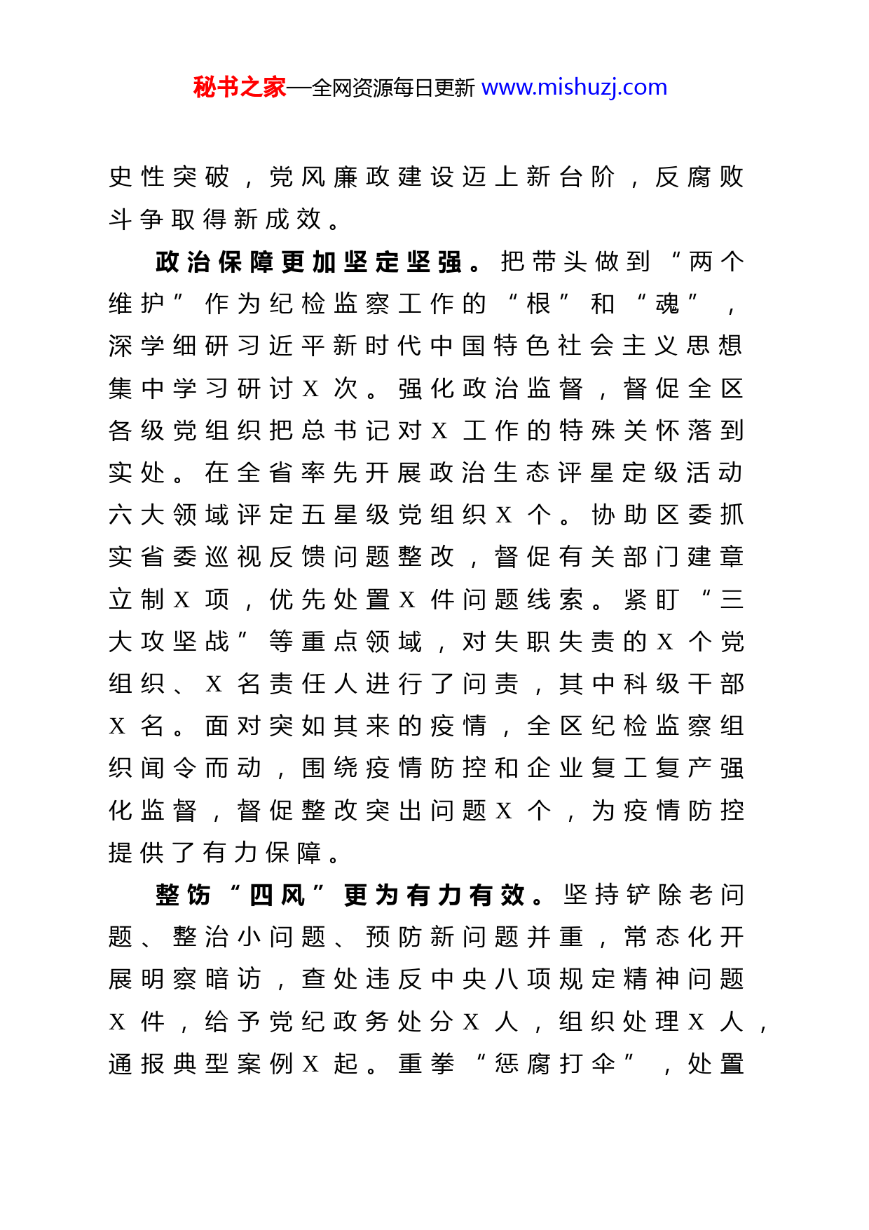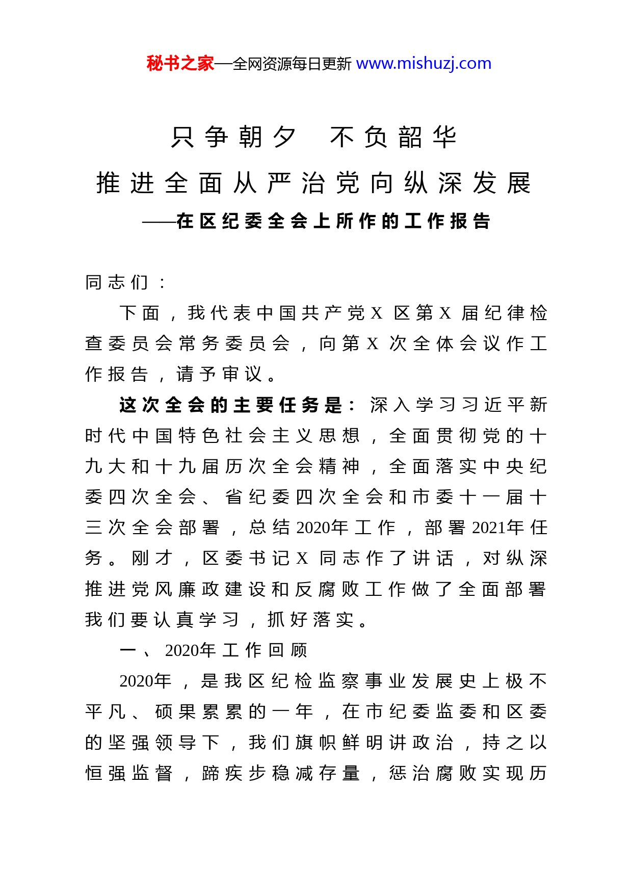 秘书之家—全网资源每日更新www.mishuzj.com只争朝夕不负韶华推进全面从严治党向纵深发展——在区纪委全会上所作的工作报告同志们:下面,我代表中国共产党X区第X届纪律检查委员会常务委员会,向第X次全体会议作工作报告,请予审议。这次全会的主要任务是:深入学习习近平新时代中国特色社会主义思想,全面贯彻党的十九大和十九届历次全会精神,全面落实中央纪委四次全会、省纪委四次全会和市委十一届十三次全会部署,总结2020年工作,部署2021年任务。刚才,区委书记X同志作了讲话,对纵深推进党风廉政建设和反腐败工作做了全面部署我们要认真学习,抓好落实。一、2020年工作回顾2020年,是我区纪检监察事业发展史上极不平凡、硕果累累的一年,在市纪委监委和区委的坚强领导下,我们旗帜鲜明讲政治,持之以恒强监督,蹄疾步稳减存量,惩治腐败实现历秘书之家—全网资源每日更新www.mishuzj.com史性突破,党风廉政建设迈上新台阶,反腐败斗争取得新成效。政治保障更加坚定坚强。把带头做到“两个维护”作为纪检监察工作的“根”和“魂”,深学细研习近平新时代中国特色社会主义思想集中学习研讨X次。强化政治监督,督促全区各级党组织把总书记对X工作的特殊关怀落到实处。在全省率先开展政治生态评星定级活动六大领域评定五星级党组织X个。协助区委抓实省委巡视反馈问题整改,督促有关部门建章立制X项,优先处置X件问题线索。紧盯“三大攻坚战”等重点领域,对失职失责的X个党组织、X名责任人进行了问责,其中科级干部X名。面对突如其来的疫情,全区纪检监察组织闻令而动,围绕疫情防控和企业复工复产强化监督,督促整改突出问题X个,为疫情防控提供了有力保障。整饬“四风”更为有力有效。坚持铲除老问题、整治小问题、预防新问题并重,常态化开展明察暗访,查处违反中央八项规定精神问题X件,给予党纪政务处分X人,组织处理X人,通报典型案例X起。重拳“惩腐打伞”,处置秘书之家—全网资源每日更新www.mishuzj.com涉黑涉恶腐败和“保护伞”问题线索X件,立案查处党员干部涉黑涉恶及保护伞问题X件,给予党纪政务处分X人,中央督导组移交X件线索全部按期“清零”。开展“一卡通”专项治理,对X个党组织X名责任人进行严肃处理。开展“转变作风改善发展环境建设年”“基层减负年”“四察四治”活动,整治形式主义官僚主义倾向性问题X个,立案X件,处理X人。监督专责突出精准精细。咬定监督专责抓源头、除苗头,用好全省扶贫领域大数据监督平台,录入政府投资项目建设数据X宗,核查惠农惠民异常信息X余条。严把政治关、品行关、作风关、廉洁关,回复廉洁意见X批X人次,建议暂缓任用干部X人,X个区管班子X名区管干部被取消评优资格。开展信访举报宣传周活动,鼓励实名举报、强化群众监督。探索制定《派驻机构日常监督暂行办法》《八问八查八移送四公开工作办法》等制度,以清单化的方式提升派驻监督规范化水平。开展X轮常规巡察和民生领域专项巡察,发现问题X个,移交问题线索X件,一体推进“四项监督”的政治效果、纪法效果和社会效果不断显现。秘书之家—全网资源每日更新www.mishuzj.com惩治腐败彰显力度温度。在巡视整改、扫黑除恶任务叠加的背景下,稳中求进减存量,全员办案挖潜力。全区纪检监察机关受理信访举报X件,同比增长X%。处置问题线索X件,同比增长X%,立案X件X人,同比增长X%。给予党纪政务处分X人,移送司法机关X件X人,收缴涉案资金X万元。严肃查办了X、X等人严重违法犯罪问题。处置指定管辖案件X件。以留置场所和“走读式”谈话为重点狠抓办案安全,健全完善制度X项,整改安全隐患X个。以“铁案工程”为标尺狠抓案件评查和处分执行,整改处分执行不到位问题X件。拓展信访监督渠道,移交部门处置信访问题X件,线索评估会研判了结X件,澄清是非X件,容错处理X件,占信访总数的X%。推行同志式谈话,开展思想政治工作大调研、大宣讲。源头治理凸显创新创制。廉政教育常态化开展,以省纪委、市纪委拍摄的X部警示教育片为基本素材,各级党组织普遍开展了警示教育X廉洁文化主题公园被省纪委监委确定为首批省级廉政教育基地,“不忘初心、牢记使命”展览厅在主题教育中发挥了积极作用。召开秘书之家—全网资源每日更新www.mishuzj.com“不忘初心、牢记使命”警示教育大会,以案为鉴强化思想洗礼。建立发案单位“一函一谈一通报”治本机制,发出纪检监察建议书X份。办好X廉政网、X纪检监察微信公众号,用好《X纪检》、文艺特刊、“清风X”专栏,努力营造风清气正的浓厚氛围。铸魂塑能展现风采风貌。坚持政治磨砺、实践锻造强根基,抓实纪检监察系统“不忘初心牢记使命”主题教育和机关党建工作,采取办夜校、搞讲座、谈心得、考法条等方式深化全员培训,中央纪委调训纪检监察干部X人次,全员参加全国纪检监察系统应知应会闭卷测试X分以上人数占比X%。狠抓干部轮岗锻炼,分批次分层次调整干部X人次,轮岗交流X人次。高质量完成“一带一路”国家反腐败研修班来X考察保障工作。完成综合办公楼维修改造、留置场所存储扩容项目,组队参加全区庆国庆歌咏比赛荣获二等奖,以趣味运动会、篝火晚会、红色教育等载体,持续增强队伍活力。铁面解决“灯下黑”问题,处置纪检监察干部问题线索X