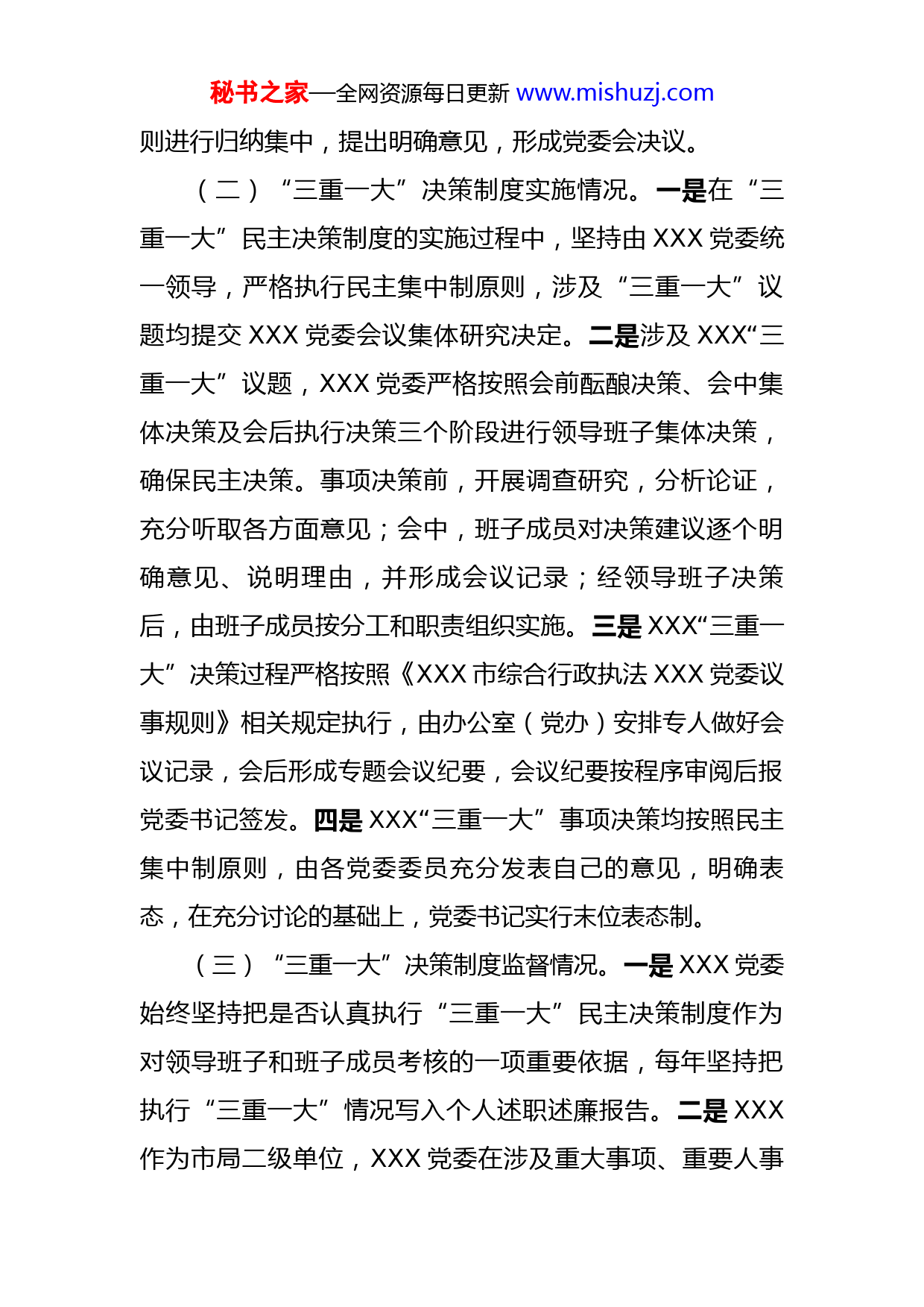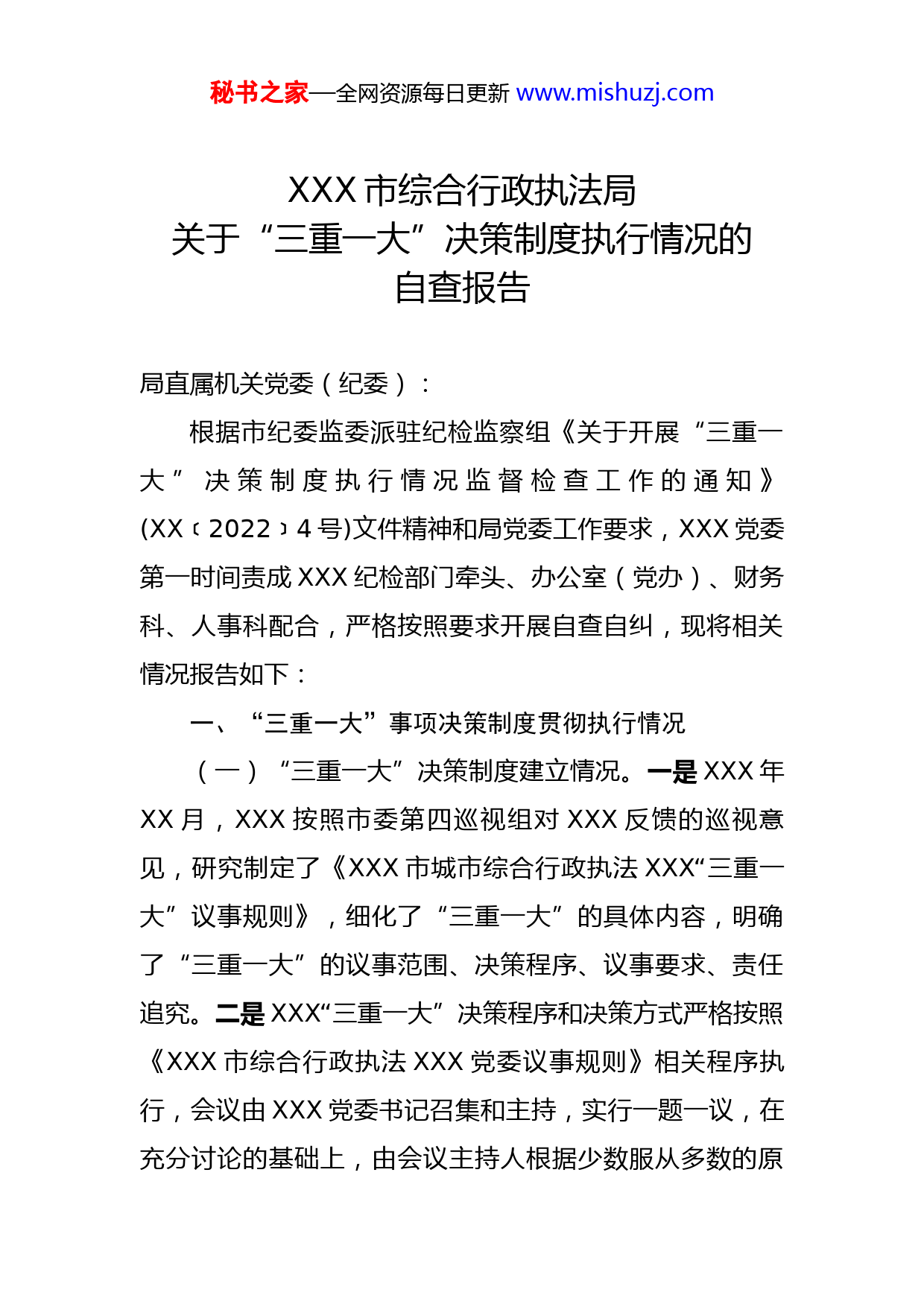 秘书之家—全网资源每日更新www.mishuzj.comXXX市综合行政执法局关于“三重一大”决策制度执行情况的自查报告局直属机关党委(纪委):根据市纪委监委派驻纪检监察组《关于开展“三重一大”决策制度执行情况监督检查工作的通知》(XX20﹝224﹞号)文件精神和局党委工作要求,XXX党委第一时间责成XXX纪检部门牵头、办公室(党办)、财务科、人事科配合,严格按照要求开展自查自纠,现将相关情况报告如下:一、“三重一大”事项决策制度贯彻执行情况(一)“三重一大”决策制度建立情况。一是XXX年XX月,XXX按照市委第四巡视组对XXX反馈的巡视意见,研究制定了《XXX市城市综合行政执法XXX“三重一大”议事规则》,细化了“三重一大”的具体内容,明确了“三重一大”的议事范围、决策程序、议事要求、责任追究。二是XXX“三重一大”决策程序和决策方式严格按照《XXX市综合行政执法XXX党委议事规则》相关程序执行,会议由XXX党委书记召集和主持,实行一题一议,在充分讨论的基础上,由会议主持人根据少数服从多数的原秘书之家—全网资源每日更新www.mishuzj.com则进行归纳集中,提出明确意见,形成党委会决议。(二)“三重一大”决策制度实施情况。一是在“三重一大”民主决策制度的实施过程中,坚持由XXX党委统一领导,严格执行民主集中制原则,涉及“三重一大”议题均提交XXX党委会议集体研究决定。二是涉及XXX“三重一大”议题,XXX党委严格按照会前酝酿决策、会中集体决策及会后执行决策三个阶段进行领导班子集体决策,确保民主决策。事项决策前,开展调查研究,分析论证,充分听取各方面意见;会中,班子成员对决策建议逐个明确意见、说明理由,并形成会议记录;经领导班子决策后,由班子成员按分工和职责组织实施。三是XXX“三重一大”决策过程严格按照《XXX市综合行政执法XXX党委议事规则》相关规定执行,由办公室(党办)安排专人做好会议记录,会后形成专题会议纪要,会议纪要按程序审阅后报党委书记签发。四是XXX“三重一大”事项决策均按照民主集中制原则,由各党委委员充分发表自己的意见,明确表态,在充分讨论的基础上,党委书记实行末位表态制。(三)“三重一大”决策制度监督情况。一是XXX党委始终坚持把是否认真执行“三重一大”民主决策制度作为对领导班子和班子成员考核的一项重要依据,每年坚持把执行“三重一大”情况写入个人述职述廉报告。二是XXX作为市局二级单位,XXX党委在涉及重大事项、重要人事秘书之家—全网资源每日更新www.mishuzj.com任免、重大项目、大额度资金使用方面均提前向局党委请示报告,待局党委同意后再提交XXX党委会研究讨论。三是XXX党委把除依法应保密的外,对年终优秀等次评选、上级评先选优人选推荐、领导班子成员分工、职级使用、积分制考核、办公楼搬迁等事项定期或不定期地在相应范围内公开,主动接受监督。(四)违反“三重一大”决策制度情况。一是XXX党委始终坚持民主集中制,不存在不经集体讨论决定的“三重一大”事项或不按决策执行、执行不力等问题。二是XXX党委在决策讨论过程中,参会委员均能有效发表自己的意见看法,不存在随意性、盲目性,坚持原则不够问题,但是在个别临时提交的议题上,存在酝酿不够充分,会上讨论时间过长的情况。二、存在的主要问题经自查,发现我单位在落实“三重一大”事项决策执行过程中还存在以下不足:一是制度更新不及时。XXX年XX月,根据我市综合行政执法体制改革需要,市编委对XXX的“三定方案”进行了重新修订,XXX职能部门发生调整、执法事项范围扩大,XXX未能及时根据新三定方案和《XXX市纪委监委派驻检监察组被监督单位“三重一大”事项监督管理办法》重新修订完善XXX“三重一大”议事规则。秘书之家—全网资源每日更新www.mishuzj.com二是监督力度有待加强。XXX年XX月,经市纪委同意,免去了XXX纪检监察室主任(兼职)职务,此后,XXX纪检监察室主任空缺。从2019年9月至2021年4月,XXX纪检工作均由专职纪检员负责,其中2018年12月至XXX年12月抽调市局直属机关纪委工作,导致在执行“三重一大”制度过程中,监督方式和监督力度都有一定程度的弱化,没有充分发挥纪检部门监督职能。三是未建立年度“三重一大”决策事项计划。2020年以来,XXX党委领导班子成员发生了较大调整,于今年7月才配齐党委领导班子,导致年初未能及时建立今年年度“三重一大”决策事项计划。三、下一步工作打算一是完善制度内容。结合XXX三定方案和《XXX市纪委监委派驻纪检监察组被监督单位“三重一大”事项监督管理办法》实际,从工作实际出发,修订完善XXX现有的“三重一大”制度,细化“三重一大”的决策范围、事项和权限。既保证决策权力受到制约,又保护和调动决策者的工作积极性,兼顾民主和效率。二是强化监督制约。自觉接受上级纪委的监督和指导,严格按照市局纪委要求报备。自觉接受干部职工的监督,进一步加强信息公开,不断在监督方式和公示制度上加以创新。目前,XXX纪委书记已经到岗,XXX将进一步秘书之家—全网资源每日更新www.mishuzj.com完善XXX“三重一大”议事规则,将纪委监督职责写入议事规则,并严格执行修订后的制度,充分发挥纪检部门监督作用。三是加强学习宣传。通过召开专题学习会、邀请相关领域专家讲课等方式学习“三重一大”制度