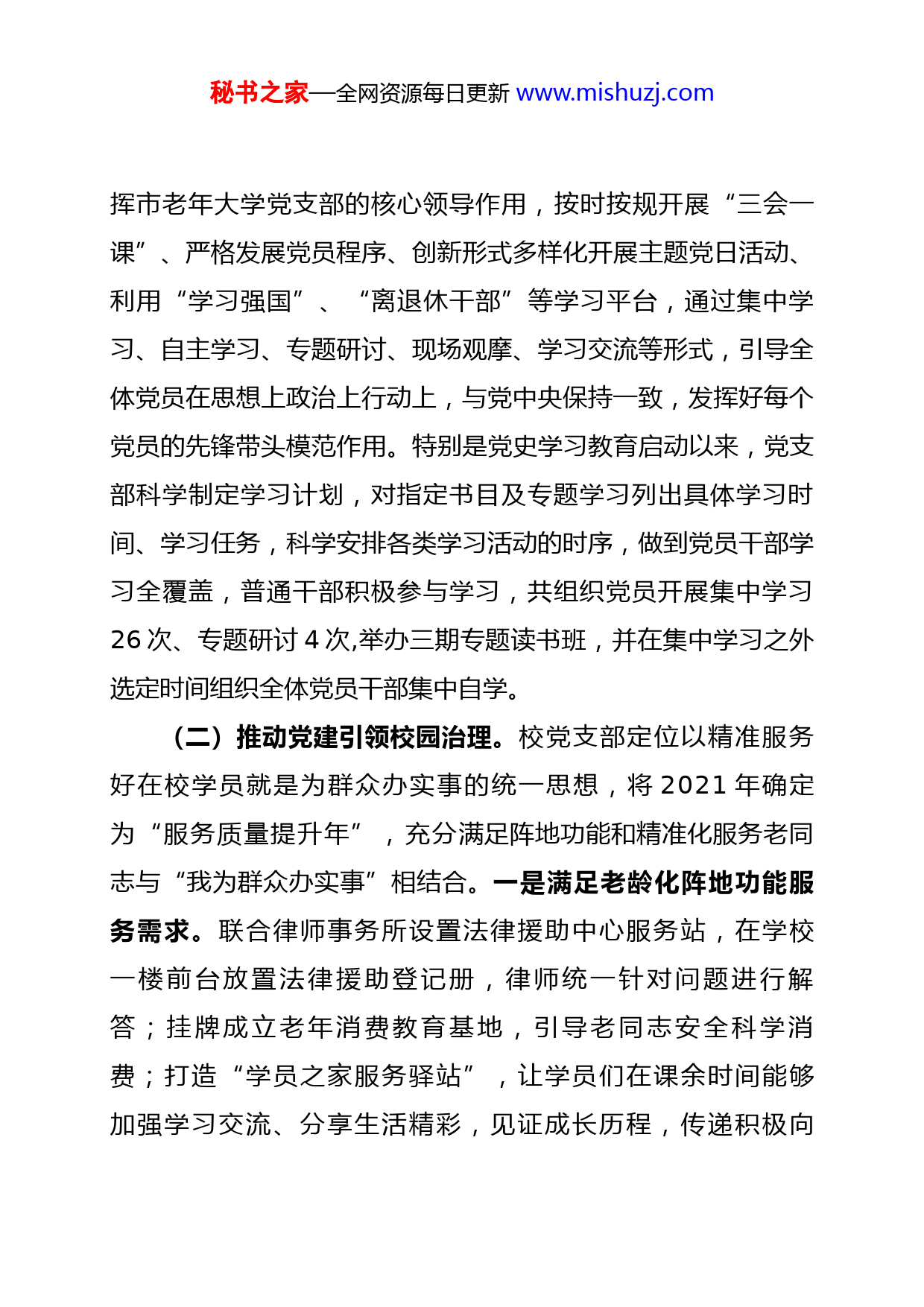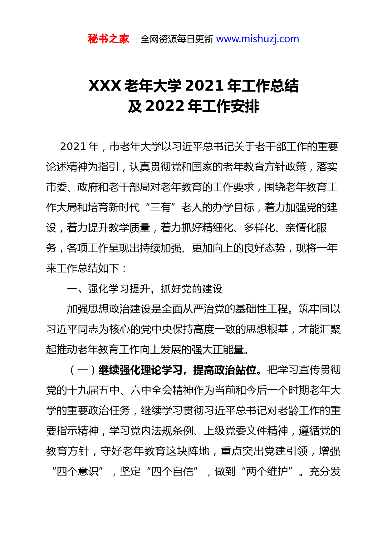 秘书之家—全网资源每日更新www.mishuzj.comXXX老年大学2021年工作总结及2022年工作安排2021年,市老年大学以习近平总书记关于老干部工作的重要论述精神为指引,认真贯彻党和国家的老年教育方针政策,落实市委、政府和老干部局对老年教育的工作要求,围绕老年教育工作大局和培育新时代“三有”老人的办学目标,着力加强党的建设,着力提升教学质量,着力抓好精细化、多样化、亲情化服务,各项工作呈现出持续加强、更加向上的良好态势,现将一年来工作总结如下:一、强化学习提升,抓好党的建设加强思想政治建设是全面从严治党的基础性工程。筑牢同以习近平同志为核心的党中央保持高度一致的思想根基,才能汇聚起推动老年教育工作向上发展的强大正能量。(一)继续强化理论学习,提高政治站位。把学习宣传贯彻党的十九届五中、六中全会精神作为当前和今后一个时期老年大学的重要政治任务,继续学习贯彻习近平总书记对老龄工作的重要指示精神,学习党内法规条例、上级党委文件精神,遵循党的教育方针,守好老年教育这块阵地,重点突出党建引领,增强“四个意识”,坚定“四个自信”,做到“两个维护”。充分发秘书之家—全网资源每日更新www.mishuzj.com挥市老年大学党支部的核心领导作用,按时按规开展“三会一课”、严格发展党员程序、创新形式多样化开展主题党日活动、利用“学习强国”、“离退休干部”等学习平台,通过集中学习、自主学习、专题研讨、现场观摩、学习交流等形式,引导全体党员在思想上政治上行动上,与党中央保持一致,发挥好每个党员的先锋带头模范作用。特别是党史学习教育启动以来,党支部科学制定学习计划,对指定书目及专题学习列出具体学习时间、学习任务,科学安排各类学习活动的时序,做到党员干部学习全覆盖,普通干部积极参与学习,共组织党员开展集中学习26次、专题研讨4次,举办三期专题读书班,并在集中学习之外选定时间组织全体党员干部集中自学。(二)推动党建引领校园治理。校党支部定位以精准服务好在校学员就是为群众办实事的统一思想,将2021年确定为“服务质量提升年”,充分满足阵地功能和精准化服务老同志与“我为群众办实事”相结合。一是满足老龄化阵地功能服务需求。联合律师事务所设置法律援助中心服务站,在学校一楼前台放置法律援助登记册,律师统一针对问题进行解答;挂牌成立老年消费教育基地,引导老同志安全科学消费;打造“学员之家服务驿站”,让学员们在课余时间能够加强学习交流、分享生活精彩,见证成长历程,传递积极向秘书之家—全网资源每日更新www.mishuzj.com上的正能量,提升市老年大学的校园文化内涵;在校门口一楼前台设置“服务值班台”,实行校长、副校长和管理人员服务台轮流坐班制,随时应对老同志在业务咨询、法律援助、智能手机、报餐服务、答疑解惑和应急处置等服务工作。二是提供精准规范的校园服务。为创造温馨舒适的校园学习环境,学校从教学楼各处方便学员使用需求入手,在学校自查和研究讨论基础上,开设“服务质量举报箱”、“服务意见征集箱”,准确掌握学员在校期间的服务需求,制定出十二条精准规范服务学员具体举措。在校园内加装卫生间热水器、改善教室照明环境、放置午休折叠床、改造餐厅为学员提供成本价就餐等方便学员之需,为学员提供舒心暖心的服务和温馨舒适的校园学习环境。(三)深化党风廉政建设,把从严治党落到实处。一是定期组织开展党风党纪教育,认真查找岗位风险点,制定防范措施,通过集体学习、网上参观、实地参观等多种形式提高党风廉政教育质量,确保全体干部职工不触底线、不踩红线,为履行全面从严治党主体责任提供了强有力的组织保证。二是建立健全行之有效的党风廉政建设工作制度,推动中央“八项规定”的落实。通过加强廉政楼体文化建设、LED宣传屏、微信公众号、制作宣传栏、观看警示教育片、到红色教育基地接受教育等方式,积极营秘书之家—全网资源每日更新www.mishuzj.com造浓厚的学习氛围,提升思想境界,树立廉洁意识,保持敬畏之心,用先进群体的精神教育引导党员干部,形成上下联动,齐抓共管的的工作运行机制。三是积极认真开展廉洁谈心谈话,自觉接受纪检督查,进一步提高拒腐防变能力。(四)提升离退休党支部党建质量。坚持政治建校办学理念,切实加强老年大学离退休党组织建设。一是充分引导各离退休党支部在参加基础集体学习之外充分利用学习强国、智慧党建、中国老年大学等新媒体及载体平台进行自学,线上通过微课堂对支部和第二联合党委深化党史学习教育;二是合理制定离退休党支部党员教育学习计划,以党课、文体比赛、外出采风、社会实践等形式拓展教育学习方式,以座谈研讨等方式提升学习效果。同时积极鼓励党员学员到群众中间去,真正把“深入生活、扎根人民”的理念落到实处。“到民众中去”慰问演出、消夏晚会、理论宣讲、支部书记讲党课等已成为常态化的文艺活动形式;三是组织市直机关离退休第二联合党委各党支部开展“我看建党百年新成就”专题座谈会、党史学习教育动员会、观看党员教育专题片《榜样5》、七一表彰会议,带动了离退休干部党支部的规范化、标准化、制度化建设;四是丰富党内生活,积极搭建正能量平台。开