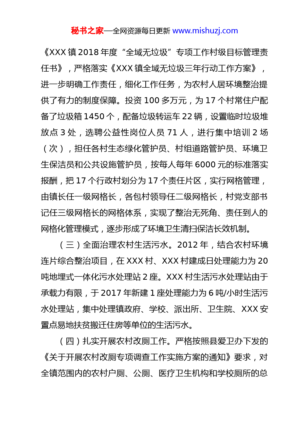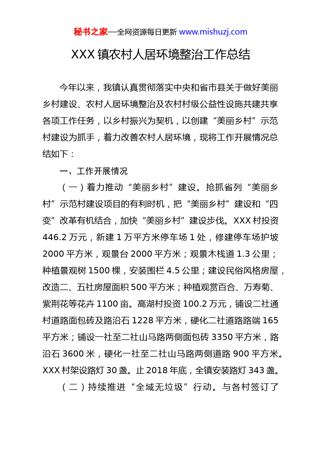 秘书之家—全网资源每日更新www.mishuzj.comXXX镇农村人居环境整治工作总结今年以来,我镇认真贯彻落实中央和省市县关于做好美丽乡村建设、农村人居环境整治及农村村级公益性设施共建共享各项工作任务,以乡村振兴为契机,以创建“美丽乡村”示范村建设为抓手,着力改善农村人居环境,现将工作开展情况总结如下:一、工作开展情况(一)着力推动“美丽乡村”建设。抢抓省列“美丽乡村”示范村建设项目的有利时机,把“美丽乡村”建设和“四变”改革有机结合,加快“美丽乡村”建设步伐。XXX村投资446.2万元,新建1万平方米停车场1处,修建停车场护坡2000平方米,观景台2000平方米;观景木栈道1.3公里;种植景观树1500棵,安装围栏4.5公里;建设民俗风格房屋,改造二、五社房屋面积500平方米;种植观赏百合、万寿菊、紫荆花等花卉1100亩。高湖村投资100.2万元,铺设二社通村道路面包砖及路沿石1228平方米,硬化二社道路路端165平方米;铺设一社至二社山马路两侧面包砖3350平方米,路沿石3600米,硬化一社至二社山马路两侧道路900平方米。XXX村架设路灯30盏。止2018年底,全镇安装路灯343盏。(二)持续推进“全域无垃圾”行动。与各村签订了秘书之家—全网资源每日更新www.mishuzj.com《XXX镇2018年度“全域无垃圾”专项工作村级目标管理责任书》,严格落实《XXX镇全域无垃圾三年行动工作方案》,进一步明确工作责任,细化工作任务,为农村人居环境整治提供了有力的制度保障。投资100多万元,为17个村常住户配备了垃圾箱1450个,配备垃圾转运车22辆,设置临时垃圾堆放点3处,选聘公益性岗位人员71人,进行集中培训2场(次),担任各村生态绿化管护员、村组道路管护员、环境卫生保洁员和公共设施管护员,按每人每年6000元的标准落实报酬,把17个行政村划分为17个责任片区,实行网格管理,由镇长任一级网格长,各包村领导任二级网格长,村党支部书记任三级网格长的网格体系,实现了整治无死角、责任到人的网格化管理模式,逐步形成了环境卫生清扫保洁长效机制。(三)全面治理农村生活污水。2012年,结合农村环境连片综合整治项目,在XXX村、XXX村建成日处理能力为20吨地埋式一体化污水处理站2座。XXX村生活污水处理站由于承载力有限,于2017年新建1座处理能力为6吨/小时生活污水处理站,集中处理镇政府、学校、派出所、卫生院、XXX安置点易地扶贫搬迁住房等单位的生活污水。(四)扎实开展农村改厕工作。严格按照县爱卫办下发的《关于开展农村改厕专项调查工作实施方案的通知》要求,对全镇范围内的农村户厕、公厕、医疗卫生机构和学校厕所的总秘书之家—全网资源每日更新www.mishuzj.com体状况进行摸底调查。止2018年底,建成卫生旱厕554户,完整下水道水冲式厕所224户,无公害厕所1221户,无害化卫生厕所普及率17.4%。(五)大力整治村容村貌。制定下发了《XXX镇加快推进农村危旧房整治工作实施方案》,以上河村、窑坡村2个村为试点,带动全镇危旧房整治全面推进、全域覆盖,已拆除危旧房259户。农村人居环境得到了有效改善。同时,进一步加强畜禽养殖产业管理,严格规范全镇规模化养殖户、个体养殖户,做好畜牧牲畜粪便处理工作,督促XXX村养殖小区新建了粪便发酵存储池,存储牲畜粪便,大力推行种养结合、分户使用、贮粪发酵、过腹还田、粪污零排放等为主的生态养殖模式,推广粪便综合利用,减少养殖污染。二、存在的问题虽然我镇在美丽乡村建设、农村人居环境整治重点工作方面取得了一些成效,但也还存在许多的不足,主要表现为:一是群众的环保意识和参与意识不够强,乱扔垃圾、乱倒污水等陈规陋习仍未根除;二是资金保障仍存在很大压力,户分类、村收集、镇转运费用相对较高,生活垃圾不能及时清理;三是环保长效机制建立难,监督管理人员配备等方面存在覆盖面不够广、队伍力量薄弱等问题。三、下一步工作打算秘书之家—全网资源每日更新www.mishuzj.com下一步,结合全镇“四片、三区、三线、两中心”的“4332”乡村振兴规划,在人居环境改善方面重点做好以下三方面工作。一是着力改善人居环境。投资500万元,拆除S315、S590、S315-S590沿线危旧房300户,栽植云杉、红黄刺玫等乔木和花灌木2万株,在有条件的沿路沿线地段两边各建10米宽的绿化美化带。投资500万元,铺设面包砖、硬化地坪5000平方米,绿化亮化道路4公里,拓宽街道3公里,建成XXX、XXX、XXX3个美丽乡村示范村。加大乡村人居环境改善力度,严格落实“河长制”,持续推进全域无垃圾,完成卫生改厕209户,村公厕5座,新建生活垃圾中转收集站2座,并配套转运设施设备,实现17个村辖区垃圾收集全覆盖。投资25万元,完成陈旧房维修加固10户。投资1170万元,完成易地扶贫搬迁80户、5155平方米的住宅楼建设。二是不断提升集镇整体形象。推进XXX、XXX2个中心集镇建设。投资1300万元,在XXX集镇改造建设总宽度34米的迎宾大道,规划新建农商银行、XXX村委会和农贸市场,新建4000平方米的商务酒店一幢、上宅下店二层别墅式民宅6500平方米。实施空心村集中搬迁安置计划,将高湖、城南、上XXX等周边村分散住户向中心村集中。新建汉唐风格美食文化街,打造“东有一座旅游山、西有一个产业园、南有一处商秘书之家—全网资源每日更新www.mishuzj.com业区、北有一条美食街”的集旅游、住宿、产业、商贸、美食等一、二、三产