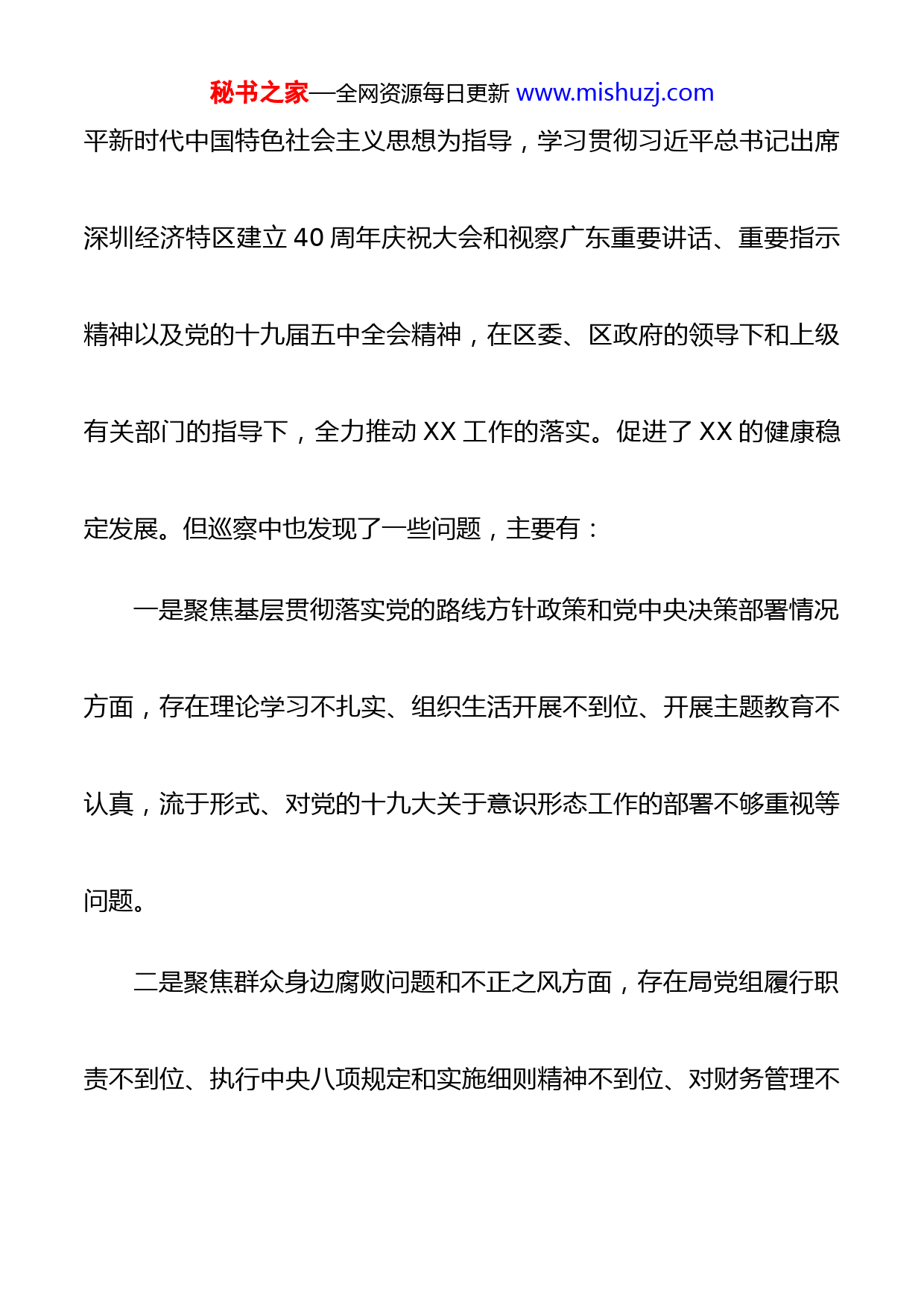 秘书之家—全网资源每日更新www.mishuzj.comXX党组关于巡察情况反馈意见的党内通报XX党支部:根据区委巡察工作领导小组的部署,X年X月X日上午,区委第一巡察组向局党组反馈巡察情况。区委第一巡察组组长X同志通报巡察反馈意见。局党组书记X同志主持会议并作表态发言。组织部副部长X同志出席并对我局巡察整改工作提出工作要求。根据区委巡察工作统一部署,区委第一巡察组于X年X月X日至X年X月X日对局党组开展了巡察。巡察期间,巡察组通过召开巡察工作动员会、民主测评、征求意见、听取汇报、进行个别谈话和专项检查等方式开展工作,深入了解情况,查找问题,顺利完成了巡察工作。X同志在反馈中指出,从巡察情况来看,局党组能够坚持以习近秘书之家—全网资源每日更新www.mishuzj.com平新时代中国特色社会主义思想为指导,学习贯彻习近平总书记出席深圳经济特区建立40周年庆祝大会和视察广东重要讲话、重要指示精神以及党的十九届五中全会精神,在区委、区政府的领导下和上级有关部门的指导下,全力推动XX工作的落实。促进了XX的健康稳定发展。但巡察中也发现了一些问题,主要有:一是聚焦基层贯彻落实党的路线方针政策和党中央决策部署情况方面,存在理论学习不扎实、组织生活开展不到位、开展主题教育不认真,流于形式、对党的十九大关于意识形态工作的部署不够重视等问题。二是聚焦群众身边腐败问题和不正之风方面,存在局党组履行职责不到位、执行中央八项规定和实施细则精神不到位、对财务管理不秘书之家—全网资源每日更新www.mishuzj.com严格、有关人员工作作风不扎实、记账凭证制作不规范,手续不完善等问题。三是聚焦基层党组织领导班子和干部队伍建设方面,存在机关考勤管理不严格、党建主体责任落实不到位、没有执行出入国(境)管理制度等问题。X同志代表局党组作表态发言,表示对区委第一巡察组指出的存在问题和整改意见诚恳接受,照单全收并按照要求坚决做好问题整改。一是切实提高站位,坚决贯彻巡察反馈意见。每位班子成员要按照“一岗双责”要求,带头认领问题,带头抓好分管领域整改,带动全局整改的大合力,促进X各项工作更加规范,用行动巩固和扩大巡察工作成果。二是坚持问题导向,从严从实抓好巡察整改落实。把整改工作作秘书之家—全网资源每日更新www.mishuzj.com为当前和今后一段时间的重中之重的工作来抓,对巡察组反馈问题,逐个制定整改方案和台账,明确整改目标、整改单位、整改责任人和整改时间,不过关的“回炉”重来,做到整改责任具体、整改监督严格、整改制度长效、整改公开到位,切实把整改工作作为一项借力修正、借力完善、全面提高的行动。三是加强队伍建设,着力改进工作作风纪律作风。重点针对党的建设工作薄弱和工作纪律作风落实不到位等问题进行整改。要以党建工作为抓手,严肃党内的政治生活,持之以恒狠抓“四风”,营造优良的政治生态;要树立正确的选人用人导向,形成“想干事、能干事干成事、不出事”的良好风气;要不折不扣履行好党风廉政建设责任制,努力营造风清气正、勤政廉洁的发展环境。秘书之家—全网资源每日更新www.mishuzj.com四是注重统筹兼顾,以巡察整改推动各项工作。贯彻区委巡察组的意见建议,坚持把落实整改与X具体工作结合起来,推动我区X工作发展再上新台阶,用行动巩固和扩大巡察工作成果。X同志对局党组如何抓好巡察整改工作提出三点要求:一是要提高政治站位,扛起主体责任,从严从实抓牢整改落实;二是要突出问题导向,集中发力攻坚,从细从深提升整改实效;三是要强化日常监督,压紧压实责任,抓常抓长巩固巡察成果。切实把思想和行动统一到区委统筹推进疫情防控和经济社会发展工作的重大决策部署上来。