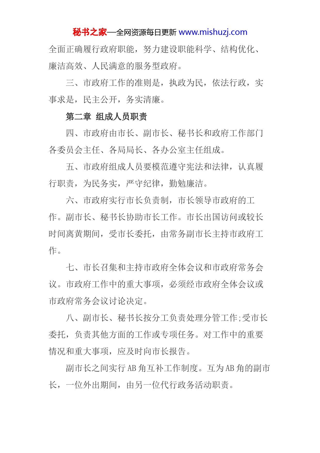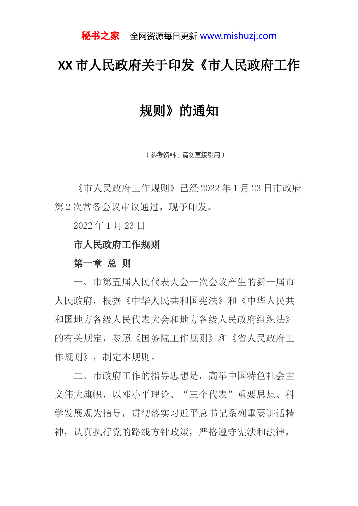 秘书之家—全网资源每日更新www.mishuzj.comXX市人民政府关于印发《市人民政府工作规则》的通知(参考资料,请勿直接引用)《市人民政府工作规则》已经2022年1月23日市政府第2次常务会议审议通过,现予印发。2022年1月23日市人民政府工作规则第一章总则一、市第五届人民代表大会一次会议产生的新一届市人民政府,根据《中华人民共和国宪法》和《中华人民共和国地方各级人民代表大会和地方各级人民政府组织法》的有关规定,参照《国务院工作规则》和《省人民政府工作规则》,制定本规则。二、市政府工作的指导思想是,高举中国特色社会主义伟大旗帜,以邓小平理论、“三个代表”重要思想、科学发展观为指导,贯彻落实习近平总书记系列重要讲话精神,认真执行党的路线方针政策,严格遵守宪法和法律,秘书之家—全网资源每日更新www.mishuzj.com全面正确履行政府职能,努力建设职能科学、结构优化、廉洁高效、人民满意的服务型政府。三、市政府工作的准则是,执政为民,依法行政,实事求是,民主公开,务实清廉。第二章组成人员职责四、市政府由市长、副市长、秘书长和政府工作部门各委员会主任、各局局长、各办公室主任组成。五、市政府组成人员要模范遵守宪法和法律,认真履行职责,为民务实,严守纪律,勤勉廉洁。六、市政府实行市长负责制,市长领导市政府的工作。副市长、秘书长协助市长工作。市长出国访问或较长时间离黄期间,受市长委托,由常务副市长主持市政府工作。七、市长召集和主持市政府全体会议和市政府常务会议。市政府工作中的重大事项,必须经市政府全体会议或市政府常务会议讨论决定。八、副市长、秘书长按分工负责处理分管工作;受市长委托,负责其他方面的工作或专项任务。对工作中的重要情况和重大事项,应及时向市长报告。副市长之间实行AB角互补工作制度。互为AB角的副市长,一位外出期间,由另一位代行政务活动职责。秘书之家—全网资源每日更新www.mishuzj.com九、秘书长在市长领导下,协助常务副市长处理市政府日常工作。十、市政府各部门实行主任、局长负责制,由其领导本部门工作。市政府各部门根据法律、法规和市政府工作规则,在本部门职权范围内履行行政职责。市审计局在市长和上级审计机关领导下,依照法律法规独立行使审计监督职能,不受其他行政机关、社会团体和个人的干涉。市政府各部门要各司其职,各负其责,顾全大局,协调配合,切实维护团结统一、政令畅通,坚决贯彻落实市政府各项工作部署。第三章全面履行政府职能十一、市政府要加快职能转变,全面履行经济调节、市场监管、社会管理和公共服务职能,形成权界清晰、分工合理、权责一致、运转高效、法治保障的机构职能体系,创造良好发展环境,提供基本均等公共服务,维护社会公平正义。十二、全面落实国家宏观调控政策,结合XX实际,主要运用经济、法律手段并辅之以必要的行政手段引导和调控经济运行,推进加快转变经济发展方式,协同推进新型工业化、城镇化、信息化、农业现代化和绿色化,促进全市经济持续健康发展。秘书之家—全网资源每日更新www.mishuzj.com十三、依法严格市场监管,推进公平准入,完善监管体系,规范市场执法,形成统一开放、公平诚信、竞争有序的现代市场体系。十四、加强社会管理制度和能力建设,完善基层社会管理服务,形成源头治理、动态治理、应急处置相结合的社会管理机制,维护社会公平正义与和谐稳定。十五、更加注重公共服务,完善公共政策,健全政府主导、社会参与、覆盖城乡、可持续的基本公共服务体系,增强基本公共服务能力,促进基本公共服务均等化。第四章深入推进依法行政十六、市政府及各部门要带头维护宪法和法律权威,在法治轨道上开展工作,加快建立职能科学、权责法定、执法严明、公开公正、廉洁高效、守法诚信的法治政府。坚持法定职责必须为、法无授权不可为,勇于负责、敢于担当,坚决纠正不作为、乱作为,坚决克服懒政、怠政,坚决惩处失职、渎职。十七、市政府根据经济社会发展的需要,适时向市人民代表大会及其常委会提出地方性法规议案,制定、修改或者废止政府规章和规范性文件,规定行政措施,发布决定和命令。秘书之家—全网资源每日更新www.mishuzj.com提请市政府审议的地方性法规草案和市政府规章草案由市政府法制办公室审查或者组织起草,市政府规章的解释工作由市政府法制办公室承办。市政府制定的规章应及时报国务院、省政府、市人大常委会备案。市政府制定的规范性文件应及时报送省政府和市人大常委会备案。十八、市政府及各部门要坚持科学民主立法,不断提高政府立法质量。起草地方性法规草案、制定政府规章,要坚持从实际出发,准确反映经济社会发展要求,充分反映人民意愿,使所确立的制度能够切实解决问题,简明易行。完善政府立法工作机制,扩大公众参与,除依法需要保密的外,所有地方性法规草案和政府规章草案都要公开征求意见。十九、市政府各部门制定的规范性文件,要符合宪法、法律、法规、规章、上级政策和市政府的决定,严格遵守法定权限和程序。除具体实施法律、法规、规章的规范性文件外,政府及其部门制定的规范性文件应按规定明确有效期。有效期最长不得超过五年。涉及两个以上部门职权范