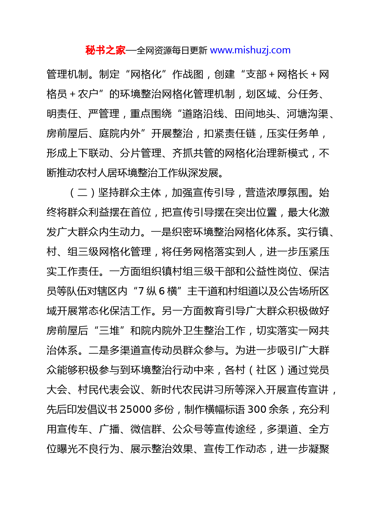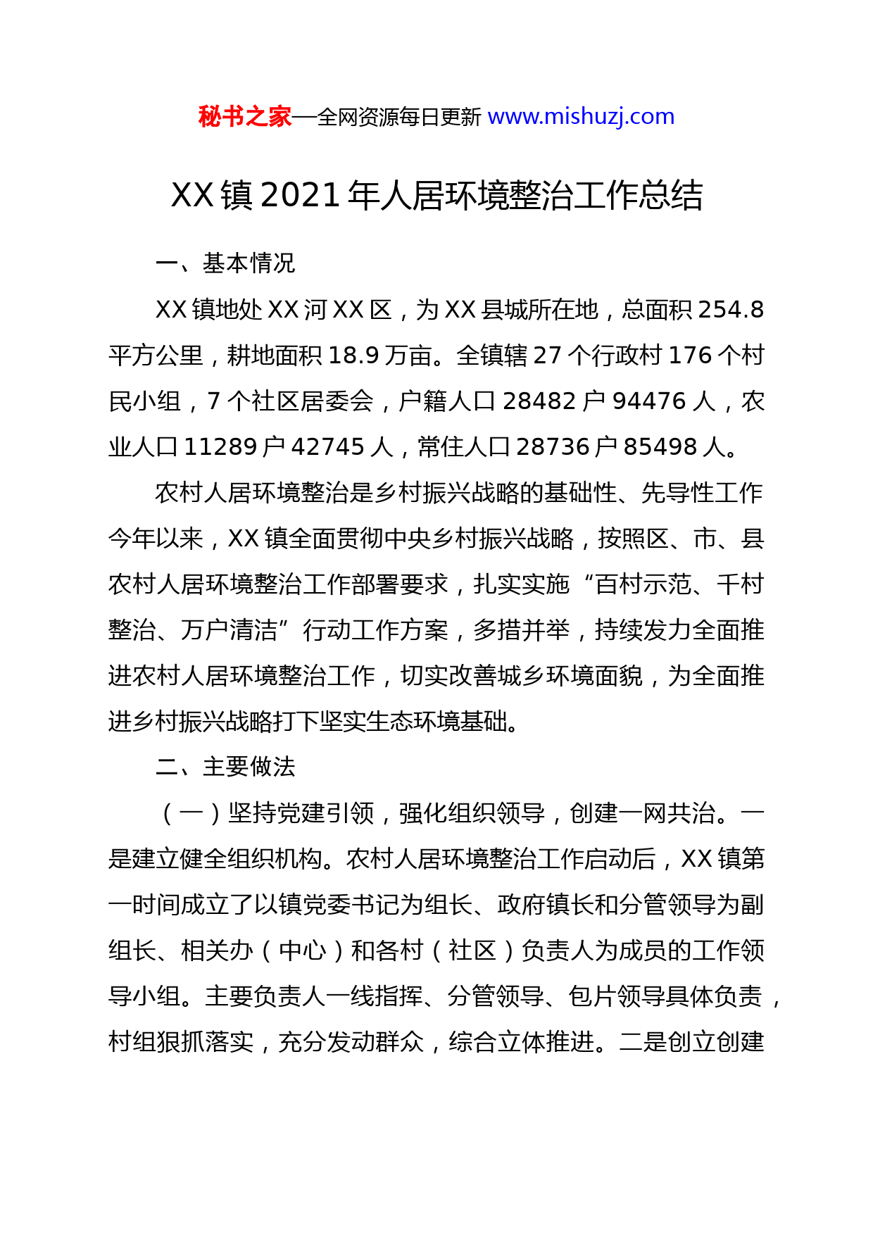 秘书之家—全网资源每日更新www.mishuzj.comXX镇2021年人居环境整治工作总结一、基本情况XX镇地处XX河XX区,为XX县城所在地,总面积254.8平方公里,耕地面积18.9万亩。全镇辖27个行政村176个村民小组,7个社区居委会,户籍人口28482户94476人,农业人口11289户42745人,常住人口28736户85498人。农村人居环境整治是乡村振兴战略的基础性、先导性工作今年以来,XX镇全面贯彻中央乡村振兴战略,按照区、市、县农村人居环境整治工作部署要求,扎实实施“百村示范、千村整治、万户清洁”行动工作方案,多措并举,持续发力全面推进农村人居环境整治工作,切实改善城乡环境面貌,为全面推进乡村振兴战略打下坚实生态环境基础。二、主要做法(一)坚持党建引领,强化组织领导,创建一网共治。一是建立健全组织机构。农村人居环境整治工作启动后,XX镇第一时间成立了以镇党委书记为组长、政府镇长和分管领导为副组长、相关办(中心)和各村(社区)负责人为成员的工作领导小组。主要负责人一线指挥、分管领导、包片领导具体负责,村组狠抓落实,充分发动群众,综合立体推进。二是创立创建秘书之家—全网资源每日更新www.mishuzj.com管理机制。制定“网格化”作战图,创建“支部+网格长+网格员+农户”的环境整治网格化管理机制,划区域、分任务、明责任、严管理,重点围绕“道路沿线、田间地头、河塘沟渠、房前屋后、庭院内外”开展整治,扣紧责任链,压实任务单,形成上下联动、分片管理、齐抓共管的网格化治理新模式,不断推动农村人居环境整治工作纵深发展。(二)坚持群众主体,加强宣传引导,营造浓厚氛围。始终将群众利益摆在首位,把宣传引导摆在突出位置,最大化激发广大群众内生动力。一是织密环境整治网格化体系。实行镇、村、组三级网格化管理,将任务网格落实到人,进一步压紧压实工作责任。一方面组织镇村组三级干部和公益性岗位、保洁员等队伍对辖区内“7纵6横”主干道和村组道以及公告场所区域开展常态化保洁工作。另一方面教育引导广大群众积极做好房前屋后“三堆”和院内院外卫生整治工作,切实落实一网共治体系。二是多渠道宣传动员群众参与。为进一步吸引广大群众能够积极参与到环境整治行动中来,各村(社区)通过党员大会、村民代表会议、新时代农民讲习所等深入开展宣传宣讲,先后印发倡议书25000多份,制作横幅标语300余条,充分利用宣传车、广播、微信群、公众号等宣传途经,多渠道、全方位曝光不良行为、展示整治效果、宣传工作动态,进一步凝聚秘书之家—全网资源每日更新www.mishuzj.com人心、达成共识,形成共同参与、群整群治的良好氛围。(三)坚持因村施策,统筹项目资金,做到有的放矢。一是强化措施,整体推进。围绕“拆、清、整、绿、建、亮、管”七项举措,重点围绕河道治理、荒沟荒坡治理、村组主干道路整修、群众庄前屋后整治、“三堆”治理、建筑生活垃圾清运等方面开展专项整治。二是因村施策、科学规划。制定了符合各村村情实际的建设方案,特别针对高同等9个示范村,精心设计,科学布局,做到有的放矢、有序推进,确保整治出实招、见实效。三是统筹资金,狠抓落实。积极争取闽宁资金350万元,实施2021年闽宁协作助力龙王坝乡村振兴项目和前咀闽宁乡村振兴示范村建设;结合“百万移民致富提升行动”,争取项目资金380万元,全面实施兴德村人居环境综合整治项目。分别利用中央和自治区两次纳入整合试点资金840万元和180万元对移民安置点基础设施进行改造提升以及有效改善农村人居环境整治“脏乱差”现象;落实示范村项目资金900万元;统筹利用示范村巷道硬化资金、美化亮化资金近2000万元对村组道进行了全面硬化。全镇村容村貌得到全面改善提升。(四)坚持自查评比,强化督查问效,确保推进有力。一是做实评比,做细考核。农村人居环境整治工作开展以秘书之家—全网资源每日更新www.mishuzj.com来,XX镇坚持把互观互学评比机制、奖惩机制、平时考核机制贯穿始终,制定出台了《XX镇人居环境整治评比实施方案》和《XX镇人居环境整治考核办法》。每季度开展“互学互促互评”环境卫生专项督查评比活动,先后授予高同等4个村和社区人居环境整治流动红旗,并给予相关资金倾斜和奖励,对大坪等3个村和社区给予黄牌警告,根据考核办法,对先进村和后进村相关责任人进行约谈,考核结构与相关各级干部评先选优直接挂钩,以严管重罚倒逼责任落实,形成长期性常抓常管常严体系。二是强化督查,抓实整改。坚持深督细导、严督实导,成立由镇纪委书记任组长的人居环境整治专项督查组定期不定期对各村(社区)环境整治工作进行常态化督导检查,坚持问题导向,现场交办问题,下发整改通知书,明确责任人,限期整改到位,确保广大镇村(社区)干部在人居环境整治工作推进中担当重实干、展现新作为。三、取得的成效今年以来,镇党委、政府认真贯彻落实县委县政府决策部署,精心谋划,突出重点,抓住全面,因村施策,因地制宜,整治成效突出,效果明显:一是“拆”项全面清零。拆除遗留土坯房、残垣断壁620余处;累计拆除违法违规建筑48处,私搭乱建72处,对新出秘书之家—全网资源每日更新www.mishuzj.com现的乱搭乱建等违法行为,发现一起拆除一起。二是“清”项效果明显。出动大小垃圾清运机械14000余台(次),清运