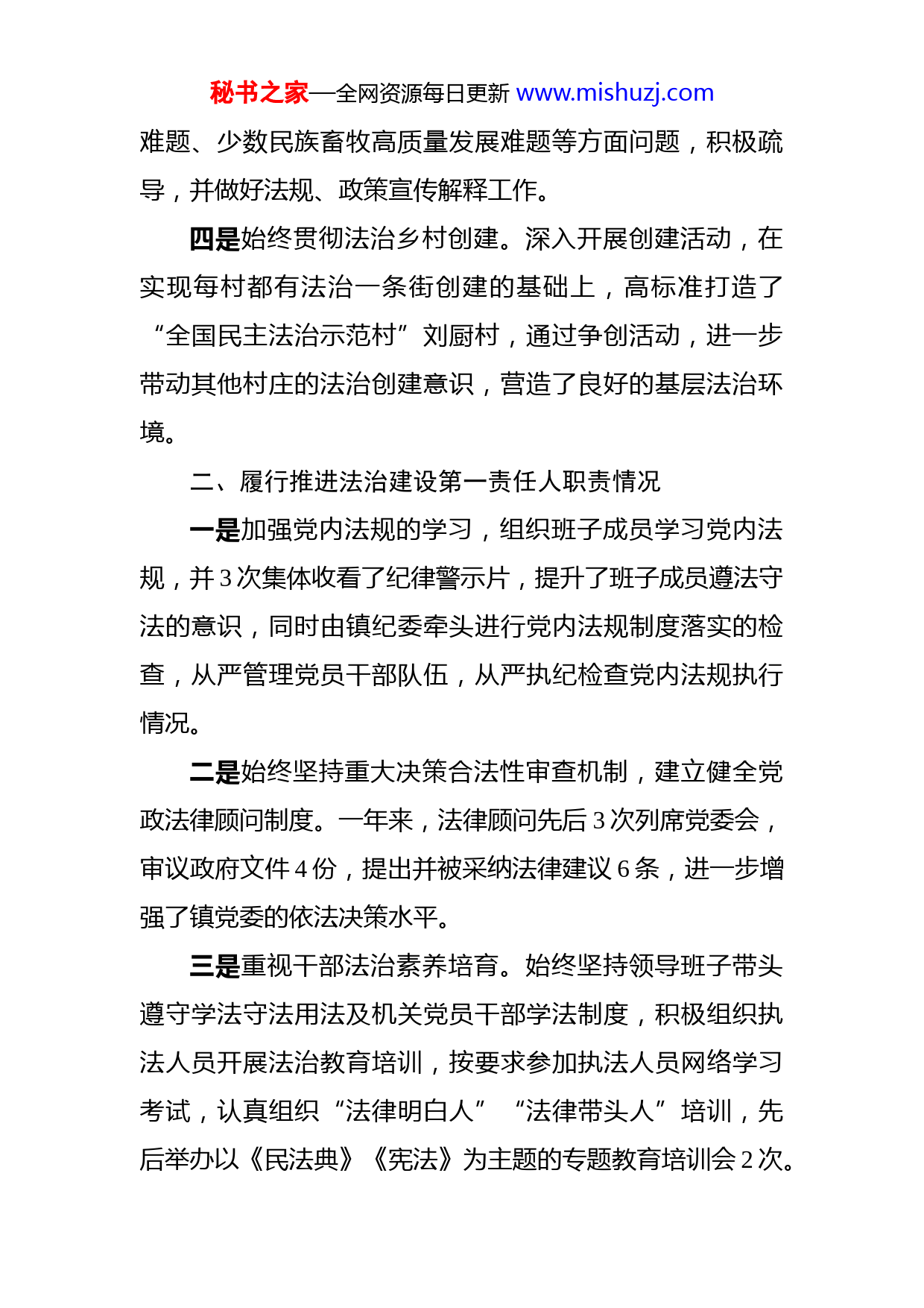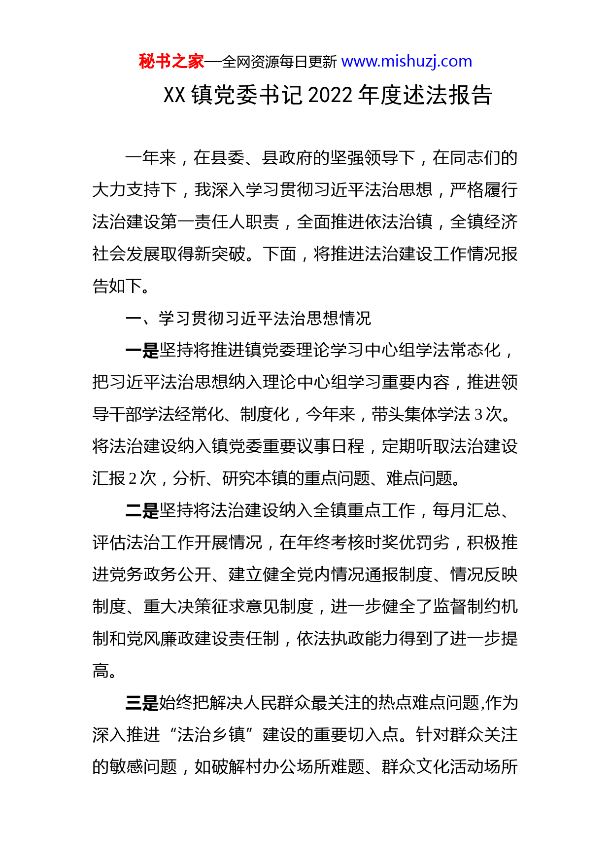 秘书之家—全网资源每日更新www.mishuzj.comXX镇党委书记2022年度述法报告一年来,在县委、县政府的坚强领导下,在同志们的大力支持下,我深入学习贯彻习近平法治思想,严格履行法治建设第一责任人职责,全面推进依法治镇,全镇经济社会发展取得新突破。下面,将推进法治建设工作情况报告如下。一、学习贯彻习近平法治思想情况一是坚持将推进镇党委理论学习中心组学法常态化,把习近平法治思想纳入理论中心组学习重要内容,推进领导干部学法经常化、制度化,今年来,带头集体学法3次。将法治建设纳入镇党委重要议事日程,定期听取法治建设汇报2次,分析、研究本镇的重点问题、难点问题。二是坚持将法治建设纳入全镇重点工作,每月汇总、评估法治工作开展情况,在年终考核时奖优罚劣,积极推进党务政务公开、建立健全党内情况通报制度、情况反映制度、重大决策征求意见制度,进一步健全了监督制约机制和党风廉政建设责任制,依法执政能力得到了进一步提高。三是始终把解决人民群众最关注的热点难点问题,作为深入推进“法治乡镇”建设的重要切入点。针对群众关注的敏感问题,如破解村办公场所难题、群众文化活动场所秘书之家—全网资源每日更新www.mishuzj.com难题、少数民族畜牧高质量发展难题等方面问题,积极疏导,并做好法规、政策宣传解释工作。四是始终贯彻法治乡村创建。深入开展创建活动,在实现每村都有法治一条街创建的基础上,高标准打造了“全国民主法治示范村”刘厨村,通过争创活动,进一步带动其他村庄的法治创建意识,营造了良好的基层法治环境。二、履行推进法治建设第一责任人职责情况一是加强党内法规的学习,组织班子成员学习党内法规,并3次集体收看了纪律警示片,提升了班子成员遵法守法的意识,同时由镇纪委牵头进行党内法规制度落实的检查,从严管理党员干部队伍,从严执纪检查党内法规执行情况。二是始终坚持重大决策合法性审查机制,建立健全党政法律顾问制度。一年来,法律顾问先后3次列席党委会,审议政府文件4份,提出并被采纳法律建议6条,进一步增强了镇党委的依法决策水平。三是重视干部法治素养培育。始终坚持领导班子带头遵守学法守法用法及机关党员干部学法制度,积极组织执法人员开展法治教育培训,按要求参加执法人员网络学习考试,认真组织“法律明白人”“法律带头人”培训,先后举办以《民法典》《宪法》为主题的专题教育培训会2次。秘书之家—全网资源每日更新www.mishuzj.com四是始终坚持广泛宣传法治。始终坚持重要节点宣传。依托“12.4”国家宪法日、“4.15”全民国家安全教育日、“6·26”国际禁毒日等积极开展法治宣传活动。将全镇党员干部做为法治宣传教育工作的重点对象,继续坚持机关干部学法用法制度、行政执法人员法律知识培训制度等,不断创新学法形式,增强学法用法的效果。2022年组织全镇干部法宣云在线学法考试,考试成绩合格率100%。五是始终坚持“法律六进”活动。一年来,累计开展法律进乡村、进社区、进单位、进企业、进学校、进机关宣传教育活动26次,充分发挥兼职法治副校长、青少年法治教育基地的作用,形成全社会共同关心、支持、参与青少年法治教育的工作格局。将法治教育纳入教学计划,积极开展青少年维权和法治宣传教育工作。三、存在的问题一是对法治理论学习不够重视,个别干部重业务、轻学习的思想依然存在,部分基层干部对法律法规领会不深对法律法规学习不细,理论联系实际的深度和广度也不够。二是运用法治手段处理矛盾纠纷的制度机制还有待完善,遇事找法、办事依法的法治社会环境还没有构建,个别群众还存在信访不信法的行为。三是宣传方式不够丰富。宣传方式主要以法律条文的宣讲、制作法治宣传栏、发放普法资料为主,群众参与度秘书之家—全网资源每日更新www.mishuzj.com较低,普法效果不佳。四、下步打算一是抓实干部普法培训,通过形式多样的宣传提高干部的执法素质、为民服务素质;二是切实加强法治宣传氛围的营造,在重要交通路段、公共场所、人员聚集地设置永久性法治宣传标识,增强法律元素,努力营造浓厚的法治宣传氛围,着力构建办事依法、遇事找法、解决问题用法、化解矛盾靠法的良好氛围;三是继续贯彻集体学法制度,努力提高领导干部运用法治思维和法律手段推进发展维护稳定的能力;四是抓实“谁执法谁普法”责任制,有针对性、经常性、多渠道的全方面加强对群众的普法宣传教育,提高群众法治意识和法律素养,营造自觉遵守与执行法律的良好氛围。五是加强人民调解、行政调解、司法调解的资源统筹、力量统筹、效果统筹,促使双方通过沟通、对话的方式化解矛盾,努力做到“定纷止争,案结事了”,为平安法治阳信建设贡献力量。秘书之家—全网资源每日更新www.mishuzj.comXX镇党委书记2022年度述法报告2022年,在县委、县政府的坚强领导下,在同志们的关心、帮助、支持下,我深入学习贯彻习近平法治思想,严格履行法治建设第一责任人职责,强化领导班子及成员法治意识,提升依法依规办事能力,大力推进法治政府建设。下面,将推进法治建设工作情况报告如下。一、学习贯彻习近平法治思想情况习近平总书记在党的二十大报告中指出:“全面依法治国是国家治理的一场深刻革命,关