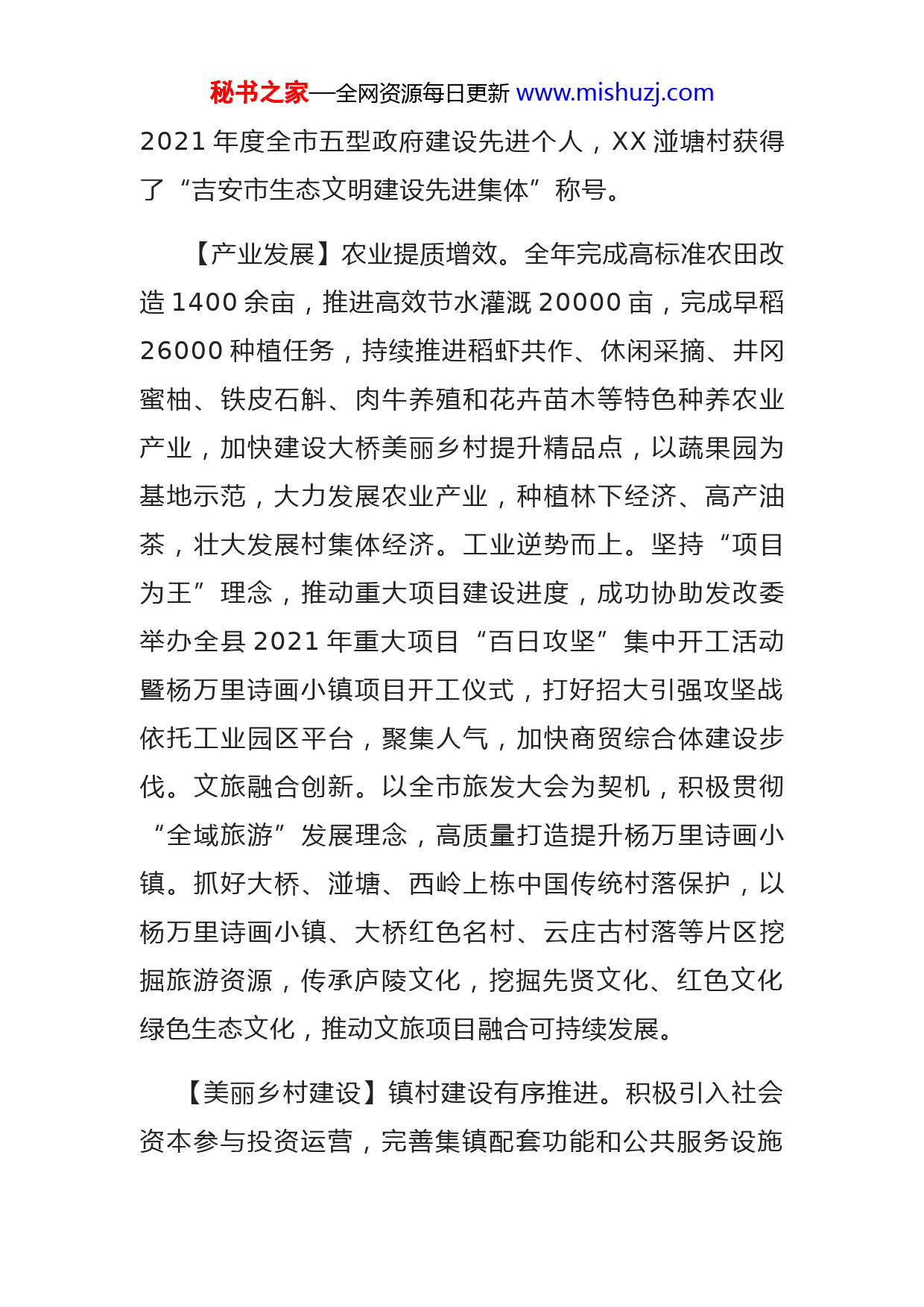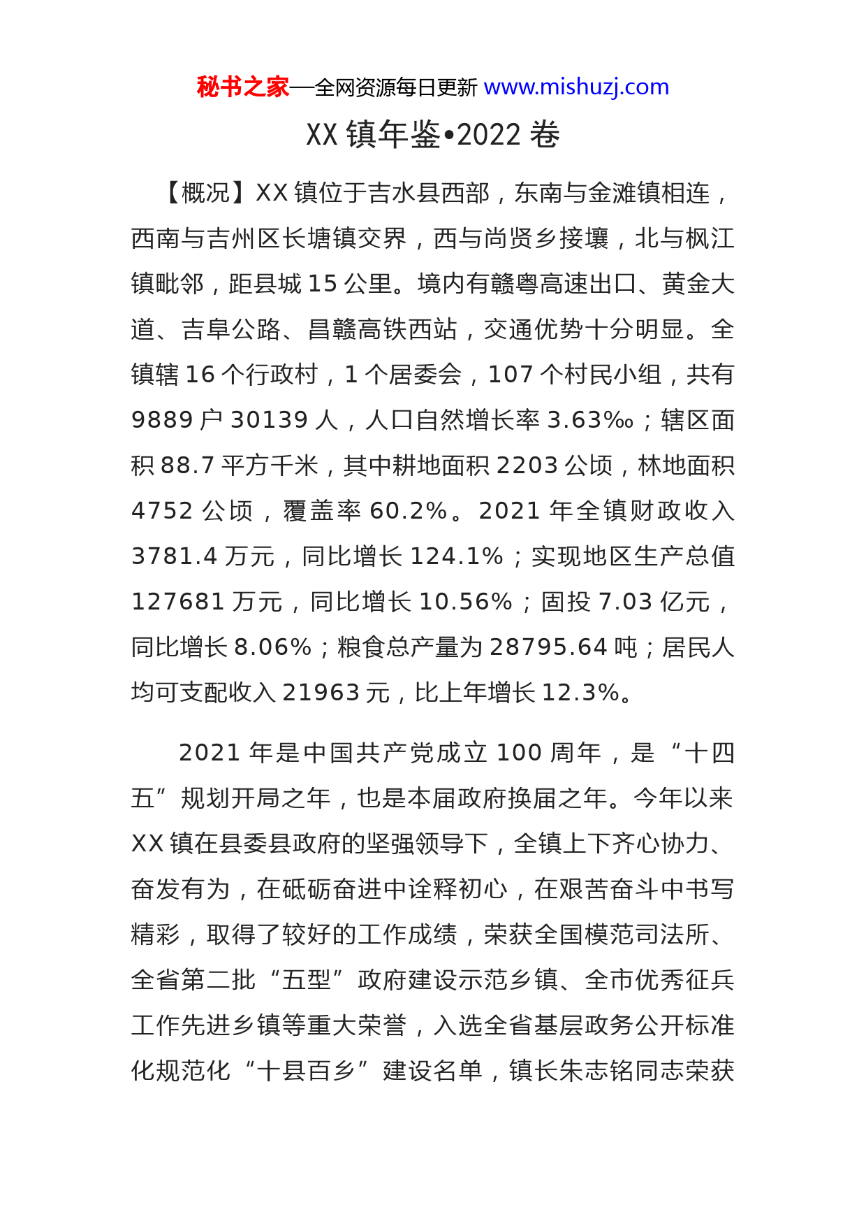 秘书之家—全网资源每日更新www.mishuzj.comXX镇年鉴•2022卷【概况】XX镇位于吉水县西部,东南与金滩镇相连,西南与吉州区长塘镇交界,西与尚贤乡接壤,北与枫江镇毗邻,距县城15公里。境内有赣粤高速出口、黄金大道、吉阜公路、昌赣高铁西站,交通优势十分明显。全镇辖16个行政村,1个居委会,107个村民小组,共有9889户30139人,人口自然增长率3.63‰;辖区面积88.7平方千米,其中耕地面积2203公顷,林地面积4752公顷,覆盖率60.2%。2021年全镇财政收入3781.4万元,同比增长124.1%;实现地区生产总值127681万元,同比增长10.56%;固投7.03亿元,同比增长8.06%;粮食总产量为28795.64吨;居民人均可支配收入21963元,比上年增长12.3%。2021年是中国共产党成立100周年,是“十四五”规划开局之年,也是本届政府换届之年。今年以来XX镇在县委县政府的坚强领导下,全镇上下齐心协力、奋发有为,在砥砺奋进中诠释初心,在艰苦奋斗中书写精彩,取得了较好的工作成绩,荣获全国模范司法所、全省第二批“五型”政府建设示范乡镇、全市优秀征兵工作先进乡镇等重大荣誉,入选全省基层政务公开标准化规范化“十县百乡”建设名单,镇长朱志铭同志荣获秘书之家—全网资源每日更新www.mishuzj.com2021年度全市五型政府建设先进个人,XX湴塘村获得了“吉安市生态文明建设先进集体”称号。【产业发展】农业提质增效。全年完成高标准农田改造1400余亩,推进高效节水灌溉20000亩,完成早稻26000种植任务,持续推进稻虾共作、休闲采摘、井冈蜜柚、铁皮石斛、肉牛养殖和花卉苗木等特色种养农业产业,加快建设大桥美丽乡村提升精品点,以蔬果园为基地示范,大力发展农业产业,种植林下经济、高产油茶,壮大发展村集体经济。工业逆势而上。坚持“项目为王”理念,推动重大项目建设进度,成功协助发改委举办全县2021年重大项目“百日攻坚”集中开工活动暨杨万里诗画小镇项目开工仪式,打好招大引强攻坚战依托工业园区平台,聚集人气,加快商贸综合体建设步伐。文旅融合创新。以全市旅发大会为契机,积极贯彻“全域旅游”发展理念,高质量打造提升杨万里诗画小镇。抓好大桥、湴塘、西岭上栋中国传统村落保护,以杨万里诗画小镇、大桥红色名村、云庄古村落等片区挖掘旅游资源,传承庐陵文化,挖掘先贤文化、红色文化绿色生态文化,推动文旅项目融合可持续发展。【美丽乡村建设】镇村建设有序推进。积极引入社会资本参与投资运营,完善集镇配套功能和公共服务设施秘书之家—全网资源每日更新www.mishuzj.com推动小城镇建设,万里佳苑商贸综合体项目已完成主体建筑正引入业态;神圩新居整村搬迁项目进展明显,已有70多栋房屋完成了主体建设。8个美丽乡村提升改造点高标准高质量完成。镇村管理全面加强。切实推动改厕、改环境走深走实,全年实现改造公厕20余座,完成美丽乡村提升点问题户厕整改300余户。全力以赴打好城乡环境整治百日攻坚行动,推动“六清六净”实现农村人居环境常态化。拆除违章建筑围墙5000余平方,清理整顿“散、乱、污”企业16家,整治畜禽污染养殖场2家,引导各村畜禽集中圈养,镇村颜值有所提升。镇村生态更加稳固。深入实施大气污染治理,秸秆全面禁烧,空气质量持续优化。大力开展水生态治理,全面落实“河长制”“湖长制”,加强巡河护河,大小水库水质稳定达标。压实林长制工作职责,全年完成松材线虫病疫木处置1790亩。全力抓好植树造林和封山育林,完成造林绿化929亩,森林抚育1700亩。【民生福祉】民生实事全面完成。结合“我为群众办实事”实践活动,全年收集“大调研、广纳谏”意见建议54件已解决,发放学习类书籍750余套,镇村两级29件民生实事均已圆满完成。脱贫攻坚成果巩固。坚持“四个不摘”工作机制,和“领导联系、驻村干部包村秘书之家—全网资源每日更新www.mishuzj.com村两委干部包户”定点帮扶政策,创新运用“大数据网格化”治理模式,2021年全镇共15个衔接推进乡村振兴资金项目完成验收,项目资金196万元已全部拨付到位。社会保障持续增强。全年累计发放低保、五保、耕地力保护、稻谷、农机补贴等各类补助资金1297万元;实现新型农村合作医疗和城乡居民社会养老保险参缴率均达到97%以上,新建成农村“党建互助养老之家”2个。公共事业全面进步。“四好”农村路建设成效明显农村公共服务体系不断完善,深入推进移风易俗,稳步推进绿色殡葬改革工作,农村生态公益性墓地建设有序推进,全力协调支持学校、卫生院等双管单位开展工作。【平安治理】疫情防控常抓不懈。坚决贯彻省、市、县决策部署,严格按照“外防输入,内防反弹”总原则落实各项常态化精准化疫情防控措施,全年累计摸排外来人员1700余人,有序组织全镇人民接种18000余人。同时坚持不断压实“五方责任”,坚持“人物同防”、“闭环”管理,常态化抓好疫情防控和企业复工复产,筑牢群防群控、联防联治“防疫墙”。安全管理全面加强。高标准推进安全生产专项整治三年行动,重要节点组织人员对全镇九小场所进行安全生产大排查,常态化实施食品药品、消防、燃气安全、既有房屋隐患排查整秘书之家—全网资源每日更新www.mishuzj.com治,逐条逐项整改到位。加大森林防火巡察力度,按照“打防一体”“打防并重”的原则,全镇安全形势持续向好。社会治理持续创新