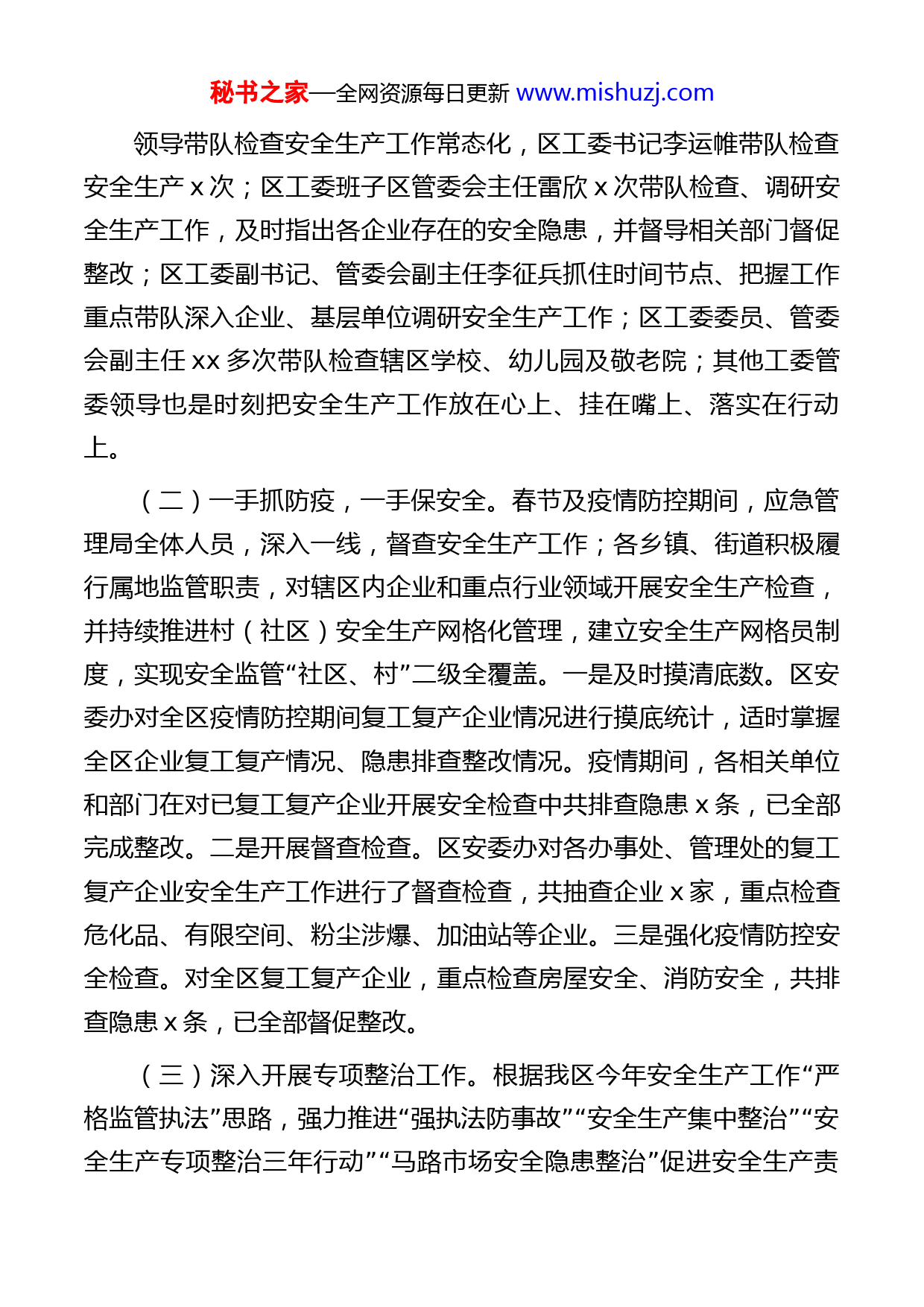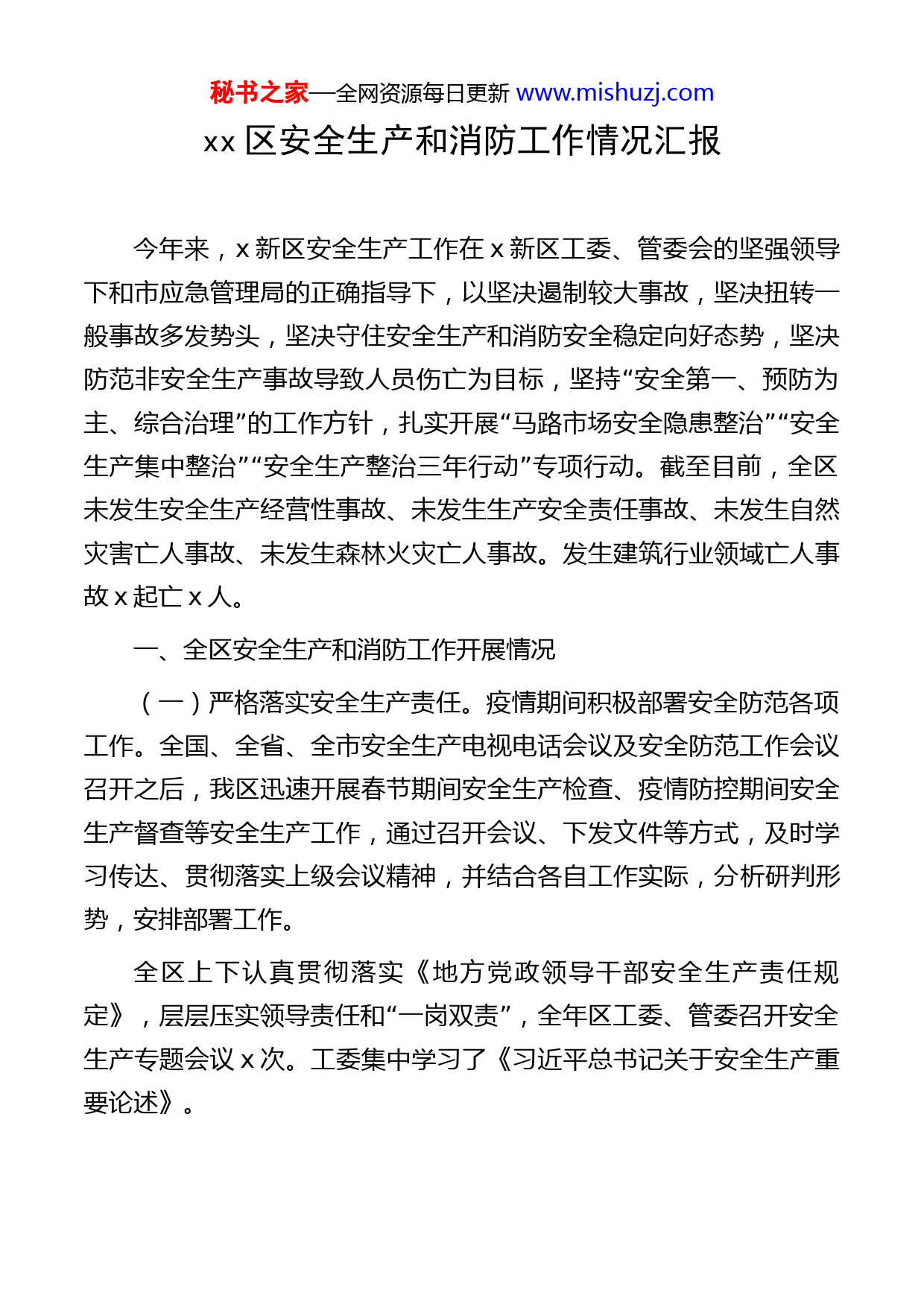 秘书之家—全网资源每日更新www.mishuzj.comxx区安全生产和消防工作情况汇报今年来,x新区安全生产工作在x新区工委、管委会的坚强领导下和市应急管理局的正确指导下,以坚决遏制较大事故,坚决扭转一般事故多发势头,坚决守住安全生产和消防安全稳定向好态势,坚决“防范非安全生产事故导致人员伤亡为目标,坚持安全第一、预防为”“”“主、综合治理的工作方针,扎实开展马路市场安全隐患整治安全”“”生产集中整治安全生产整治三年行动专项行动。截至目前,全区未发生安全生产经营性事故、未发生生产安全责任事故、未发生自然灾害亡人事故、未发生森林火灾亡人事故。发生建筑行业领域亡人事故x起亡x人。一、全区安全生产和消防工作开展情况(一)严格落实安全生产责任。疫情期间积极部署安全防范各项工作。全国、全省、全市安全生产电视电话会议及安全防范工作会议召开之后,我区迅速开展春节期间安全生产检查、疫情防控期间安全生产督查等安全生产工作,通过召开会议、下发文件等方式,及时学习传达、贯彻落实上级会议精神,并结合各自工作实际,分析研判形势,安排部署工作。全区上下认真贯彻落实《地方党政领导干部安全生产责任规“”定》,层层压实领导责任和一岗双责,全年区工委、管委召开安全生产专题会议x次。工委集中学习了《习近平总书记关于安全生产重要论述》。秘书之家—全网资源每日更新www.mishuzj.com领导带队检查安全生产工作常态化,区工委书记李运帷带队检查安全生产x次;区工委班子区管委会主任雷欣x次带队检查、调研安全生产工作,及时指出各企业存在的安全隐患,并督导相关部门督促整改;区工委副书记、管委会副主任李征兵抓住时间节点、把握工作重点带队深入企业、基层单位调研安全生产工作;区工委委员、管委会副主任xx多次带队检查辖区学校、幼儿园及敬老院;其他工委管委领导也是时刻把安全生产工作放在心上、挂在嘴上、落实在行动上。(二)一手抓防疫,一手保安全。春节及疫情防控期间,应急管理局全体人员,深入一线,督查安全生产工作;各乡镇、街道积极履行属地监管职责,对辖区内企业和重点行业领域开展安全生产检查,并持续推进村(社区)安全生产网格化管理,建立安全生产网格员制“”度,实现安全监管社区、村二级全覆盖。一是及时摸清底数。区安委办对全区疫情防控期间复工复产企业情况进行摸底统计,适时掌握全区企业复工复产情况、隐患排查整改情况。疫情期间,各相关单位和部门在对已复工复产企业开展安全检查中共排查隐患x条,已全部完成整改。二是开展督查检查。区安委办对各办事处、管理处的复工复产企业安全生产工作进行了督查检查,共抽查企业x家,重点检查危化品、有限空间、粉尘涉爆、加油站等企业。三是强化疫情防控安全检查。对全区复工复产企业,重点检查房屋安全、消防安全,共排查隐患x条,已全部督促整改。“(三)深入开展专项整治工作。根据我区今年安全生产工作严”“”“”“格监管执法思路,强力推进强执法防事故安全生产集中整治安”“”全生产专项整治三年行动马路市场安全隐患整治促进安全生产责秘书之家—全网资源每日更新www.mishuzj.com任落实。一是全面部署。根据全区安全生产的实际和特点,实行了全面检查与严格执法相结合、企业自查与部门检查相结合、属地负责与行业监管相结合,集中开展各项整治工作。二是严格检查。此次专项整治,按照工作力度不减、标准不变、尺度不松要求,认真开展重点行业领域检查。专项整治期间,组织执法检查x次,检查排查隐患x条,整改完毕x条,下达执法文书x份,简易执法x起,处罚金额x千元,警告x起,取得了一定的成效。三是狠抓整改。对各办事处、管理处的专项整治开展情况进行了督查检查。督查采取现场检查、随机抽查的形式,深入查找安全隐患和问题。对督查中发现的隐患和问题,现场提出整改要求,并要求及时反馈整改情况。(四)强管控,扎实整治火险隐患。深入开展逐村摸底排查,记录相关问题,并根据各社区的实际情况进行有针对性的宣传和工作安“排。一是加强宣传教育,增强防火意识。结合森林防灭火特护”“”期清明节全区共采用宣传车巡回宣传x次,刷新永久防火牌x块,张贴宣传标语x余条,发放森林防火宣传教育入户告知书、禁火令x余份。力争让森林防火工作家喻户晓、老幼皆知。二是制订奖惩制度。区森林防灭火指挥部设立了举报电话x,对在林区用火发生森林火灾或火险的人员甚至故意纵火者,一经举报到森林防火指挥部,指挥部将对举报人给予x-x元的奖励,并对举报人的身份进行保密。三是创新工作方法。针对春节、清明节上坟祭祀人员多且多携带烟花鞭炮的情况,清明节投入近x万元采购株鲜花进行烟花鞭炮置换。四是组建了一支流动宣传队伍。由护林员组成,在重要节假日采取摩托车骑行流动宣传加巡逻模式,在重点时节重点部位采取全天候巡逻加宣传。秘书之家—全网资源每日更新www.mishuzj.com(五)深入一线救助,保群众安全。2021年我区先后遭受二次不同程度的自然灾害,分别为x日、x日洪涝灾害。截止x月x日,全区共有受灾人员x人,农作物受灾面积x公顷,成灾面积x公顷,致使农业、基础设施、公益设施、家庭财产损失达x万元。灾情发生后,区委区管委领导