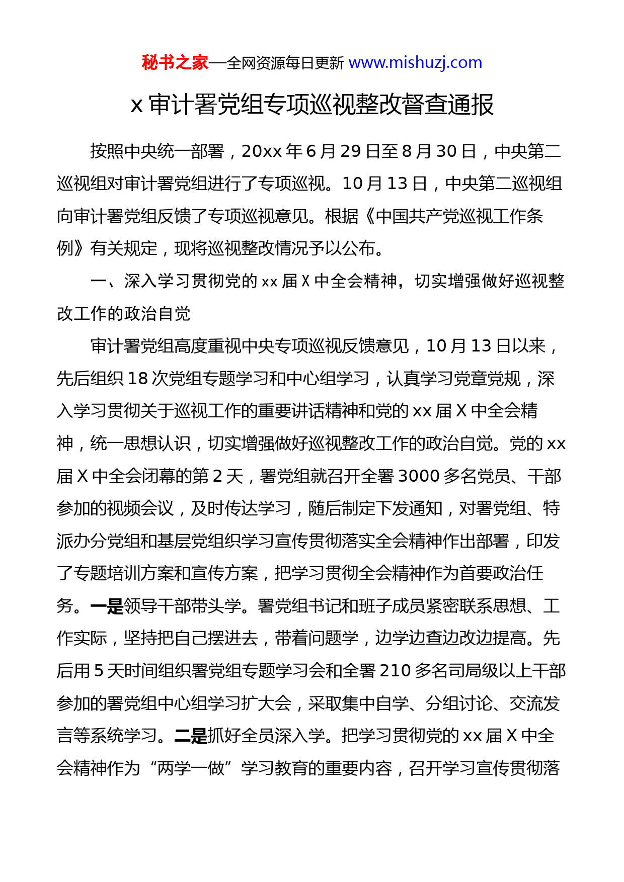 秘书之家—全网资源每日更新www.mishuzj.comx审计署党组专项巡视整改督查通报按照中央统一部署,20xx年6月29日至8月30日,中央第二巡视组对审计署党组进行了专项巡视。10月13日,中央第二巡视组向审计署党组反馈了专项巡视意见。根据《中国共产党巡视工作条例》有关规定,现将巡视整改情况予以公布。一、深入学习贯彻党的xx届X中全会精神,切实增强做好巡视整改工作的政治自觉审计署党组高度重视中央专项巡视反馈意见,10月13日以来,先后组织18次党组专题学习和中心组学习,认真学习党章党规,深入学习贯彻关于巡视工作的重要讲话精神和党的xx届X中全会精神,统一思想认识,切实增强做好巡视整改工作的政治自觉。党的xx届X中全会闭幕的第2天,署党组就召开全署3000多名党员、干部参加的视频会议,及时传达学习,随后制定下发通知,对署党组、特派办分党组和基层党组织学习宣传贯彻落实全会精神作出部署,印发了专题培训方案和宣传方案,把学习贯彻全会精神作为首要政治任务。一是领导干部带头学。署党组书记和班子成员紧密联系思想、工作实际,坚持把自己摆进去,带着问题学,边学边查边改边提高。先后用5天时间组织署党组专题学习会和全署210多名司局级以上干部参加的署党组中心组学习扩大会,采取集中自学、分组讨论、交流发言等系统学习。二是抓好全员深入学。把学习贯彻党的xx届X中全会精神作为“两学一做”学习教育的重要内容,召开学习宣传贯彻落秘书之家—全网资源每日更新www.mishuzj.com实X中全会精神视频会议,全国审计机关6.4万人参加;以署党组成员和司处级干部为重点,在全署党员干部中连续开展了12次专题学习,每个专题在全署3000多名党员干部中以视频方式集中交流半天,由1名署党组成员、2名单位主要负责人、1名党员代表作专题发言;在中共审计署党校分3期对全署近1600名处级以上干部进行了集中培训,每期1周,每期培训班都由署党组成员带队领学。通过学习贯彻,审计署党组和全署党员干部深刻认识到:第一,党的xx届X中全会明确的核心地位,是全党的共同意志,是全党全军全国各族人民的共同心愿,是历史和时代的选择、全党和全国各族人民的选择、中国特色社会主义事业的选择,是党和国家根本利益所在,对维护党中央权威、维护党的团结和集中统一领导,保证党和国家兴旺发达、长治久安,具有十分重大而深远的意义;第二,全会通过的《关于新形势下党内政治生活的若干准则》(以下简称《准则》)和《中国共产党党内监督条例》(以下简称《条例》),贯彻全面从严治党的鲜明主题,坚持以党章为根本遵循,坚持继承与创新有机统一,坚持严字当头、问题导向、以上率下,提出了一系列新观点新举措,充分体现了思想建党与制度治党的有机统一,是新形势下加强和规范党内政治生活,加强党内监督的根本遵循;第三,在全会上的重要讲话,以一系列富有创见的新思想新观点新要求,升华了我们党对党的建设规律的认识,丰富和发展了马克思主义党建理论,是坚定不移推进全面从严治党的行动纲领,为我们党更好地治国理政,开创中国特色社会主义伟大事业新局面提供了科学指南。署党组和全署党员干部秘书之家—全网资源每日更新www.mishuzj.com一致表示,要坚决拥护、坚决服从、自觉维护、坚定捍卫的核心地位,更加紧密地团结在以同志为核心的党中央周围,更加坚定地维护以同志为核心的党中央权威,更加自觉地在思想上政治上行动上同以同志为核心的党中央保持高度一致,更加扎实地把党中央各项决策部署落到实处;要经常、自觉、主动向党中央看齐,向党的理论和路线方针政策看齐,向党中央决策部署看齐,做到党中央提倡的坚决响应、党中央决定的坚决执行、党中央禁止的坚决不做。二、坚持以上率下,切实担负起巡视整改主体责任对中央专项巡视指出的问题,审计署党组诚恳接受、全面整改。署党组深刻认识到,这些问题表现在各个层面,根子在署党组,在党组书记,根本原因是署党组特别是党组书记履行全面从严治党主体责任不到位,在“深”“细”“常”“长”上抓得不够。署党组书记和班子成员全面落实巡视整改主体责任,党组书记认真履行整改工作第一责任人责任,班子成员按照职责切实抓好分工范围内的整改落实工作,并以小见大、举一反三,逐级落实责任。同时,署党组书记和班子成员坚决把自己摆进去,主动认领问题、主动承担责任、带头落实整改;先后召开11次专门会议和专题民主生活会研究部署整改工作,坚持以上率下,立足自身抓整改,坚决防止把整改主体责任推给下级单位,坚决防止把层层传导压力变成层层推卸责任,做到“真认账、不推诿”,“真反思、不敷衍”,“真整改、‘不贰过’”。中央纪委驻署纪检组认真履行监督责任,积极协助署党组抓好整改工作。秘书之家—全网资源每日更新www.mishuzj.com(一)坚持抓早。10月13日中央第二巡视组反馈专项巡视意见后,署党组书记当天即组织召开党组会和各单位主要负责同志会议,传达学习关于巡视工作的重要讲话精神、中央专项巡视反馈意见和整改要求,研究整改措施,对巡视整改工作进行动员部署。随后,成立署巡视整改工作领导小组及办公室,领导小组负责巡视整改牵头抓总,由署党组书记担任组长,各位党组成员任副组长;办公室设在署机关党委,负责整改工