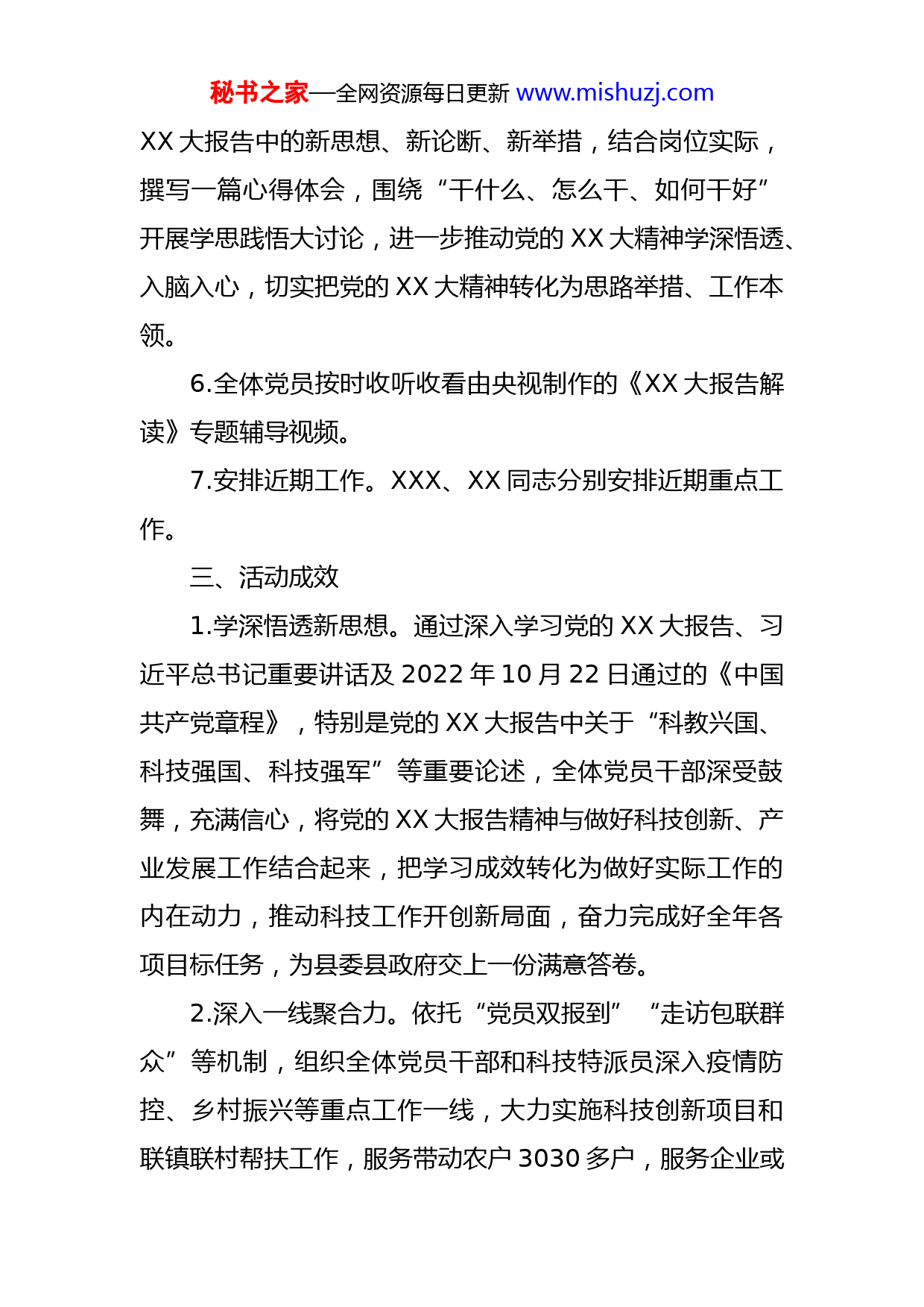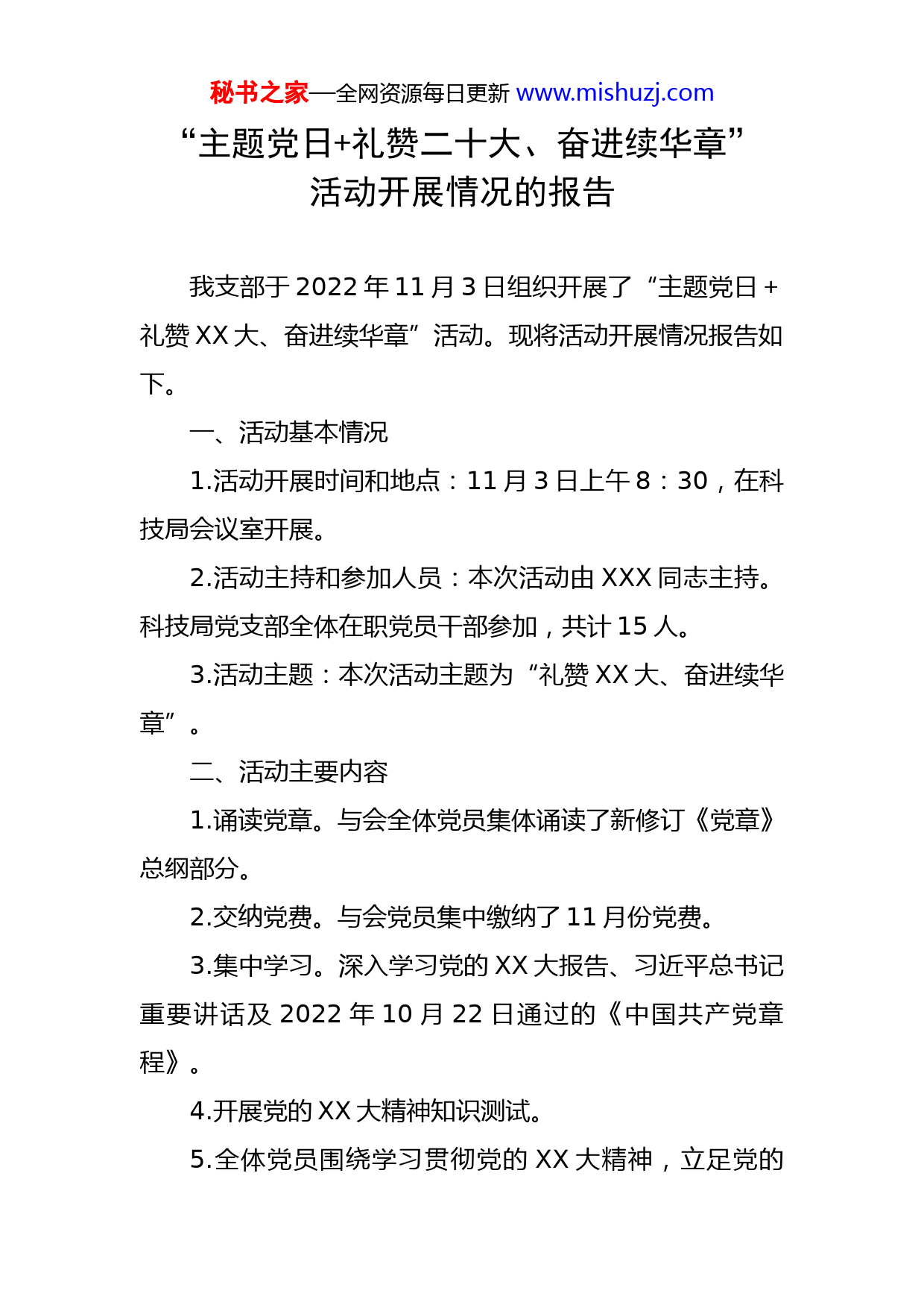 秘书之家—全网资源每日更新www.mishuzj.com“主题党日+礼赞二十大、奋进续华章”活动开展情况的报告我支部于2022年11月3日组织开展了“主题党日+礼赞XX大、奋进续华章”活动。现将活动开展情况报告如下。一、活动基本情况1.活动开展时间和地点:11月3日上午8:30,在科技局会议室开展。2.活动主持和参加人员:本次活动由XXX同志主持。科技局党支部全体在职党员干部参加,共计15人。3.活动主题:本次活动主题为“礼赞XX大、奋进续华章”。二、活动主要内容1.诵读党章。与会全体党员集体诵读了新修订《党章》总纲部分。2.交纳党费。与会党员集中缴纳了11月份党费。3.集中学习。深入学习党的XX大报告、习近平总书记重要讲话及2022年10月22日通过的《中国共产党章程》。4.开展党的XX大精神知识测试。5.全体党员围绕学习贯彻党的XX大精神,立足党的秘书之家—全网资源每日更新www.mishuzj.comXX大报告中的新思想、新论断、新举措,结合岗位实际,撰写一篇心得体会,围绕“干什么、怎么干、如何干好”开展学思践悟大讨论,进一步推动党的XX大精神学深悟透、入脑入心,切实把党的XX大精神转化为思路举措、工作本领。6.全体党员按时收听收看由央视制作的《XX大报告解读》专题辅导视频。7.安排近期工作。XXX、XX同志分别安排近期重点工作。三、活动成效1.学深悟透新思想。通过深入学习党的XX大报告、习近平总书记重要讲话及2022年10月22日通过的《中国共产党章程》,特别是党的XX大报告中关于“科教兴国、科技强国、科技强军”等重要论述,全体党员干部深受鼓舞,充满信心,将党的XX大报告精神与做好科技创新、产业发展工作结合起来,把学习成效转化为做好实际工作的内在动力,推动科技工作开创新局面,奋力完成好全年各项目标任务,为县委县政府交上一份满意答卷。2.深入一线聚合力。依托“党员双报到”“走访包联群众”等机制,组织全体党员干部和科技特派员深入疫情防控、乡村振兴等重点工作一线,大力实施科技创新项目和联镇联村帮扶工作,服务带动农户3030多户,服务企业或秘书之家—全网资源每日更新www.mishuzj.com合作社等100个,创办领办企业和合作社5个;引进新品种9个,推广新技术11项,建立示范基地16个,培养农村技术骨干190人,举办各类培训45场次1500多人次,走进田间地头、工厂车间开展宣讲,通过喜闻乐见的形式将党的XX大精神传递到基层一线,迅速掀起学习热潮,推动广大党员把智慧和力量凝聚到实现党的XX大部署的各项任务上来。3.切合实际抓落实。结合当前工作实际,我局进一步加快推进第二届国际天麻学术研讨会各项筹备工作。一是协调对接方面:对上与中国中医科学院中药研究所商定修订了《第二届国际天麻学术研讨会工作方案》、华夏天麻产业创新联盟成立《章程》组织机构,并提出第二届国际天麻学术研讨会参会专家学者、参展企业提出了初步名单;对内与筹委会成员单位进行对接,明确了六大工作组目标任务,制定了作战图、任务表。二是成展布展方面:收集整理现代中药示范园综合楼1-3层陈展资料,制定布展脚本,并邀请中国中医科学院中药研究所专家对布展脚本进行审核把关;同时邀请县委宣传部、县文联等相关单位召开现代中药产业示范园综合楼室内工程项目布展方案座谈会,对陈展内容、展陈形式进行修正,现已完成天麻数字展厅、略阳中药材展厅脚本编纂工作,平面布展深化工作同步启动,展陈植物标本175件,已完成制作,浸泡标本秘书之家—全网资源每日更新www.mishuzj.com411件预计11月15日前制作完成,根据硬装工作面情况随时进行安装布展。三是产品研发方面:已组织县内10家天麻产业企业召开产品研发工作会议,就参展产品进行了研判,截至目前9家企业研发天麻产品共26种;同时启动会议伴手礼定制工作,药食同源产品、略阳名优特产外包装设计初稿完成,另外还收集了全国天麻系列药品、产品100余种,用于大会陈展。四是会务组织方面:在会务组织方面,我局邀请“四个在汉中”全球推介会专业人士进行现场指导,协助完成了会务组织流程策划,初步制定了大会邀请函、大会标识、吉祥物、专家简介、工作证、会务指南及其他会务材料,同时对产业联盟成立、大会氛围营造、线上流量直播等具体事宜进行现场指导、座谈、策划。五是双招双引方面:制定了第二届国际天麻学术研讨会关于中药产业招商引资宣传画册,初步确定大会签约意向企业。六是会议现场方面:联合数字办对天麻大数据可视化平台进行初步联审,并就“四网一图”上线发布有关事宜进行了审定;同时科技局还对大会现场观摩点XXX、XX公司天麻工厂化立体栽培大棚进行提升。