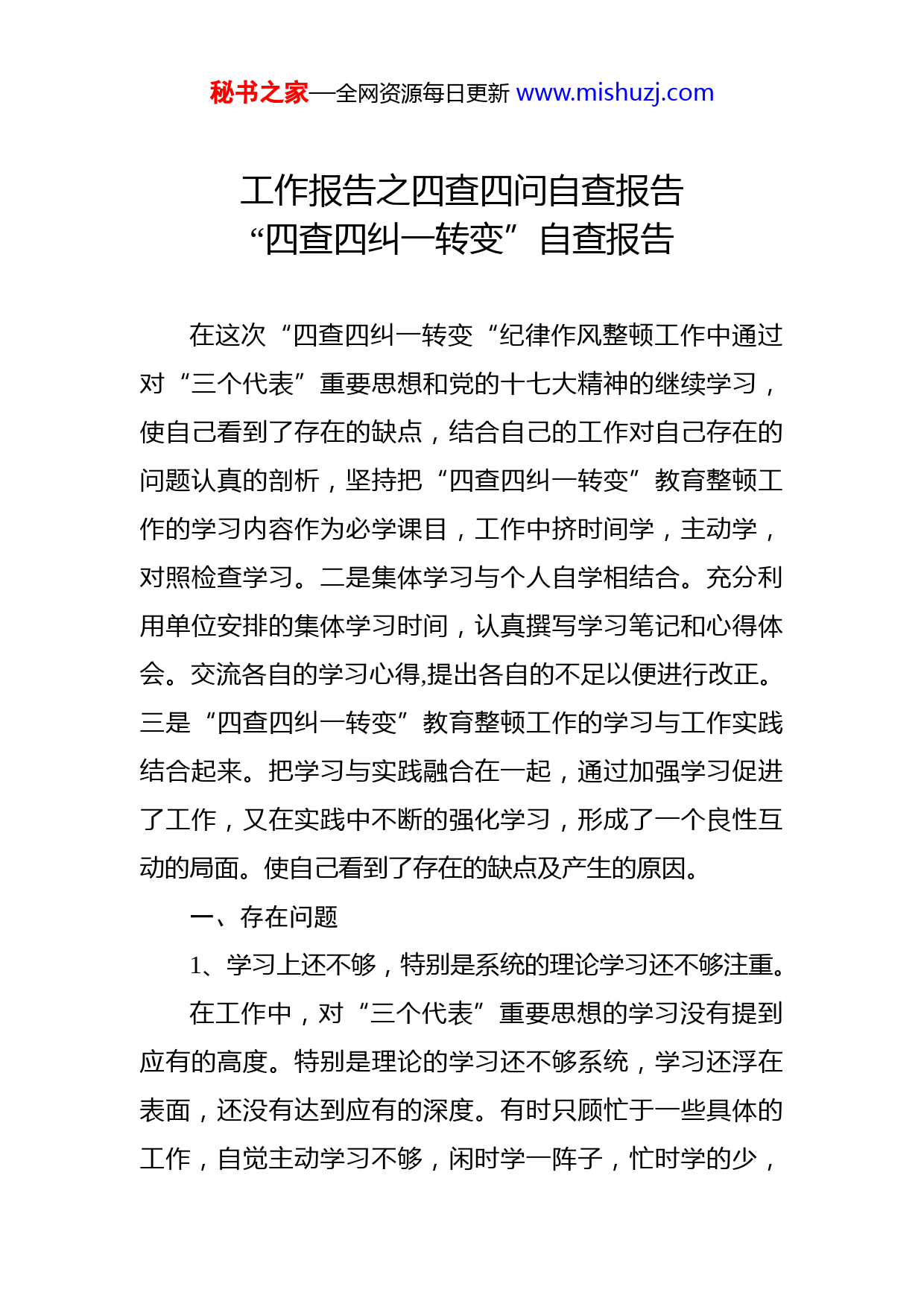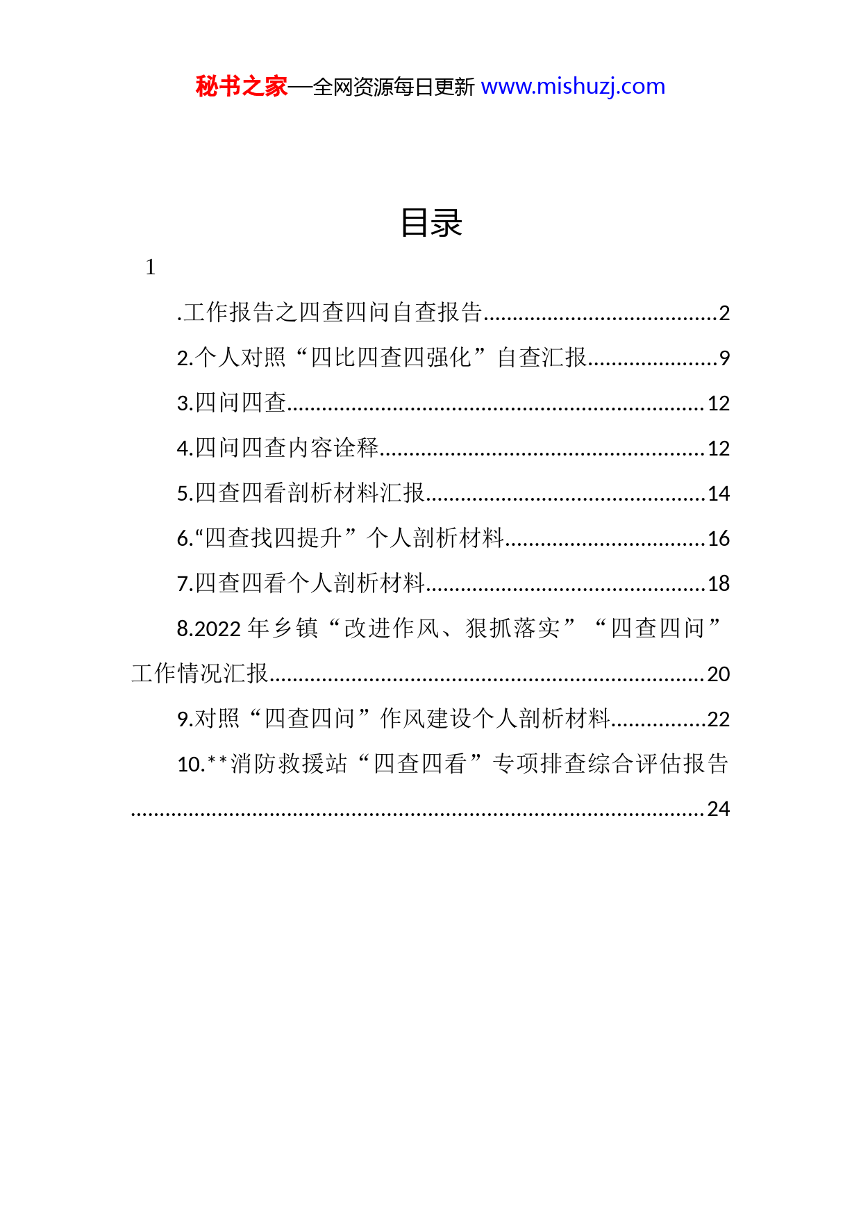秘书之家—全网资源每日更新www.mishuzj.com目录1.工作报告之四查四问自查报告........................................22.个人对照“四比四查四强化”自查汇报......................93.四问四查.......................................................................124.四问四查内容诠释.......................................................125.四查四看剖析材料汇报................................................146.“四查找四提升”个人剖析材料..................................167.四查四看个人剖析材料................................................188.2022年乡镇“改进作风、狠抓落实”“四查四问”工作情况汇报..........................................................................209.对照“四查四问”作风建设个人剖析材料................2210.消防救援站“四查四看”专项排查综合评估报告..................................................................................................24秘书之家—全网资源每日更新www.mishuzj.com工作报告之四查四问自查报告“四查四纠一转变”自查报告在这次“四查四纠一转变“纪律作风整顿工作中通过对“三个代表”重要思想和党的十七大精神的继续学习,使自己看到了存在的缺点,结合自己的工作对自己存在的问题认真的剖析,坚持把“四查四纠一转变”教育整顿工作的学习内容作为必学课目,工作中挤时间学,主动学,对照检查学习。二是集体学习与个人自学相结合。充分利用单位安排的集体学习时间,认真撰写学习笔记和心得体会。交流各自的学习心得,提出各自的不足以便进行改正。三是“四查四纠一转变”教育整顿工作的学习与工作实践结合起来。把学习与实践融合在一起,通过加强学习促进了工作,又在实践中不断的强化学习,形成了一个良性互动的局面。使自己看到了存在的缺点及产生的原因。一、存在问题1、学习上还不够,特别是系统的理论学习还不够注重。在工作中,对“三个代表”重要思想的学习没有提到应有的高度。特别是理论的学习还不够系统,学习还浮在表面,还没有达到应有的深度。有时只顾忙于一些具体的工作,自觉主动学习不够,闲时学一阵子,忙时学的少,秘书之家—全网资源每日更新www.mishuzj.com有时看报纸也是看看大标题,结果对理论上的一些问题,尤其是一些新问题理解还不够深,使理论水平不能尽快得到提高。2、工作方法有时不够恰当,不够策略,对工作方法,处事艺术的重要性认识不够。3、政治理论方面的内容看得少,结果使得知识面不够广。掌握更多知识的重要性认识不足,认为自己是从事教学工作的,只要教好学生知识就行,其他方面的知识多少知道点就可以过得去。二、整改措施、努力方向通过对“四查四纠一转变”内容的学习理解,自己提高了思想认识,明确了今后的努力方向。为总结经验,吸取教训,针对“四查四纠一转变”活动中所反映的问题,今后要努力做好以下三个方面的工作,以确保按照实施方案,做好下阶段的教育整顿工作:一是深入学习有关理论抓住机遇,实现工作的新突破解决认识问题,树立紧迫感增强自觉性。通过自查自纠,敲起警钟,明确学习的重要性和不学习的危害性。今后我要把学习马克思主义理论、毛泽东思想、邓小平理论作为必修课,做到真学、真懂、真信、真用。努力提高政治素质和业务素质,改进工作方法。理论联系实际,学以致用,在学习过程中自觉地将理论同工作实际结合起来,不断提高运用理论解决问题的能秘书之家—全网资源每日更新www.mishuzj.com力。加强自身建设,提高素质。在政治理论素养上下工夫加强对政策理论水平的提高,提高说话和写作能力;在业务,在专业知识方面加强学习,努力提高自己能力,做到理论联系实际,全面发展。二是进一步解放思想,适应工作需求。用新的思维去发现、解决工作中遇到的各种问题,因此,在今后的工作中,将以学习为载体,注意思想的解放,观念的创新,不断创新工作思路和方式方法,以适应新时期工作的需要。强化责任,提高效率。对自己的工作多用心、用脑,做好工作计划,使其有序、有时、有步骤地完成,今天的事绝不拖到明天做,树立强烈的时间观、效率观、质量观,促进教育教学工作的顺利开展和自身能力的不断提高。三是加强自身建设,严格要求,自我加压。始终保持积极向上、昂扬奋进的精神状态,自重自省、自警自励,在工作中自觉地服从、服务于大局,自觉地把自己的工作同全局联系起来,坚持高标准、严要求,围绕这次“四查四纠一转变”活动要求,努力做好本职工作,圆满完成领导交给的任务。开拓创新,提高服务水平。三、“四查”活动自查整改报告自全市公安机关开展“查思想、查执法、查纪律、查作风”活动以来,按照大队方案具体安排,我认真学习了秘书之家—全网资源每日更新www.mishuzj.com党的十六届五中全会《关于制定国民经济和社会发展第十一个五年规划的建议》、《建立健全教育、制度、监督并重的惩治和预防腐败体系实施纲要》、《公务员法》和市委领导同志在全市干部作风整顿动员大会上的重要讲话精神,针对工作中存在的突出问题,从思想上、工作上、学习上进行了自查。一、参加公安机关“四查”活动情况。自从开展公安机关“四查”活动以来,我能够按照市局、支队和分局的安排,积极参加学习,认真查找问题。在学习方面,无论是单位组织的全体民警学习会,