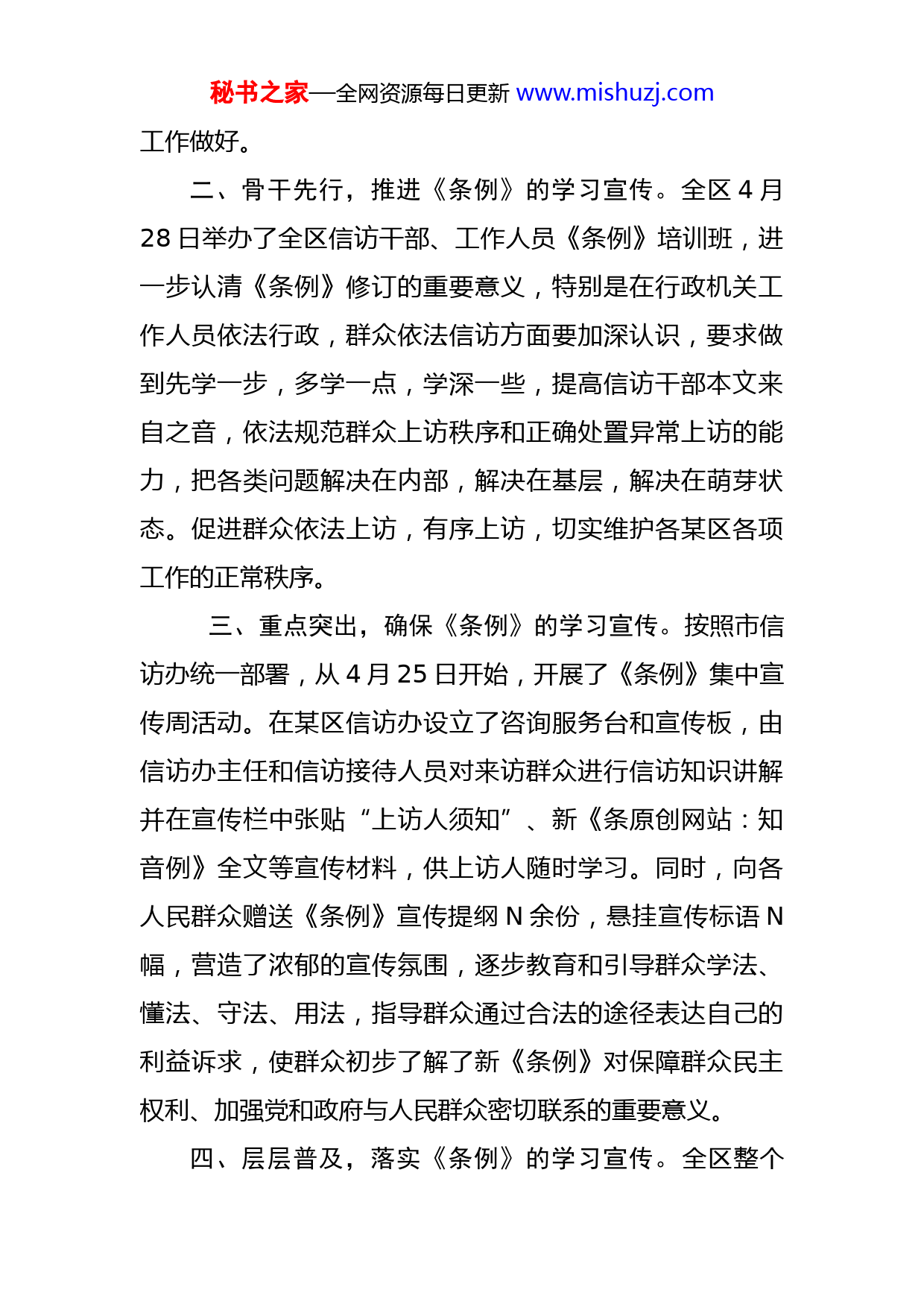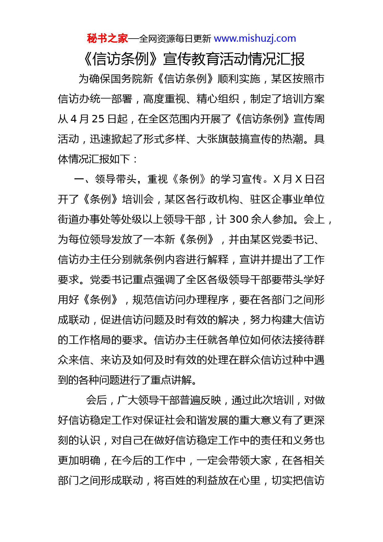 秘书之家—全网资源每日更新www.mishuzj.com《信访条例》宣传教育活动情况汇报为确保国务院新《信访条例》顺利实施,某区按照市信访办统一部署,高度重视、精心组织,制定了培训方案从4月25日起,在全区范围内开展了《信访条例》宣传周活动,迅速掀起了形式多样、大张旗鼓搞宣传的热潮。具体情况汇报如下:一、领导带头,重视《条例》的学习宣传。X月X日召开了《条例》培训会,某区各行政机构、驻区企事业单位街道办事处等处级以上领导干部,计300余人参加。会上,为每位领导发放了一本新《条例》,并由某区党委书记、信访办主任分别就条例内容进行解释,宣讲并提出了工作要求。党委书记重点强调了全区各级领导干部要带头学好用好《条例》,规范信访问办理程序,要在各部门之间形成联动,促进信访问题及时有效的解决,努力构建大信访的工作格局的要求。信访办主任就各单位如何依法接待群众来信、来访及如何及时有效的处理在群众信访过种中遇到的各种问题进行了重点讲解。会后,广大领导干部普遍反映,通过此次培训,对做好信访稳定工作对保证社会和谐发展的重大意义有了更深刻的认识,对自己在做好信访稳定工作中的责任和义务也更加明确,在今后的工作中,一定会带领大家,在各相关部门之间形成联动,将百姓的利益放在心里,切实把信访秘书之家—全网资源每日更新www.mishuzj.com工作做好。二、骨干先行,推进《条例》的学习宣传。全区4月28日举办了全区信访干部、工作人员《条例》培训班,进一步认清《条例》修订的重要意义,特别是在行政机关工作人员依法行政,群众依法信访方面要加深认识,要求做到先学一步,多学一点,学深一些,提高信访干部本文来自之音,依法规范群众上访秩序和正确处置异常上访的能力,把各类问题解决在内部,解决在基层,解决在萌芽状态。促进群众依法上访,有序上访,切实维护各某区各项工作的正常秩序。三、重点突出,确保《条例》的学习宣传。按照市信访办统一部署,从4月25日开始,开展了《条例》集中宣传周活动。在某区信访办设立了咨询服务台和宣传板,由信访办主任和信访接待人员对来访群众进行信访知识讲解并在宣传栏中张贴“上访人须知”、新《条原创网站:知音例》全文等宣传材料,供上访人随时学习。同时,向各人民群众赠送《条例》宣传提纲N余份,悬挂宣传标语N幅,营造了浓郁的宣传氛围,逐步教育和引导群众学法、懂法、守法、用法,指导群众通过合法的途径表达自己的利益诉求,使群众初步了解了新《条例》对保障群众民主权利、加强党和政府与人民群众密切联系的重要意义。四、层层普及,落实《条例》的学习宣传。全区整个秘书之家—全网资源每日更新www.mishuzj.com宣讲活动从区领导班子、领导干部开始,从行政机构到基层,从干部到群众,从党内到党外普遍展开。整个宣传活动不仅轰轰烈烈,而且又扎扎实实,不仅学在一时,而且将贯彻下去,与其他宣传活动结合起来,作为我区信访工作今后一个时间的宣传重点。通过这一段时间的广泛教育,不仅使新《条例》逐渐在我区家喻户晓,深入人心,而且增强了全民的法律意识和法律素质,提高了各级领导干部依法办事的能力和水平为信访工作的制度化、规范化、法制化建设奠定扎实基础。