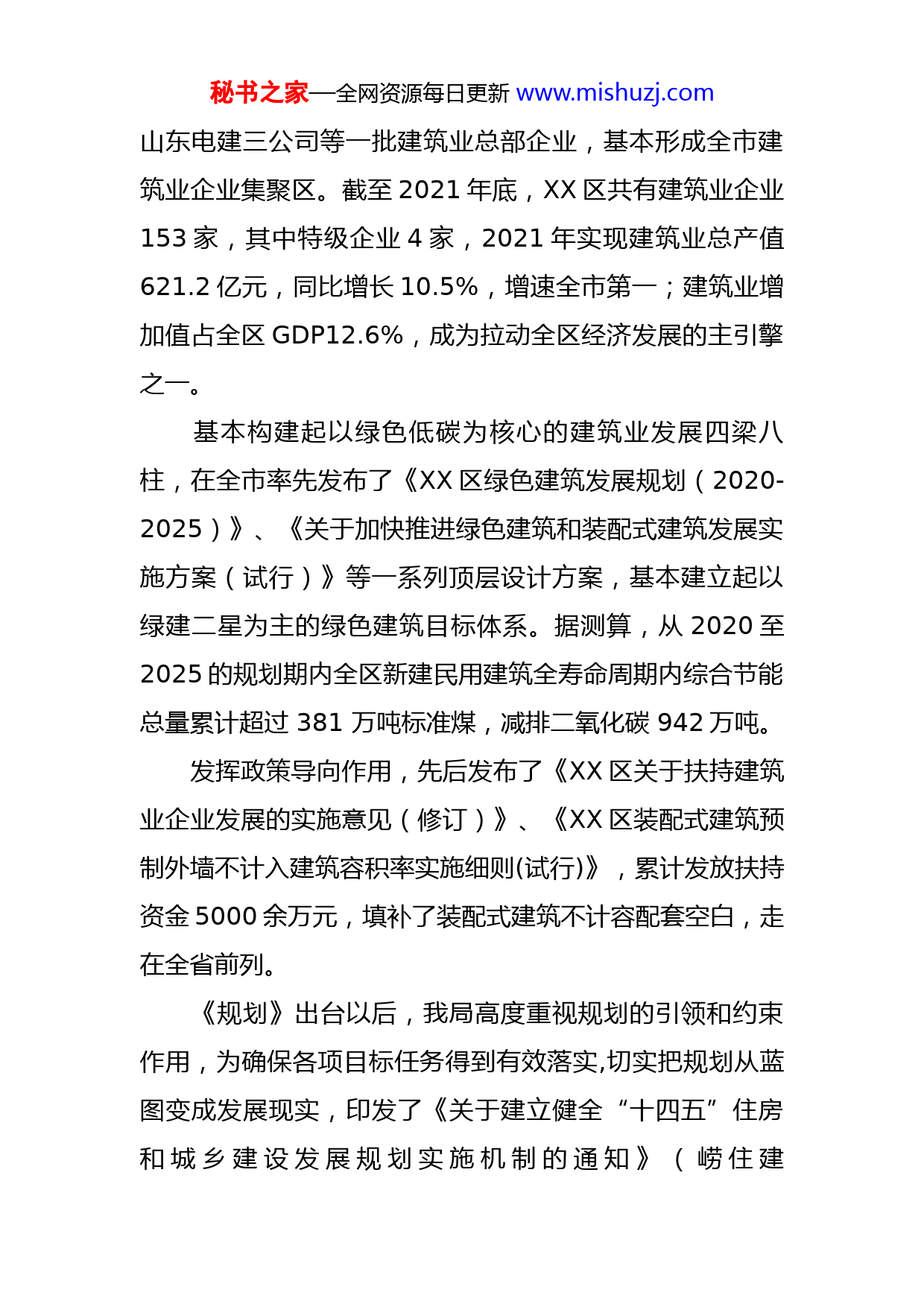 秘书之家—全网资源每日更新www.mishuzj.com《区“十四五”住房和城乡建设发展规划》执行效果评估报告《XX区“十四五”住房和城乡建设发展规划》(简称《规划》)主要实施内容包括:“十四五”阶段,XX区在新旧动能转换、新型城镇化建设、建筑业转型发展、房地产市场发展、城镇住房保障体系、城市设计和风貌管理、城镇市政基础设施建设、城市宜居环境、城市管理现代化水平、风景名胜区发展、农村人居环境、建筑节能和绿色建筑、装配式建筑、智能建筑、建筑信息化等住房和城乡建设领域的工作目标。对建筑业转型升级、房地产市场发展、城镇住房保障体系等重点领域内容深入分析产业发展涉及的各项要素,梳理产业发展的需求、存在问题和发展矛盾,并根据供给能力,提出强基础、补短板、增亮点等重点任务、实施路径和保障措施,确保目标和举措能够顺应发展趋势、引领发展方向。近年来,我区建筑业总产值增速一直保持全市前两位。通过充分发挥政策引导、产业扶持、资本聚集等优势,先后助推了中建系、中铁系等“中”字头为代表的30余家企业集团到XX布局发展,先后汇集了中建八局四公司、中铁二十局四公司、中电建公司、中石油七建公司、秘书之家—全网资源每日更新www.mishuzj.com山东电建三公司等一批建筑业总部企业,基本形成全市建筑业企业集聚区。截至2021年底,XX区共有建筑业企业153家,其中特级企业4家,2021年实现建筑业总产值621.2亿元,同比增长10.5%,增速全市第一;建筑业增加值占全区GDP12.6%,成为拉动全区经济发展的主引擎之一。基本构建起以绿色低碳为核心的建筑业发展四梁八柱,在全市率先发布了《XX区绿色建筑发展规划(2020-2025)》、《关于加快推进绿色建筑和装配式建筑发展实施方案(试行)》等一系列顶层设计方案,基本建立起以绿建二星为主的绿色建筑目标体系。据测算,从2020至2025的规划期内全区新建民用建筑全寿命周期内综合节能总量累计超过381万吨标准煤,减排二氧化碳942万吨。发挥政策导向作用,先后发布了《XX区关于扶持建筑业企业发展的实施意见(修订)》、《XX区装配式建筑预制外墙不计入建筑容积率实施细则(试行)》,累计发放扶持资金5000余万元,填补了装配式建筑不计容配套空白,走在全省前列。《规划》出台以后,我局高度重视规划的引领和约束作用,为确保各项目标任务得到有效落实,切实把规划从蓝图变成发展现实,印发了《关于建立健全“十四五”住房和城乡建设发展规划实施机制的通知》(崂住建秘书之家—全网资源每日更新www.mishuzj.com〔2022〕11号),成立了以主要负责人牛永波同志为组长的工作领导小组,完善了计划目标调度考核机制,将《规划》实施中的34项主要指标、五大专项行动分解到具体的中心、科室,同时将主要指标、任务纳入年度计划安排,并做好年度间综合平衡,年度实施落实情况要纳入年度完成情况报告,向局党组汇报;制定切实可行的年度时间节点实施计划,定期跟踪落实重点任务实施进展情况,及时研判可能对《规划》实施产生影响的风险因素。《规划》实施以来,全区住房和城乡建设事业逐步走向了规范化、制度化,建筑工业化、数字化、智能化水平不断提高,绿色生活方式普遍推广,更健康、更安全、更怡居的山海品质新城稳步推进。下一步工作思路强化规划引领作用,全面统筹推进绿色低碳、生态怡居的山海品质新城建设。一是加强组织领导,健全决策机制,形成定期分析经济形势、研究重大经济问题的制度,切实提升决策科学化水平。二是明确责任落实,完善重点任务实施机制。将规划目标任务逐年分解,明确年度发展目标、任务、牵头单位和工作责任,在规划实施期内的年度内,组织实施年初、年中、年终会议调度,切实提升规划实施科学化水平。三是加大监督力度,全面推进规划年度监测、中期评估和终期评估工作。建立健全重要目标任秘书之家—全网资源每日更新www.mishuzj.com务跟踪反馈机制,根据实际运行情况提出修订方案、整改措施。加强规划实施社会监督,开展规划宣传和展示工作,政府、社会、市民同心同向行动,形成群策群力、共建共享的生动局面。