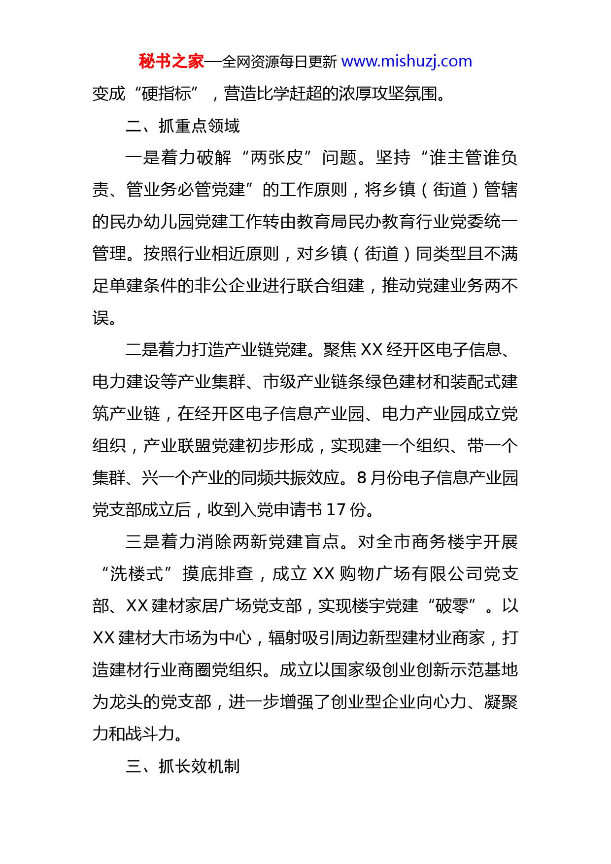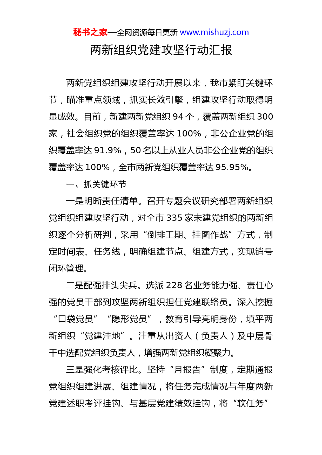 秘书之家—全网资源每日更新www.mishuzj.com两新组织党建攻坚行动汇报两新党组织组建攻坚行动开展以来,我市紧盯关键环节,瞄准重点领域,抓实长效引擎,组建攻坚行动取得明显成效。目前,新建两新党组织94个,覆盖两新组织300家,社会组织党的组织覆盖率达100%,非公企业党的组织覆盖率达91.9%,50名以上从业人员非公企业党的组织覆盖率达100%,全市两新党组织覆盖率达95.95%。一、抓关键环节一是明晰责任清单。召开专题会议研究部署两新组织党组织组建攻坚行动,对全市335家未建党组织的两新组织逐个分析研判,采用“倒排工期、挂图作战”方式,制定时间表、任务线,明确组建节点、组建方式,实现销号闭环管理。二是配强排头尖兵。选派228名业务能力强、责任心强的党员干部到攻坚两新组织担任党建联络员。深入挖掘“口袋党员”“隐形党员”,教育引导亮明身份,填平两新组织“党建洼地”。注重从出资人(负责人)及中层骨干中选配党组织负责人,增强两新党组织凝聚力。三是强化考核评比。坚持“月报告”制度,定期通报党组织组建进展、组建情况,将任务完成情况与年度两新党建述职考评挂钩、与基层党建绩效挂钩,将“软任务”秘书之家—全网资源每日更新www.mishuzj.com变成“硬指标”,营造比学赶超的浓厚攻坚氛围。二、抓重点领域一是着力破解“两张皮”问题。坚持“谁主管谁负责、管业务必管党建”的工作原则,将乡镇(街道)管辖的民办幼儿园党建工作转由教育局民办教育行业党委统一管理。按照行业相近原则,对乡镇(街道)同类型且不满足单建条件的非公企业进行联合组建,推动党建业务两不误。二是着力打造产业链党建。聚焦XX经开区电子信息、电力建设等产业集群、市级产业链条绿色建材和装配式建筑产业链,在经开区电子信息产业园、电力产业园成立党组织,产业联盟党建初步形成,实现建一个组织、带一个集群、兴一个产业的同频共振效应。8月份电子信息产业园党支部成立后,收到入党申请书17份。三是着力消除两新党建盲点。对全市商务楼宇开展“洗楼式”摸底排查,成立XX购物广场有限公司党支部、XX建材家居广场党支部,实现楼宇党建“破零”。以XX建材大市场为中心,辐射吸引周边新型建材业商家,打造建材行业商圈党组织。成立以国家级创业创新示范基地为龙头的党支部,进一步增强了创业型企业向心力、凝聚力和战斗力。三、抓长效机制秘书之家—全网资源每日更新www.mishuzj.com一是加强组织保障。将城区四办原两新党总支升级为街道两新组织综合党委,由街道党工委副书记任综合党委书记,组织委员任副书记,进一步强化组织保障。对新建两新党组织逐一走访调研,一对一业务指导,举办党务工作培训班,进一步促能力提高、角色转换、发展稳固。大力开展“四联共建”活动,相关职能部门积极助力,解决招工用人、政策解答等实际困难350余个。二是凝聚先锋引领。组建只是开始,作用发挥才是根本。XX家居广场党组织成立后,通过开展党员示范门店、党员业务能手、党员先锋岗评选等主题党日活动,为营造文明诚信、规范有序的公平竞争市场环境助力;XX建材大市场通过建立商圈党组织,顺利推进长期“瘫痪”的业主委员会换届,党员带头实现市场违章建筑全拆除,整体面貌焕然一新。XX市酒业协会党支部以让消费者喝上“放心酒、良心酒、安全酒”为出发点,通过评选“放心酒示范店”、签订行业自律承诺书等方式,确保党员商户不销售假冒伪劣商品,积极配合职能部门净化全市酒类市场。通过党建引领,进一步助推行业自立自律、规范发展。三是树立先进典型。成功创建省市县标杆党组织16个,其中XX有限公司党委成功创建省级标杆党组织,XX有限公司党支部获评市委先进基层党组织称号,XX在上交所成功挂牌上市,XXX等3家企业上榜专精特新“小巨秘书之家—全网资源每日更新www.mishuzj.com人”企业名单。