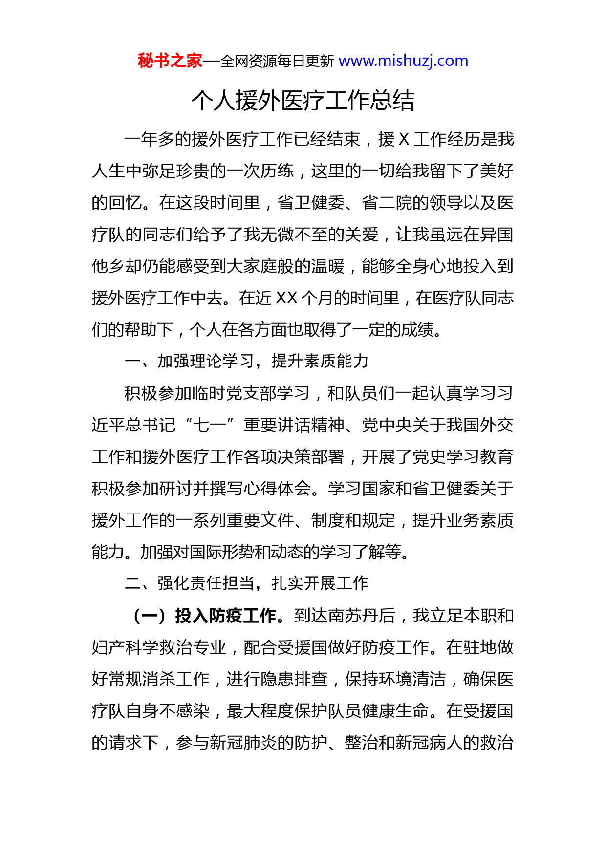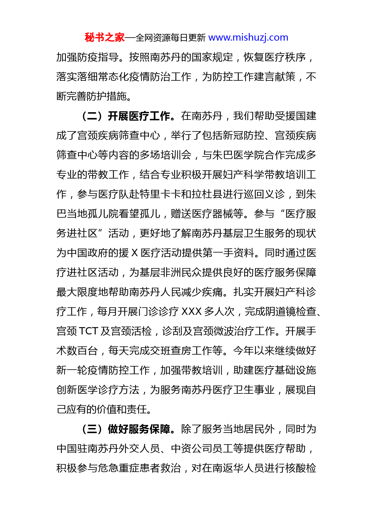 秘书之家—全网资源每日更新www.mishuzj.com个人援外医疗工作总结一年多的援外医疗工作已经结束,援X工作经历是我人生中弥足珍贵的一次历练,这里的一切给我留下了美好的回忆。在这段时间里,省卫健委、省二院的领导以及医疗队的同志们给予了我无微不至的关爱,让我虽远在异国他乡却仍能感受到大家庭般的温暖,能够全身心地投入到援外医疗工作中去。在近XX个月的时间里,在医疗队同志们的帮助下,个人在各方面也取得了一定的成绩。一、加强理论学习,提升素质能力积极参加临时党支部学习,和队员们一起认真学习习近平总书记“七一”重要讲话精神、党中央关于我国外交工作和援外医疗工作各项决策部署,开展了党史学习教育积极参加研讨并撰写心得体会。学习国家和省卫健委关于援外工作的一系列重要文件、制度和规定,提升业务素质能力。加强对国际形势和动态的学习了解等。二、强化责任担当,扎实开展工作(一)投入防疫工作。到达南苏丹后,我立足本职和妇产科学救治专业,配合受援国做好防疫工作。在驻地做好常规消杀工作,进行隐患排查,保持环境清洁,确保医疗队自身不感染,最大程度保护队员健康生命。在受援国的请求下,参与新冠肺炎的防护、整治和新冠病人的救治秘书之家—全网资源每日更新www.mishuzj.com加强防疫指导。按照南苏丹的国家规定,恢复医疗秩序,落实落细常态化疫情防治工作,为防控工作建言献策,不断完善防护措施。(二)开展医疗工作。在南苏丹,我们帮助受援国建成了宫颈疾病筛查中心,举行了包括新冠防控、宫颈疾病筛查中心等内容的多场培训会,与朱巴医学院合作完成多专业的带教工作,结合专业积极开展妇产科学带教培训工作,参与医疗队赴特里卡卡和拉杜县进行巡回义诊,到朱巴当地孤儿院看望孤儿,赠送医疗器械等。参与“医疗服务进社区”活动,更好地了解南苏丹基层卫生服务的现状为中国政府的援X医疗活动提供第一手资料。同时通过医疗进社区活动,为基层非洲民众提供良好的医疗服务保障最大限度地帮助南苏丹人民减少疾痛。扎实开展妇产科诊疗工作,每月开展门诊诊疗XXX多人次,完成阴道镜检查、宫颈TCT及宫颈活检,诊刮及宫颈微波治疗工作。开展手术数百台,每天完成交班查房工作等。今年以来继续做好新一轮疫情防控工作,加强带教培训,助建医疗基础设施创新医学诊疗方法,为服务南苏丹医疗卫生事业,展现自己应有的价值和责任。(三)做好服务保障。除了服务当地居民外,同时为中国驻南苏丹外交人员、中资公司员工等提供医疗帮助,积极参与危急重症患者救治,对在南返华人员进行核酸检秘书之家—全网资源每日更新www.mishuzj.com测,为中国驻南苏丹大使馆工作人员开展体检工作,为在南同胞注射新冠疫苗接种工作等,切实为我国驻外机构、援非企业公司和人员做好服务保障。三、弘扬务实作风,严格廉洁自律(一)增强责任意识。始终牢记总书记对广大医务工作者的嘱托和期望,始终牢记援外医疗为我国外交服务的宗旨。坚持以人民利益为中心,在党和国家最需要的时候勇挑重担、冲锋在前,自觉扛起医务工作者的社会责任,做到关键时刻顶得上、豁得出,在为国家奉献中作出应有贡献,也为中非友谊交上一份满意的答卷。(二)严守制度规定。作为一名援外医疗队员,我们坚守医务工作者的初心,自觉遵守援外工作各项规定和纪律,自觉按照省卫健委、省援外办、省二院和医疗队领导的要求,严格自我约束和管理,提升医疗和服务水平,履行好援外医疗工作使命。在短短的一年多时间,援外医疗队以严谨的工作作风、专业的医技水平、卓有成效的工作业绩,赢得了受援国政府和人民的普遍尊重和一致好评,我作为其中的一员也倍感荣耀和自豪!(三)传递中国精神。援外医疗工作中,每一次工作的推进、每一点成绩的取得,都来自于全体队员们的团结拼搏和信念的力量。当好白衣战士、传递中国精神,队员秘书之家—全网资源每日更新www.mishuzj.com们以过硬的作风、博大的情怀,展示了大国风范和形象,也展现了新时代中国青年医疗队员的靓丽风采!