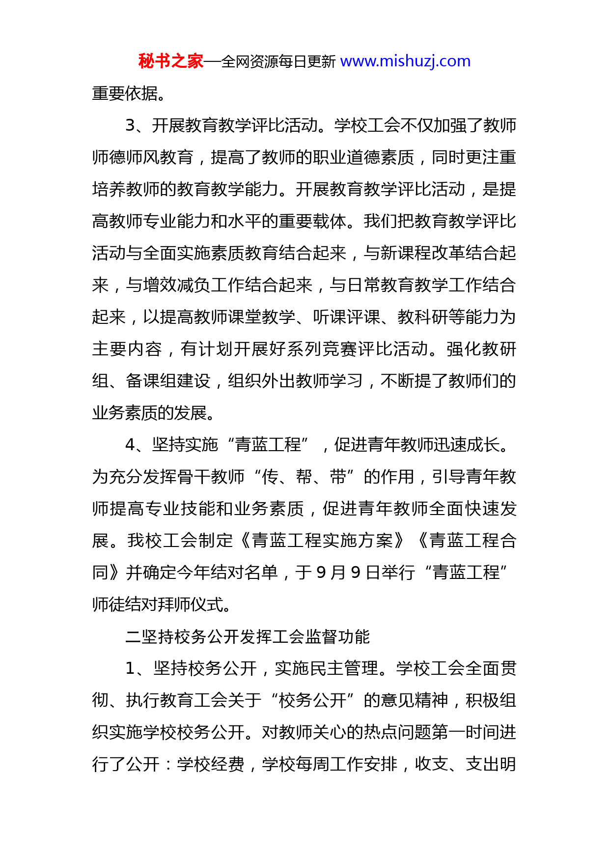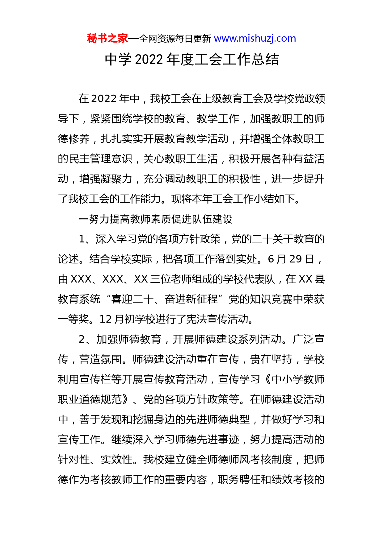 秘书之家—全网资源每日更新www.mishuzj.com中学2022年度工会工作总结在2022年中,我校工会在上级教育工会及学校党政领导下,紧紧围绕学校的教育、教学工作,加强教职工的师德修养,扎扎实实开展教育教学活动,并增强全体教职工的民主管理意识,关心教职工生活,积极开展各种有益活动,增强凝聚力,充分调动教职工的积极性,进一步提升了我校工会的工作能力。现将本年工会工作小结如下。一努力提高教师素质促进队伍建设1、深入学习党的各项方针政策,党的二十关于教育的论述。结合学校实际,把各项工作落到实处。6月29日,由XXX、XXX、XX三位老师组成的学校代表队,在XX县教育系统“喜迎二十、奋进新征程”党的知识竞赛中荣获一等奖。12月初学校进行了宪法宣传活动。2、加强师德教育,开展师德建设系列活动。广泛宣传,营造氛围。师德建设活动重在宣传,贵在坚持,学校利用宣传栏等开展宣传教育活动,宣传学习《中小学教师职业道德规范》、党的各项方针政策等。在师德建设活动中,善于发现和挖掘身边的先进师德典型,并做好学习和宣传工作。继续深入学习师德先进事迹,努力提高活动的针对性、实效性。我校建立健全师德师风考核制度,把师德作为考核教师工作的重要内容,职务聘任和绩效考核的秘书之家—全网资源每日更新www.mishuzj.com重要依据。3、开展教育教学评比活动。学校工会不仅加强了教师师德师风教育,提高了教师的职业道德素质,同时更注重培养教师的教育教学能力。开展教育教学评比活动,是提高教师专业能力和水平的重要载体。我们把教育教学评比活动与全面实施素质教育结合起来,与新课程改革结合起来,与增效减负工作结合起来,与日常教育教学工作结合起来,以提高教师课堂教学、听课评课、教科研等能力为主要内容,有计划开展好系列竞赛评比活动。强化教研组、备课组建设,组织外出教师学习,不断提了教师们的业务素质的发展。4、坚持实施“青蓝工程”,促进青年教师迅速成长。为充分发挥骨干教师“传、帮、带”的作用,引导青年教师提高专业技能和业务素质,促进青年教师全面快速发展。我校工会制定《青蓝工程实施方案》《青蓝工程合同》并确定今年结对名单,于9月9日举行“青蓝工程”师徒结对拜师仪式。二坚持校务公开发挥工会监督功能1、坚持校务公开,实施民主管理。学校工会全面贯彻、执行教育工会关于“校务公开”的意见精神,积极组织实施学校校务公开。对教师关心的热点问题第一时间进行了公开:学校经费,学校每周工作安排,收支、支出明秘书之家—全网资源每日更新www.mishuzj.com细账,学校各种方案制度,评优晋级、教职工年度考核、教师奖励性绩效工资分配情况。还有学生家长关心的问题:贫困学生推荐花名册、三好学生及优秀学生干部等。2、参与学校的决策。工会在协助校行政进行学校内部管理体制改革的同时,始终参与学校的民主管理,参与学校的决策。对学校试行的改革方案和制定的各项规章制度广泛征求意见,不断修改完善,保证实施效果。对教职工评优、评先、职称评定等采取民主评议,并将结果在公示栏进行公示。绩效工资的试行方案、年度考核方案、班主任月考核结果、教师月考核情况、各级先进推荐等。3、关心帮扶重点学生。学校工会在校党政领导下进行了“冬日暖阳”困难生走访慰问;2022“夏日圆梦”活动。三营造和谐工作氛围关注教师身心健康1、学校党政领导无时无刻不把老师们的事情放在心上,经常了解教师们的需求,把教师的身心健康、幸福生活作为头等大事去抓、把党政领导的关心和爱护送给每一位教师。今年来为老师们做了较多的工作。如:参与疫情防控工作;组织体检;组织无偿献血;三八妇女节组织“学习强国”知识竞赛等活动。2、积极关心教职工的生活,开展送温暖活动,组织慰问困难教职工和生病教工,还是结婚、生小孩,教职工的秘书之家—全网资源每日更新www.mishuzj.com红白喜事,学校工会总是会同党政领导一起在第一时间上门慰问和祝贺,把学校的关心送到每个教职工的心坎上。3、广泛开展校园文化体育活动,增强凝聚力,愉悦教职工身心:如开展了教职工运动会等。总之,丰富多彩的活动,不仅陶冶了身心,增强了体魄,还增进了同事间的情谊,为全体教职工营造了一个宽松和谐快乐的工作氛围。