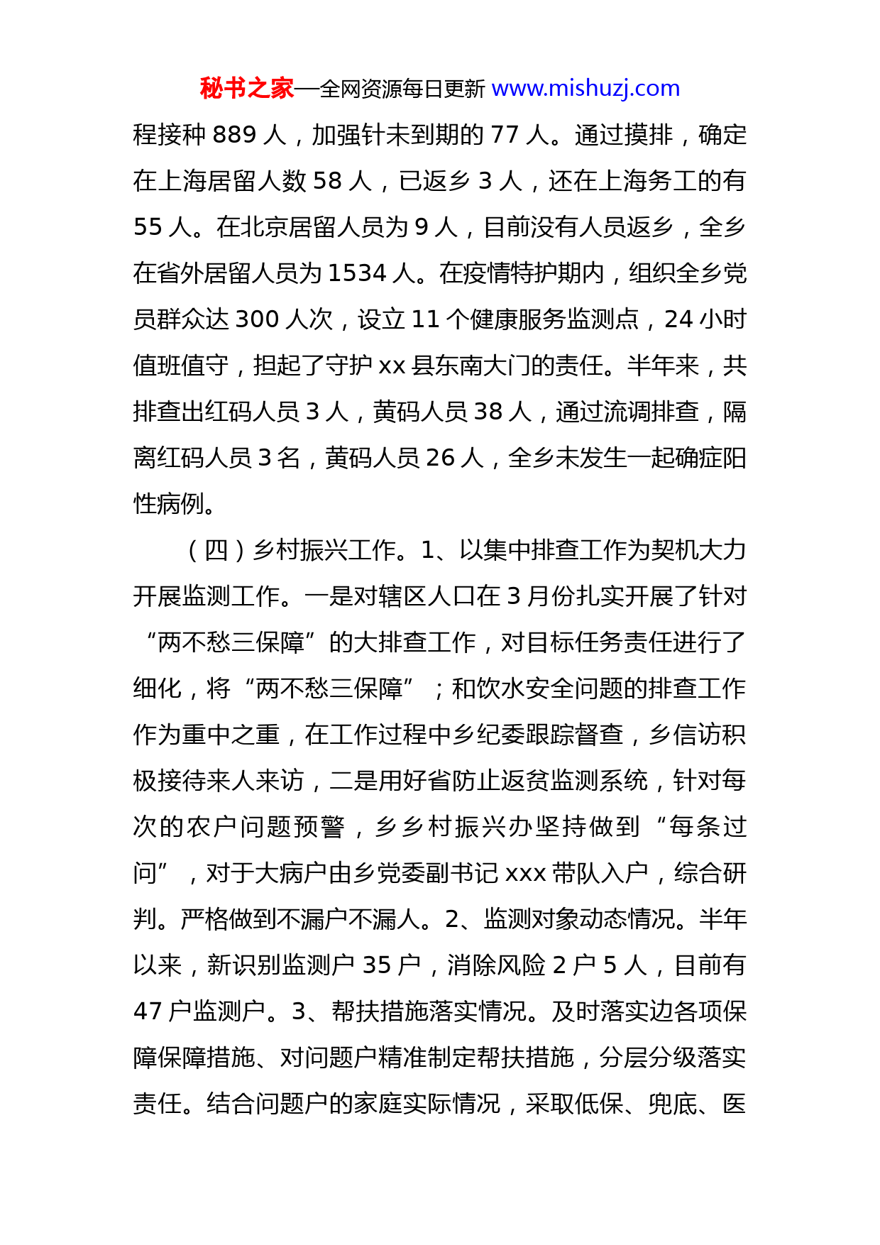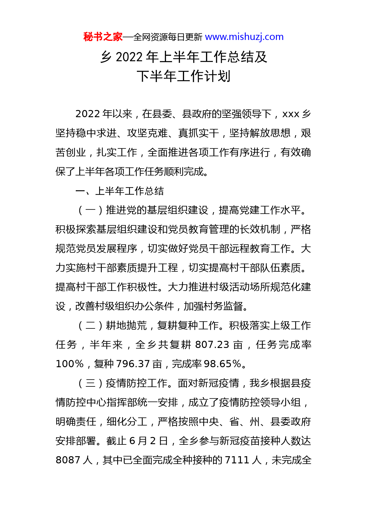 秘书之家—全网资源每日更新www.mishuzj.com乡2022年上半年工作总结及下半年工作计划2022年以来,在县委、县政府的坚强领导下,xxx乡坚持稳中求进、攻坚克难、真抓实干,坚持解放思想,艰苦创业,扎实工作,全面推进各项工作有序进行,有效确保了上半年各项工作任务顺利完成。一、上半年工作总结(一)推进党的基层组织建设,提高党建工作水平。积极探索基层组织建设和党员教育管理的长效机制,严格规范党员发展程序,切实做好党员干部远程教育工作。大力实施村干部素质提升工程,切实提高村干部队伍素质。提高村干部工作积极性。大力推进村级活动场所规范化建设,改善村级组织办公条件,加强村务监督。(二)耕地抛荒,复耕复种工作。积极落实上级工作任务,半年来,全乡共复耕807.23亩,任务完成率100%,复种796.37亩,完成率98.65%。(三)疫情防控工作。面对新冠疫情,我乡根据县疫情防控中心指挥部统一安排,成立了疫情防控领导小组,明确责任,细化分工,严格按照中央、省、州、县委政府安排部署。截止6月2日,全乡参与新冠疫苗接种人数达8087人,其中已全面完成全种接种的7111人,未完成全秘书之家—全网资源每日更新www.mishuzj.com程接种889人,加强针未到期的77人。通过摸排,确定在上海居留人数58人,已返乡3人,还在上海务工的有55人。在北京居留人员为9人,目前没有人员返乡,全乡在省外居留人员为1534人。在疫情特护期内,组织全乡党员群众达300人次,设立11个健康服务监测点,24小时值班值守,担起了守护xx县东南大门的责任。半年来,共排查出红码人员3人,黄码人员38人,通过流调排查,隔离红码人员3名,黄码人员26人,全乡未发生一起确症阳性病例。(四)乡村振兴工作。1、以集中排查工作为契机大力开展监测工作。一是对辖区人口在3月份扎实开展了针对“两不愁三保障”的大排查工作,对目标任务责任进行了细化,将“两不愁三保障”;和饮水安全问题的排查工作作为重中之重,在工作过程中乡纪委跟踪督查,乡信访积极接待来人来访,二是用好省防止返贫监测系统,针对每次的农户问题预警,乡乡村振兴办坚持做到“每条过问”,对于大病户由乡党委副书记xxx带队入户,综合研判。严格做到不漏户不漏人。2、监测对象动态情况。半年以来,新识别监测户35户,消除风险2户5人,目前有47户监测户。3、帮扶措施落实情况。及时落实边各项保障保障措施、对问题户精准制定帮扶措施,分层分级落实责任。结合问题户的家庭实际情况,采取低保、兜底、医秘书之家—全网资源每日更新www.mishuzj.com疗救助、医疗一事一议等针对帮扶,同时针对该户实际情况帮助产业发展。(五)美丽xx工作。一是开展广告牌治理,确保墙面规范。通过规范商户广告牌,实行一店一牌,清除商户门店牛皮癣广告,进一步优化村容村貌,截至27日,辖区内32家商户广告牌均统一规范成红底白字,保证辖区内墙面规范。二是整治车辆停放,做到街面干净。xxx乡综合执法队对集镇区车辆停放进行整治,对占道车主进行宣传和劝导,要求机动车一律停放集镇区划定的车位内,有序规范停放,为道路交通的平安、畅通、和谐、有序出力。同时对村主干道、农户房前屋后、商户门店乱堆乱放、乱搭乱建、户外管线专项整治,重点清理沿线杂草、卫生死角,清除各类生活垃圾、牛皮癣广告,营造了环境优美、秩序井然、宜居宜游的美丽乡村环境。三是人居环境不断改善改善。2022年我乡把卫生改厕户建设和空心房危房拆除作为民生实事重要内容来抓。目前我乡池坪村、天堂村、水田村等9个村187户开展了建设美丽xx农村改厕工作,目前完成建设农村改厕56座,拆除空心房103栋。四是宣传督查力我乡美丽办定期不定期对度不断加大。为巩固脱贫成果后评估建设美丽xx工作,辖区9个村的美丽xx建设工作进行巡查。巡查组入村查阅有关美丽xx建设工作台账和实地查看,对各村美丽xx建设工作部署推进、秘书之家—全网资源每日更新www.mishuzj.com宣传、清单和实在进行查看,半年共通报10余次,宣传发放建设美丽xx宣传画、宣传资料、农户门前三包、商铺门前六包共4000余份,通过村村响广播循环播放建设美丽xx宣传资料累计120余次,入户宣传建设美丽xx知识600余人次等方法,做到人人知晓率和参与率达到100%,大力宣传和采取有力措施,认真的抓好环境卫生整治,为群众营造一个干净整洁的生活环境,进一步提高全乡村民群众建设美丽xx工作开展奠定了坚实的群众拥护基础。五是争先创优。在全乡范围内开展创建“最美农家”活动,通过开展“最美农家”活动,在全乡范围内掀起建设美丽乡村、美好家园的良好氛围。(六)坚持保障民生,为民服务不断加强。一是服务工作。规范了“政务中心”大厅,方便群众办事方便、快捷,积极向来访群众解答新型农村社会养老保险和城镇居民基本医疗保险等惠民政策和办理流程,获得群众的一致认可和好评。二是民政救助。2022年半年共临时救助60人,救助金额达60000元;2022年初为兜底户发放过年物质棉被68件,米158袋、棉衣149套、食用油58桶、礼盒9套。有效缓解了群众的突发性、临时性的生活困难问题,较好地保障了困难群众的生活。为解决残疾人办证不便的问题,县残联、县人民医院,联合xxx乡民政办工作人员在今年内1次下村入户为2名行动不便残疾人秘书之家—全网资源每日更新www.mishuzj.com入户鉴定、办