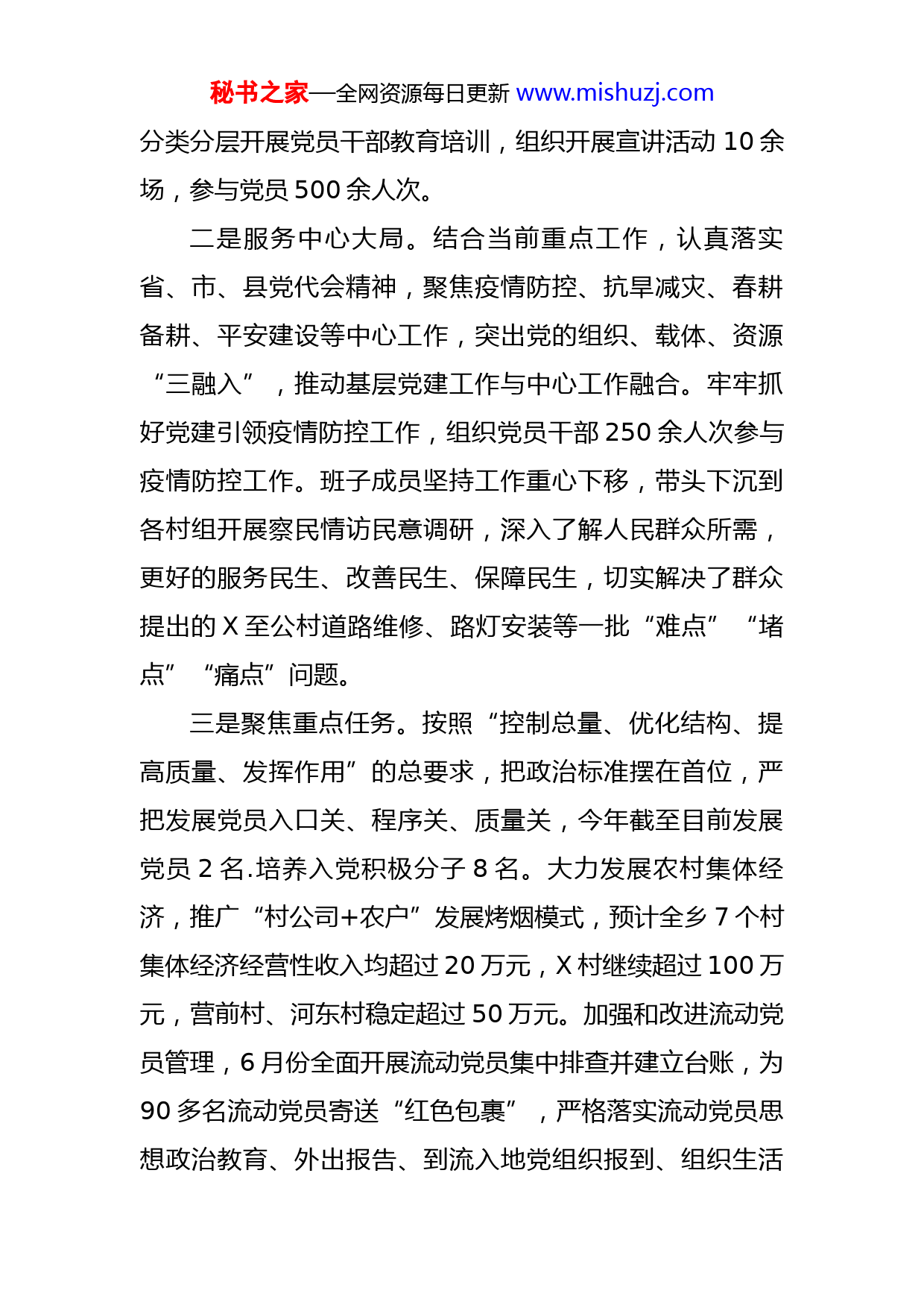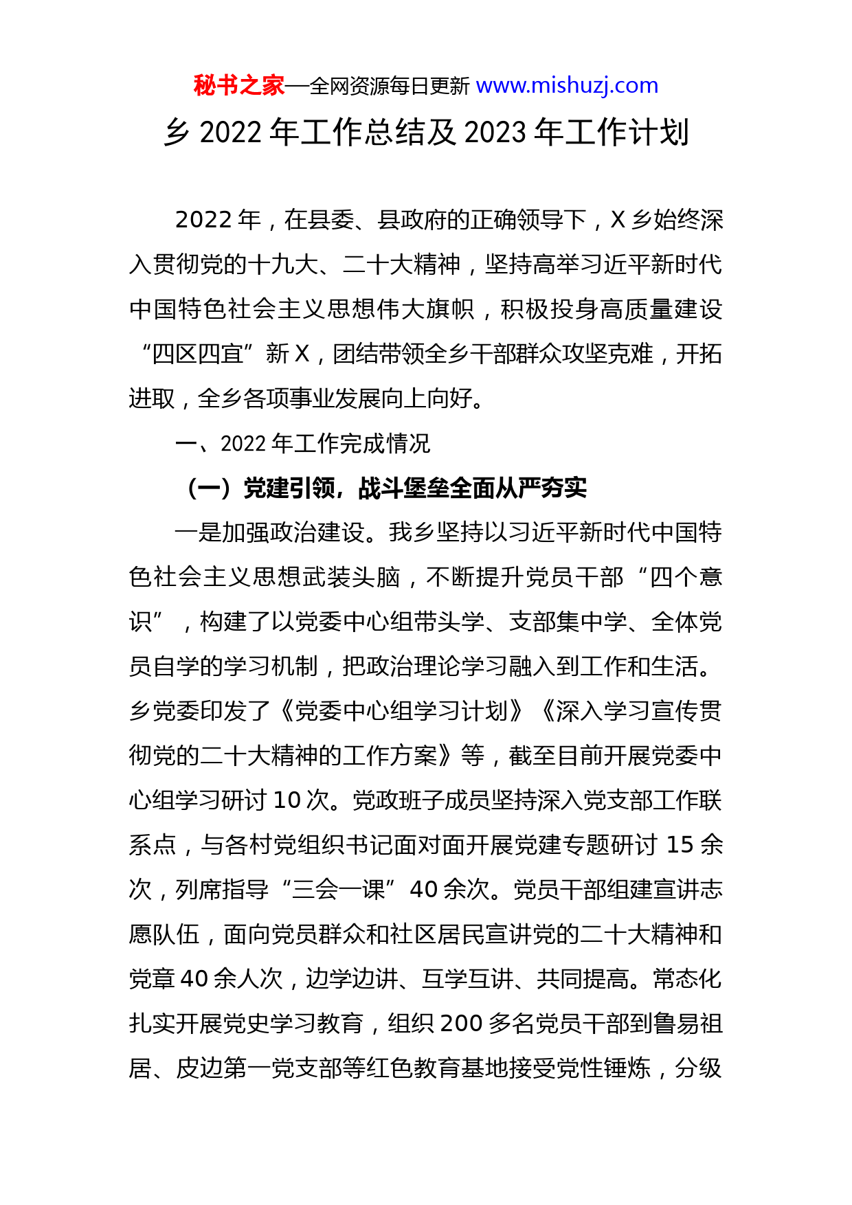 秘书之家—全网资源每日更新www.mishuzj.com乡2022年工作总结及2023年工作计划2022年,在县委、县政府的正确领导下,X乡始终深入贯彻党的十九大、二十大精神,坚持高举习近平新时代中国特色社会主义思想伟大旗帜,积极投身高质量建设“四区四宜”新X,团结带领全乡干部群众攻坚克难,开拓进取,全乡各项事业发展向上向好。一、2022年工作完成情况(一)党建引领,战斗堡垒全面从严夯实一是加强政治建设。我乡坚持以习近平新时代中国特色社会主义思想武装头脑,不断提升党员干部“四个意识”,构建了以党委中心组带头学、支部集中学、全体党员自学的学习机制,把政治理论学习融入到工作和生活。乡党委印发了《党委中心组学习计划》《深入学习宣传贯彻党的二十大精神的工作方案》等,截至目前开展党委中心组学习研讨10次。党政班子成员坚持深入党支部工作联系点,与各村党组织书记面对面开展党建专题研讨15余次,列席指导“三会一课”40余次。党员干部组建宣讲志愿队伍,面向党员群众和社区居民宣讲党的二十大精神和党章40余人次,边学边讲、互学互讲、共同提高。常态化扎实开展党史学习教育,组织200多名党员干部到鲁易祖居、皮边第一党支部等红色教育基地接受党性锤炼,分级秘书之家—全网资源每日更新www.mishuzj.com分类分层开展党员干部教育培训,组织开展宣讲活动10余场,参与党员500余人次。二是服务中心大局。结合当前重点工作,认真落实省、市、县党代会精神,聚焦疫情防控、抗旱减灾、春耕备耕、平安建设等中心工作,突出党的组织、载体、资源“三融入”,推动基层党建工作与中心工作融合。牢牢抓好党建引领疫情防控工作,组织党员干部250余人次参与疫情防控工作。班子成员坚持工作重心下移,带头下沉到各村组开展察民情访民意调研,深入了解人民群众所需,更好的服务民生、改善民生、保障民生,切实解决了群众提出的X至公村道路维修、路灯安装等一批“难点”“堵点”“痛点”问题。三是聚焦重点任务。按照“控制总量、优化结构、提高质量、发挥作用”的总要求,把政治标准摆在首位,严把发展党员入口关、程序关、质量关,今年截至目前发展党员2名.培养入党积极分子8名。大力发展农村集体经济,推广“村公司+农户”发展烤烟模式,预计全乡7个村集体经济经营性收入均超过20万元,X村继续超过100万元,营前村、河东村稳定超过50万元。加强和改进流动党员管理,6月份全面开展流动党员集中排查并建立台账,为90多名流动党员寄送“红色包裹”,严格落实流动党员思想政治教育、外出报告、到流入地党组织报到、组织生活秘书之家—全网资源每日更新www.mishuzj.com等制度,党员教育管理“一个都不能少”。四是全面从严治党。坚持把落实全面从严治党主体责任作为乡党委的政治责任、首要责任,结合我乡实际情况,将党风廉政建设工作纳入乡党委、政府议事日程,先后4次召开乡党委会专题研究部署全面从严治党和党风廉政建设相关工作,研究并制定了《2022年党风廉政建设和反腐败工作实施方案》。扎实开展“八扬八治”深化作风建设活动,全乡党员干部开展自查自纠,查找问题260余个,并逐一制定了整改措施,迅速进行整改。乡纪委针对全乡疫情防控、巩固脱贫攻坚成果、耕地“非粮化、非农化”图斑整改等各项中心工作,开展监督检查12次,重点纠正一些干部不作为、乱作为、慢作为,推诿扯皮等问题13个。严肃查处党员干部违法违纪案件。截至目前,共处置问题线索立案审查调查4起,给予党内警告处分4人;积极践行监督执纪“四种形态”,谈话提醒5人,通报批评13人;在节假日前向全乡党员干部发送廉情提醒信息400余人次。五是创建节约机关。常态化传达学习中共中央总书记习近平关于厉行勤俭节约、反对铺张浪费的重要指示精神以及中央,省、市委关于“八项规定”相关文件精神,及时通报违反“八项规定”的案件。同时,坚持把创建节约型机关同创建服务型机关紧密结合起来,强化机关全体干秘书之家—全网资源每日更新www.mishuzj.com部时间观念和效率意识,使全体机关干部从讲政治的高度,充分认识落实八项规定、建设节约型机关的重要意义,把厉行节约、反对铺张浪费作为自觉的行动。进一步减少开支,节约办公经费。截至目前,乡纪委牵头对食堂开展常态化监督检查2次,对浪费行为给予批评教育,要求全体干部职工要自觉践行“光盘”行动和落实“文明餐桌”行动。严格执行公务用车管理规定,禁止公车私用,对每辆公务车燃料费专项登记,定期检查车辆油耗情况,实施车辆定点维修和定期保养制度。认真执行政府采购制度,全面推行电子卖场实行定点采购。节约使用办公耗材,从严、从紧配置办公设备,进一步规范办公用品的配备、采购、领用手续,提倡使用电子邮件发送文件资料,尽量减少纸质文件和文稿的印发数量,减少重复清印次数,提倡双面重复用纸。(二)协调并进,产业发展态势持续向好一是农业产业平稳发展。坚决扛稳粮食安全重担,2022年全乡共种植早稻6348亩,中稻15432亩、晚稻3828亩,总粮食产量1.62万吨。全乡共完成烤烟种植任务700亩,收购烟叶9.4万公斤,总产值超过300万元,均价16.2元每斤,整体收购情况稳中有增。全乡蜜桔种植1.3万亩,年产量3500万斤,渔业养殖1.2万亩,烟、桔、鱼等农业特色产业不断壮大