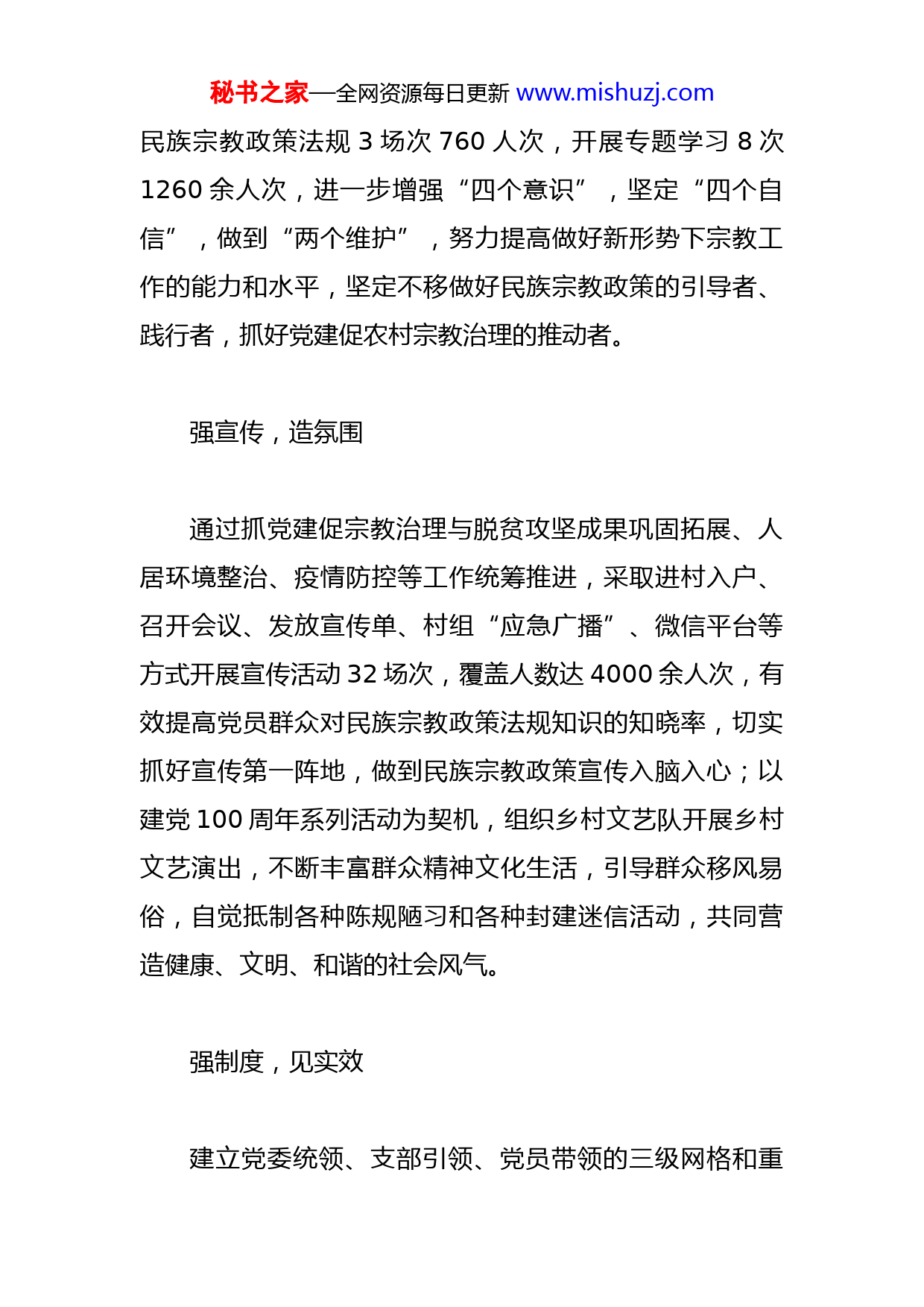 秘书之家—全网资源每日更新www.mishuzj.comX乡“五强化”抓好党建促农村宗教治理工作为巩固民族团结、地区和顺,XX乡采取“五强化”措施充分发挥党组织战斗堡垒和党员先锋模范作用,团结凝聚广大群众,切实把抓党建促农村宗教治理工作干在实处、走在前列。强组织,明责任结合工作实际,成立以专职副书记为组长,挂村领导为副组长,“两委”班子、驻村第一书记和工作队员为成员的抓党建促农村宗教治理工作领导小组。通过定期召开党建促农村宗教治理工作会议找症结、议对策、出实招、解难题、再落实,层层压实主体责任,形成有人管、有人抓、抓出成效的组织体系。强教育,提能力通过党委理论学习中心组、万名党员进党校培训、主题党日专题学,周一例会、村组会议集中学,微信公众号、QQ群跟进学等及时等方式组织培训党员干部群众学习秘书之家—全网资源每日更新www.mishuzj.com民族宗教政策法规3场次760人次,开展专题学习8次1260余人次,进一步增强“四个意识”,坚定“四个自信”,做到“两个维护”,努力提高做好新形势下宗教工作的能力和水平,坚定不移做好民族宗教政策的引导者、践行者,抓好党建促农村宗教治理的推动者。强宣传,造氛围通过抓党建促宗教治理与脱贫攻坚成果巩固拓展、人居环境整治、疫情防控等工作统筹推进,采取进村入户、召开会议、发放宣传单、村组“应急广播”、微信平台等方式开展宣传活动32场次,覆盖人数达4000余人次,有效提高党员群众对民族宗教政策法规知识的知晓率,切实抓好宣传第一阵地,做到民族宗教政策宣传入脑入心;以建党100周年系列活动为契机,组织乡村文艺队开展乡村文艺演出,不断丰富群众精神文化生活,引导群众移风易俗,自觉抵制各种陈规陋习和各种封建迷信活动,共同营造健康、文明、和谐的社会风气。强制度,见实效建立党委统领、支部引领、党员带领的三级网格和重秘书之家—全网资源每日更新www.mishuzj.com点区域网格,形成主体在乡、延伸到村、落实到组、规范到人的工作网络,做到横向到边、纵向到底,实现宗教管理、常态化管控全覆盖,推进宗教领域矛盾纠纷在“网格”中化解,推进农村宗教治理工作落地见效。强堡垒,夯基础严格落实关于党建工作各项部署要求,突出政治功能,按照中央和省、州、县委工作要求,提高政治站位、超前谋划部署,通过换届选优配强乡、村党组织成员,建强基层党组织战斗堡垒,结合群众需求和实际因地制宜,服务群众,让群众享有更多的获得感、幸福感,把群众凝聚在党组织周围,推动抓党建促农村宗教治理各项任务落实落细落小。