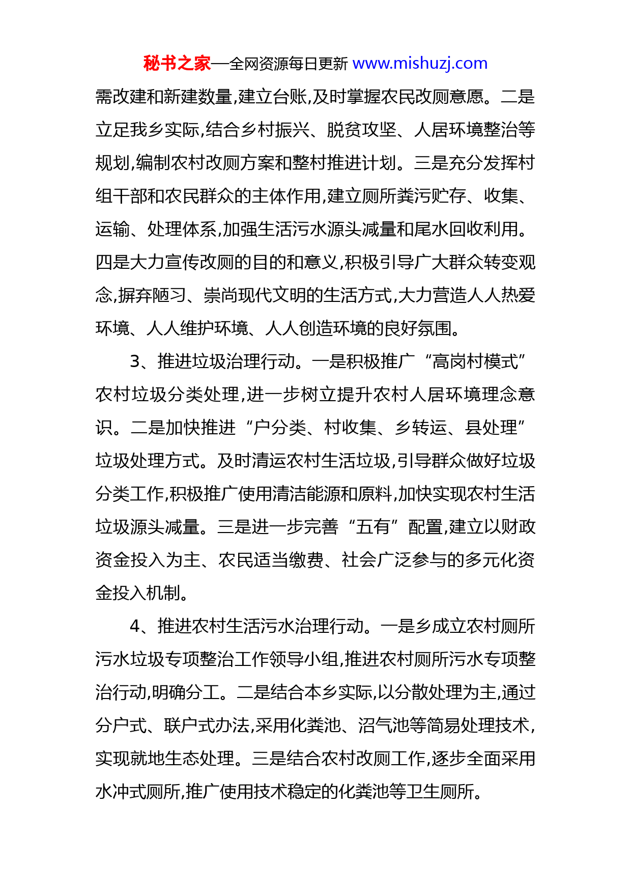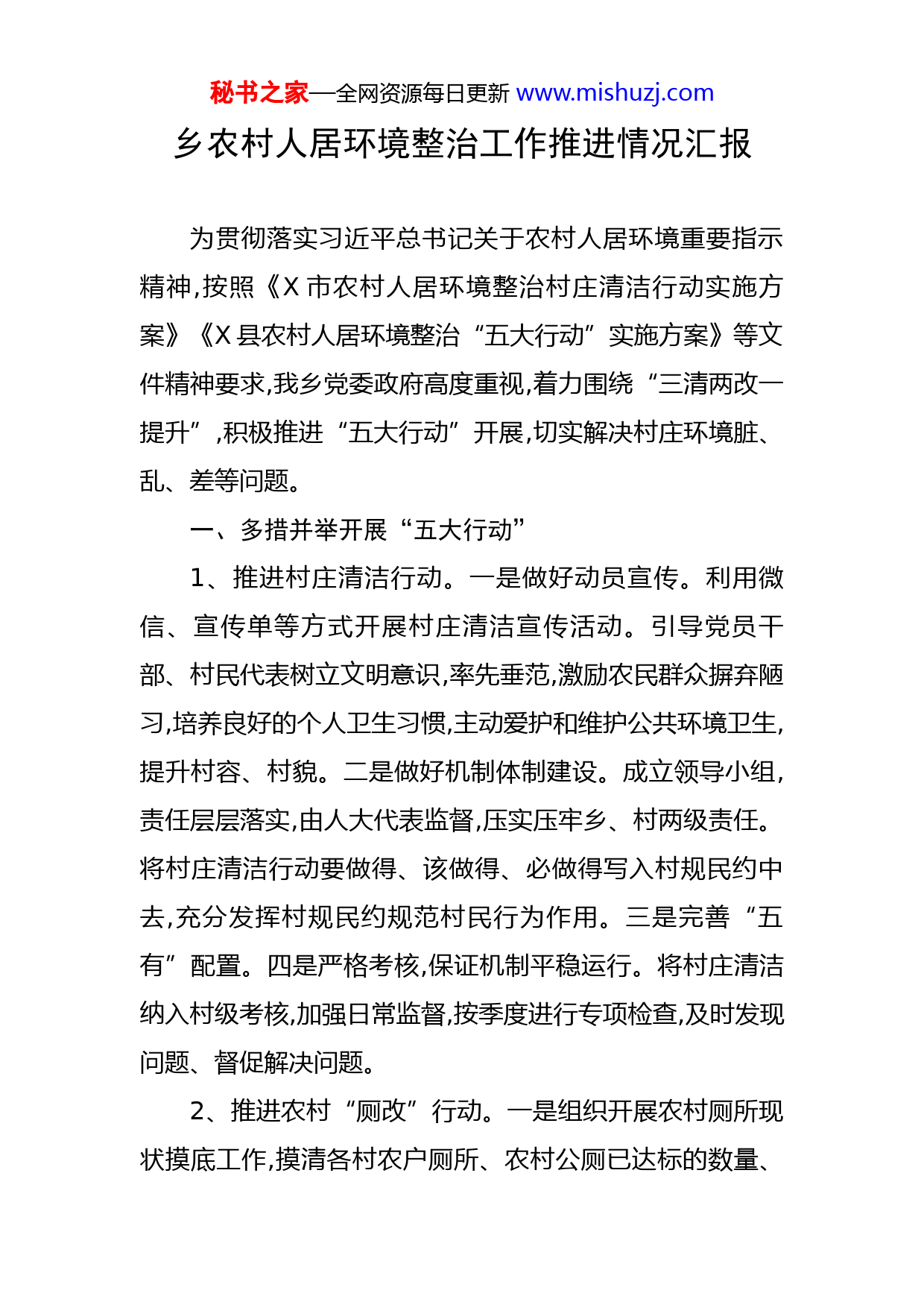秘书之家—全网资源每日更新www.mishuzj.com乡农村人居环境整治工作推进情况汇报为贯彻落实习近平总书记关于农村人居环境重要指示精神,按照《X市农村人居环境整治村庄清洁行动实施方案》《X县农村人居环境整治“五大行动”实施方案》等文件精神要求,我乡党委政府高度重视,着力围绕“三清两改一提升”,积极推进“五大行动”开展,切实解决村庄环境脏、乱、差等问题。一、多措并举开展“五大行动”1、推进村庄清洁行动。一是做好动员宣传。利用微信、宣传单等方式开展村庄清洁宣传活动。引导党员干部、村民代表树立文明意识,率先垂范,激励农民群众摒弃陋习,培养良好的个人卫生习惯,主动爱护和维护公共环境卫生,提升村容、村貌。二是做好机制体制建设。成立领导小组,责任层层落实,由人大代表监督,压实压牢乡、村两级责任。将村庄清洁行动要做得、该做得、必做得写入村规民约中去,充分发挥村规民约规范村民行为作用。三是完善“五有”配置。四是严格考核,保证机制平稳运行。将村庄清洁纳入村级考核,加强日常监督,按季度进行专项检查,及时发现问题、督促解决问题。2、推进农村“厕改”行动。一是组织开展农村厕所现状摸底工作,摸清各村农户厕所、农村公厕已达标的数量、秘书之家—全网资源每日更新www.mishuzj.com需改建和新建数量,建立台账,及时掌握农民改厕意愿。二是立足我乡实际,结合乡村振兴、脱贫攻坚、人居环境整治等规划,编制农村改厕方案和整村推进计划。三是充分发挥村组干部和农民群众的主体作用,建立厕所粪污贮存、收集、运输、处理体系,加强生活污水源头减量和尾水回收利用。四是大力宣传改厕的目的和意义,积极引导广大群众转变观念,摒弃陋习、崇尚现代文明的生活方式,大力营造人人热爱环境、人人维护环境、人人创造环境的良好氛围。3、推进垃圾治理行动。一是积极推广“高岗村模式”农村垃圾分类处理,进一步树立提升农村人居环境理念意识。二是加快推进“户分类、村收集、乡转运、县处理”垃圾处理方式。及时清运农村生活垃圾,引导群众做好垃圾分类工作,积极推广使用清洁能源和原料,加快实现农村生活垃圾源头减量。三是进一步完善“五有”配置,建立以财政资金投入为主、农民适当缴费、社会广泛参与的多元化资金投入机制。4、推进农村生活污水治理行动。一是乡成立农村厕所污水垃圾专项整治工作领导小组,推进农村厕所污水专项整治行动,明确分工。二是结合本乡实际,以分散处理为主,通过分户式、联户式办法,采用化粪池、沼气池等简易处理技术,实现就地生态处理。三是结合农村改厕工作,逐步全面采用水冲式厕所,推广使用技术稳定的化粪池等卫生厕所。秘书之家—全网资源每日更新www.mishuzj.com5、推进畜禽养殖废弃物资源化利用行动。一是结合我乡实际,在辖区内划定限养区域1个(场镇周边区域),与养殖大户签订了相关责任书、承诺书,积极开展污染源普查工作、专项治理工作。二是大力宣传禽粪污综合利用和病死畜禽无害化处理相关知识,鼓励粪肥还田利用,推进种养循环发展。二、工作成效1、推广“高岗村模式”农村垃圾处理模式。我乡除X村因滑坡灾害道路中断,其他村都已实现农村垃圾收运“户分类、村收集、乡转运、县处理”模式,五有机制更加完善。各村组按照辖区内户籍人口每人每月1元的标准逐户收取垃圾清运费,各村组指导、确定垃圾分类收集到指定地点,由专职清运人员按合同约定进行垃圾清运,环境卫生显著改善。2、通过,积极组织青年志愿者,在场镇及周边、学校开展“村庄清洁行动”宣传活动,转变生活方式,群众环境卫生保护意识明显提高。3、组织开展农村厕所现状摸底工作,摸清了农村户用厕所、农村公共厕所已达标的数量、需改建数量和新建数量,建立台账,并结合本乡实际,编制了我乡农村改厕方案和整村推进计划。同时,采用化粪池、沼气池等简易处理技术处理农村生活污水。目前,我乡已建有沼气池268口。秘书之家—全网资源每日更新www.mishuzj.com三、存在问题1、我乡地处偏远,农村人口居住分散,规划滞后,人居环境整治工作难度较大。2、设施设备还不够完善。3、群众对人居环境整治认识还不够深。四、下一步工作打算1、狠抓落实,持续开展人居环境整治“五大行动”。结合X乡实际,借鉴其他乡镇成功案例、经典经验做法,进一步贯彻实施人居环境整治村庄清洁行动、农村厕所革命、农村生活垃圾治理、农村生活污水治理和畜禽粪污资源化利用“五大行动”。2、加强设施建设,进一步完善“五有”配置。各村按照实际需求,配备相应的垃圾桶、垃圾箱等设施设备,确保农村垃圾源头分类。要保证清运费收缴不拖不拉,确保垃圾清扫、收集、清运正常运行。3、加强宣传,进一步营造人居环境整治工作氛围。采取各种方式,大力开展人居环境整治“五大行动”的宣传工作,让村民知晓基本要求,养成良好卫生习惯和行为方式,继续深入开展文明户等评选活动,激发村民清洁家园的积极性、主动性。强化学校作用,探索建立从学生到家长,倒逼不良生活习惯转变的方式。抓好标语宣传,在公路沿线、集镇村庄出入口、人口密集区域等地,根据周围环境设置公益宣传牌、秘书之家—全网资源每日更新www.mishuzj.com横幅标语,