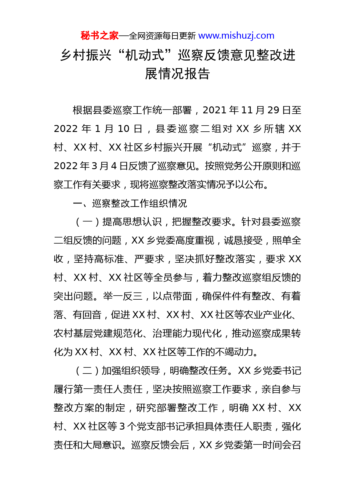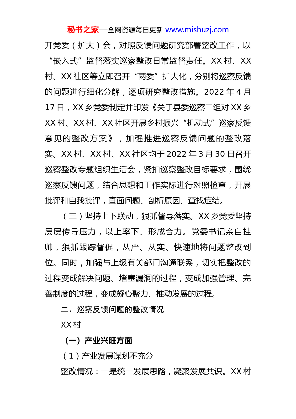 秘书之家—全网资源每日更新www.mishuzj.com乡村振兴“机动式”巡察反馈意见整改进展情况报告根据县委巡察工作统一部署,2021年11月29日至2022年1月10日,县委巡察二组对XX乡所辖XX村、XX村、XX社区乡村振兴开展“机动式”巡察,并于2022年3月4日反馈了巡察意见。按照党务公开原则和巡察工作有关要求,现将巡察整改落实情况予以公布。一、巡察整改工作组织情况(一)提高思想认识,把握整改要求。针对县委巡察二组反馈的问题,XX乡党委高度重视,诚恳接受,照单全收,坚持高标准、严要求,坚决抓好整改落实,要求XX村、XX村、XX社区等全员参与,着力整改巡察组反馈的突出问题。举一反三,以点带面,确保件件有整改、有着落、有回音,促进XX村、XX村、XX社区等农业产业化、农村基层党建规范化、治理能力现代化,推动巡察成果转化为XX村、XX村、XX社区等工作的不竭动力。(二)加强组织领导,明确整改任务。XX乡党委书记履行第一责任人责任,坚决按照巡察工作要求,亲自参与整改方案的制定,研究部署整改工作,明确XX村、XX村、XX社区等3个党支部书记承担具体责任人职责,强化责任和大局意识。巡察反馈会后,XX乡党委第一时间会召秘书之家—全网资源每日更新www.mishuzj.com开党委(扩大)会,对照反馈问题研究部署整改工作,以“嵌入式”监督落实巡察整改日常监督责任。XX村、XX村、XX社区等立即召开“两委”扩大化,分别将巡察反馈的问题进行细化分解,逐项研究整改措施。2022年4月17日,XX乡党委制定并印发《关于县委巡察二组对XX乡XX村、XX村、XX社区开展乡村振兴“机动式”巡察反馈意见的整改方案》,加强推进巡察反馈问题的整改落实。XX村、XX村、XX社区均于2022年3月30日召开巡察整改专题组织生活会,紧扣巡察整改目标要求,围绕巡察反馈问题,结合思想和工作实际进行对照检查,开展批评和自我批评,直面问题、剖析原因、查找症结。(三)坚持上下联动,狠抓督导落实。XX乡党委坚持层层传导压力,以上率下、形成合力。党委书记亲自挂帅,狠抓跟踪督促,从严、从实、快速地将问题整改到位。同时,加强与上级有关部门沟通联系,切实把整改的过程变成解决问题、堵塞漏洞的过程,变成加强管理、完善制度的过程,变成凝心聚力、推动发展的过程。二、巡察反馈问题的整改情况XX村(一)产业兴旺方面(1)产业发展谋划不充分整改情况:一是统一发展思路,凝聚发展共识。XX村秘书之家—全网资源每日更新www.mishuzj.com2022年3月21日召开村民代表大会,向村民推广新品种枇杷优势并介绍外立面整治、家风家训馆等项目实施的意义。二是弘扬XX村红色精神以及家风家训文化。以红色XX为主题,修缮红军联络点旧址并建成红军展览馆,目前已建设完工;以该村“天师公”信仰为载体,修建家风家训馆,已完成了设计和预算,预计7月份开工建设。三是依托枇杷产业开展特色乡村旅游。在3月底种植“三月白”“贵妃”等新品种枇杷枇杷1.2亩,120棵,以新品种枇杷延长枇杷季节周期,并已建成枇杷产业展示馆和枇杷交易市场,增加枇杷产业配套,宣传枇杷产业文化。在今年3-5月份,枇杷收购季节引进枇杷收购商户21家,游客1.6万人次,整村民宿接待游客0.7万人次,初步形成“枇杷产业+乡村旅游”模式,增强产业核心竞争力。(2)工程项目管理不到位整改情况:一是加快推进项目建设。2022年3月枇杷交易市场已公开向村民招租,并在枇杷季实现村财增收X万元;2022年度乡村振兴项目枇杷交易市场和研学基地布置配套项目已在设计预算当中。二是建立定期巡查机制。指定两委成员XX、XX、XX、XX等4人作为责任人,对相应的项目加强后期管护,定期开展检查整改,对枯死樱花、杂草、健身器材等进行维护复原、引导村民健身运动锻炼。三是对相关责任人进行处理。对时任XX乡XX村委秘书之家—全网资源每日更新www.mishuzj.com会主任XX给予诫勉谈话。(3)人才队伍严重匮乏整改情况:一是优化人才队伍结构。两委成员增加大学生XX,引导村干部参加函授春季大专班2人,目前大专学历3人,占比60%,强化两委人才队伍建设。二是完善产业配套吸引人才。加快推进枇杷交易批发市场及枇杷产业展示馆等产业配套项目,目前该项目已开工,待完工后可招商引资、吸引人才。三是加强支部共建服务产业发展。村党支部与县检察院开展党建联创,将党组织的带创能力提升到新的发展层次,有效为村民提供法律服务,保障产业发展,至今已开展党建活动及普法活动4次,取得良好的成效。四是力促能人返乡推动产业发展。村妇联主席、带头致富能人XX,通过电商、旅游、抖音带动我村产品销售,提升XX枇杷知名度。(二)生态宜居方面(4)人居环境整治还有提升空间整改情况:一是立行立改。针对裸房、旧房等问题,通过乡村振兴政策改变村庄面貌,XX村村内村容村貌环境整治项目已开工,对村内裸房、旧房等80处117间进行修缮、统一外立面改造,通过本项目将有效改善XX村人居环境,目前该已完成60%工程量,全村共拆除危旧房1900平方,清理小广告15处。二是加强人居环境整治宣秘书之家—全网资源每日更新www.mishuzj.com传。2022年3月份以来通过党员干部示范带头,开展进村入户宣讲,文明乡村、文明家庭创建活动,门前三包宣传,健康卫生知识普及等活动,强化对村民的教育和引导。三是完善长效保洁机制。划定“两委”责任片区,由“两委”干部带队