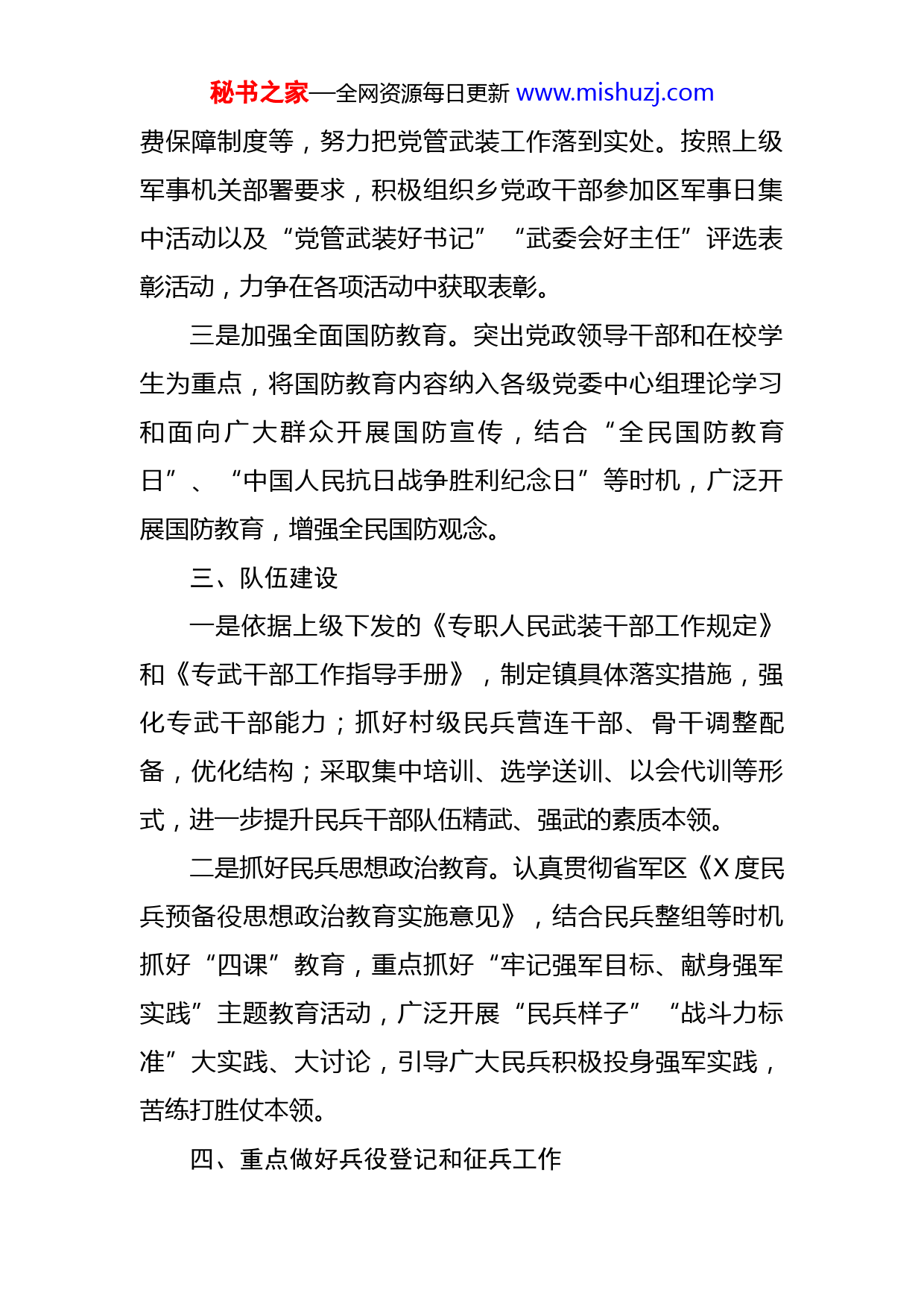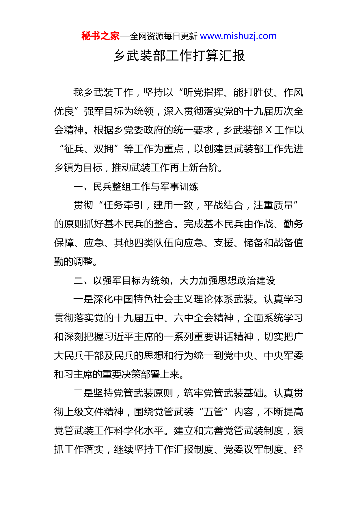 秘书之家—全网资源每日更新www.mishuzj.com乡武装部工作打算汇报我乡武装工作,坚持以“听党指挥、能打胜仗、作风优良”强军目标为统领,深入贯彻落实党的十九届历次全会精神。根据乡党委政府的统一要求,乡武装部X工作以“征兵、双拥”等工作为重点,以创建县武装部工作先进乡镇为目标,推动武装工作再上新台阶。一、民兵整组工作与军事训练贯彻“任务牵引,建用一致,平战结合,注重质量”的原则抓好基本民兵的整合。完成基本民兵由作战、勤务保障、应急、其他四类队伍向应急、支援、储备和战备值勤的调整。二、以强军目标为统领,大力加强思想政治建设一是深化中国特色社会主义理论体系武装。认真学习贯彻落实党的十九届五中、六中全会精神,全面系统学习和深刻把握习近平主席的一系列重要讲话精神,切实把广大民兵干部及民兵的思想和行为统一到党中央、中央军委和习主席的重要决策部署上来。二是坚持党管武装原则,筑牢党管武装基础。认真贯彻上级文件精神,围绕党管武装“五管”内容,不断提高党管武装工作科学化水平。建立和完善党管武装制度,狠抓工作落实,继续坚持工作汇报制度、党委议军制度、经秘书之家—全网资源每日更新www.mishuzj.com费保障制度等,努力把党管武装工作落到实处。按照上级军事机关部署要求,积极组织乡党政干部参加区军事日集中活动以及“党管武装好书记”“武委会好主任”评选表彰活动,力争在各项活动中获取表彰。三是加强全面国防教育。突出党政领导干部和在校学生为重点,将国防教育内容纳入各级党委中心组理论学习和面向广大群众开展国防宣传,结合“全民国防教育日”、“中国人民抗日战争胜利纪念日”等时机,广泛开展国防教育,增强全民国防观念。三、队伍建设一是依据上级下发的《专职人民武装干部工作规定》和《专武干部工作指导手册》,制定镇具体落实措施,强化专武干部能力;抓好村级民兵营连干部、骨干调整配备,优化结构;采取集中培训、选学送训、以会代训等形式,进一步提升民兵干部队伍精武、强武的素质本领。二是抓好民兵思想政治教育。认真贯彻省军区《X度民兵预备役思想政治教育实施意见》,结合民兵整组等时机抓好“四课”教育,重点抓好“牢记强军目标、献身强军实践”主题教育活动,广泛开展“民兵样子”“战斗力标准”大实践、大讨论,引导广大民兵积极投身强军实践,苦练打胜仗本领。四、重点做好兵役登记和征兵工作秘书之家—全网资源每日更新www.mishuzj.com为了做好每年两次征兵的工作,乡武装部春节前就春季征兵工作已要求各村(居)利用春节有利时期,做好对预征对象的摸底,掌握预征对象的基本情况,确保在征兵工作开始前,网上报名达到任务数。在征兵过程中要把好初审关,提高体检合格率,严把政审关,确保政治合格,为部队输送合格兵员。兵役登记是征兵工作的重要组成部分,要加大宣传力度,认真摸清全乡适龄青年政治、文化、身体和家庭情况,特别是要掌握高中以上文化适龄青年的情况,注重平时管理和教育,做到底数清、任务明,按照上级要求准确登记、按时上报,做到不重不漏,为完成年度征兵任务夯实基础。突出抓好征兵工作,今年我乡将在总结往年征兵经验的基础上,努力把好五个关键环节:一是征兵政策宣传关,开展宣传,积极营造舆论氛围。二是初检、初审关,开展乡初检、初审,杜绝不合格人员进站。三是送检和联审关,进行送检和政审、联审,确保进站体检人数达到上级要求,部门联审严格程序纪律。四是审批定兵关,党委集体定兵,坚持择优定兵等原则,不送“边缘兵”。五是跟踪服务关,做好落选人员的思想安抚和对被批准入伍新兵的慰问激励。总之,要确保完成上级下达的征兵任务,保证向部队输送优秀的兵员。五、“双拥”工作积极开展“双拥”活动,做好“双拥”工作宣传,落秘书之家—全网资源每日更新www.mishuzj.com实“双拥”政策。组织和发动民兵、预备役人员积极参加地方经济建设,深入开展“双带”活动,积极发展特色产业,着重培育民兵致富大户、“领头雁”,充分发挥他们在带头勤劳、科技致富和带动群众共同致富方面的先锋模范作用。做好防汛抗旱、森林防火、兴修水利、修桥筑路、抗灾抢险等急难险重任务准备及服务工作。镇武装部将根据镇党委、政府的统一部署,进一步完善组织民兵预备役人员参与的行动预案,建立健全民兵值班分队,做好支持险要地段的抢险准备。六、应急抢险、战备值班工作积极做好应急抢险和战备值班工作,乡武装部组织应急排30人的应急抢险分队,随时待命,做好应对自然灾害、重大事故、环境公害及人为破坏的应急管理、指挥和救援。全面组织民兵预备役人员积极参加地方经济建设。XX乡武装部将在县武装部和乡党委、政府的正确领导下,在各职能部门的支持和配合下,在全乡广大民兵连队和预备役官兵的支持下,一定能够圆满完成武装部的各项工作任务,为争创先进基层武装部而努力工作。