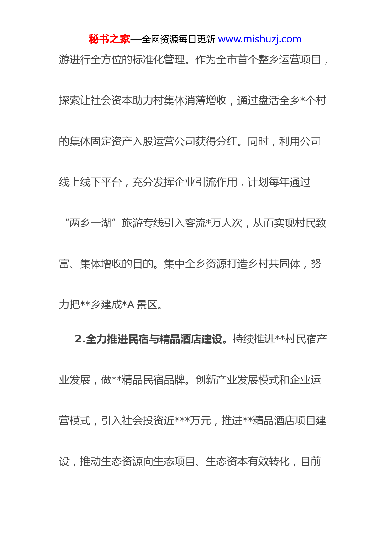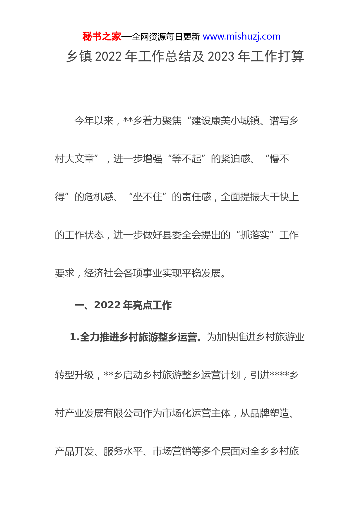 秘书之家—全网资源每日更新www.mishuzj.com乡镇2022年工作总结及2023年工作打算今年以来,乡着力聚焦“建设康美小城镇、谱写乡村大文章”,进一步增强“等不起”的紧迫感、“慢不得”的危机感、“坐不住”的责任感,全面提振大干快上的工作状态,进一步做好县委全会提出的“抓落实”工作要求,经济社会各项事业实现平稳发展。一、2022年亮点工作1.全力推进乡村旅游整乡运营。为加快推进乡村旅游业转型升级,乡启动乡村旅游整乡运营计划,引进乡村产业发展有限公司作为市场化运营主体,从品牌塑造、产品开发、服务水平、市场营销等多个层面对全乡乡村旅秘书之家—全网资源每日更新www.mishuzj.com游进行全方位的标准化管理。作为全市首个整乡运营项目,探索让社会资本助力村集体消薄增收,通过盘活全乡个村的集体固定资产入股运营公司获得分红。同时,利用公司线上线下平台,充分发挥企业引流作用,计划每年通过“两乡一湖”旅游专线引入客流万人次,从而实现村民致富、集体增收的目的。集中全乡资源打造乡村共同体,努力把乡建成A景区。2.全力推进民宿与精品酒店建设。持续推进村民宿产业发展,做精品民宿品牌。创新产业发展模式和企业运营模式,引入社会投资近万元,推进精品酒店项目建设,推动生态资源向生态项目、生态资本有效转化,目前秘书之家—全网资源每日更新www.mishuzj.com酒店主体建筑已完成,正在内部布置施工。该项目将在村打造一家高端精品酒店,配套功能将填补村民宿配套设施不足和营销服务欠缺的短板,与民宿产业实现共赢发展。3.全力推进未来乡村及数字乡村创建。乡村作为省市两级未来乡村和市级数字乡村试点创建村,始终秉持“微改造、精提升、广应用”的创建理念,通过“三化九场景”建设,打造未来教育、建筑、治理等特色场景,致力将原油脂化工厂改造而成的同学荟,打造成继小学后的第二网红打卡点。同时,通过数字赋能,实现游客“一码游”。目前,手绘小程序已开发完成正在测试,秘书之家—全网资源每日更新www.mishuzj.com至绿道、支队历史馆、红色文化提升等个项目已完工,村作为市级未来乡村和县级数字乡村,也在有序推进中。4.全力推进市级农村资源化利用示范乡镇创建。今年以来,乡践行低碳发展理念,以“生态处理+有机肥源+绿色种植”模式,将中水回用、污水处理终端废渣处置、易腐垃圾制肥等有机结合,形成一套完善的农村资源化再利用体系,在优化农村治污工作体系的同时,促进乡低零碳体系的发展。目前项目土建工程部分已完成%,设备采购安装已完成%,资源化再利用项目点位(垃圾中转站)已完成%。杭州市建委对乡创建农村资源化利用示范方秘书之家—全网资源每日更新www.mishuzj.com面的工作给予了充分肯定,计划在今年月份举行专题研讨会,明年月份举行全市的现场推进会。二、2023年计划推进的重点工作1.打造“茶源”经济。乡现有茶园余亩,2022年产茶吨,产值万元。清平源茶叶专业合作社打造的牌湖龙井茶,曾斩获中茶杯全国名优茶一等奖。乡将充分利用好新一轮联乡结村茶叶发展的政策资源,积极争取杭州市整乡镇推进山区农业产业项目,加快聚璧源连片良种茶园的规模发展和山坡常规茶园的规模经营,开发茶旅及茶研学项目,发展“茶源”经济。秘书之家—全网资源每日更新www.mishuzj.com2.打造“酒源”经济。在省社科联、省邮管局等帮扶单位的支持下,继续做好土烧酒产业培育。加快土烧酒厂融入市场步伐,尽快实现农产品向商品的转化,加快实现土烧酒从消薄增收产业向富民强村产业转化。同时,结合耕地“非农化”、“非粮化”专项整治,实施余亩荞麦、高粱、小麦等酿酒原材料种植,既为土烧酒提供本地原料,又为乡村旅游造景。加快英集团威士忌酒项目落地乡,全面启动“酒乡”精品源区打造,目前已完成初步规划方案编制。3.打造“乐源”经济。依托精品酒店,全面拓展市场渠道,按照整村运营计划,用好酒店前广场,约定每年酒秘书之家—全网资源每日更新www.mishuzj.com店举办活动不少于4次,以活动带动人气。将精品酒店与秘境、王子谷漂流、森林氧吧、狼行天下拓展基地等旅游产品相结合,打造深度融入休闲度假产品。村家民宿抱团发展,在旅游旺季互通有无,流转资源,由乡村旅游市场化运营公司成立民宿运营联合体,实现集体抱团共富,真正做到“生态优先、绿色发展,政府主导、市场主体,点面结合、先试先行,特色、利益共享”。4.推进湖城市东环线建设。湖城市东环线,即乡—镇连接线,是未来连接05、06省道,连接高铁新区和新城的便捷通道,也是东拓湖城市发展空间的地面通道。该线路按照省二级公路规划设计,全长.公里,其秘书之家—全网资源每日更新www.mishuzj.com中控制性工程横岭隧道全长米,总投资预算亿元。项目从年起列入政府投资计划预备项目,也是十四五规划实施项目。乡将全力配合县交投集团推进湖城市东环线项目建设,做好服务保障工作。5.加大总部经济招商力度。重点做好税源经济、总部经济招引,持续对接服务跟进好招商项目,为已签约企业做好各项服务工作,形成系统的招商企业研究讨论体系和全程代办制度。持续对接商会,促进商会健康发展,集聚富商生力军。继续开放招商,主动走出去引进来,排出明年外出招商计划,争取富商拜访全覆盖、项目