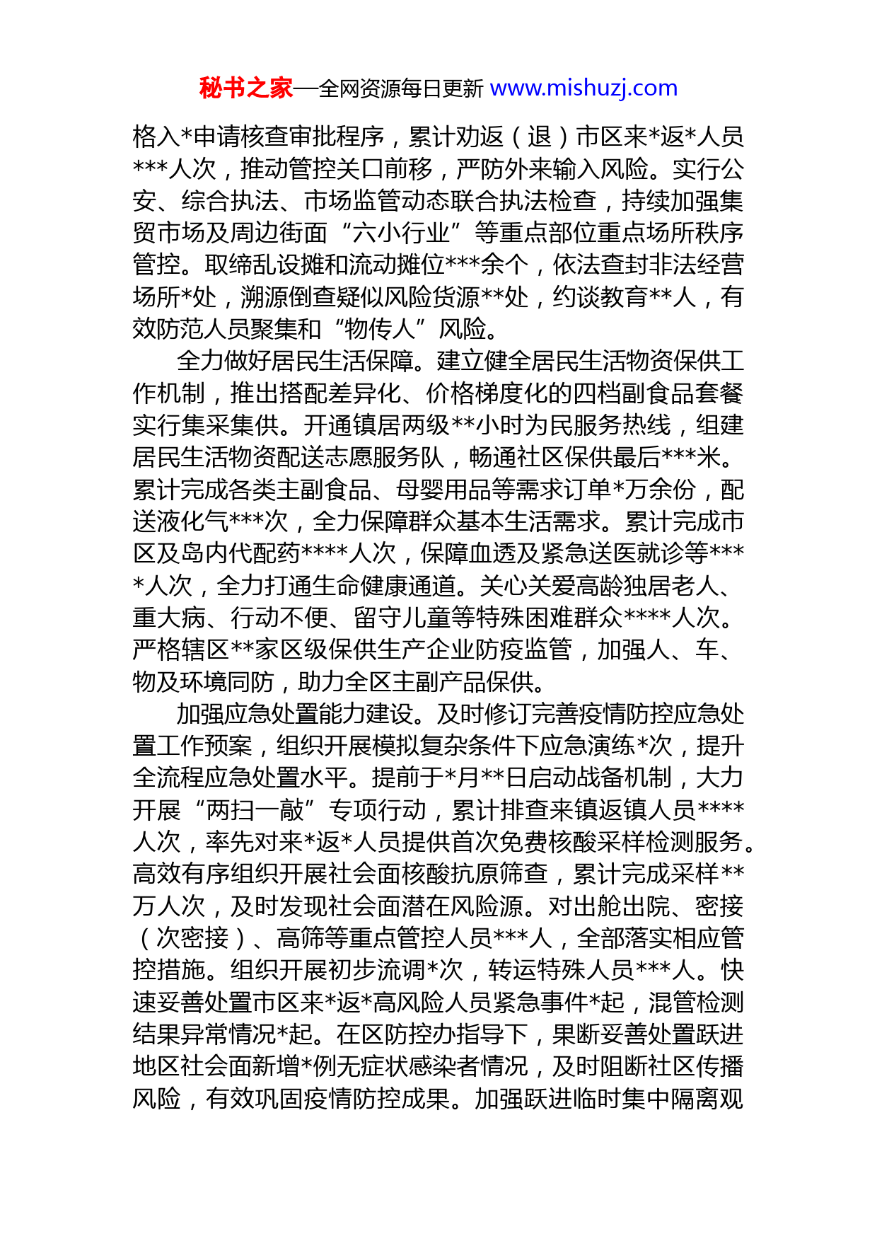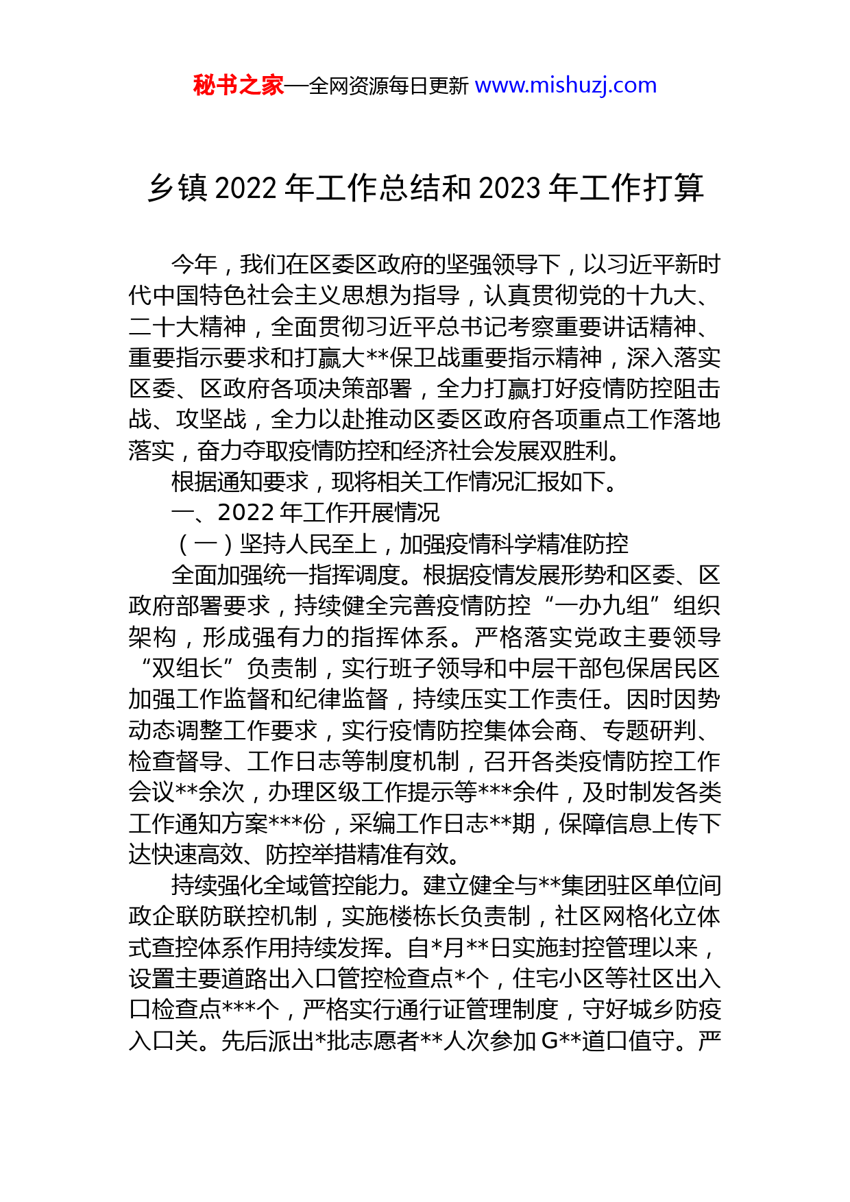 秘书之家—全网资源每日更新www.mishuzj.com乡镇2022年工作总结和2023年工作打算今年,我们在区委区政府的坚强领导下,以习近平新时代中国特色社会主义思想为指导,认真贯彻党的十九大、二十大精神,全面贯彻习近平总书记考察重要讲话精神、重要指示要求和打赢大保卫战重要指示精神,深入落实区委、区政府各项决策部署,全力打赢打好疫情防控阻击战、攻坚战,全力以赴推动区委区政府各项重点工作落地落实,奋力夺取疫情防控和经济社会发展双胜利。根据通知要求,现将相关工作情况汇报如下。一、2022年工作开展情况(一)坚持人民至上,加强疫情科学精准防控全面加强统一指挥调度。根据疫情发展形势和区委、区政府部署要求,持续健全完善疫情防控“一办九组”组织架构,形成强有力的指挥体系。严格落实党政主要领导“双组长”负责制,实行班子领导和中层干部包保居民区加强工作监督和纪律监督,持续压实工作责任。因时因势动态调整工作要求,实行疫情防控集体会商、专题研判、检查督导、工作日志等制度机制,召开各类疫情防控工作会议余次,办理区级工作提示等余件,及时制发各类工作通知方案份,采编工作日志期,保障信息上传下达快速高效、防控举措精准有效。持续强化全域管控能力。建立健全与集团驻区单位间政企联防联控机制,实施楼栋长负责制,社区网格化立体式查控体系作用持续发挥。自月日实施封控管理以来,设置主要道路出入口管控检查点个,住宅小区等社区出入口检查点个,严格实行通行证管理制度,守好城乡防疫入口关。先后派出批志愿者人次参加G道口值守。严秘书之家—全网资源每日更新www.mishuzj.com格入申请核查审批程序,累计劝返(退)市区来返人员人次,推动管控关口前移,严防外来输入风险。实行公安、综合执法、市场监管动态联合执法检查,持续加强集贸市场及周边街面“六小行业”等重点部位重点场所秩序管控。取缔乱设摊和流动摊位余个,依法查封非法经营场所处,溯源倒查疑似风险货源处,约谈教育人,有效防范人员聚集和“物传人”风险。全力做好居民生活保障。建立健全居民生活物资保供工作机制,推出搭配差异化、价格梯度化的四档副食品套餐实行集采集供。开通镇居两级小时为民服务热线,组建居民生活物资配送志愿服务队,畅通社区保供最后米。累计完成各类主副食品、母婴用品等需求订单万余份,配送液化气次,全力保障群众基本生活需求。累计完成市区及岛内代配药人次,保障血透及紧急送医就诊等人次,全力打通生命健康通道。关心关爱高龄独居老人、重大病、行动不便、留守儿童等特殊困难群众人次。严格辖区家区级保供生产企业防疫监管,加强人、车、物及环境同防,助力全区主副产品保供。加强应急处置能力建设。及时修订完善疫情防控应急处置工作预案,组织开展模拟复杂条件下应急演练次,提升全流程应急处置水平。提前于月日启动战备机制,大力开展“两扫一敲”专项行动,累计排查来镇返镇人员人次,率先对来返人员提供首次免费核酸采样检测服务。高效有序组织开展社会面核酸抗原筛查,累计完成采样万人次,及时发现社会面潜在风险源。对出舱出院、密接(次密接)、高筛等重点管控人员人,全部落实相应管控措施。组织开展初步流调次,转运特殊人员人。快速妥善处置市区来返高风险人员紧急事件起,混管检测结果异常情况起。在区防控办指导下,果断妥善处置跃进地区社会面新增例无症状感染者情况,及时阻断社区传播风险,有效巩固疫情防控成果。加强跃进临时集中隔离观秘书之家—全网资源每日更新www.mishuzj.com察点规范管理,设置房间个,累计安置人,现已关闭休整。规范收运医疗废物包、公斤。实行应急储备制度,科学储备各类防疫物资。严格落实常态化防控举措。严格落实防范区管控措施,深入开展环境清洁消杀等十大攻坚行动。与村等周边个兄弟乡镇组建“防范区”联盟,实行联防联控、证件互认月日,在全区率先与新村实行乡镇间有限放开。积极推进核酸采样点“彩虹亭”建设,设置常态化固定及便民采样点个,动态调整并延长开放时间,配备采样点辅助工作人员名。部署数字哨兵台,张贴场所码张,加强应用、管理和应急处置。全面加强宣传动员,上半年全镇岁及以上人群新接种人次,第一、二针覆盖率分别为%、%,积极构筑免疫屏障。严格落实疫情防控“一企一方案”,加强企业复工复产全流程监管服务,多措并举助力复工复产。全镇家规上企业率先实现全部复工复产,实体生产企业复工复产率%。制定落实有序恢复正常生产生活工作总体实施方案、菜场及六小行业放开专项方案,加快推动复商复市。农工商超市门店和个菜场较早实现全面开放,田原、果园作为全区第一批景区率先开放,各类“六小行业”沿街商铺门店应开尽开,烟火气加快回归。持续深入开展“防疫情、稳经济、保安全”大走访、大排查,严格落实商贸文旅、“六小行业”等重点行业领域重点人群防疫要求落实情况监督检查,压紧压实“四方责任”,不断筑牢疫情防火墙。大力推动经济社会发展重振。深入推进“防疫情、稳经济、保安全”大走访、大排查,持续加大援企惠企政策宣传,积极助企纾困,累计帮助企业申报房租减免万元,指导家企业成功获批“年区红榜企业”。及时协调解决农发