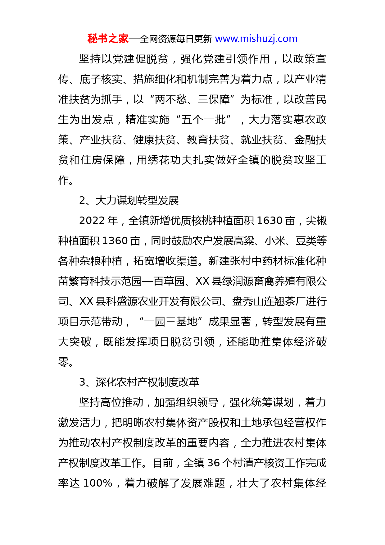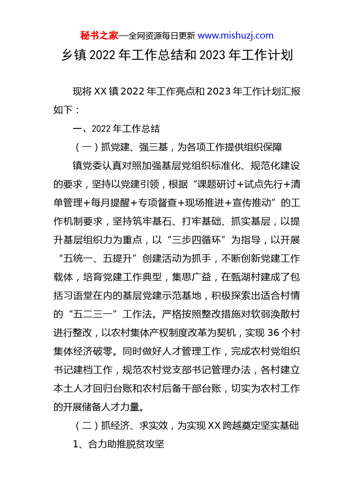 秘书之家—全网资源每日更新www.mishuzj.com乡镇2022年工作总结和2023年工作计划现将XX镇2022年工作亮点和2023年工作计划汇报如下:一、2022年工作总结(一)抓党建、强三基,为各项工作提供组织保障镇党委认真对照加强基层党组织标准化、规范化建设的要求,坚持以党建引领,根据“课题研讨+试点先行+清单管理+每月提醒+专项督查+现场推进+宣传推动”的工作机制要求,坚持筑牢基石、打牢基础、抓实基层,以提升基层组织力为重点,以“三步四循环”为指导,以开展“五统一、五提升”创建活动为抓手,不断创新党建工作载体,培育党建工作典型,集思广益,在甄湖村建成了包括习语堂在内的基层党建示范基地,积极探索出适合村情的“五二三一”工作法。严格按照整改措施对软弱涣散村进行整改,以农村集体产权制度改革为契机,实现36个村集体经济破零。同时做好人才管理工作,完成农村党组织书记建档工作,规范农村党支部书记管理办法,各村建立本土人才回归台账和农村后备干部台账,切实为农村工作的开展储备人才力量。(二)抓经济、求实效,为实现XX跨越奠定坚实基础1、合力助推脱贫攻坚秘书之家—全网资源每日更新www.mishuzj.com坚持以党建促脱贫,强化党建引领作用,以政策宣传、底子核实、措施细化和机制完善为着力点,以产业精准扶贫为抓手,以“两不愁、三保障”为标准,以改善民生为出发点,精准实施“五个一批”,大力落实惠农政策、产业扶贫、健康扶贫、教育扶贫、就业扶贫、金融扶贫和住房保障,用绣花功夫扎实做好全镇的脱贫攻坚工作。2、大力谋划转型发展2022年,全镇新增优质核桃种植面积1630亩,尖椒种植面积1360亩,同时鼓励农户发展高粱、小米、豆类等各种杂粮种植,拓宽增收渠道。新建张村中药材标准化种苗繁育科技示范园—百草园、XX县绿润源畜禽养殖有限公司、XX县科盛源农业开发有限公司、盘秀山连翘茶厂进行项目示范带动,“一园三基地”成果显著,转型发展有重大突破,既能发挥项目脱贫引领,还能助推集体经济破零。3、深化农村产权制度改革坚持高位推动,加强组织领导,强化统筹谋划,着力激发活力,把明晰农村集体资产股权和土地承包经营权作为推动农村产权制度改革的重要内容,全力推进农村集体产权制度改革工作。目前,全镇36个村清产核资工作完成率达100%,着力破解了发展难题,壮大了农村集体经秘书之家—全网资源每日更新www.mishuzj.com济。(三)抓安全、保稳定,为构建和谐社会创优条件1、奋力做好护林防火按照护林防火工作的新要求,成立护林防火指挥部,加大宣传力度,保证全镇28个瞭望哨24小时值守,并成立各村巡逻小分队进行重点监控,重点哨卡布控,确保护林防火抢险队及时扑救,做到政令畅通。2、致力平安法治建设我镇在综治工作方面致力于做到思想到位、领导到位、人员到位和责任到位。实行班子成员包片责任制,每月召开综治例会分析研究部署综治工作并反馈综治信息。成立社会治安综合治理委员会,建立社会服务管理中心,推动全镇服务管理措施的落实,确保全年非法上访和越级上访零发生。3、积极开展扫黑除恶对农村“两委”干部进行联合审查,并排查近五年的刑事、治安案件。全力做好“扫黑除恶”宣传工作,营造良好的社会治安氛围,发动广大群众积极监督和举报。及时组织各村支书主任进行扫黑除恶专项斗争履责督导谈话,压实责任,落实到人。4、认真排查非洲猪瘟加大宣传普及力度,严格按照“村不漏组、组不漏秘书之家—全网资源每日更新www.mishuzj.com户、户不漏畜、畜不漏针”的标准要求,重点排查“非洲猪瘟”,从源头上防范非洲猪瘟流入市场。进一步加强重大动物疫情应急管理,完善非洲猪瘟应急工作机制和应急处置方案,全力做好非洲猪瘟和其他病害防控工作。(四)抓民生、促改革,为实施乡村振兴夯实基础1、着力抓好环保工作我镇取缔散煤销售点六处,对辖区七座燃煤锅炉进行升级改造,在XX村实施清洁能源工程,安装生物质取暖锅炉209台。投资150万元新建XX沼气池,使生活垃圾得到有效处理和综合利用,推广清洁能源和无害化蔬菜种植。2、持续抓好乡村振兴综合运用督查考评机制,不间断开展环境卫生综合整治活动,建立环境卫生长效机制、完善基础设施建设,全面推行河长制、大力推进精神文明、实施乡村振兴战略。2022年顺利完成对市级文明村XX、XX和县级文明村XX、XX村的申报验收工作。3、民生工作有条不紊有效保障农村特困户、低保户、五保户、孤儿、优抚对象以及灾民困难群众的衣食住行医等基本生活。圆满完成优抚对象登记工作和复核任务。此外,我镇XX、XX、XX、XX四个日间照料中心均于今年投入使用,真正起到了惠及老年人的作用,切实增强了群众获得感和秘书之家—全网资源每日更新www.mishuzj.com幸福感。(五)抓廉政、强作风,为提升执政能力提供保障以作风建设永远在路上,以反腐倡廉无止境的高压态势全面抓实抓细抓好党风廉政建设,维护良好的政治生态。坚决执行中央八项规定,加强党员干部日常监督,规范权力运行,做到日常监管和案件查处“两手抓”、“两不误”。1、提高站位压实责任。在工作中严格按照“一岗双职”要求,始终做到“重要工作亲自部署、重大问题亲自过问、重点环节亲自协调、重要案件亲自督办”,将全镇党风廉政建设工作进行分解