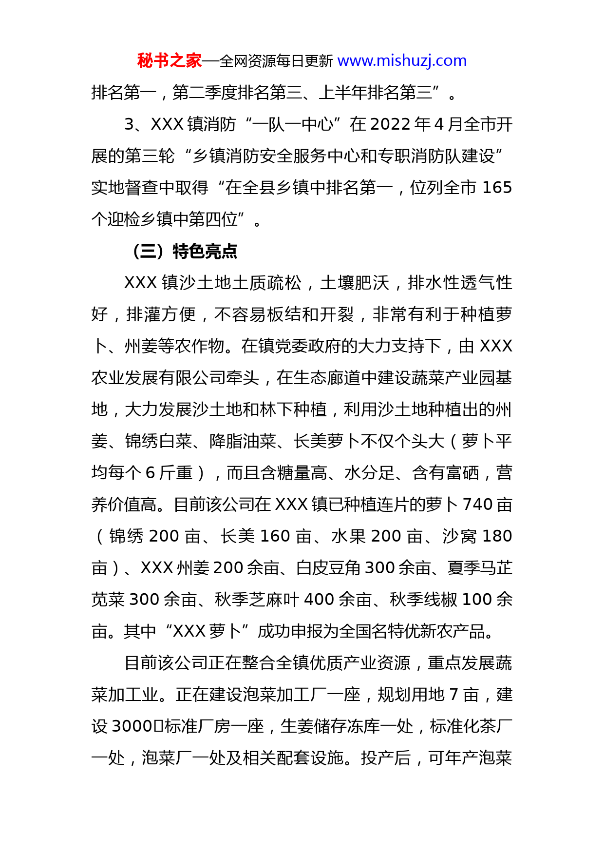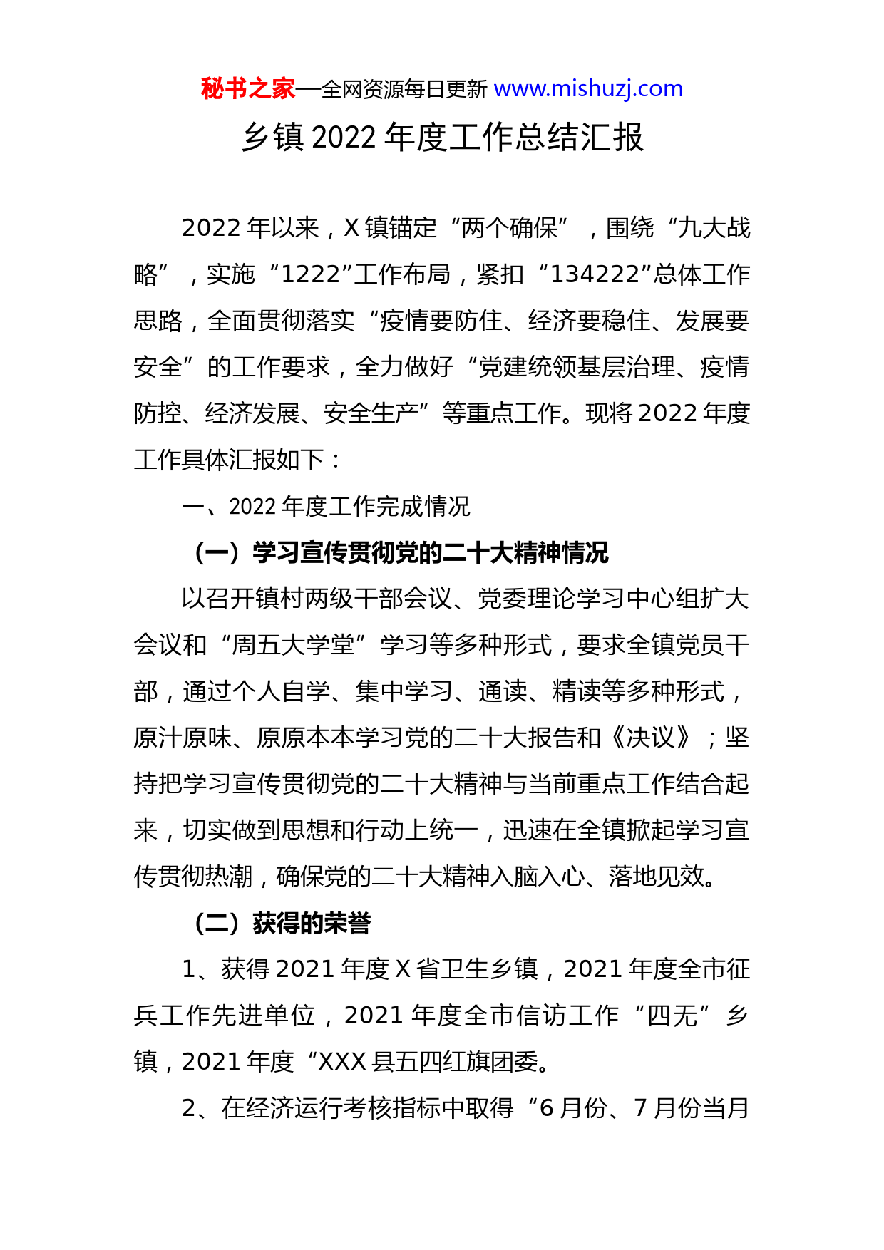 秘书之家—全网资源每日更新www.mishuzj.com乡镇2022年度工作总结汇报2022年以来,X镇锚定“两个确保”,围绕“九大战略”,实施“1222”工作布局,紧扣“134222”总体工作思路,全面贯彻落实“疫情要防住、经济要稳住、发展要安全”的工作要求,全力做好“党建统领基层治理、疫情防控、经济发展、安全生产”等重点工作。现将2022年度工作具体汇报如下:一、2022年度工作完成情况(一)学习宣传贯彻党的二十大精神情况以召开镇村两级干部会议、党委理论学习中心组扩大会议和“周五大学堂”学习等多种形式,要求全镇党员干部,通过个人自学、集中学习、通读、精读等多种形式,原汁原味、原原本本学习党的二十大报告和《决议》;坚持把学习宣传贯彻党的二十大精神与当前重点工作结合起来,切实做到思想和行动上统一,迅速在全镇掀起学习宣传贯彻热潮,确保党的二十大精神入脑入心、落地见效。(二)获得的荣誉1、获得2021年度X省卫生乡镇,2021年度全市征兵工作先进单位,2021年度全市信访工作“四无”乡镇,2021年度“XXX县五四红旗团委。2、在经济运行考核指标中取得“6月份、7月份当月秘书之家—全网资源每日更新www.mishuzj.com排名第一,第二季度排名第三、上半年排名第三”。3、XXX镇消防“一队一中心”在2022年4月全市开展的第三轮“乡镇消防安全服务中心和专职消防队建设”实地督查中取得“在全县乡镇中排名第一,位列全市165个迎检乡镇中第四位”。(三)特色亮点XXX镇沙土地土质疏松,土壤肥沃,排水性透气性好,排灌方便,不容易板结和开裂,非常有利于种植萝卜、州姜等农作物。在镇党委政府的大力支持下,由XXX农业发展有限公司牵头,在生态廊道中建设蔬菜产业园基地,大力发展沙土地和林下种植,利用沙土地种植出的州姜、锦绣白菜、降脂油菜、长美萝卜不仅个头大(萝卜平均每个6斤重),而且含糖量高、水分足、含有富硒,营养价值高。目前该公司在XXX镇已种植连片的萝卜740亩(锦绣200亩、长美160亩、水果200亩、沙窝180亩)、XXX州姜200余亩、白皮豆角300余亩、夏季马芷苋菜300余亩、秋季芝麻叶400余亩、秋季线椒100余亩。其中“XXX萝卜”成功申报为全国名特优新农产品。目前该公司正在整合全镇优质产业资源,重点发展蔬菜加工业。正在建设泡菜加工厂一座,规划用地7亩,建设3000㎡标准厂房一座,生姜储存冻库一处,标准化茶厂一处,泡菜厂一处及相关配套设施。投产后,可年产泡菜秘书之家—全网资源每日更新www.mishuzj.com及其他蔬菜500吨,加工成萝卜干、风干萝卜条、酱萝卜、腌制萝卜、腌制降脂腊菜等,加工出来的泡菜酸甜脆爽口,市场开发潜力大,是外销韩国、日本等地的紧俏农产品。年营业额可达1000万元,年利润可达600余万元,年纳税金额可达50余万元。该项目涉及土地流转300余人、劳务用工100余人、蔬菜种植户200余人,带动脱贫户30余户,人均收入每年可增加10000元以上。可有效带动本镇劳动力就业,提高收入水平。(四)活存量、拓增量,经济发展平稳向好一是聚焦镇域经济,发展活力不断释放。上半年,全镇生产总值XXXX万元;第三产业增加值XXX万元;粮食产量达XX万吨;乡镇规模以上工业生产总值完成XXX万元;社会消费品零售额达XXXX万元;固定资产投资完成XXXX万元;农民人均纯收入XXXX元。各项经济指标稳中有升,全镇经济大局稳定。二是紧盯项目建设,发展动力不断增强。树立“一二三产融合,农业产业化”新理念,大力开展招商引资,已成功签约4家招商企业,开工项目8个,谋划实施重大项目,成功申报XXX风电项目(预计投资3亿元)、灌渠治理XXX段(预计投资5000万元)。(五)优环境、抓巩固、乡村振兴开局良好紧紧围绕坚决守住不发生规模性返贫这条底线,严格秘书之家—全网资源每日更新www.mishuzj.com落实“四个不摘”要求。一是严格落实防返贫动态监测和帮扶机制。每月开展一次全镇范围内的大排查,对排查出的对象集中讨论、逐户分析,对应落实帮扶政策。截至目前,2022年新识别监测户XX户XX人,风险消除XX户XXX人,消除比例XX%。二是持续巩固“两不愁三保障”和饮水安全。2022年,全镇享受低保人员XXX人,特困供养人员XXX人,享受残疾人困难生活补贴XXX人、重度残疾人补贴XXX人,兜底保障XX人。脱贫人口小额信贷面签XXX人,已放款XX人,累计发放资金XX万元。(六)重建设、强管理,镇村面貌焕然一新一是集中精力“抓”重点,推动镇容镇貌全面提升。组织召开人居环境整治专项推进大会5次、现场观摩会6次、问题整改调度会8次及每周专题研判会。累计动员人数4000余人,出动工程机械800余次,清理拆除旱厕113座,拆除私搭乱建251处,拆除无人居住危房及残垣断壁121处,清除陈年垃圾、建筑垃圾1400余处,清淤绿化40处。二是谋划项目“推”进度,巩固村容村貌整治成果。扎实推进“首集道路基础设施”提质,积极筹措资金对首集政府路进行白改黑、下水道改造、路沿石铺设,施划机动车和非机动车位,极大美化绿化亮化街道人居环境;本着盘活、实用、美观的方针,对街道边角地、废弃地、闲置地块等进行改造升级,建设小而精、小而美、小秘书之家—全网资源每日更新www.mishuzj.com而特的“口袋公园”7处,湿地公园2处。(七)严管控、强监测、疫情防控有力有序全面落实常态化疫情防控措施,精准精细做好重点人员管控、重点场所监管、重点环节防范,抓好外来人员
