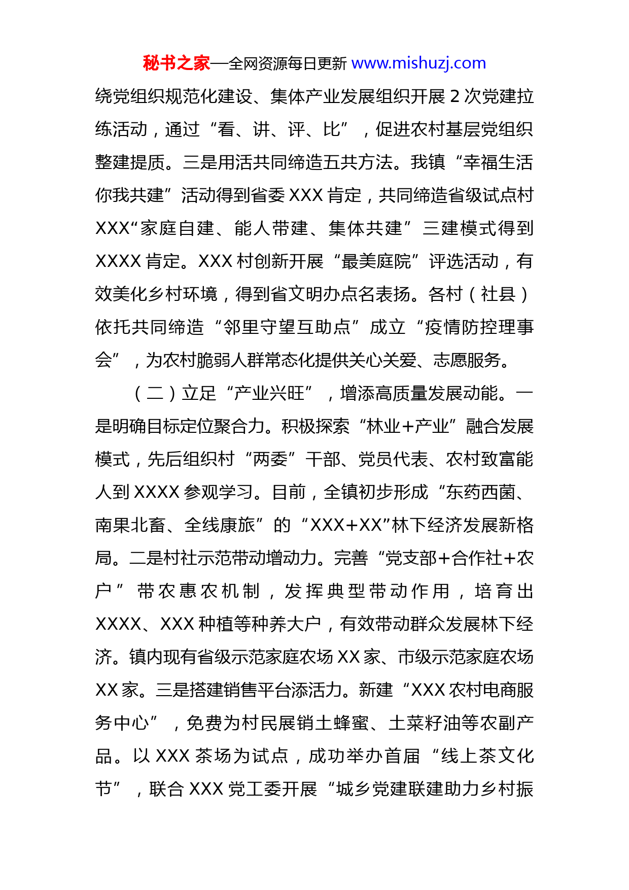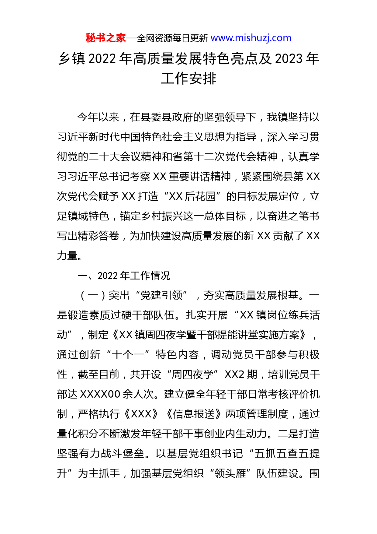 秘书之家—全网资源每日更新www.mishuzj.com乡镇2022年高质量发展特色亮点及2023年工作安排今年以来,在县委县政府的坚强领导下,我镇坚持以习近平新时代中国特色社会主义思想为指导,深入学习贯彻党的二十大会议精神和省第十二次党代会精神,认真学习习近平总书记考察XX重要讲话精神,紧紧围绕县第XX次党代会赋予XX打造“XX后花园”的目标发展定位,立足镇域特色,锚定乡村振兴这一总体目标,以奋进之笔书写出精彩答卷,为加快建设高质量发展的新XX贡献了XX力量。一、2022年工作情况(一)突出“党建引领”,夯实高质量发展根基。一是锻造素质过硬干部队伍。扎实开展“XX镇岗位练兵活动”,制定《XX镇周四夜学暨干部提能讲堂实施方案》,通过创新“十个一”特色内容,调动党员干部参与积极性,截至目前,共开设“周四夜学”XX2期,培训党员干部达XXXX00余人次。建立健全年轻干部日常考核评价机制,严格执行《XXX》《信息报送》两项管理制度,通过量化积分不断激发年轻干部干事创业内生动力。二是打造坚强有力战斗堡垒。以基层党组织书记“五抓五查五提升”为主抓手,加强基层党组织“领头雁”队伍建设。围秘书之家—全网资源每日更新www.mishuzj.com绕党组织规范化建设、集体产业发展组织开展2次党建拉练活动,通过“看、讲、评、比”,促进农村基层党组织整建提质。三是用活共同缔造五共方法。我镇“幸福生活你我共建”活动得到省委XXX肯定,共同缔造省级试点村XXX“家庭自建、能人带建、集体共建”三建模式得到XXXX肯定。XXX村创新开展“最美庭院”评选活动,有效美化乡村环境,得到省文明办点名表扬。各村(社县)依托共同缔造“邻里守望互助点”成立“疫情防控理事会”,为农村脆弱人群常态化提供关心关爱、志愿服务。(二)立足“产业兴旺”,增添高质量发展动能。一是明确目标定位聚合力。积极探索“林业+产业”融合发展模式,先后组织村“两委”干部、党员代表、农村致富能人到XXXX参观学习。目前,全镇初步形成“东药西菌、南果北畜、全线康旅”的“XXX+XX”林下经济发展新格局。二是村社示范带动增动力。完善“党支部+合作社+农户”带农惠农机制,发挥典型带动作用,培育出XXXX、XXX种植等种养大户,有效带动群众发展林下经济。镇内现有省级示范家庭农场XX家、市级示范家庭农场XX家。三是搭建销售平台添活力。新建“XXX农村电商服务中心”,免费为村民展销土蜂蜜、土菜籽油等农副产品。以XXX茶场为试点,成功举办首届“线上茶文化节”,联合XXX党工委开展“城乡党建联建助力乡村振秘书之家—全网资源每日更新www.mishuzj.com兴”抖音直播带货活动,“五一”期间吸引XXX万人次游客到XX休闲旅游,带动第三产业增收XX余万元。(三)围绕“生态保护”,擦亮高质量发展底色。一是创新“一长三员”护林制度。建立“林长+技术指导员+专职护林员+执法监管员”一长三员协同工作制度,与相邻县XX个村签订《林长联防联治协议》,开展联防联治、共巡共管活动2XX0余次,我镇林长制工作多次被国家、省级主流媒体宣传报道,连续XXX在林长制考核工作中位居第一。二是擦亮国字森林康养招牌。利用22万亩林地、XX湿地公园做好“森林+”文章,大力开发森林康养资源,XXX生态民宿集已完成前期规划。编制《XX镇森林康养产业建设规划》,今年XXXX月我镇成功入选全国全域森林康养试点建设镇。三是推进宜居乡村品质提升。坚持“农旅结合、以农促旅、以旅兴农”,用系统理念、全局思维深耕品质农业、特色文化、休闲旅游,完善XXX流域湿地观光写生游、XXXX森林自驾游、XXXX休闲采摘游XX条旅游线路。二、2023年工作谋划(一)目标定位全面贯彻落实党的二十大精神,积极融入XX打造现代产业发展先行县发展大局,持续擦亮党建引领基层社会治理品牌,以入选“XXXX镇”为契机,全力打造宜居宜业小秘书之家—全网资源每日更新www.mishuzj.com镇。(二)工作举措1.抓党建、促提升,在组织建设上精准发力。围绕党的二十大工作报告提出的“要增强党组织政治功能和组织功能,把基层党组织建设成为有效实现党的领导的坚强战斗堡垒”。我们将从三个方面着力提升基层党建水平,推动基层党组织全面进步、全面过硬。一是立根铸魂抓理论武装。积极动员驻村第一书记、党小组长当好党的二十大精神“宣讲员”,采取“微党课”“村组纳凉”“围炉夜话”等形式,在全镇掀起学习贯彻党的二十大精神热潮,让党的二十大精神在每一个基层党组织、每一名党员心中落地生根。二是强筋壮骨抓干部队伍。以“岗位练兵活动”为契机,持续拓展“周四夜学”内容,将室内课堂延伸为课外实践,切实提高年轻干部群众工作能力。组织开展好知识竞赛、演讲比赛、履职测试等活动,建立班子成员与年轻干部“一对一”传帮带制度,让年轻干部在疫情防控一线、应急处突一线、防汛抗旱一线快速成长。三是夯基固本抓基层组织。持续开展好双月党建拉练活动,通过“看、讲、比、评”促进基层党组织整建提质。定期组织村党支部书记外出参观学习先进经验。不断加强清廉村居建设,争创一个省级“清廉村居”示范村。2.抓产业、促共富,在乡村振兴上精准发力。围绕党的秘书之家—全网资源每日更新www.mishuzj.com二十大工作报告提出的“要全面推进乡村振兴,发展乡村特