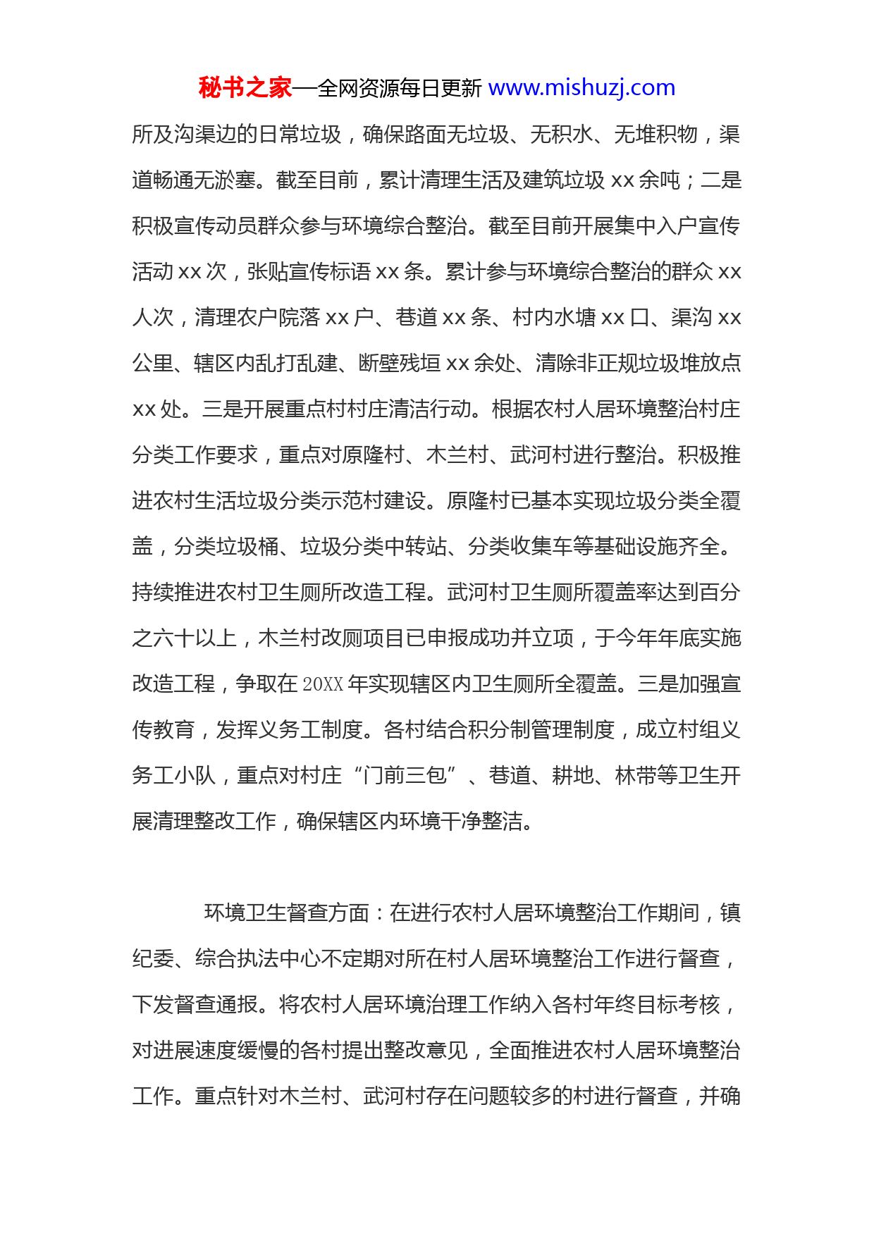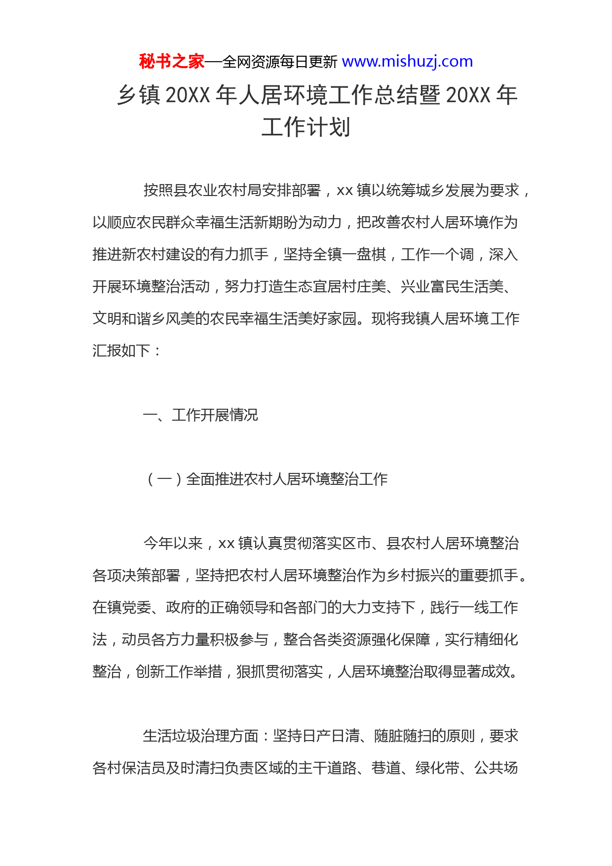 秘书之家—全网资源每日更新www.mishuzj.com乡镇20XX年人居环境工作总结暨20XX年工作计划按照县农业农村局安排部署,xx镇以统筹城乡发展为要求,以顺应农民群众幸福生活新期盼为动力,把改善农村人居环境作为推进新农村建设的有力抓手,坚持全镇一盘棋,工作一个调,深入开展环境整治活动,努力打造生态宜居村庄美、兴业富民生活美、文明和谐乡风美的农民幸福生活美好家园。现将我镇人居环境工作汇报如下:一、工作开展情况(一)全面推进农村人居环境整治工作今年以来,xx镇认真贯彻落实区市、县农村人居环境整治各项决策部署,坚持把农村人居环境整治作为乡村振兴的重要抓手。在镇党委、政府的正确领导和各部门的大力支持下,践行一线工作法,动员各方力量积极参与,整合各类资源强化保障,实行精细化整治,创新工作举措,狠抓贯彻落实,人居环境整治取得显著成效。生活垃圾治理方面:坚持日产日清、随脏随扫的原则,要求各村保洁员及时清扫负责区域的主干道路、巷道、绿化带、公共场秘书之家—全网资源每日更新www.mishuzj.com所及沟渠边的日常垃圾,确保路面无垃圾、无积水、无堆积物,渠道畅通无淤塞。截至目前,累计清理生活及建筑垃圾xx余吨;二是积极宣传动员群众参与环境综合整治。截至目前开展集中入户宣传活动xx次,张贴宣传标语xx条。累计参与环境综合整治的群众xx人次,清理农户院落xx户、巷道xx条、村内水塘xx口、渠沟xx公里、辖区内乱打乱建、断壁残垣xx余处、清除非正规垃圾堆放点xx处。三是开展重点村村庄清洁行动。根据农村人居环境整治村庄分类工作要求,重点对原隆村、木兰村、武河村进行整治。积极推进农村生活垃圾分类示范村建设。原隆村已基本实现垃圾分类全覆盖,分类垃圾桶、垃圾分类中转站、分类收集车等基础设施齐全。持续推进农村卫生厕所改造工程。武河村卫生厕所覆盖率达到百分之六十以上,木兰村改厕项目已申报成功并立项,于今年年底实施改造工程,争取在20XX年实现辖区内卫生厕所全覆盖。三是加强宣传教育,发挥义务工制度。各村结合积分制管理制度,成立村组义务工小队,重点对村庄“门前三包”、巷道、耕地、林带等卫生开展清理整改工作,确保辖区内环境干净整洁。环境卫生督查方面:在进行农村人居环境整治工作期间,镇纪委、综合执法中心不定期对所在村人居环境整治工作进行督查,下发督查通报。将农村人居环境治理工作纳入各村年终目标考核,对进展速度缓慢的各村提出整改意见,全面推进农村人居环境整治工作。重点针对木兰村、武河村存在问题较多的村进行督查,并确秘书之家—全网资源每日更新www.mishuzj.com保各村“照单接收”,及时整改;针对垃圾治理难点,集中力量对症下药,有效消除垃圾“顽疾”,严格落实整改,确保辖区内环境卫生。(二)加强农村污染防治工作散煤治理方面:按照“生态宜居、乡风文明、治理有效、生活富裕”的乡村振兴战略总要求,统筹城乡发展,以建设魅力乡村为目标,以治理农村生活垃圾和村容村貌提升为主攻方向,以改变村民卫生习惯、加强乡风文明建设为切入口,加快补齐我镇农村人居环境治理短板,集中时间、集中力量,全面解决镇区域散煤大气污染问题,进一步改善大气质量,着力改善生态环境,全面提升生活水平和生态治理,推动农村人居环境整治工作向前向稳发展。经镇党委、政府研究决定,在xx镇深化开展散煤整治工作,我镇综合执法办公室联合镇市场监督管理局,派出所以及县综合执法大队xx中队共计20人,对散煤进行集中整治,对无相关证件的散煤进行取缔,对有相关证件的散煤搬到集中售煤中心。大气扬尘防控方面:安排特定人员每天早午2次对辖区内主干道路、各支路及公共场所进行洒水降尘;对施工现场制定清扫、洒水制度,配备洒水设备,并派专人负责洒水与清扫作业。遇四级秘书之家—全网资源每日更新www.mishuzj.com以上大风天气督促辖区内产生扬尘的土方作业禁止施工,绿网遮盖砂石、建筑工地等,土方铲、运、卸等环节设专人洒水降尘。(三)进一步强化城乡管理监管工作占道经营整治方面:镇城管队执法人员联合县综合执法队xx中队每天不定时对镇区莆西街、福宁街、团结路等多处占道经营常发点进行动态巡查,对车站、学校周围、小区门口等人员密集处流动摊点进行巡回清理;对市场、小区门口乱摆摊点、主街道、201省道店面占道经营进行常态化、规范化管理,共清理违规占道经营摊位580余次,经常性清理墙面、电线杆上的乱贴、乱写、乱画,发现一处清理一处,共整治违法小广告600余处;由于店外占道经营问题时有发生,镇城管执法人员和县综合执法队xx中队每天巡回清理,并长期坚持。乱停乱放整治方面:城管执法人员联合xx派出所交警中队对福宁路和莆西路交叉口、市场门口、卫生院西侧、学校周围等道路的占用人行道,乱停乱放问题进行整治,重点保障道路交通畅通与群众出行安全;同时开展自查,对团结路、201省道工程车辆进行整治,在永福新村空旷处设置临时停车点,统一停放。城管队执法人员联合xx派出所交警中队在镇区内福宁街与莆西路、武河村街道划停车位,规范停车。截至目前,清理辖区内街道乱停乱放车辆秘书之家—全网资源每日更新www.mishuzj.com200余次,联合交警队划停车位500余个,安装90秒违停监测监控4个,