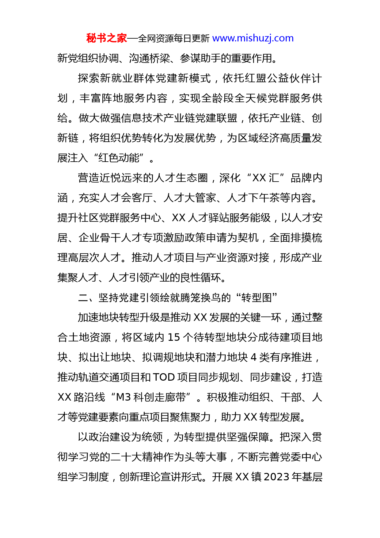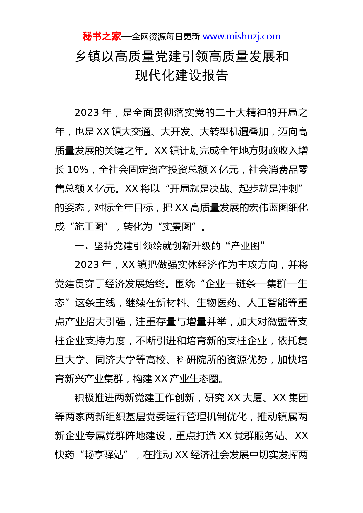 秘书之家—全网资源每日更新www.mishuzj.com乡镇以高质量党建引领高质量发展和现代化建设报告2023年,是全面贯彻落实党的二十大精神的开局之年,也是XX镇大交通、大开发、大转型机遇叠加,迈向高质量发展的关键之年。XX镇计划完成全年地方财政收入增长10%,全社会固定资产投资总额X亿元,社会消费品零售总额X亿元。XX将以“开局就是决战、起步就是冲刺”的姿态,对标全年目标,把XX高质量发展的宏伟蓝图细化成“施工图”,转化为“实景图”。一、坚持党建引领绘就创新升级的“产业图”2023年,XX镇把做强实体经济作为主攻方向,并将党建贯穿于经济发展始终。围绕“企业—链条—集群—生态”这条主线,继续在新材料、生物医药、人工智能等重点产业招大引强,注重存量与增量并举,加大对微盟等支柱企业支持力度,不断引进和培育新的支柱企业,依托复旦大学、同济大学等高校、科研院所的资源优势,加快培育新兴产业集群,构建XX产业生态圈。积极推进两新党建工作创新,研究XX大厦、XX集团等两家两新组织基层党委运行管理机制优化,推动镇属两新企业专属党群阵地建设,重点打造XX党群服务站、XX快药“畅享驿站”,在推动XX经济社会发展中切实发挥两秘书之家—全网资源每日更新www.mishuzj.com新党组织协调、沟通桥梁、参谋助手的重要作用。探索新就业群体党建新模式,依托红盟公益伙伴计划,丰富阵地服务内容,实现全龄段全天候党群服务供给。做大做强信息技术产业链党建联盟,依托产业链、创新链,将组织优势转化为发展优势,为区域经济高质量发展注入“红色动能”。营造近悦远来的人才生态圈,深化“XX汇”品牌内涵,充实人才会客厅、人才大管家、人才下午茶等内容。提升社区党群服务中心、XX人才驿站服务能级,以人才安居、企业骨干人才专项激励政策申请为契机,全面排摸梳理高层次人才。推动人才项目与产业资源对接,形成产业集聚人才、人才引领产业的良性循环。二、坚持党建引领绘就腾笼换鸟的“转型图”加速地块转型升级是推动XX发展的关键一环,通过整合土地资源,将区域内15个待转型地块分成待建项目地块、拟出让地块、拟调规地块和潜力地块4类有序推进,推动轨道交通项目和TOD项目同步规划、同步建设,打造XX路沿线“M3科创走廊带”。积极推动组织、干部、人才等党建要素向重点项目聚焦聚力,助力XX转型发展。以政治建设为统领,为转型提供坚强保障。把深入贯彻学习党的二十大精神作为头等大事,不断完善党委中心组学习制度,创新理论宣讲形式。开展XX镇2023年基层秘书之家—全网资源每日更新www.mishuzj.com党政负责干部政治能力建设专题班,系统性提高党员干部用党的理论武装头脑、指导实践、推动工作的能力。以重点项目为导向,深度释放党建效能。强化党组织对重点项目的引领作用,以党建为抓手推动项目建设,党员干部带头分包最重的项目,带头深入项目一线,带头解决项目难题,攻坚克难,有序推进XX生命科技园、XX创园三期、XX总部、XX产投、XX集成电路产业园等一批项目加速建设落地。以干部建设为牵引,提升转型升级推进力。开展中青年后备干部实践锻炼计划,推动干部跨部门挂职或参与重点工作,把能否推动项目落地见效作为检验干部能力的“试金石”。持续扩大年轻干部增量,引导干部在急难险重岗位提升素能、历练成长,打造一支懂产业发展、懂项目建设、懂招商引资的转型发展队伍。三、坚持党建引领绘就群众满意的“民生图”党的二十大报告中强调,必须坚持在发展中保障和改善民生,鼓励共同奋斗创造美好生活,不断实现人民对美好生活的向往。XX始终践行人民至上,持续落实好政府年度十大民生实事项目,从就业、为老、医疗等方面落实好民生保障措施,以结对共治、基层治理“六大计划”等为抓手,构建共建共治共享社会治理新格局。深化镇基层治理特色品牌。提炼“XX家”党建引领基秘书之家—全网资源每日更新www.mishuzj.com层治理特色品牌内涵,深入打造市级美好社区。以需求为导向,形成“党建+公共文化服务”“党建+人才公寓”等特色治理样板。启动党建引领社区治理主理人项目,借助社区治理学院和社会组织等资源,引入专业团队推进基层治理。从党群阵地建设、活力楼组打造、三驾马车等方面为切入点,破解社区治理的痛点难点。丰富服务阵地体系功能。突出服务升级资源整合,完善党群服务中心功能体系建设。打造十五分钟党群服务圈,继续挖掘盘活镇内闲置空间,推进长一淞益空间等社区党群服务阵地建设。用好“三张清单”及“XX空间”小程序,形成线上点单、线下配送的党群服务配送模式。加快建设XX“红色陶瓷”主题展览馆和陶瓷文化公园。强化党建引领多元共治。深化微网格党组织运作,发挥党建引领社区多元共治优势,畅通党员群众意见表达渠道。推动结对共治项目提质增效,制定项目清单,定期督导项目进度。加强“红色物业”建设,组织居民有序参与社区工作,充分发挥居民公约等规范作用,进一步提升党建引领基层治理效能。千川汇海阔,风好正扬帆。2023年,XX镇继续在区委、区政府的坚强领导下,深入贯彻落实党的二十大精神,持续将党建优势转化为发展优势,党建成果转化为发展成果,加快推进“XX科创中心主阵地”主战场建设,助秘书之家—全网资源每日更新w