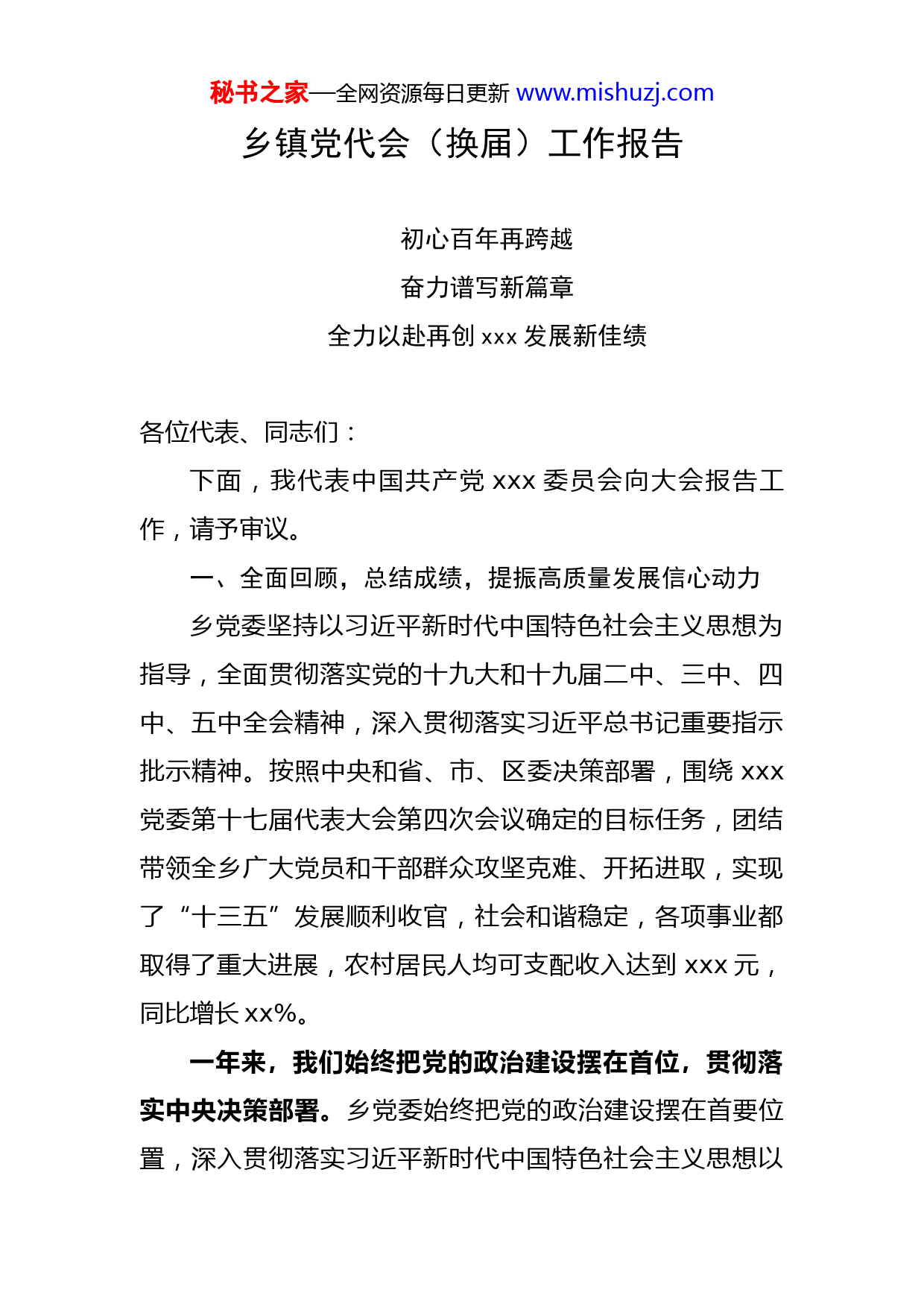秘书之家—全网资源每日更新www.mishuzj.com乡镇党代会(换届)工作报告初心百年再跨越奋力谱写新篇章全力以赴再创xxx发展新佳绩各位代表、同志们:下面,我代表中国共产党xxx委员会向大会报告工作,请予审议。一、全面回顾,总结成绩,提振高质量发展信心动力乡党委坚持以习近平新时代中国特色社会主义思想为指导,全面贯彻落实党的十九大和十九届二中、三中、四中、五中全会精神,深入贯彻落实习近平总书记重要指示批示精神。按照中央和省、市、区委决策部署,围绕xxx党委第十七届代表大会第四次会议确定的目标任务,团结带领全乡广大党员和干部群众攻坚克难、开拓进取,实现了“十三五”发展顺利收官,社会和谐稳定,各项事业都取得了重大进展,农村居民人均可支配收入达到xxx元,同比增长xx%。一年来,我们始终把党的政治建设摆在首位,贯彻落实中央决策部署。乡党委始终把党的政治建设摆在首要位置,深入贯彻落实习近平新时代中国特色社会主义思想以秘书之家—全网资源每日更新www.mishuzj.com及总书记指示批示精神,及时学习总书记最新重要讲话精神,增强“四个意识”、坚定“四个自信”、做到“两个维护”。巩固“不忘初心牢记使命”主题教育成果,持续推进xx个问题整治整改并全部销号,中央巡视组、省委巡视组年度整改任务全部完成,区委巡察发现的xx个问题,全面梳理并落实整改完毕。深入学习十九届五中全会和省委xxx全会、市委xx全会精神、区委xx全会精神,确保各项工作目标任务、工作措施落实到位。一年来,我们坚持人民至上、生命至上,凝聚起疫情防控强大合力。乡党委始终把疫情防控作为头等大事来抓,全面加强对疫情防控的领导,第一时间成立了新冠肺炎疫情工作领导小组并设立指挥部,全面压实落靠“四方责任”。乡机关干部、村“两委”成员和志愿者全部下沉基层服务一线,广大群众主动参与、全力配合,全乡上下联防联控、群防群治,凝聚起同舟共济、齐心战疫的庞大力量。坚决打好“外防输入、内防反弹”硬仗,落实“四早”和“十严”要求,用好“防疫三宝”,严控重点场所、重点人群,坚决守住“四道门”,全面落实“手递手”闭环管控,持续推进地毯式深度排查,确保不漏一户、不落一人。始终保持“零病例”成果,守住了“零感染、零疑似、零确诊”的底线。一年来,我们全力推动高质量发展,农业农村经济发秘书之家—全网资源每日更新www.mishuzj.com展水平稳步提升。乡党委主动应对疫情冲击,全力抓好农业生产,发展优质高效生态农业。xx村“棚室”种植蔬菜年产xx余吨,年产xx万余吨。推进xx村为主体的优质米基地建设,带动村民加入到水稻种子繁育项目,鼓励村民与水稻研究所签订合约xxx亩。落实水稻和玉米减肥、减药、减除草剂“三减”面积xxx余亩。稳定畜牧业生产安全。畜牧站通过春秋两季集中免疫和平时补免相结合,禽畜免疫率达到xxx%以上,全年实施产地检疫生猪xxx头、牛xx头、羊xxx只,定期进行“瘦肉精检测,确保畜牧业生产质量安全”。农机站为农机户检证、检修机车xxx台套,安装大型农机作业监测仪xx台,办理农机补贴xx台,发放补贴xx万元。大力推进“清化收”工作,清理违规合同xx份,化解债务xxx万元,新增地源面积xxx亩、收费xxx万元。大力发展村集体经济,xx村xxx项目为村集体年增收xx万元,相关经验被编入《xxx市发展壮大村集体经济案例选编》。一年来,我们固底板补弱项,打好决胜全面小康三大攻坚战。为彻底巩固脱贫成果,建立长线帮扶巩固机制,制订了《xxx返贫检测工作方案》,切实做到了“四个不摘”。通过公益性岗位、种养植产业、小额贷款等方式,实现了产业经营性收入、务工就业工资性收入提高,依靠秘书之家—全网资源每日更新www.mishuzj.com政策转移性收入相对减少,内生动力不断得到激发。乡建档立卡户人均收入逐年提升,2020年建档立卡户人均收入达到xx万元,近三年保持增长xx%以上。扶贫领域问题和整改全部销号清零,防止返贫机制和帮扶机制全面落实,高质量通过了省、市、区验收。全面提升防范化解重大风险的能力,面对x次台风叠加影响和xxx干流百年一遇汛情严峻考验,乡党委沉着应对,凝聚全乡力量,汇聚全民汗水,迎难而上,全力保障人民群众生产生活安全。认真履行环境保护主体责任,开展污染防治攻坚“百日会战”,推行河流治理“河长制”,重点开展整治河道“四乱”工作,清理乱占xx处,面积近x万平方米,清理河道障碍xxx亩,小开荒xx个,河道环境得到全面治理。始终保持秸秆禁烧“零火点”,秸秆综合利用率达到xxx%。一年来,我们深入推进乡村建设,人居环境有效改善。按照区委、区政府关于人居环境整治工作和《xx区创建美丽宜居乡村示范工程行动方案》任务要求,对照“十有十化六无”的美丽乡村建设标准,落实“四清一改一绿”工作任务,创建美丽宜居示范村x个,美丽庭院xx户。积极开展环境综合整治,全乡共清运垃圾xxx立方米,清理庭院xxx户、清理乱堆乱放柴草垛等xxx处、拆除断壁残垣、私搭乱建xxx处,新增农机停放点x个,清理路边沟xxx延长米,种植绿化树木xxx棵,村内周边卫秘书之家—全网资源每日更新www.mishuzj.com生环境得到有效改善。对xxx村安装净水设备xx套,对xxx等6个村的水源地进行了修缮,规范了水源地保护制度,实现全乡水质检测合格率、自来水入户率达到