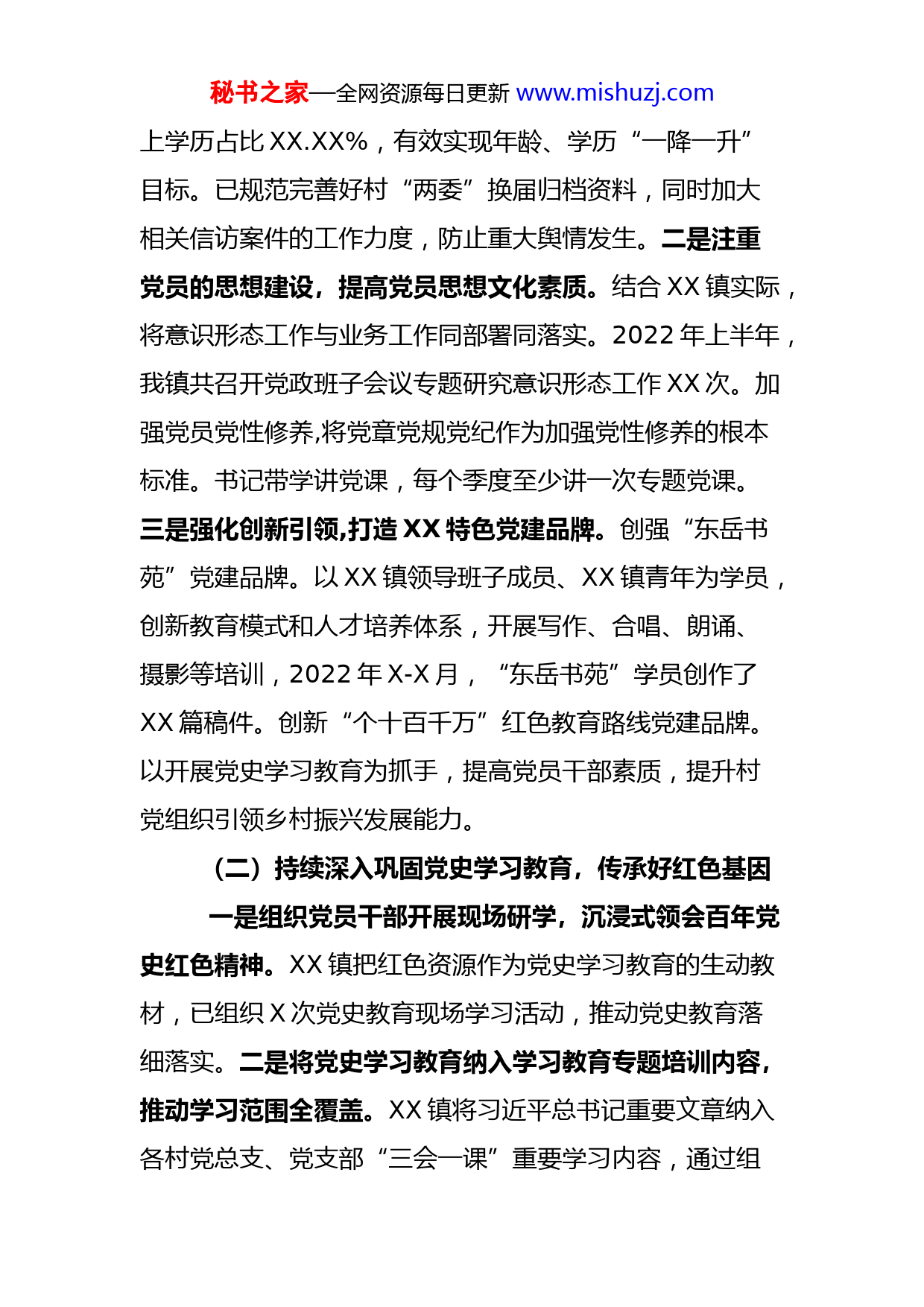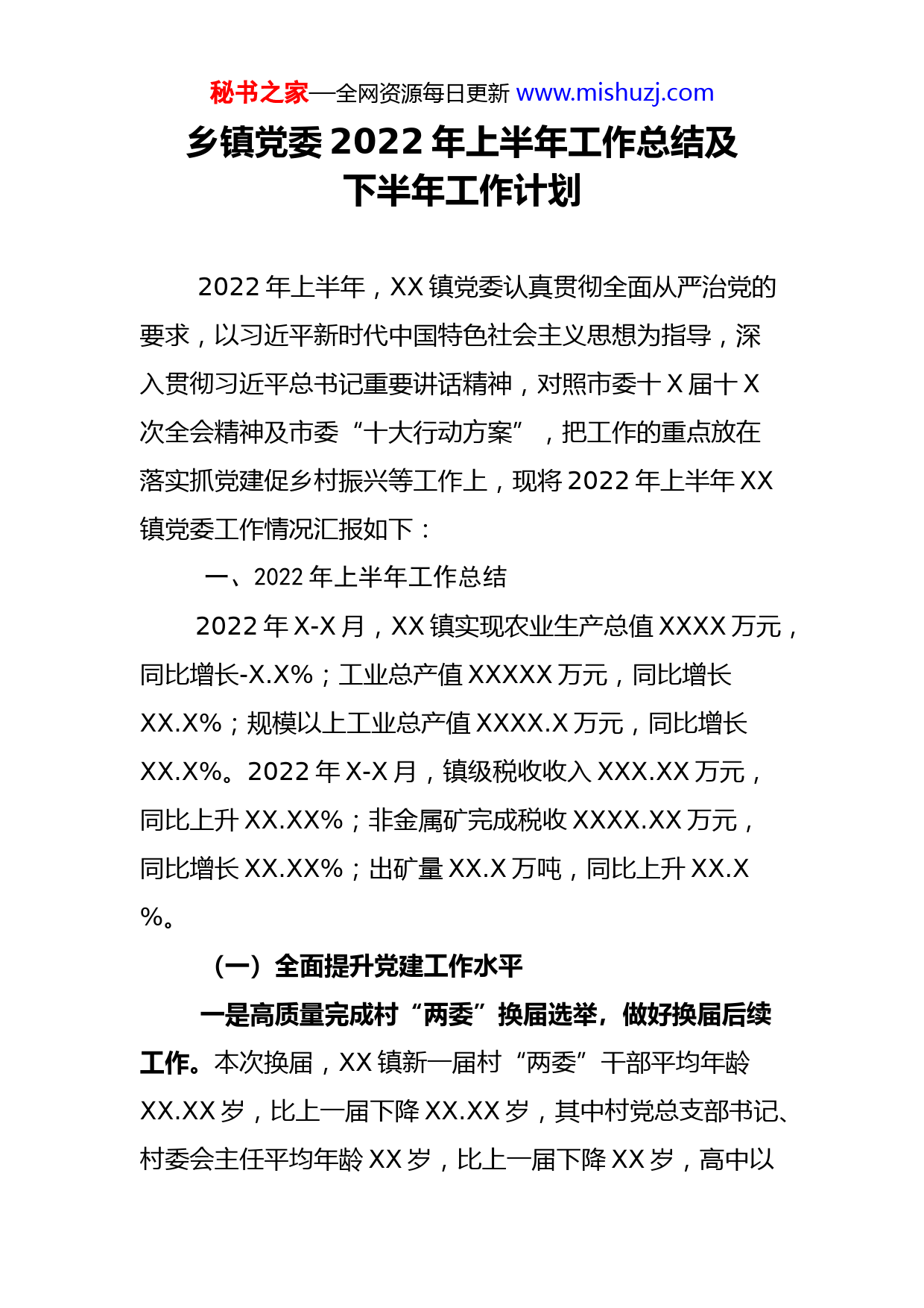 秘书之家—全网资源每日更新www.mishuzj.com乡镇党委2022年上半年工作总结及下半年工作计划2022年上半年,XX镇党委认真贯彻全面从严治党的要求,以习近平新时代中国特色社会主义思想为指导,深入贯彻习近平总书记重要讲话精神,对照市委十X届十X次全会精神及市委“十大行动方案”,把工作的重点放在落实抓党建促乡村振兴等工作上,现将2022年上半年XX镇党委工作情况汇报如下:一、2022年上半年工作总结2022年X-X月,XX镇实现农业生产总值XXXX万元,同比增长-X.X%;工业总产值XXXXX万元,同比增长XX.X%;规模以上工业总产值XXXX.X万元,同比增长XX.X%。2022年X-X月,镇级税收收入XXX.XX万元,同比上升XX.XX%;非金属矿完成税收XXXX.XX万元,同比增长XX.XX%;出矿量XX.X万吨,同比上升XX.X%。(一)全面提升党建工作水平一是高质量完成村“两委”换届选举,做好换届后续工作。本次换届,XX镇新一届村“两委”干部平均年龄XX.XX岁,比上一届下降XX.XX岁,其中村党总支部书记、村委会主任平均年龄XX岁,比上一届下降XX岁,高中以秘书之家—全网资源每日更新www.mishuzj.com上学历占比XX.XX%,有效实现年龄、学历“一降一升”目标。已规范完善好村“两委”换届归档资料,同时加大相关信访案件的工作力度,防止重大舆情发生。二是注重党员的思想建设,提高党员思想文化素质。结合XX镇实际,将意识形态工作与业务工作同部署同落实。2022年上半年,我镇共召开党政班子会议专题研究意识形态工作XX次。加强党员党性修养,将党章党规党纪作为加强党性修养的根本标准。书记带学讲党课,每个季度至少讲一次专题党课。三是强化创新引领,打造XX特色党建品牌。创强“东岳书苑”党建品牌。以XX镇领导班子成员、XX镇青年为学员,创新教育模式和人才培养体系,开展写作、合唱、朗诵、摄影等培训,2022年X-X月,“东岳书苑”学员创作了XX篇稿件。创新“个十百千万”红色教育路线党建品牌。以开展党史学习教育为抓手,提高党员干部素质,提升村党组织引领乡村振兴发展能力。(二)持续深入巩固党史学习教育,传承好红色基因一是组织党员干部开展现场研学,沉浸式领会百年党史红色精神。XX镇把红色资源作为党史学习教育的生动教材,已组织X次党史教育现场学习活动,推动党史教育落细落实。二是将党史学习教育纳入学习教育专题培训内容,推动学习范围全覆盖。XX镇将习近平总书记重要文章纳入各村党总支、党支部“三会一课”重要学习内容,通过组秘书之家—全网资源每日更新www.mishuzj.com织各村驻村领导、党支部书记讲党课,把习近平总书记重要文章精神传达到各级党员中。(三)严格落实新冠肺炎疫情防控工作一是持续落实疫情防控宣传工作。加大对疫情防控的宣传力度,2022年X-X月,镇、村两级干部进村入户派发疫情防控《倡议书》《一封信》共XXXXX多张,进一步提高了群众对疫情防控的认识,形成了群防群控的良好氛围。二是建立XX镇疫情防控包村责任制。组建由镇村干部、卫生健康、公安民警组成的“三人工作小组”,落实XX小时值班制度,对重点摸排人员实行“四个一”管理,2022年上半年,共收到推送疫情线索XXX条,已对核查落地在本地的人员落实“四个一”管理工作。三是组织XX名党群志愿服务者支援大路边镇荒塘坪检查站疫情防控工作。已安排XX批次XX人次,服务时长达XXX小时,深入疫情防控第一线,冲锋在前不畏艰难,让党旗在疫情防控第一线高高飘扬。四是全力做好新冠疫苗接种工作。通过大力开展新冠疫苗接种宣传、动员,加大镇、村统筹力度,多举措有序开展疫苗接种工作,已为群众接种第一针新冠疫苗XXXX剂次,第二针新冠疫苗XXXX剂次,超额完成上半年目标人群接种任务。(四)大力实施乡村振兴战略,打造宜居宜业宜游美丽乡村秘书之家—全网资源每日更新www.mishuzj.com一是持续开展美丽乡村建设。我镇新增江塝村特色村项目,现已基本完成建设,宝山村等XX个自然村打造美丽乡村示范村和整洁村,目前正在完善前期手续,其中龙尾村、大磅村、旧董屋村已具备入场建设条件。全面深入开展“四小园”和美丽庭院示范创建。全镇已申报打造美丽耙田、XX、大田、斜磅、高山等乡村风貌带。二是全面巩固提升农村人居环境整治成果。全面完成全域自然村“三清三拆三整治”任务,村庄保洁覆盖面和垃圾处理率达XXX%。全面提升农村卫生厕所改造质量,县级对我镇户厕改造抽查了XX户,验收通过有XX户,需要整改的有X户,现已迅速有效地开展整改工作。全镇XXX个自然村的生活垃圾得到有效处理,持续推进源头分类减量、资源化处理利用。三是巩固拓展脱贫攻坚成果同乡村振兴有效衔接。严格按照“四不摘”要求,保持现行帮扶政策、帮扶力量总体稳定。对全镇XXX户建档立卡贫困户制定了年度帮扶计划并完成系统录入工作。建立健全返贫监测和动态帮扶机制,开发预警监测平台,从镇到行政村均设置报贫电话,畅通群众报贫渠道,继续对建档立卡贫困户进行跟踪监测。(五)稳步推进经济建设,夯实发展基础一是严格落实疫情防控工作,积极推进企业复工复产。根据疫情防控工作有关文件要求,认真落实疫情防控工作。秘书之家—全网资源每日更新www.mishuzj.com在今年春节假期前,对镇辖区内XX家工矿企业开展跨省来连、离连人员进行摸查登记工作,及时企业人员流动情况。同时,积极安排XX镇卫生院工作