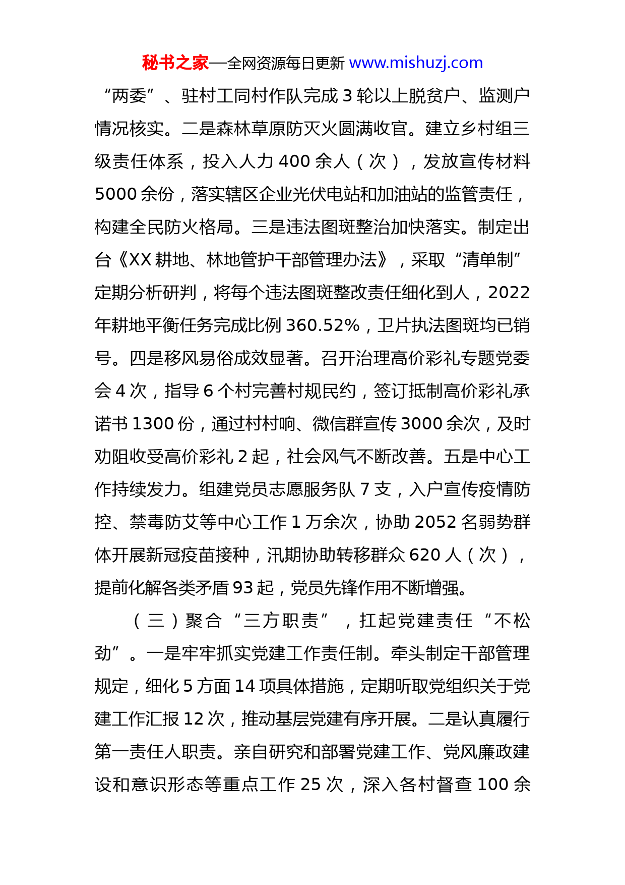 秘书之家—全网资源每日更新www.mishuzj.com乡镇党委书记2022年抓基层党建工作述职报告一年来,在市委的坚强领导下,我认真履行抓基层党建和第一责任人职责,全面推进各项工作落地见效。现将相关情况汇报如下。一、主要做法和成效(一)聚力“四个坚持”,树牢政治信念“不动摇”。一是坚持“第一议题”制度。把习近平系列讲话精神、各类党代会、全会精神纳入会议必学内容,组织召开党委会、理论学习中心组会、党建月会等126次,推动政治学习走深走实。二是坚持学习党的二十大精神。深入开展“万场微党课进支部”活动,组织领导干部讲党课19次,座谈交流13次,引导党员干部撰写心得体会、谈发展文章74篇,提升学习质效。三是坚持常态开展党史教育。全年订购学习资料400余套,微信群推送党史内容48期,每周二开展“党史我来读”专题读书会,落实“我为群众办实事”28件,颁发“光荣在党50年”纪念章2枚,推动党史教育常学常新。(二)聚焦“五类重点”,服务中心大局“不懈怠”。一是脱贫成果巩固提升。每月党建月会动态研判脱贫成果巩固情况,结合各部门反馈返贫风险线索,会同村秘书之家—全网资源每日更新www.mishuzj.com“两委”、驻村工同村作队完成3轮以上脱贫户、监测户情况核实。二是森林草原防灭火圆满收官。建立乡村组三级责任体系,投入人力400余人(次),发放宣传材料5000余份,落实辖区企业光伏电站和加油站的监管责任,构建全民防火格局。三是违法图斑整治加快落实。制定出台《XX耕地、林地管护干部管理办法》,采取“清单制”定期分析研判,将每个违法图斑整改责任细化到人,2022年耕地平衡任务完成比例360.52%,卫片执法图斑均已销号。四是移风易俗成效显著。召开治理高价彩礼专题党委会4次,指导6个村完善村规民约,签订抵制高价彩礼承诺书1300份,通过村村响、微信群宣传3000余次,及时劝阻收受高价彩礼2起,社会风气不断改善。五是中心工作持续发力。组建党员志愿服务队7支,入户宣传疫情防控、禁毒防艾等中心工作1万余次,协助2052名弱势群体开展新冠疫苗接种,汛期协助转移群众620人(次),提前化解各类矛盾93起,党员先锋作用不断增强。(三)聚合“三方职责”,扛起党建责任“不松劲”。一是牢牢抓实党建工作责任制。牵头制定干部管理规定,细化5方面14项具体措施,定期听取党组织关于党建工作汇报12次,推动基层党建有序开展。二是认真履行第一责任人职责。亲自研究和部署党建工作、党风廉政建设和意识形态等重点工作25次,深入各村督查100余秘书之家—全网资源每日更新www.mishuzj.com次,解决问题60余个。全面完成2021年党建工作问题整改。三是压紧压实党风廉政建设。坚持教育与监督并重,督促班子自觉履行“一岗双责”,开展廉洁教育、谈心谈话19次,约谈党员干部15人(次),处分违纪党员4人。(四)聚细“多元任务”,提升工作质效“不停步”。一是推动组织建设。深入开展村“两委”换届“回头看”,发现整改问题XX个;开展“三分类三提升”活动,创建3A级村党组织1个,整顿软弱涣散党组织1个,排查发展党员违规违纪、党务突出问题43个,有效规范组织建设。二是规范党员教育。严格“三会一课”等组织生活,新发展党员XX名、转正XX名,推荐XX名党员参与市级以上示范培训,组织开展党员培训4期,教育党员XX余人(次);为流动党员推送线上资料XX余份,提升基层队伍能力素质。三是加强干部管理。出台村“两委”管理办法,每月至少2次针对村干部值班值守、责任落实等情况开展督查,发现并整改问题70余个;引导21名村干部参与学历提升,进一步强化队伍建设。四是建强集体经济。XX个行政村全部建立合作联合社,XX村稳步推进风情园创建,集体经济发展加强。五是严格驻村管理。严格落实驻村干部福利待遇、驻村考勤等制度,集体谈心谈话4次。六是深化基层治理。建立移民矛盾网格化管理机制,秘书之家—全网资源每日更新www.mishuzj.com召开水电移民专题会议30余次,收集群众诉求83个,化解矛盾30余起,营造和谐局面。二、存在问题及原因分析(一)学习教育不够深入。一是集中学习“浮于表面”。各级党组织召开党建月会、“三会一课”时,仅限于领读条规、学习文件等,未深入展开解读、理解阐释,导致党员学习一知半解。主要是领导干部对党建工作重视程度还不够,存在“重业务轻思想”现象,未深入思考“如何学”的问题。二是自主学习“监督缺位”。党员在自主学习期间,村党组织不清楚、不了解自学情况,未严格按照既定目标开展,导致自主学习沦为娱乐休闲。主要是监督机制缺位,对党员学习情况无法常态监管,党员惰性增强,学习效果不好。三是活动开展“成效弱化”。村党组织开展各类活动时,往往以完成基础目标为方向,未严格按照活动要求高质量开展,导致活动成效不强。主要是村党组织文字能力不强,对于各项文字材料存在畏难情绪,对相关活动简化处理。(二)党员管理不够扎实。一是党内生活开展滞后。村党组织在开展党内生活时,普遍拖在规定时间最后几天,导致党内生活准备不充分,效果较为不好。主要是乡党委对各级党组织管理松懈,各包村领导、包村干部未形成监管合力。二是流动党员管理单一。全乡流动党员XX秘书之家—全网资源每日更新www.mishuzj.com名,在流动党员管理上,仅仅是依靠网络推送学习资