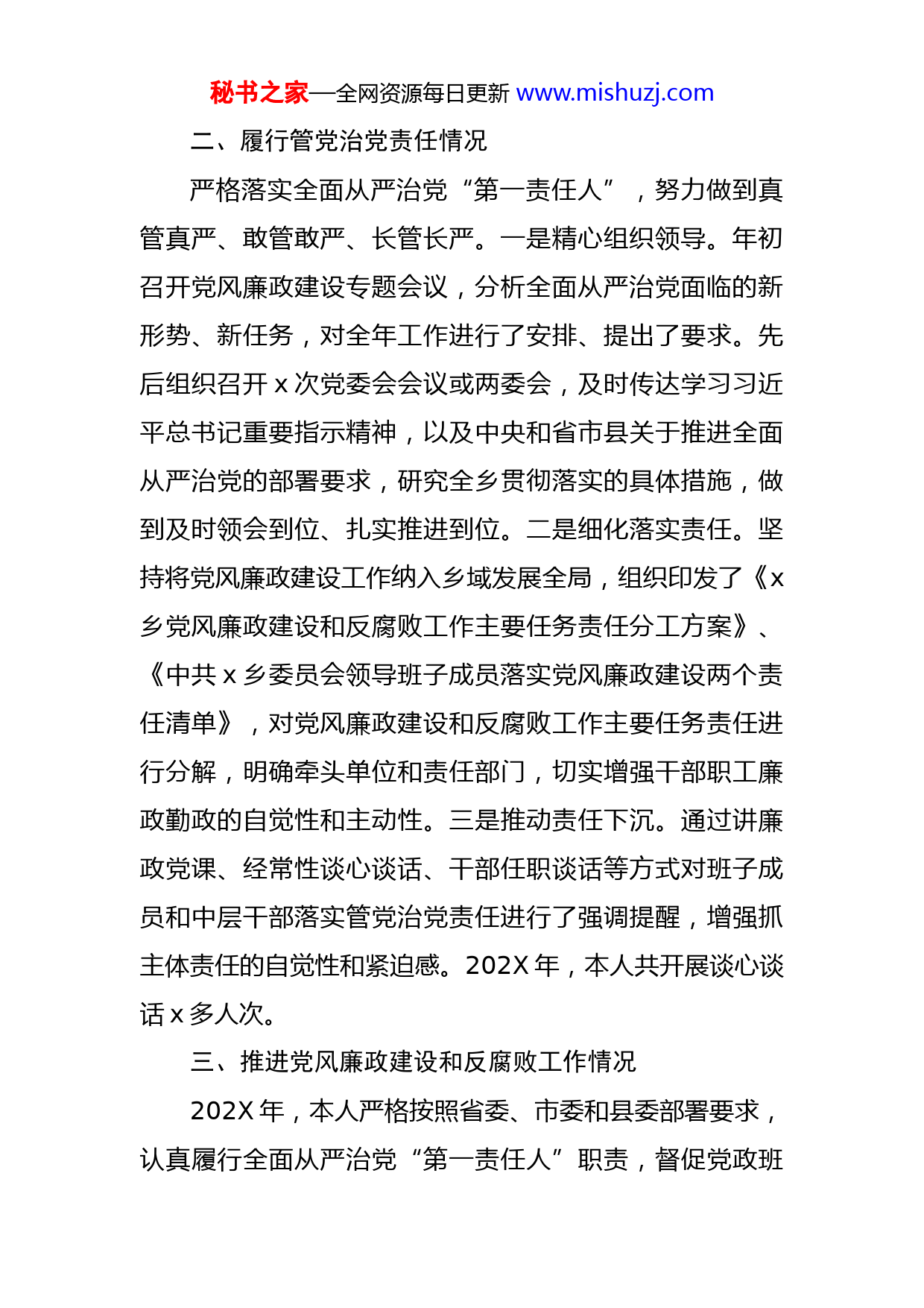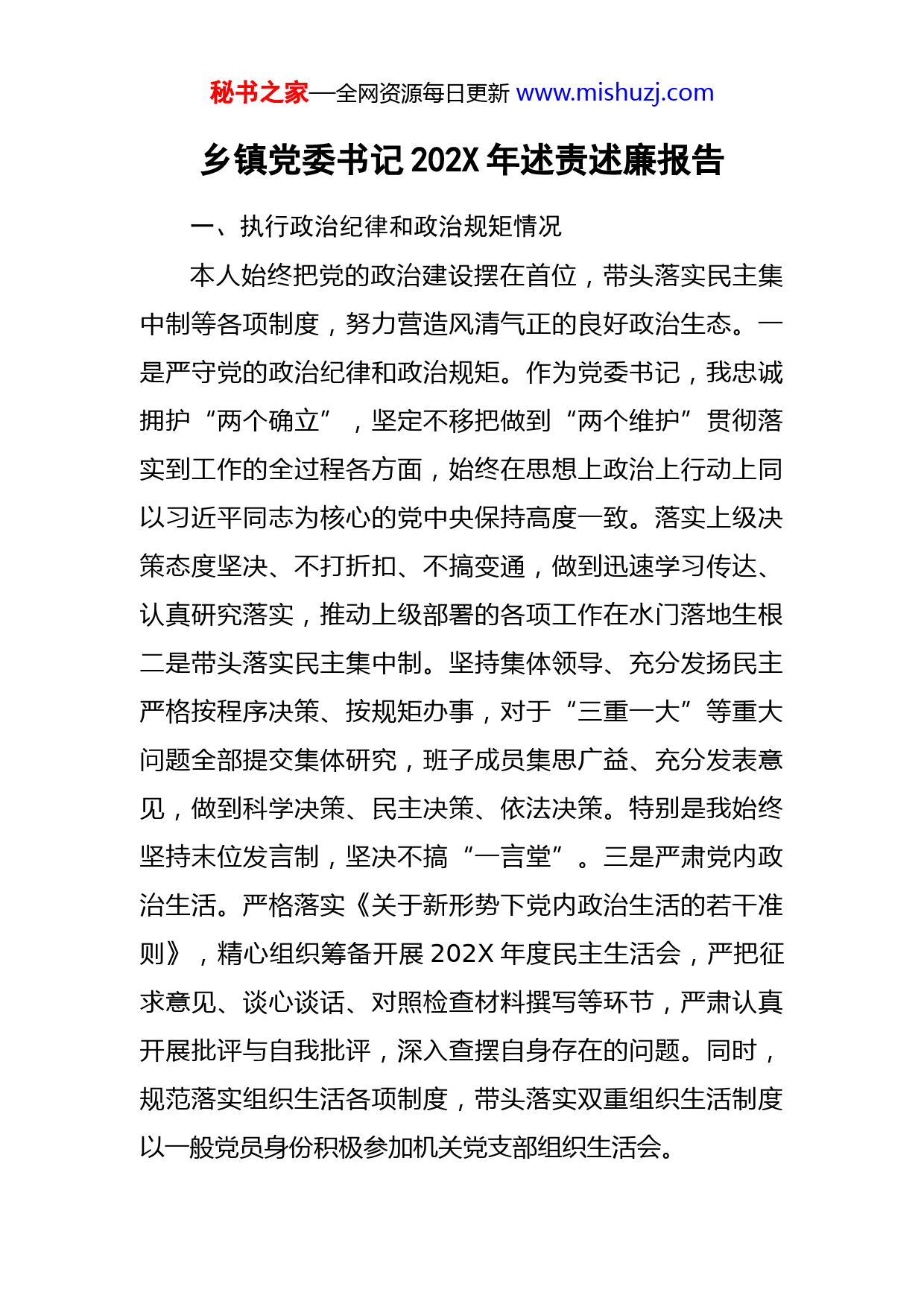 秘书之家—全网资源每日更新www.mishuzj.com乡镇党委书记202X年述责述廉报告一、执行政治纪律和政治规矩情况本人始终把党的政治建设摆在首位,带头落实民主集中制等各项制度,努力营造风清气正的良好政治生态。一是严守党的政治纪律和政治规矩。作为党委书记,我忠诚拥护“两个确立”,坚定不移把做到“两个维护”贯彻落实到工作的全过程各方面,始终在思想上政治上行动上同以习近平同志为核心的党中央保持高度一致。落实上级决策态度坚决、不打折扣、不搞变通,做到迅速学习传达、认真研究落实,推动上级部署的各项工作在水门落地生根二是带头落实民主集中制。坚持集体领导、充分发扬民主严格按程序决策、按规矩办事,对于“三重一大”等重大问题全部提交集体研究,班子成员集思广益、充分发表意见,做到科学决策、民主决策、依法决策。特别是我始终坚持末位发言制,坚决不搞“一言堂”。三是严肃党内政治生活。严格落实《关于新形势下党内政治生活的若干准则》,精心组织筹备开展202X年度民主生活会,严把征求意见、谈心谈话、对照检查材料撰写等环节,严肃认真开展批评与自我批评,深入查摆自身存在的问题。同时,规范落实组织生活各项制度,带头落实双重组织生活制度以一般党员身份积极参加机关党支部组织生活会。秘书之家—全网资源每日更新www.mishuzj.com二、履行管党治党责任情况严格落实全面从严治党“第一责任人”,努力做到真管真严、敢管敢严、长管长严。一是精心组织领导。年初召开党风廉政建设专题会议,分析全面从严治党面临的新形势、新任务,对全年工作进行了安排、提出了要求。先后组织召开x次党委会会议或两委会,及时传达学习习近平总书记重要指示精神,以及中央和省市县关于推进全面从严治党的部署要求,研究全乡贯彻落实的具体措施,做到及时领会到位、扎实推进到位。二是细化落实责任。坚持将党风廉政建设工作纳入乡域发展全局,组织印发了《x乡党风廉政建设和反腐败工作主要任务责任分工方案》、《中共x乡委员会领导班子成员落实党风廉政建设两个责任清单》,对党风廉政建设和反腐败工作主要任务责任进行分解,明确牵头单位和责任部门,切实增强干部职工廉政勤政的自觉性和主动性。三是推动责任下沉。通过讲廉政党课、经常性谈心谈话、干部任职谈话等方式对班子成员和中层干部落实管党治党责任进行了强调提醒,增强抓主体责任的自觉性和紧迫感。202X年,本人共开展谈心谈话x多人次。三、推进党风廉政建设和反腐败工作情况202X年,本人严格按照省委、市委和县委部署要求,认真履行全面从严治党“第一责任人”职责,督促党政班秘书之家—全网资源每日更新www.mishuzj.com子成员和各级党组织负责人落实好主体责任,推动党风廉政建设和发腐败工作深入开展。主要做了以下几个方面工作:一是落实抓加强教育方面。一是大力开展习近平新时代中国特色社会主义思想和党的十九届X中X会精神宣讲活动。把学习宣传贯彻作为首要政治任务,制定了专项工作方案,细化了具体措施,推动全乡迅速兴起了学习宣传贯彻热潮。由乡党政领导班子等组成的宣讲团,累计开展基层宣讲x余次,受众x多人。二是强化日常教育。发挥乡党委理论中心组示范带动作用,将习近平新时代中国特色社会主义思想、党的十九届X中X会精神纳入中心组学习,共组织开展专题学习x次。同时,利用周三学习日活动,组织机关党员干部观看警示教育片等视频,学习党章党规党纪,提高大家党风廉政建设意识。深入开展党风廉政建设警示教育活动,全年组织开展警示教育活动x多次,利用身边的典型案例,教育身边人。三是加强宣传和意识形态工作。把全面从严治党宣传教育纳入宣传工作总体部署,加强阵地管理特别是网络舆情管理,确定专干全天候做好网络舆情监控,累计举报不良信息x条,妥善处置网络舆情问题x个。二是落实抓制度建设方面。带头严格落实主要领导末位表态、领导干部外出请销假、领导干部个人事项报告、秘书之家—全网资源每日更新www.mishuzj.com日常值班值守等各项制度,及时整改纠正了制度执行不严等现象。同时,加强明察暗访,对出现违反财务制度、出现在岗不在位等问题的x名党员干部予以严肃问责。多次组织全乡机关党员干部、村主干学习《县政府投资小规模工程交易管理暂行规定的通知》《关于规范全县党员干部和公职人员操办婚丧喜庆事宜的规定》《关于进一步规范村级财务管理的指导意见》等文件制度,强化党员干部执行制度的直觉性,强化制度的约束作用。三是落实抓“一把手”方面。一是加强责任意识教育。坚持把主体责任意识教育作为各级党组织负责人培训的重要内容,切实增强主体责任意识,自觉担当起管党治党这个首要责任。二是强化“一把手”责任担当。作为党委书记,把全面从严治党第一责任人责任履行好,定期或不定期强调党风廉政建设工作,与经济建设、改革发展稳定工作同步考虑、同步部署、同步实施、同步检查,推动一级带一级,确保班子成员履行好“一岗双责”才不会落空。三是选准用好干部。坚持选人用人标准,从严管理监督干部,不唯票、唯分取人,既选用才干过硬的“能吏”,也选用安分守己的“循吏”,严肃查处选人用人上的不正之风和腐败问题