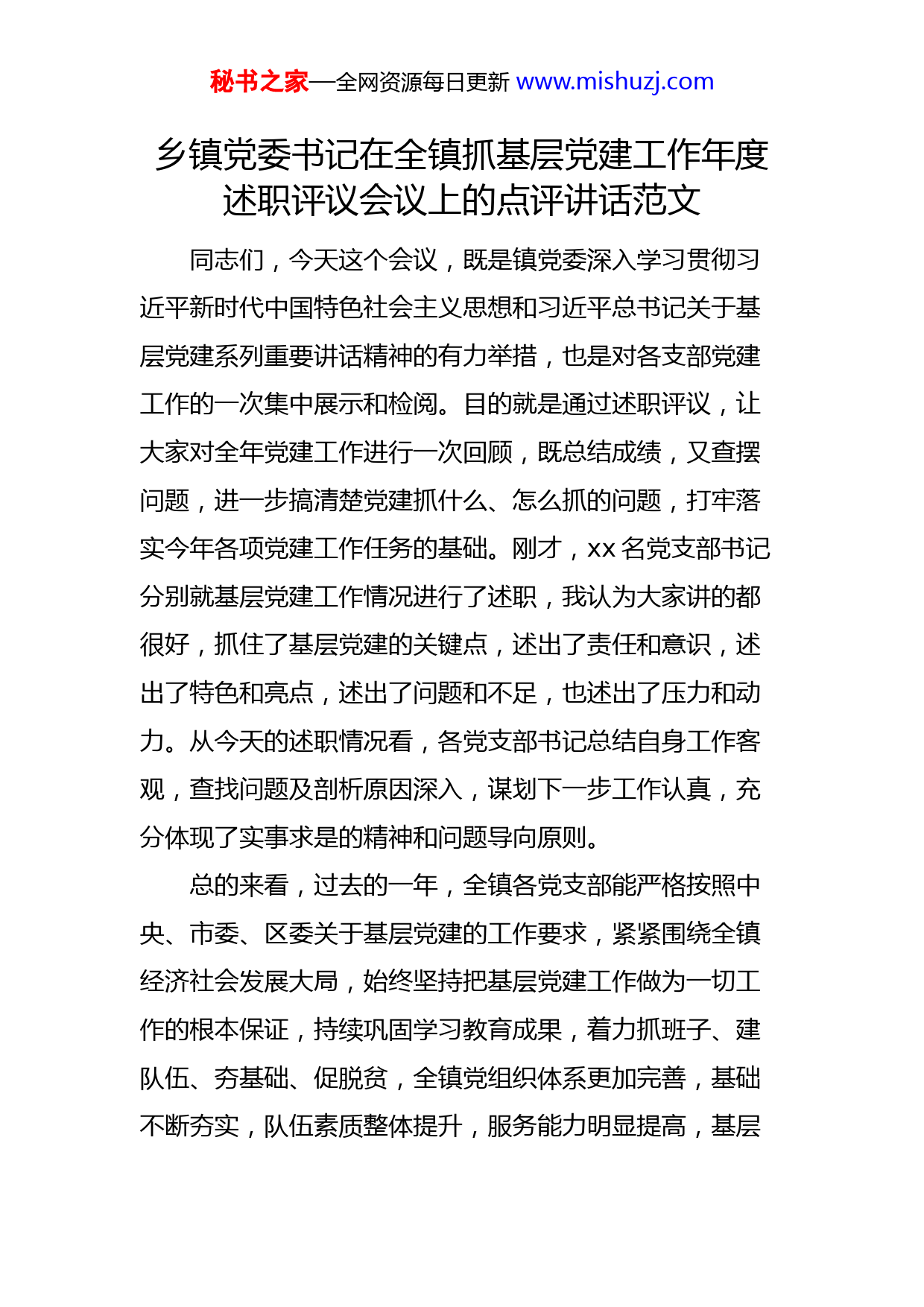秘书之家—全网资源每日更新www.mishuzj.com乡镇党委书记在全镇抓基层党建工作年度述职评议会议上的点评讲话范文同志们,今天这个会议,既是镇党委深入学习贯彻习近平新时代中国特色社会主义思想和习近平总书记关于基层党建系列重要讲话精神的有力举措,也是对各支部党建工作的一次集中展示和检阅。目的就是通过述职评议,让大家对全年党建工作进行一次回顾,既总结成绩,又查摆问题,进一步搞清楚党建抓什么、怎么抓的问题,打牢落实今年各项党建工作任务的基础。刚才,xx名党支部书记分别就基层党建工作情况进行了述职,我认为大家讲的都很好,抓住了基层党建的关键点,述出了责任和意识,述出了特色和亮点,述出了问题和不足,也述出了压力和动力。从今天的述职情况看,各党支部书记总结自身工作客观,查找问题及剖析原因深入,谋划下一步工作认真,充分体现了实事求是的精神和问题导向原则。总的来看,过去的一年,全镇各党支部能严格按照中央、市委、区委关于基层党建的工作要求,紧紧围绕全镇经济社会发展大局,始终坚持把基层党建工作做为一切工作的根本保证,持续巩固学习教育成果,着力抓班子、建队伍、夯基础、促脱贫,全镇党组织体系更加完善,基础不断夯实,队伍素质整体提升,服务能力明显提高,基层秘书之家—全网资源每日更新www.mishuzj.com党建工作取得新成效,为有力推动脱贫攻坚、乡村振兴、产业发展、生态建设和环境整治提供了坚实的组织保障。在肯定成绩的同时,我们也要清醒地认识到,与中央、市委、区委的要求相比,我镇的基层党建工作仍存在许多不足和问题,主要表现在三个方面:一是主责主业意识不强。个别党支部书记对党建工作“第一责任人”的角色定位认识模糊,习惯当“二传手”“甩手掌柜”,认为抓党建是虚的,或者抓党建不深入、不精细,马马虎虎、浅尝辄止。没有树立“抓好党建是主业”的意识,还存在粗糙的工作方式、粗放的管理理念、僵化的发展理念,没有坚定不移地推动基层党建工作高质量发展。二是党员模范带头作用不强。有的党员自身要求不严,政治素质不高;有的党员自身标准不高,表率作用不强,工作责任心不强,违章违纪时有发生,特别是在此次疫情防控的关键时期,在急、难、险、重的关键时刻,挺不出、上不去,在群众中没有威信,也没有影响力,更体现不出党员的先进性,在工作和生活中得过且过,始终把自己混同于普通老百姓。三是亮点特色还不够突出。一年来,全镇各党支部还没有形成真正有特色、有亮点的党建品牌,特别是在区级层面没有突出的亮点特色,选树的典型层次还不够高。以上列举的这些问题,希望我们各党支部书记深刻反思,真正重秘书之家—全网资源每日更新www.mishuzj.com视起来、警醒起来,以更高的标准、更严的要求、更实的作风推动基层党建工作再上新台阶。下面,我围绕贯彻落实好全区各党组织书记抓基层党建工作述职评议会精神,进一步靠实抓党建责任,提升全镇党建工作整体水平,再讲五点意见:一要提高政治站位,深入学习贯彻习近平新时代中国特色社会主义思想。全镇各党支部要紧扣新时代要求,把深入学习习近平新时代中国特色社会主义思想,切实做到“两个维护”,积极贯彻落实党的十九大精神及十九届二中、三中、四中、五中、六中全会精神,深化落实习近平总书记对重庆提出的“两点”定位、“两地”“两高”目标、发挥“三个作用”和营造良好政治生态的重要指示要求,以党的政治建设为统领,把不忘初心、牢记使命作为加强党的建设的永恒课题和全体党员、干部的终身课题,始终用习近平新时代中国特色社会主义思想武装头脑、指导实践、推动落实,做到工作谋划从党建切入、靠党建统领、以党建保证,切实做好党员学习教育,进一步优化工作思路,切实增强学习实效,充分发挥广大党员在脱贫攻坚、乡村振兴、产业发展、致富带富、服务群众中的先锋模范作用。二要紧盯问题抓整改,不断提高基层党建工作水平。全镇各党支部要结合此次述职评议大会,把工作着力点和秘书之家—全网资源每日更新www.mishuzj.com落脚点放在抓整改落实上。各包片领导要切实履行抓党建“一岗双责”职责,督促各党支部针对问题深查具体表现,深剖产生原因,列出问题清单、责任清单和整改清单,认真研究制定整改措施,明确整改时限,做到问题清、措施严、责任明,以问题清单促进问题整改,推进责任落实。三要强化责任担当,着力推动党建任务落到实处。各党支部要牢固树立抓好党建是最大政绩这一理念,把党建工作与经济社会发展工作同安排、同督促、同落实,强化常抓意识,落实常抓措施,推动提升全镇党建工作科学化水平。今年,各班子成员、党支部和书记要把党建工作放在核心位置,投入更多时间和精力去推动、去督促、去落实,必须经常分析研究党建工作状况,切实破解突出党建难题,不能当甩手掌柜和“二传手”,严防党建工作“灯下黑”。四要严肃党内生活,打造坚强有力的战斗堡垒。全镇各党支部书记作为抓党建工作第一责任人,要认真履职尽责,从严落实“三会一课”、民主评议党员等基本制度,扎实开展“主题党日”活动,持续巩固拓展主题教育成果,扎实开展主题教育问题整改“回头看”,在严肃党内政治生活中叩问初心,在建立落实长效机制中践