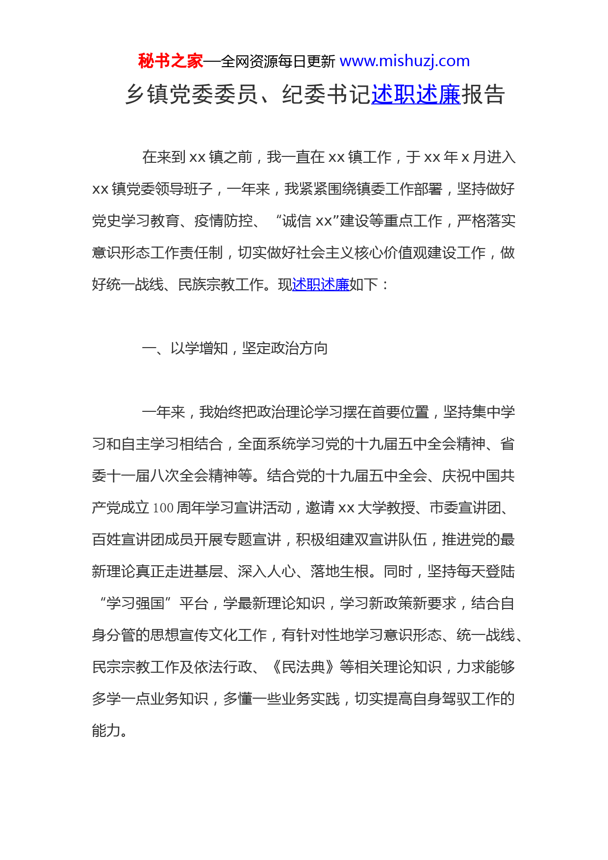 秘书之家—全网资源每日更新www.mishuzj.com乡镇党委委员、纪委书记述职述廉报告在来到xx镇之前,我一直在xx镇工作,于xx年x月进入xx镇党委领导班子,一年来,我紧紧围绕镇委工作部署,坚持做好党史学习教育、疫情防控、“诚信xx”建设等重点工作,严格落实意识形态工作责任制,切实做好社会主义核心价值观建设工作,做好统一战线、民族宗教工作。现述职述廉如下:一、以学增知,坚定政治方向一年来,我始终把政治理论学习摆在首要位置,坚持集中学习和自主学习相结合,全面系统学习党的十九届五中全会精神、省委十一届八次全会精神等。结合党的十九届五中全会、庆祝中国共产党成立100周年学习宣讲活动,邀请xx大学教授、市委宣讲团、百姓宣讲团成员开展专题宣讲,积极组建双宣讲队伍,推进党的最新理论真正走进基层、深入人心、落地生根。同时,坚持每天登陆“学习强国”平台,学最新理论知识,学习新政策新要求,结合自身分管的思想宣传文化工作,有针对性地学习意识形态、统一战线、民宗宗教工作及依法行政、《民法典》等相关理论知识,力求能够多学一点业务知识,多懂一些业务实践,切实提高自身驾驭工作的能力。秘书之家—全网资源每日更新www.mishuzj.com二、聚焦重点,认真履职尽责1.做好疫情防控工作。一是常态化防控不放松。严格按照市指挥部关于常态化疫情防控相关规定,持续防控不松懈,持续开展卫生健康知识宣传,督促落实各类重点场所严格落实“一扫两核一测”防疫措施,切实落实好常态化防控工作。二是强化管理再加压。面对夏季疫情暴发,严格按要求做好返乡人员排查,及时启动4个集中隔离点,对中高风险地区返xx人员严格落实集中隔离医学观察制度,严格隔离场所管理。三是全力推进疫苗接种。结2.推进“诚信xx”建设。研究制定《“诚信xx”创建实施方案》,成立了由党委书记任组长的“诚信xx”建设工作领导小组,制定领导小组工作制度,每月研究当月创建工作。确定九大主题活动,组织开展创建启动仪式活动,组织全镇党员开展“诚信大讨论”活动;在全镇范围内开展讲诚信宣传活动,在5个集贸市场设置诚信宣传先锋岗,向群众发放诚信倡议书、主题环保袋;开展诚信建设进校园,“小手拉大手”主体班会活动;开展“诚信商户”评选、“诚信家庭”评选等系列互动。3.做好理论学习宣讲。组建“双宣讲”队伍,将获得省、市荣誉及抗疫、防汛一线涌现出来的先进典型吸纳进入百姓宣讲团,组织在村级开展一线故事宣讲。集中购买,为全镇九十多个党支部秘书之家—全网资源每日更新www.mishuzj.com各发放5本《习近平谈治国理政》(第三卷)、发放10套党史学习系列书籍,组织全镇党员开展学习,邀请xx大学教授、市委宣讲团、市百姓宣讲团成员开展专题宣讲。结合党史学习教育工作,在镇级组建机关干部党史学习班及青年干部党史学习班两个主题学习班,有针对性开展党史知识、素质提升学习。还组织所有党委领导班子、机关干部开展集中学习培训,并要求所有机关干部到村开展宣讲,确保理论宣讲全覆盖,让党的最新理论传播到基层一线。4.落实意识形态工作责任制。一是加强对外宣传。全面加强“xx之声”微信公众号建设,在抗疫、防汛等重大工作中,积极发掘冲锋一线先进典型,加强宣传、选树,制定出台xx镇宣传奖励办法,鼓励年轻干部多看、多写、多发表。二是扩大网军队伍。根据人员变动,及时备案更新网军人员,除专业网管员外,将镇机关所有35周岁以下年轻干部及大学生村干部吸纳进网军队伍,及时跟帖转发、回复留言,全面加强网络舆情管控。三是强化基层阵地。在66个村(社区)各明确一名农村文化宣传员,负责村级宣传思想文化工作,全面加强村级意识形态阵地堡垒。5.做好文明创建工作。一是文明创建有成效。在全镇范围内开展文明村创建工作,组织各村积极开展学习,开展各类志愿服务活动,结合村级实际,制定村规民约,强化红白理事会作用,建设文明新乡风。2020年共27个村成功申报市级文明村。二是城镇建设秘书之家—全网资源每日更新www.mishuzj.com有新貌。结合文明城市创建拆除违章建筑、规范车辆停放,全面整治出店经营,城镇秩序井然有序,结合美丽城镇、美丽乡村建设,实施墙体彩绘、立面喷刷等工程,城镇品味全面提升。三是文明实践有活动。依托村级党员服务中心,在全镇66个村(社区)建立新时代文明实践站,开展专题培训,组织村级在开展志愿服务活动的同时,将活动相关资料每月录入到“云平台”系统。三、严于律己,永葆廉洁本色坚持把纪律和规矩挺在前面,以党章党规约束自己的言行举止,树牢“四个意识”、坚定“四个自信”、坚决做到“两个维护”,自觉在思想上政治上行动上同以习近平同志为核心的党中央保持高度一致。一是始终绷紧廉洁自律这根弦,严格执行党风廉政建设责任制各项规定,自觉接受监督,争做清正廉洁的表率。二是坚持与人为善,待人诚恳,团结同志,坚持互帮互助。三是清醒认识自身角色定位,牢牢把握干事创业机会,尽心尽力做好本职工作,执行任务不做选择、不打折扣。自觉接受组织、社会和群众的监督,谨慎行事,让自己行得正、站得直。总结一年的工作,虽然过程中有艰辛,但收获很多。反思自身,一年过后,依然有很多问题不容忽视。下阶段,我将积极融入秘书之家—