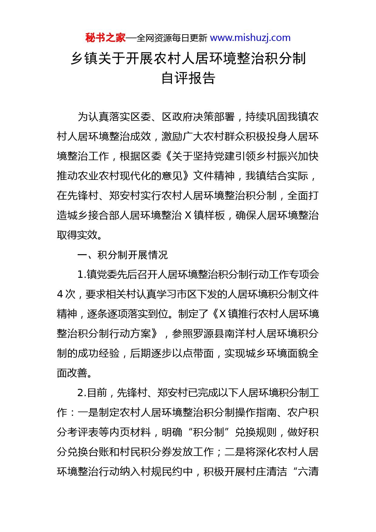 秘书之家—全网资源每日更新www.mishuzj.com乡镇关于开展农村人居环境整治积分制自评报告为认真落实区委、区政府决策部署,持续巩固我镇农村人居环境整治成效,激励广大农村群众积极投身人居环境整治工作,根据区委《关于坚持党建引领乡村振兴加快推动农业农村现代化的意见》文件精神,我镇结合实际,在先锋村、郑安村实行农村人居环境整治积分制,全面打造城乡接合部人居环境整治X镇样板,确保人居环境整治取得实效。一、积分制开展情况1.镇党委先后召开人居环境整治积分制行动工作专项会4次,要求相关村认真学习市区下发的人居环境积分制文件精神,逐条逐项落实到位。制定了《X镇推行农村人居环境整治积分制行动方案》,参照罗源县南洋村人居环境积分制的成功经验,后期逐步以点带面,实现城乡环境面貌全面改善。2.目前,先锋村、郑安村已完成以下人居环境积分制工作:一是制定农村人居环境整治积分制操作指南、农户积分考评表等内页材料,明确“积分制”兑换规则,做好积分兑换台账和村民积分券发放工作;二是将深化农村人居环境整治行动纳入村规民约中,积极开展村庄清洁“六清秘书之家—全网资源每日更新www.mishuzj.com一改”工作;三是人居环境文明积分“月晒”榜、“红黑榜”、文明积分考评办法、党员网格化管理、运行流程图等机制上墙,进一步激发村民的主动性和积极性;四是建立“积分超市”和垃圾回收兑换点,主要以物质激励为主,积分可在爱心超市兑换相应价值物品;五是环境卫生实行分级包干制度,村委会与村民签订“门前三包”责任书,村里配备若干名保洁员进行日常卫生保洁,确保房前屋后物品堆放整洁;六是积极开展人居环境整治积分制入户宣传活动,向村民发放《致全体村民的一封信》宣传单1000余份,引导动员群众自觉投入改善农村人居环境行动中来。七是严格按照程序标准做好农村人居环境整治积分制系统填报,陆续将参与积分制家庭户的相关信息录入农村人居环境整治积分制平台。3.自评总分95分。二、下一步计划1.先锋村对展进、小巷自然村先行开展积分制考评,郑安村对本村村民开展积分制考评,考评组成人员包含乡镇包村干部、村委会主干、村委会“文明积分”工作主要负责人、村务监督委员会成员、负责包户党员等。党员的家门口挂着“我家有党员”标牌,亮明身份并带头示范,对考核农户发放悬挂“星级户”标牌,连续三个月90分以上的,给予“红榜”公布,连续两次当月考评得分60分及以秘书之家—全网资源每日更新www.mishuzj.com下(或未整改)的,给予“黑榜”公布。2.利用宣传栏、电子滚动屏幕、张贴海报、横幅、发放宣传材料等宣传方式多方面、多方位地加强宣传宣传,激励广大农村群众积极投身人居环境整治工作。