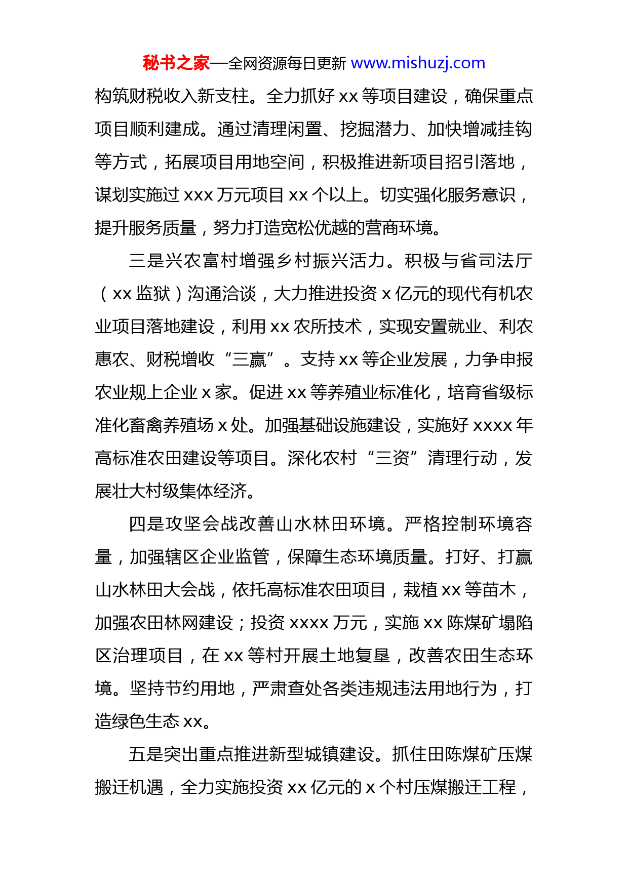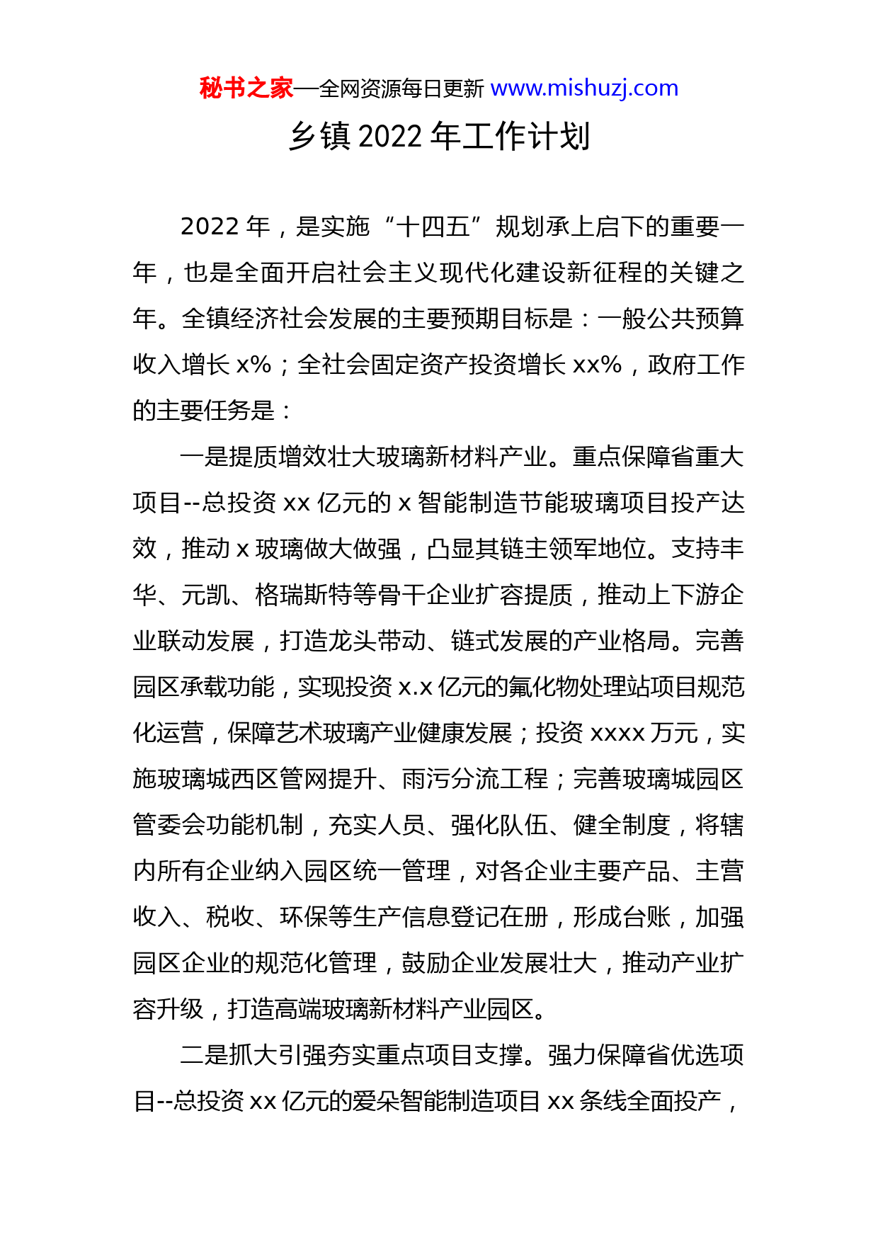 秘书之家—全网资源每日更新www.mishuzj.com乡镇2022年工作计划2022年,是实施“十四五”规划承上启下的重要一年,也是全面开启社会主义现代化建设新征程的关键之年。全镇经济社会发展的主要预期目标是:一般公共预算收入增长x%;全社会固定资产投资增长xx%,政府工作的主要任务是:一是提质增效壮大玻璃新材料产业。重点保障省重大项目--总投资xx亿元的x智能制造节能玻璃项目投产达效,推动x玻璃做大做强,凸显其链主领军地位。支持丰华、元凯、格瑞斯特等骨干企业扩容提质,推动上下游企业联动发展,打造龙头带动、链式发展的产业格局。完善园区承载功能,实现投资x.x亿元的氟化物处理站项目规范化运营,保障艺术玻璃产业健康发展;投资xxxx万元,实施玻璃城西区管网提升、雨污分流工程;完善玻璃城园区管委会功能机制,充实人员、强化队伍、健全制度,将辖内所有企业纳入园区统一管理,对各企业主要产品、主营收入、税收、环保等生产信息登记在册,形成台账,加强园区企业的规范化管理,鼓励企业发展壮大,推动产业扩容升级,打造高端玻璃新材料产业园区。二是抓大引强夯实重点项目支撑。强力保障省优选项目--总投资xx亿元的爱朵智能制造项目xx条线全面投产,秘书之家—全网资源每日更新www.mishuzj.com构筑财税收入新支柱。全力抓好xx等项目建设,确保重点项目顺利建成。通过清理闲置、挖掘潜力、加快增减挂钩等方式,拓展项目用地空间,积极推进新项目招引落地,谋划实施过xxx万元项目xx个以上。切实强化服务意识,提升服务质量,努力打造宽松优越的营商环境。三是兴农富村增强乡村振兴活力。积极与省司法厅(xx监狱)沟通洽谈,大力推进投资x亿元的现代有机农业项目落地建设,利用xx农所技术,实现安置就业、利农惠农、财税增收“三赢”。支持xx等企业发展,力争申报农业规上企业x家。促进xx等养殖业标准化,培育省级标准化畜禽养殖场x处。加强基础设施建设,实施好xxxx年高标准农田建设等项目。深化农村“三资”清理行动,发展壮大村级集体经济。四是攻坚会战改善山水林田环境。严格控制环境容量,加强辖区企业监管,保障生态环境质量。打好、打赢山水林田大会战,依托高标准农田项目,栽植xx等苗木,加强农田林网建设;投资xxxx万元,实施xx陈煤矿塌陷区治理项目,在xx等村开展土地复垦,改善农田生态环境。坚持节约用地,严肃查处各类违规违法用地行为,打造绿色生态xx。五是突出重点推进新型城镇建设。抓住田陈煤矿压煤搬迁机遇,全力实施投资xx亿元的x个村压煤搬迁工程,秘书之家—全网资源每日更新www.mishuzj.com采取“拆x融x”模式,打造产城融合样板工程。投资xxxx万元,全面启动xx路(老镇驻地区域)、xxx国道(xx区域)绿化提升工程,全线实施弱电下地、车位划设、硬化行道、绿化提升和地下管线铺设,大幅提升镇域路域环境。六是践行宗旨抓牢民生社会事业。全力保障国道xx工程,积极实施xx公里农村道路路面改造工程、xx公里道路安防工程;完成低保、五保户农村危房改造x户以上,切实保障群众住房安全;投资xxxx万元,完成xxxx年度农村公路xx改造工程,实现基础设施大改善、大提升。积极推广清洁能源,完成x.x万户农村冬季清洁取暖工作。加强社会保险、救灾救济、五保供养等保障,全面促进创业就业。深化“慧治理”xx模式,推进“平安xx”建设,严格落实安全生产责任制,严防各类事故发生,维护社会安全稳定。七是担当实干提升政府履职水平。始终把纪律和规矩挺在前面,压实主体责任,坚决纠正“四风”,强化政府内部权力监督,努力营造风清气正的政治生态。不断强化担当精神,勇于直面问题,积极化解矛盾,切实提高落实力和执行力。健全激励机制和容错纠错机制,旗帜鲜明地为敢于担当的干部担当、为敢于负责的干部负责,大力营造想干事、能干事、干成事的浓厚氛围,努力开创政府工秘书之家—全网资源每日更新www.mishuzj.com作新局面。