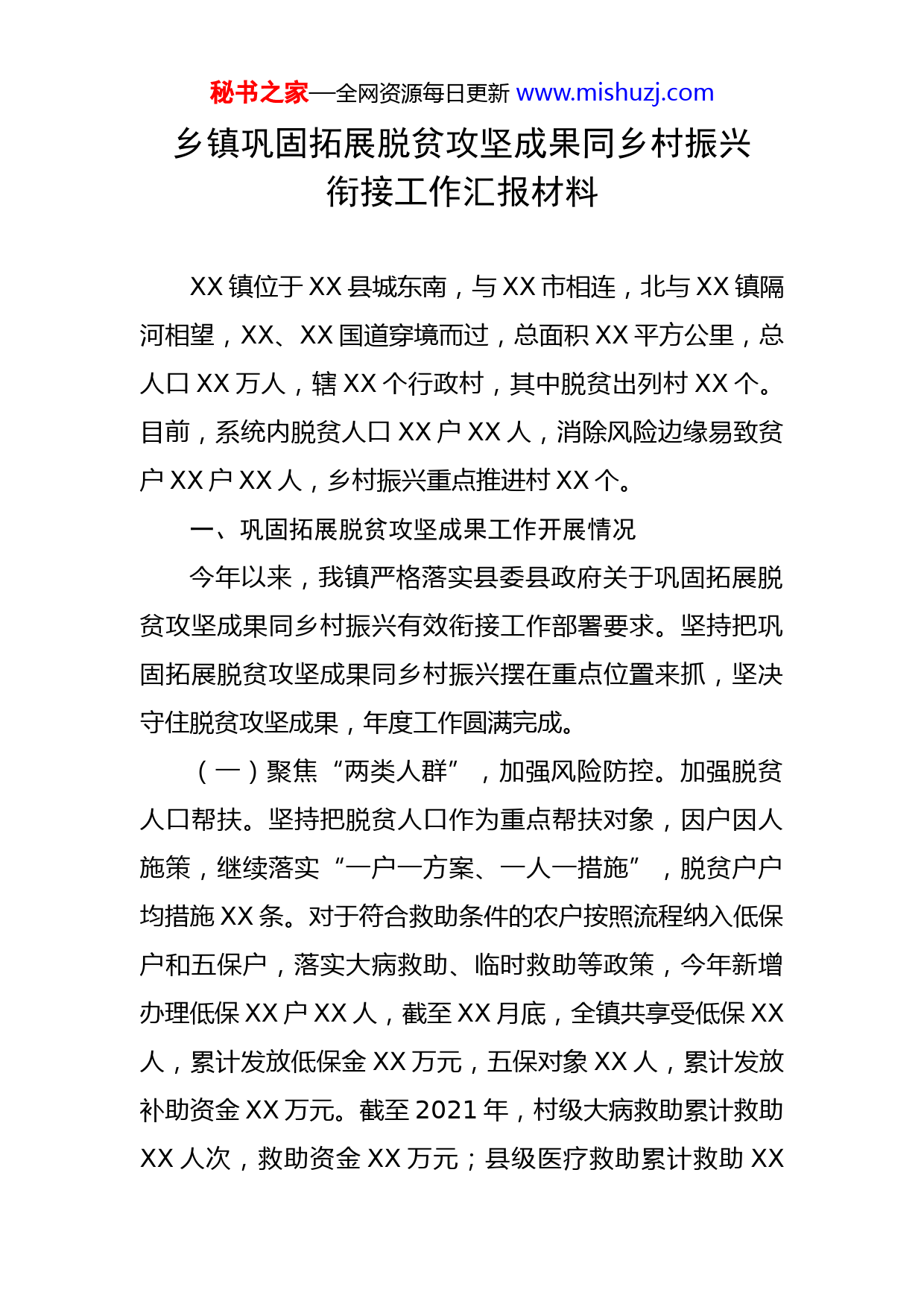 秘书之家—全网资源每日更新www.mishuzj.com乡镇巩固拓展脱贫攻坚成果同乡村振兴衔接工作汇报材料XX镇位于XX县城东南,与XX市相连,北与XX镇隔河相望,XX、XX国道穿境而过,总面积XX平方公里,总人口XX万人,辖XX个行政村,其中脱贫出列村XX个。目前,系统内脱贫人口XX户XX人,消除风险边缘易致贫户XX户XX人,乡村振兴重点推进村XX个。一、巩固拓展脱贫攻坚成果工作开展情况今年以来,我镇严格落实县委县政府关于巩固拓展脱贫攻坚成果同乡村振兴有效衔接工作部署要求。坚持把巩固拓展脱贫攻坚成果同乡村振兴摆在重点位置来抓,坚决守住脱贫攻坚成果,年度工作圆满完成。(一)聚焦“两类人群”,加强风险防控。加强脱贫人口帮扶。坚持把脱贫人口作为重点帮扶对象,因户因人施策,继续落实“一户一方案、一人一措施”,脱贫户户均措施XX条。对于符合救助条件的农户按照流程纳入低保户和五保户,落实大病救助、临时救助等政策,今年新增办理低保XX户XX人,截至XX月底,全镇共享受低保XX人,累计发放低保金XX万元,五保对象XX人,累计发放补助资金XX万元。截至2021年,村级大病救助累计救助XX人次,救助资金XX万元;县级医疗救助累计救助XX秘书之家—全网资源每日更新www.mishuzj.com人次,救助资金XX万元;镇级小额临时救助累计救助XX人次,救助资金XX万元;县级临时救助累计救助XX人次,救助资金XX万元。开展重点人群监测。1-12月份累计走访重点人群XX人。乡村组三级建立网格化管理,XX名网格员对全镇XX户农户实行包保并实地走访,每户张贴防止致贫返贫动态监测告知书。(二)夯实“两个基础”,筑牢脱贫根基。巩固提升“两不愁三保障”及饮水安全。一是发放教育补助。今年春季完成教育资助XX人,发放补助资金XX万元,秋季完成各类教育补助XX人,发放补助资金XX万元。二是提升健康服务。脱贫户家庭医生签约应签尽签,已签约XX人。三是落实住房安全保障。开展低收入群体住房排查,对XX户困难户实施危房改造,已竣工XX户,发放补助资金XX万元。四是注重安全饮水提升。XX个村实施安全饮水一体化提升项目,投入资金XX余万。镇内水厂和XX个村末梢水全面实现检测,水质全部达标。(三)实施“四个帮扶”,提高脱贫成色。按照“四个不摘”要求,5年过渡期内保持政策总体稳定。一是实施产业帮扶。脱贫出列村今年投入财政资金XX万元,共实施XX个项目,已竣工验收XX个。发展到户特色产业,助力脱贫户增收,为XX户发展产业脱贫户发放补助资金XX万元。二是实施金融帮扶。坚持“应贷尽贷”,截至12月,秘书之家—全网资源每日更新www.mishuzj.com新增小额信贷XX户XX万元。三是实施就业帮扶。稳住就业底线,实现全镇脱贫人口务工就业XX人,占2020年底的XX%。持续加大公益性岗位开发,安置脱贫人口、边缘易致贫人口就业XX人,发放公益性岗位补贴XX万元,资金支付比例XX%。四实施人居环境提升帮扶。推进农村人居环境整治,完成农村卫生厕所改造XX户。全镇推进村庄清洁行动,实行畜禽粪污综合利用。全面实施“五清一改”,评选出XX户市级“美丽庭院”示范户,XX户县级“美丽庭院”示范户,XX户镇级“美丽庭院”示范户及XX户村级“美丽庭院”示范户。(四)提升“两个质量”,保障工作运转。一是提升系统数据质量。针对省乡村振兴局下发的XX条疑点数据,逐项逐条核实整改。二是提升脱贫户及监测户信息、村基础信息采集质量。采取各挂村组互比互对的交叉检查方式,完成XX户脱贫户及监测户劳动能力、健康状况、务工状况、就业状况、帮扶联系人和XX个村信息采集,核算了2021年脱贫户及监测户收入,人均纯收入增长至XX万元,另外出列村XX村集体经济收入增长至XX万元、XX村集体经济收入增长至XX万元。(五)抓好“两次排查”,提升整改实效。一是加强关于中央巡视反馈问题和2020年脱贫攻坚成效考核反馈问题、省脱贫攻坚成效考核反馈问题及XX月份省调研暗访反秘书之家—全网资源每日更新www.mishuzj.com馈问题、省巩固拓展脱贫攻坚成果第三方评估反馈问题自查自纠,共查摆出XX个问题,制定了XX条整改措施,12月底前全部整改落实。二是开展XX月份巩固拓展脱贫攻坚成果集中排查及“回头看”行动、XX月份“四大排查”专项行动和XX月份巩固拓展脱贫攻坚成果大排查专项行动,发现问题立行立改,实现相关问题全面整改到位。二、存在的问题我镇巩固拓展脱贫攻坚成果同乡村振兴有效衔接工作虽然取得了比较明显成效,但离高质量推进乡村振兴的目标还有差距。一是帮扶责任意识有待巩固强化。部分帮扶干部存在“歇一歇”“松口气”的工作心态,防止返贫致贫动态监测和帮扶工作需常态化推进。二是部分村集体经济还是比较薄弱。个别村项目少,如XX村产业基础薄弱,缺少致富带头人和龙头企业带动,村集体经济收入较低,低于全镇平均水平。三是人居环境需要进一步改善。农村生产生活方式有待于进一步转变,群众环卫意识淡薄。部分群众还没有养成良好的卫生习惯,卫生意识不强,乱搭乱建、乱堆乱放等不文明习惯司空见惯。个别村的卫生保洁机制不完善,人居环境整治需要常抓不懈。三、下一步工作打算秘书之家—全网资源每日更新www.mishuzj.com下一步,我镇将以此次省巩固拓展脱贫攻坚成果同乡村振兴有效衔接为契机,坚持目标导向,瞄准存在差距,转变思路,持续发力,久久为功,不断