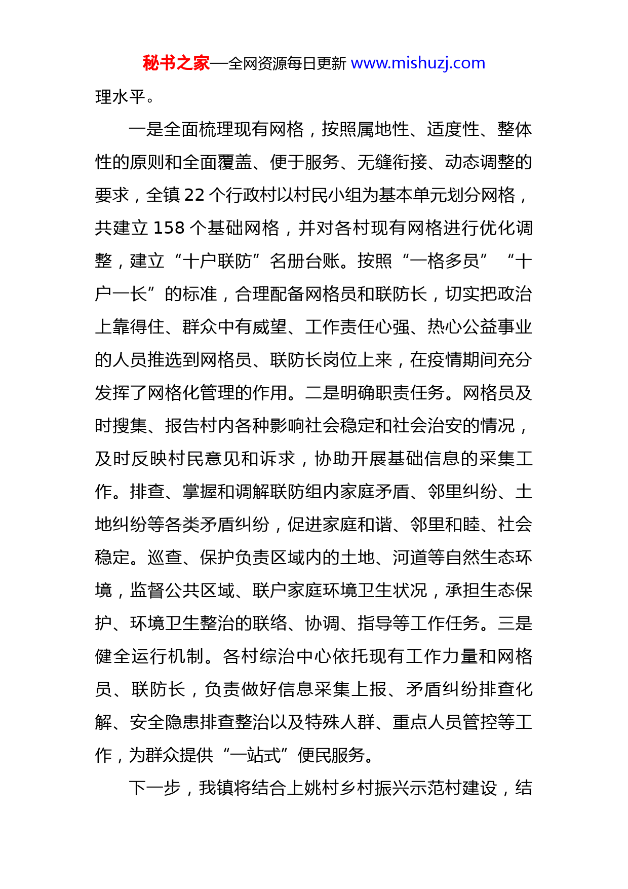 秘书之家—全网资源每日更新www.mishuzj.com乡镇平安建设工作汇报X镇共辖22个行政村,6355户27020人。去年以来,X镇党委、政府以维护社会大局稳定、保障人民群众安居乐业为目标,以争创优秀平安乡镇和社会治理先进村为引领,进一步强化基层基础建设,全力推动社会治安防控体系建设,切实完善落实矛盾纠纷排查化解和稳定风险评估机制,不断创新社会治理方式,打造和谐平安X,有力促进了镇域经济发展和各项社会事业全面进步。现将工作汇报如下:一、加强全镇综治中心规范化建设,进一步深化平安建设,维护社会稳定。以X镇便民服务中心为依托,全面整合组织建设、综合治理、政务服务、基层信访、司法调解等职能。依托综治信息平台,对辖区内有关社会治安和矛盾纠纷方面的求助、投诉和有关矛盾纠纷联动受理、处理。组织开展平安村、平安家庭创建活动,2020年打造X镇综治示范点、上姚村综治示范点建设,组织各村开展禁毒、反邪教、维护社会和谐稳定等活动。发展壮大平安志愿者、群防群治队伍等专业化、社会化力量,在社会治安防控体系建设中充分发挥作用。二、全面推行“网格化+十户联防”,不断提升社会治秘书之家—全网资源每日更新www.mishuzj.com理水平。一是全面梳理现有网格,按照属地性、适度性、整体性的原则和全面覆盖、便于服务、无缝衔接、动态调整的要求,全镇22个行政村以村民小组为基本单元划分网格,共建立158个基础网格,并对各村现有网格进行优化调整,建立“十户联防”名册台账。按照“一格多员”“十户一长”的标准,合理配备网格员和联防长,切实把政治上靠得住、群众中有威望、工作责任心强、热心公益事业的人员推选到网格员、联防长岗位上来,在疫情期间充分发挥了网格化管理的作用。二是明确职责任务。网格员及时搜集、报告村内各种影响社会稳定和社会治安的情况,及时反映村民意见和诉求,协助开展基础信息的采集工作。排查、掌握和调解联防组内家庭矛盾、邻里纠纷、土地纠纷等各类矛盾纠纷,促进家庭和谐、邻里和睦、社会稳定。巡查、保护负责区域内的土地、河道等自然生态环境,监督公共区域、联户家庭环境卫生状况,承担生态保护、环境卫生整治的联络、协调、指导等工作任务。三是健全运行机制。各村综治中心依托现有工作力量和网格员、联防长,负责做好信息采集上报、矛盾纠纷排查化解、安全隐患排查整治以及特殊人群、重点人员管控等工作,为群众提供“一站式”便民服务。下一步,我镇将结合上姚村乡村振兴示范村建设,结秘书之家—全网资源每日更新www.mishuzj.com合自治、法治、德治“三治融合”治理体系建设,进一步巩固上姚村综治示范点建设成效,同时打造韩营村综治示范点。在S236干山路沿线安装假设视频监控设备,强化我镇综治中心“硬件”建设,确保其充分发挥作用,维护全镇辖区内社会治安和谐稳定。