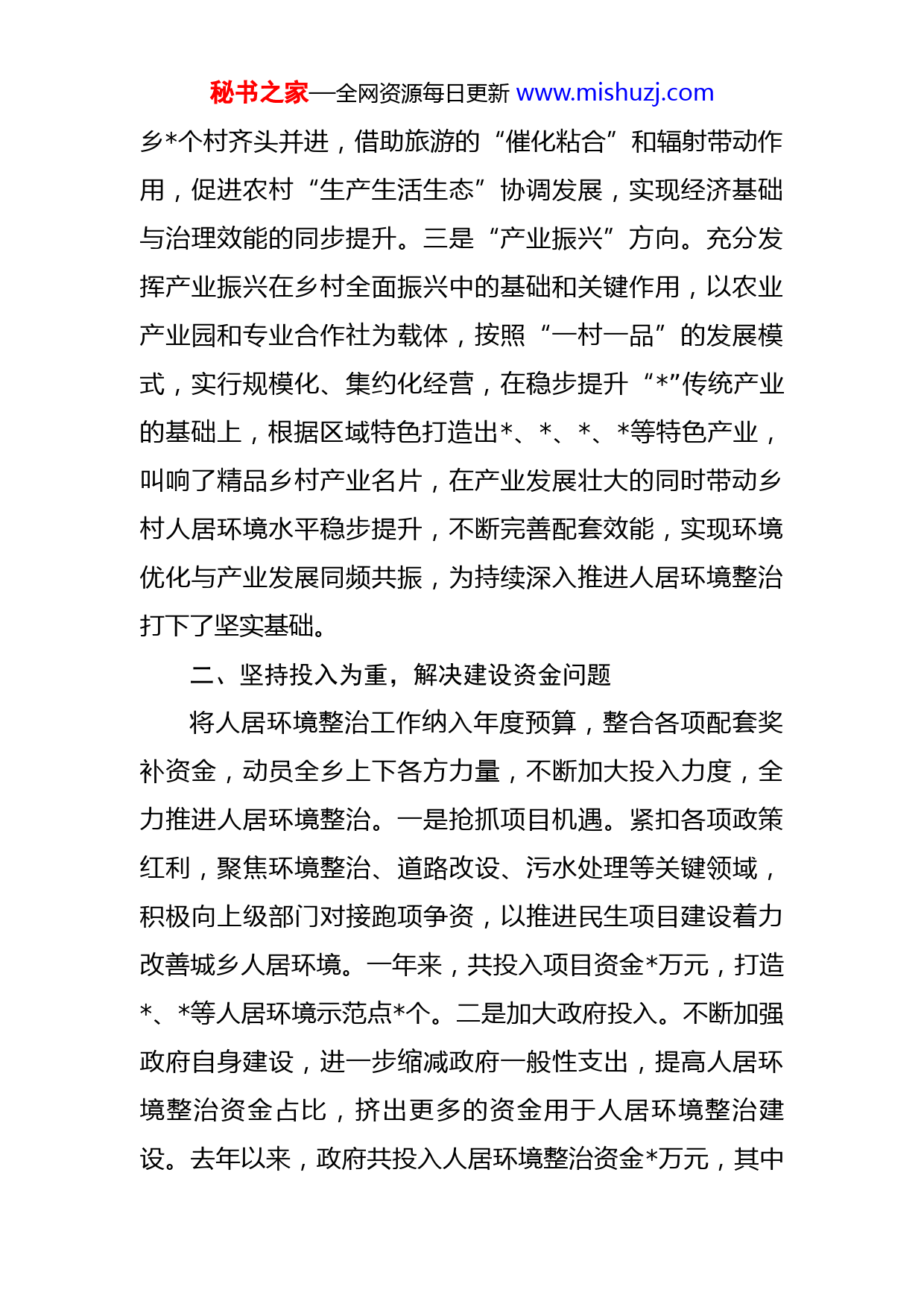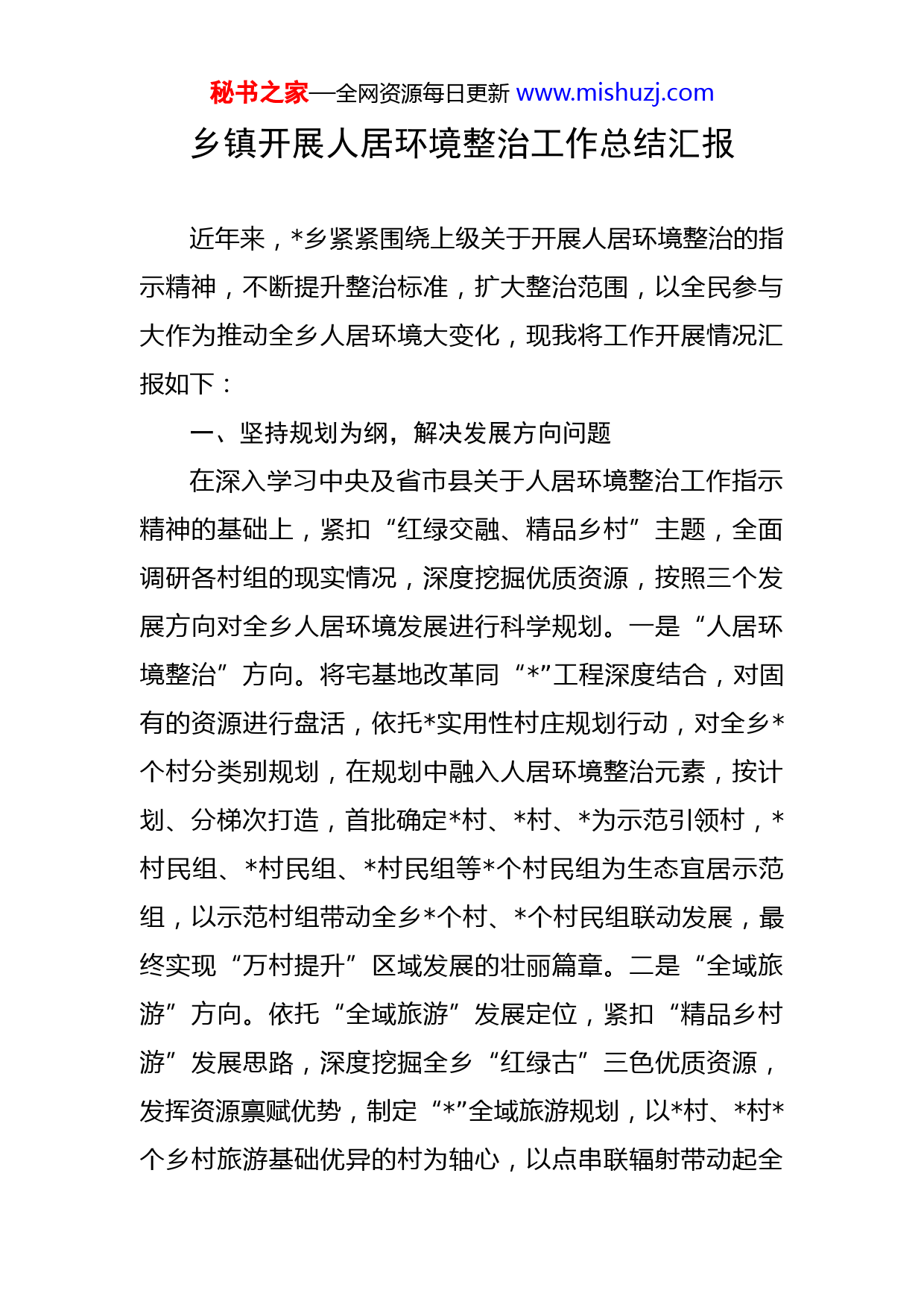 秘书之家—全网资源每日更新www.mishuzj.com乡镇开展人居环境整治工作总结汇报近年来,乡紧紧围绕上级关于开展人居环境整治的指示精神,不断提升整治标准,扩大整治范围,以全民参与大作为推动全乡人居环境大变化,现我将工作开展情况汇报如下:一、坚持规划为纲,解决发展方向问题在深入学习中央及省市县关于人居环境整治工作指示精神的基础上,紧扣“红绿交融、精品乡村”主题,全面调研各村组的现实情况,深度挖掘优质资源,按照三个发展方向对全乡人居环境发展进行科学规划。一是“人居环境整治”方向。将宅基地改革同“”工程深度结合,对固有的资源进行盘活,依托实用性村庄规划行动,对全乡个村分类别规划,在规划中融入人居环境整治元素,按计划、分梯次打造,首批确定村、村、为示范引领村,村民组、村民组、村民组等个村民组为生态宜居示范组,以示范村组带动全乡个村、个村民组联动发展,最终实现“万村提升”区域发展的壮丽篇章。二是“全域旅游”方向。依托“全域旅游”发展定位,紧扣“精品乡村游”发展思路,深度挖掘全乡“红绿古”三色优质资源,发挥资源禀赋优势,制定“”全域旅游规划,以村、村个乡村旅游基础优异的村为轴心,以点串联辐射带动起全秘书之家—全网资源每日更新www.mishuzj.com乡个村齐头并进,借助旅游的“催化粘合”和辐射带动作用,促进农村“生产生活生态”协调发展,实现经济基础与治理效能的同步提升。三是“产业振兴”方向。充分发挥产业振兴在乡村全面振兴中的基础和关键作用,以农业产业园和专业合作社为载体,按照“一村一品”的发展模式,实行规模化、集约化经营,在稳步提升“”传统产业的基础上,根据区域特色打造出、、、等特色产业,叫响了精品乡村产业名片,在产业发展壮大的同时带动乡村人居环境水平稳步提升,不断完善配套效能,实现环境优化与产业发展同频共振,为持续深入推进人居环境整治打下了坚实基础。二、坚持投入为重,解决建设资金问题将人居环境整治工作纳入年度预算,整合各项配套奖补资金,动员全乡上下各方力量,不断加大投入力度,全力推进人居环境整治。一是抢抓项目机遇。紧扣各项政策红利,聚焦环境整治、道路改设、污水处理等关键领域,积极向上级部门对接跑项争资,以推进民生项目建设着力改善城乡人居环境。一年来,共投入项目资金万元,打造、等人居环境示范点个。二是加大政府投入。不断加强政府自身建设,进一步缩减政府一般性支出,提高人居环境整治资金占比,挤出更多的资金用于人居环境整治建设。去年以来,政府共投入人居环境整治资金万元,其中秘书之家—全网资源每日更新www.mishuzj.com万元用于在集镇改造项目,万元用于乡村道路硬化。三是探索新兴方式。针对项目量少、乡村资金不足的难题,主动发起创新实践,动员乡贤、成功人士、企业家人成立乡商会,筹资万元成立乡乡村振兴基金,以基金会的形式统筹安排使用,优先用于解决群众最急需处理的人居环境问题。四是号召群众投入。以看得见摸得着的转变不断号召社会能人、企业家、新乡贤参与到人居环境整治,随着乡村环境的“旧貌换新颜”,越来越多的群众踊跃参与,人居环境整治的“钱袋子”越来越殷实,资金保障越来越稳固。三、坚持建设为要,解决群众关心问题坚持将“问题导向”贯彻于人居环境整治的全过程,直面群众最关心、最需解决的难题,动员乡村上下各方力量,从存量问题着手,高标准高质量快节奏推进农村人居环境整治提升工作,确保人居环境整治工作速度快、见效早。一是强化党委主导效能。充分发挥党委主导效能,在党委的统一领导下,统筹全乡资金、项目、资源等因素,科学判断形势,精准把握方向,依托“”农户和“”工程等创建活动为载体、合力调配人力、物力向关键点倾斜,牢固树立“一盘棋”思想,调动全乡农民的积极性和主动性,最大限度激发群众参与环境整治的热情和激情,汇聚起推动人居环境提升的磅礴伟力。在面对集镇区长期存在秘书之家—全网资源每日更新www.mishuzj.com的年久失修、急需整治的难题,乡党委政府多次召开研讨会,决定咬紧牙关、下大力度解决这一难题。乡党政主要领导分头找政策、找资金,号召社会各界捐款捐物,经过不懈努力筹集资金余万元用于街道改造,目前耗资万元的街道改造一期工程已全部完工,二期工程万元,正在进行招标。目前已完成路、路由外到内的深度改造,配套安装智慧路灯盏,疏通了长期存在的污水处理、道路破损、绿化不足等难题。集镇区率先实现“”目标,乡村颜值发生精彩蝶变,人居环境整治绽放时代新颜。二是压实支部主抓责任。以村为单位将全乡分为个片区和一个集镇集中整治区,个村片区由村支部牵头组织整治,集镇区由乡机关及乡直支部进行深入清理,各支部在深度摸排存量问题以及收集群众反映问题的基础上,分类别制定整改台账,明确整改时限和整改责任人,采取“挂图作战”的方式,确保问题发现一起消灭一起,各支部联动进取筑牢全乡人居环境整体水平稳步提升,推动整治工作走深走实。止目前,全乡共投入人力余人次、出动大型机械车辆辆次,改造旱厕处,治理“”现象处,复耕、复种闲置耕地亩,个村个村民组全部实现“内外精洗”的全面提升。三是发挥群众主体作用。广泛发动